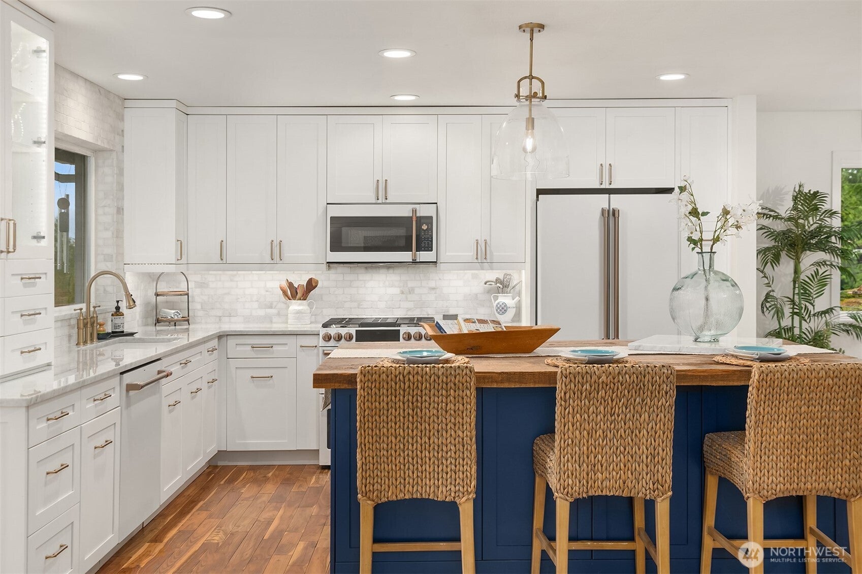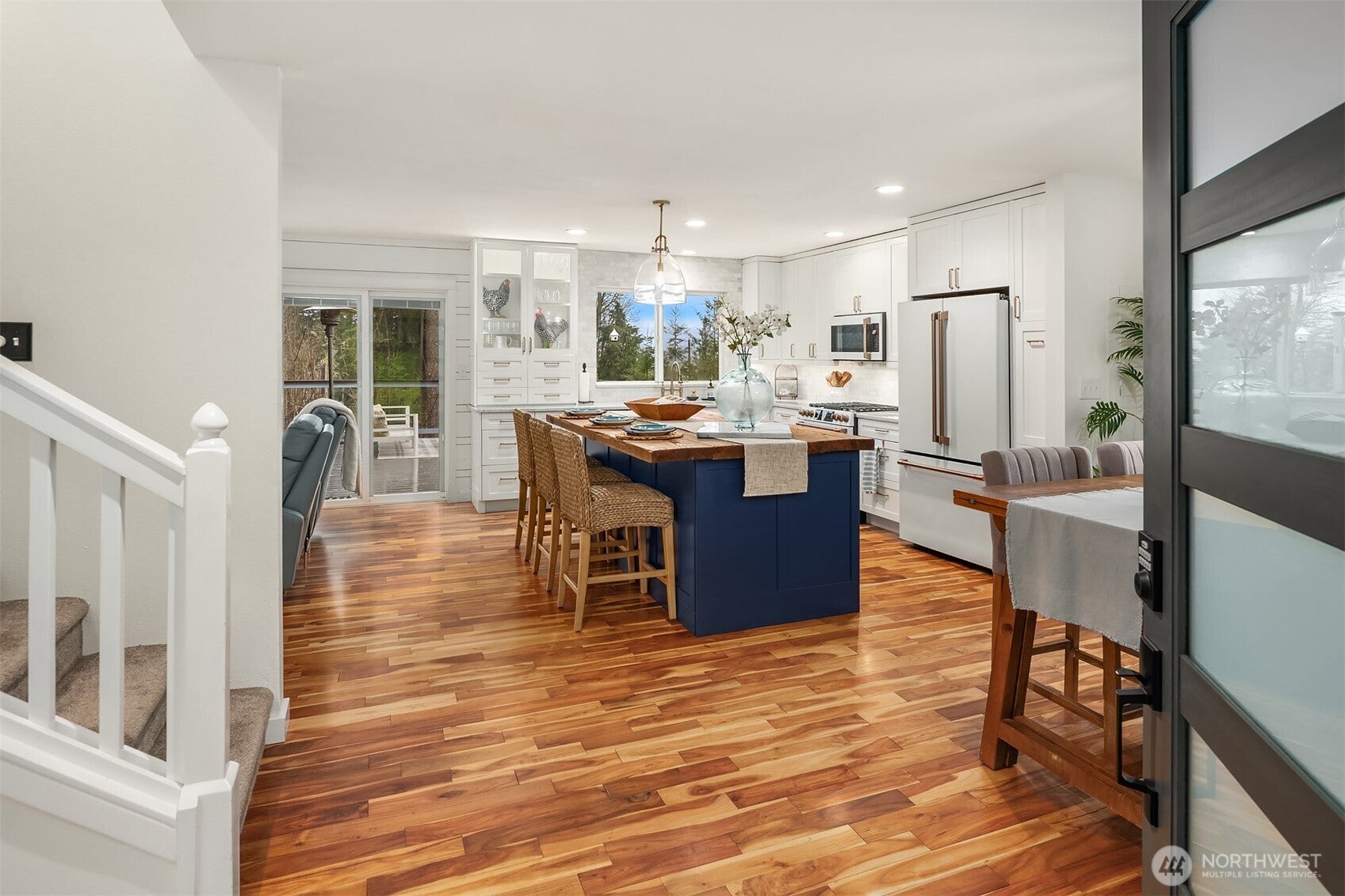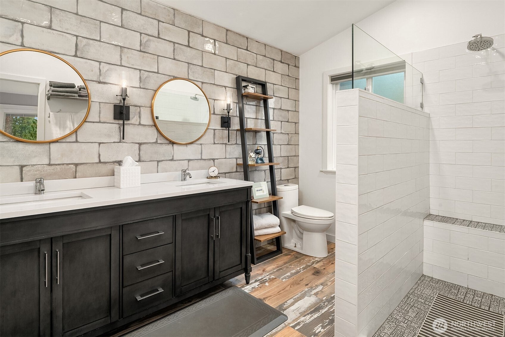 Timber Creek by Toll Brothers-better than new! Enjoy an invigorating lifestyle surrounded by 50 acres of preserved woodlands and scenic walking trail, along with resort-style amenities including a Jr. Olympic-size pool, clubhouse, BBQ terrace, park, playground & basketball court. This east-facing home is impeccably maintained & showcases exceptional craftsmanship, thoughtful upgrades, & quality designer touches throughout. The oversized great room & dining area are anchored by a beautiful gas fireplace, creating a warm and inviting gathering space. A king-sized main floor bedroom with an upgraded bath offers ideal flexibility for guests or generational living. The chef-inspired kitchen features abundant storage, a gas range w/vent hood, convection ovens, and an expansive island designed for both entertaining & everyday living. Upstairs, youll find 4 spacious bedrooms, large bonus room & convenient laundry. The luxurious primary suite is a true retreat, complete with 2 walk-in closets and a spa-like bath, 2 vanities and a soaking tub. Additional highlights include hardwood floors, herringbone tile, tankless water heater, air conditioning, alarm system, sprinklers, upgraded Wi-F, EV wiring & garage storage. The easy-maintenance backyard offers a large sunny patio & colorful gardens, perfect for relaxing or entertaining. Located within top-rated Northshore schools with easy commuter access, this pre-inspected home also includes a one-year warranty for added peace of mind.