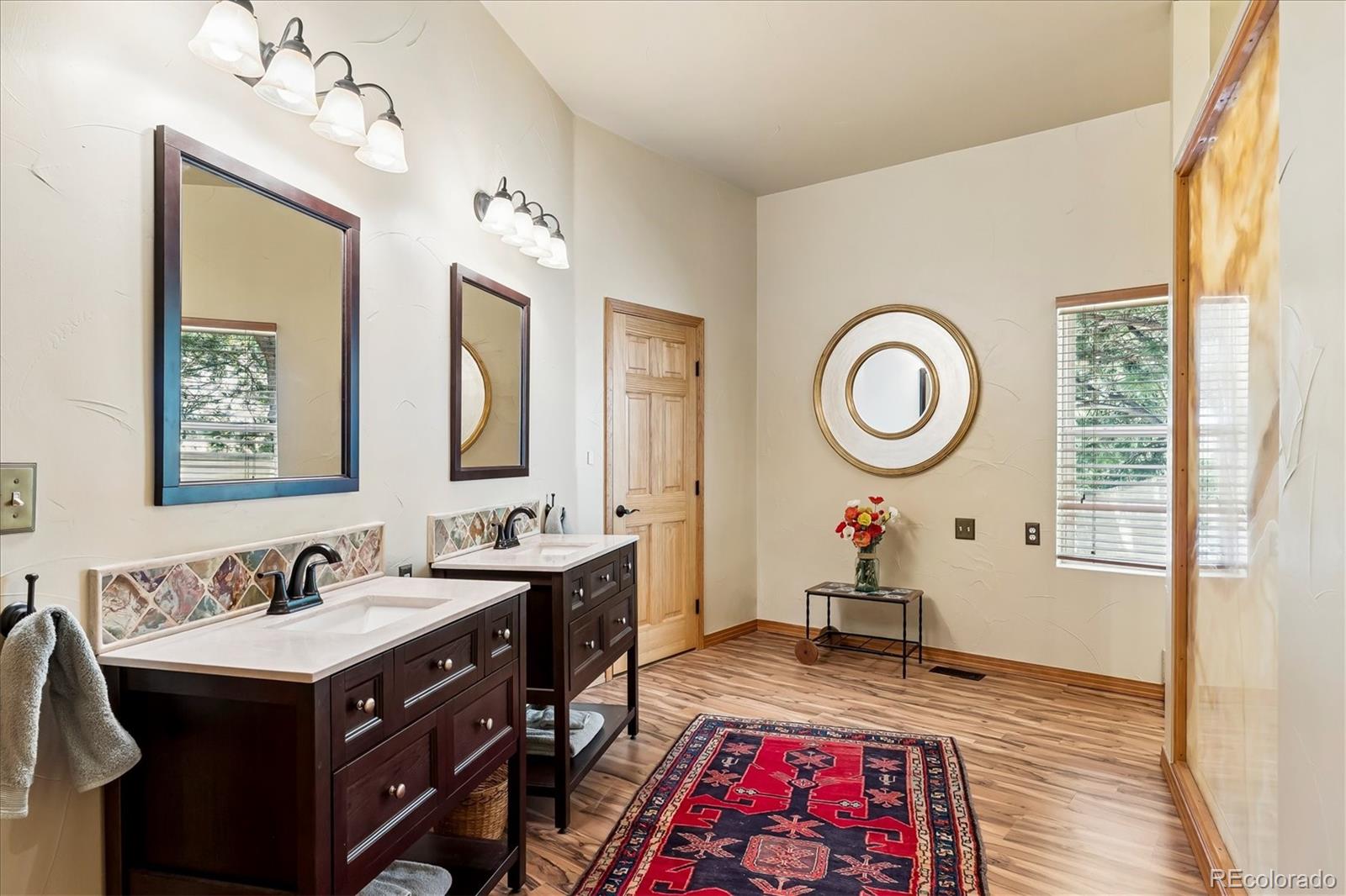 Custom ranch home tucked into one of Arvadas most desirable neighborhoodsknown for its large lots, custom builds, mountain views, and quiet streets. Set on a private .5-acre cul-de-sac lot, this home delivers the space, privacy, and Colorado lifestyle that so many are searching for. From the moment you walk in, the home opens beautifullyanchored by a warm gas fireplace and a wall of windows that frame the foothills and fill the space with natural light. The fully renovated chefs kitchen is truly the heart of the home, featuring custom two-tone cabinetry, soft-close drawers, a large gas range with double ovens, an elegant backsplash, and an oversized island perfect for gathering or everyday living. The primary suite has been thoughtfully remodeled into a true retreat, complete with its own gas fireplace, private balcony, and peaceful mountain views to start your day. The spa-like bath offers a soaking tub, glass-enclosed shower, dual sinks, and custom cabinetry designed with both comfort and function in mind. The main level also includes wood flooring throughout, a private office with French doors, guest bedroom & bath, powder bath, and laundryoffering the ease of main-level living. Downstairs, a curved staircase leads to a walk-out basement designed for both relaxation and entertaining. A spacious second living area, wet bar with dishwasher, dual-sided fireplace, exercise room, and two additional bedrooms create the perfect setup for guests or extended stays. Step outside and experience what truly sets this home apart. Dual decks from both the main level and primary suite connect to an incredible outdoor living space belowfeaturing flagstone patios, covered seating areas, a full outdoor kitchen, and a pizza oven built for unforgettable evenings. With a 3-car garage, fenced yard, and a setting that captures both privacy & connection to naturethis is more than a home, its a place to enjoy the moments that matter.