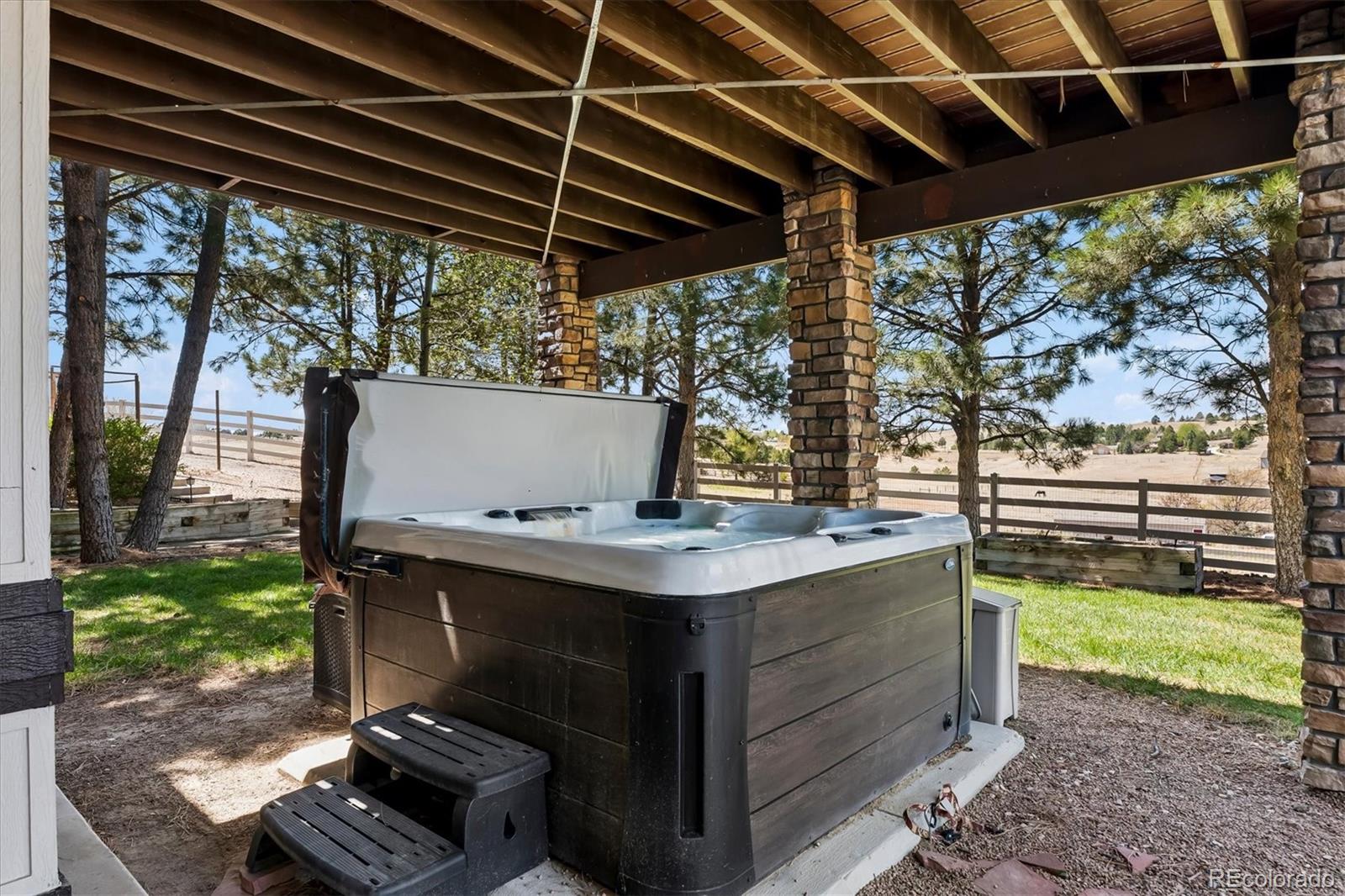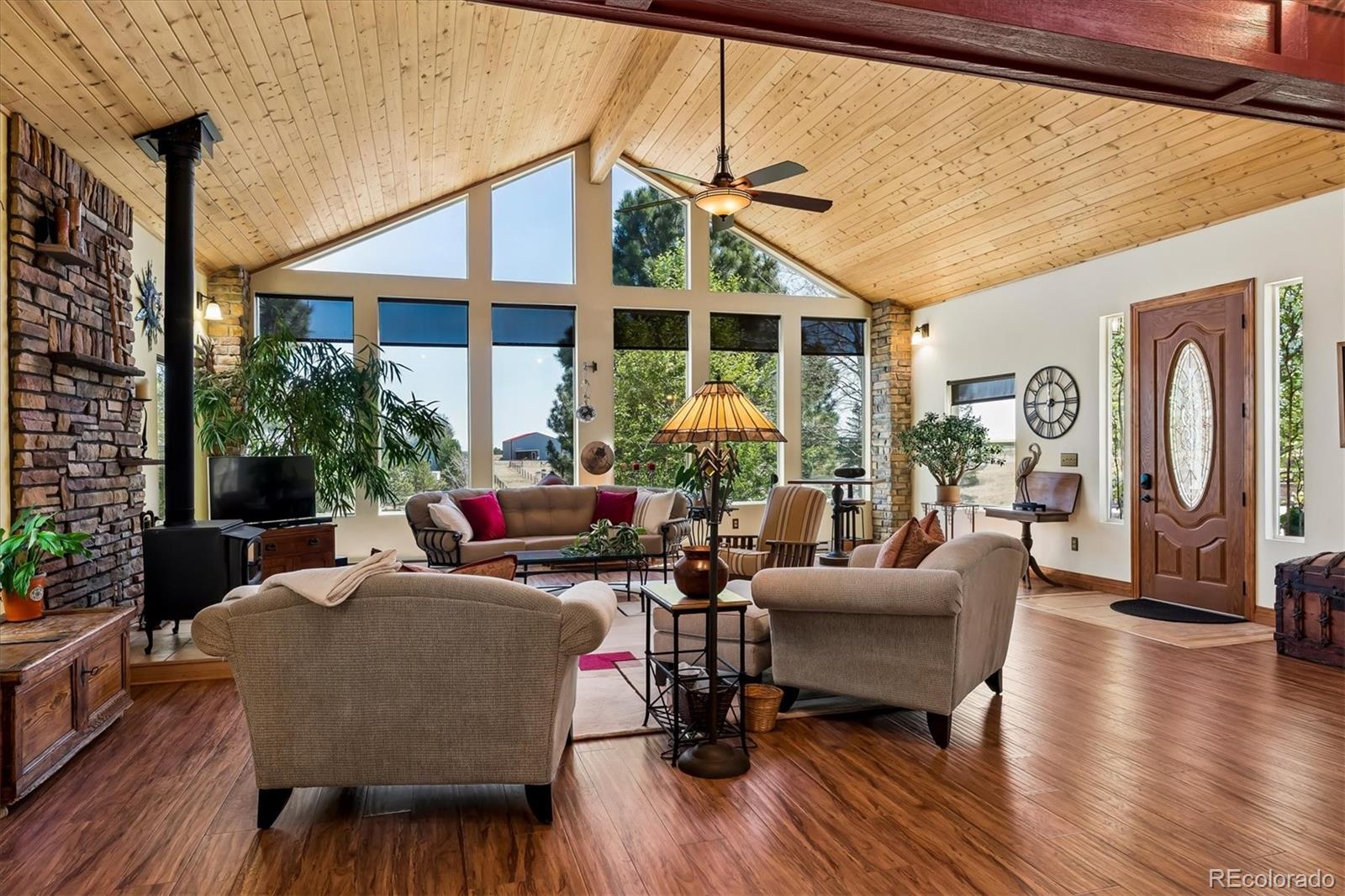 An incredible private oasis awaits at 46527 Sunset View Way. Set on 5.71 acres, this thoughtfully designed ranch-style home offers exceptional privacy on a spacious corner lot, complete with a long paved driveway, a shop/barn with electricity, and a stunning sunlit front addition. The outdoor setting is truly special, featuring a serene pond, fruit trees, garden beds, perennial landscaping, and plenty of room to enjoy the Colorado lifestyle. Inside, the bright great room showcases a wall of windows and a cozy wood-burning stove. The main level offers a seamless flow between the dining room, oversized kitchen with eat-in space, and secondary family room, with easy access to a private deck. The primary suite is a true retreat with a sitting area, gas fireplace, five-piece bath, and generous custom shelving in the closet. Two additional bedrooms, full baths, and a versatile laundry/utility space complete the main floor. The finished basement includes a fully functional apartment with private entrance, full kitchen, bedroom, and bathideal for guests or rental incomeplus a fifth bedroom, bath, and expansive living area perfect for entertaining. An oversized three-door garage accommodates up to six vehicles, with additional space for RV storage. Active solar, well-maintained systems, and negotiable extras (hot tub, tractor, riding mower) add even more value. Horses are welcome. All just 15 minutes from downtown Parkeroffering the perfect balance of convenience and peaceful country living.