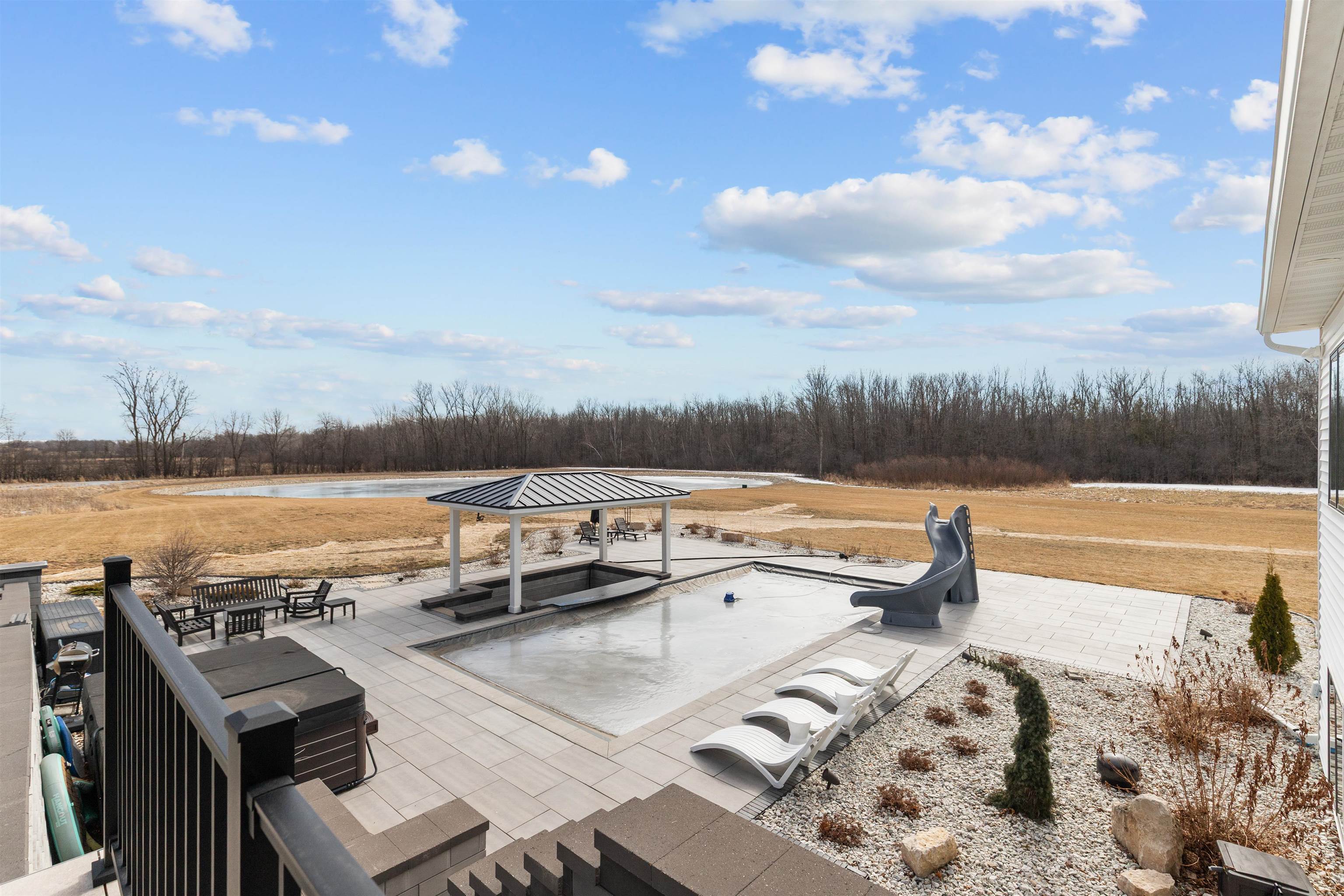 Extraordinary luxury estate offering nearly 21 acres with a private stocked pond and resort-style 20x40 inground pool featuring slide, splash lighting, and swim-up bar.