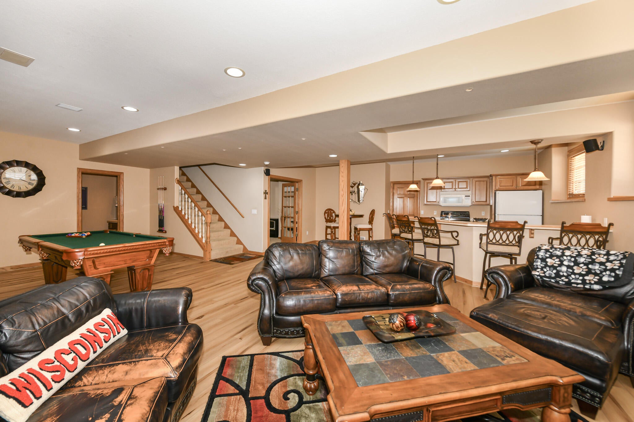 Welcome home to this absolutely stunning two-story located in the coveted Prairie Farms Development. This luxury home is where timeless charm meets function, space, and comfort as well as no backyard neighbors! Step inside to find a double volume living room with an abundance of windows and natural light with a beautiful stone surround fireplace. The gourmet kitchen features custom cabinets, quartz countertops, a gas cooktop with hood, double oven, and a large hidden walk-in pantry. Main floor primary bedroom with en suite bath featuring heated tile floors, soaking tub, tile shower, dual vanity, private toilet room, and a spacious walk-in closet. The main floor also boasts laundry room with sink, rear foyer designed to wow, powder bathroom, and a flex room/office. Upstairs features three bedrooms, a bathroom with two sinks and private toilet/shower area, laundry closet, and a spacious bonus room! Lower level is finished with a massive family room (with wet bar rough-in), exercise room, full bathroom, and two additional bedrooms. Estimated completion June 2026. Contact for more details to view prior to completion you wont want to miss out on this beauty! Owner/Agent