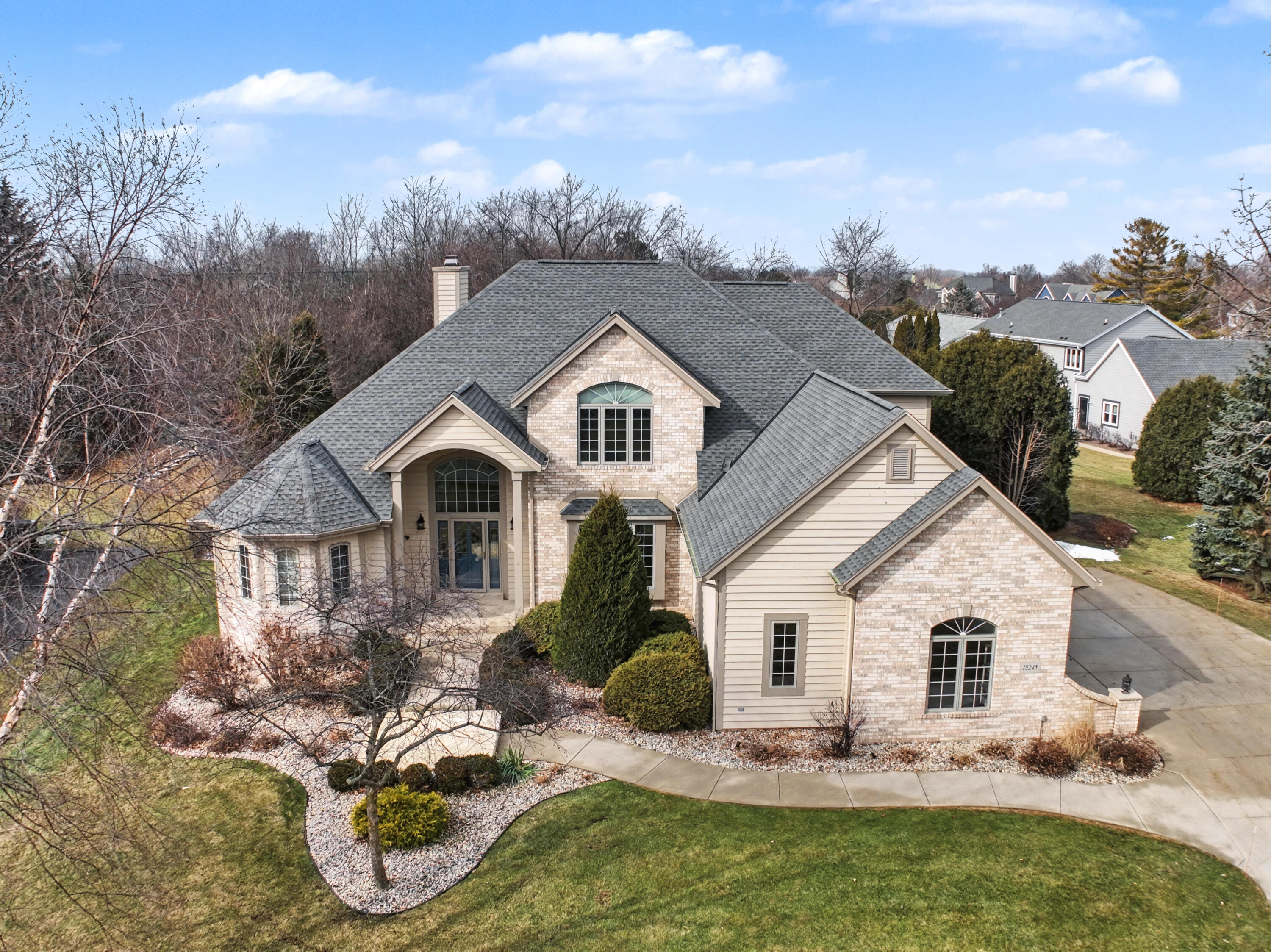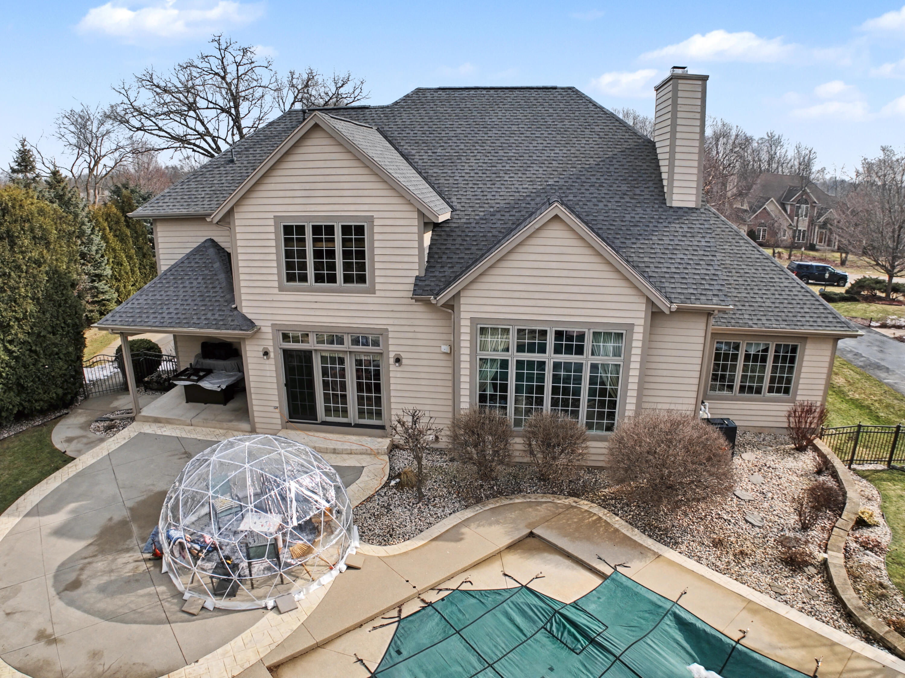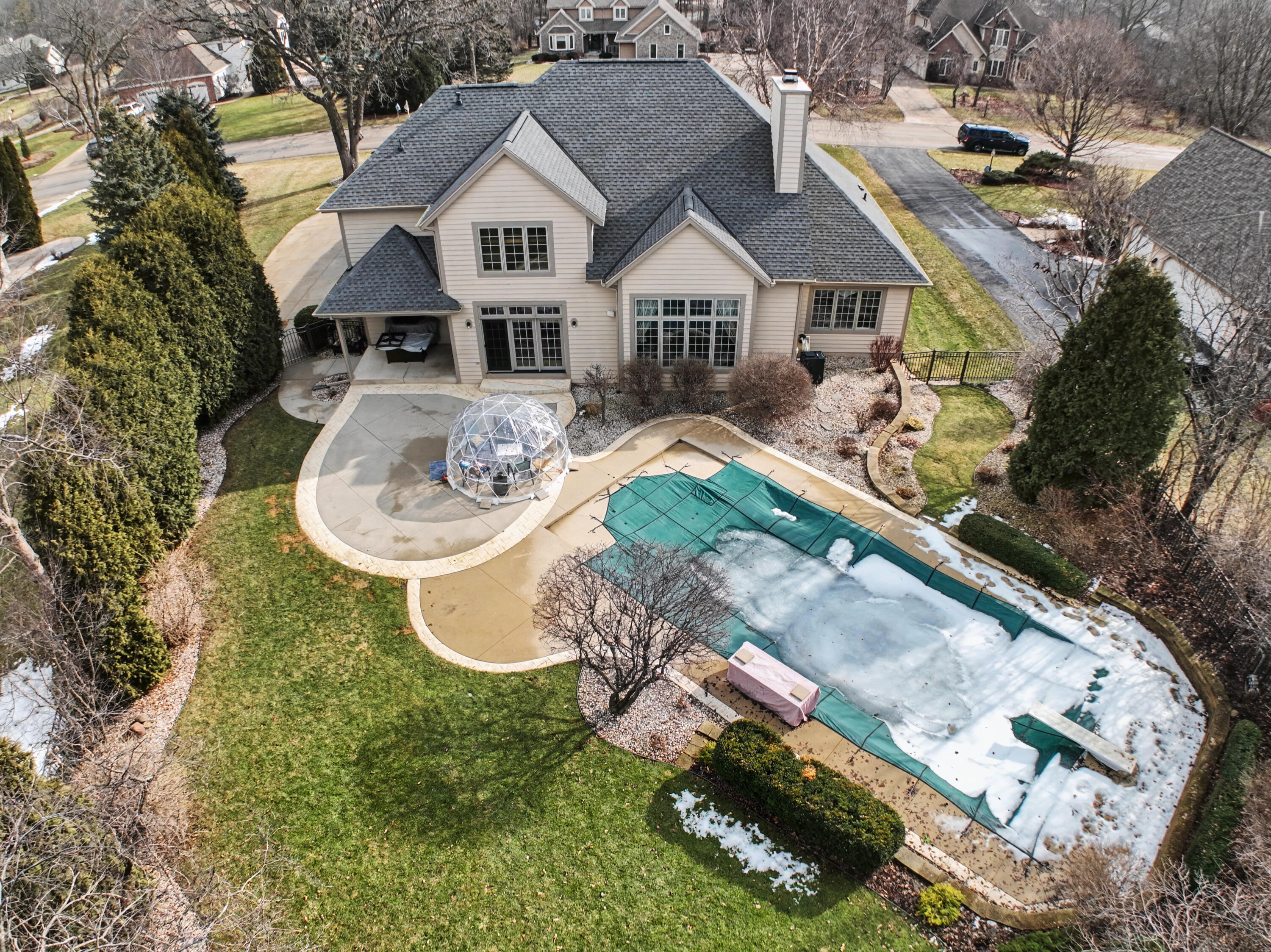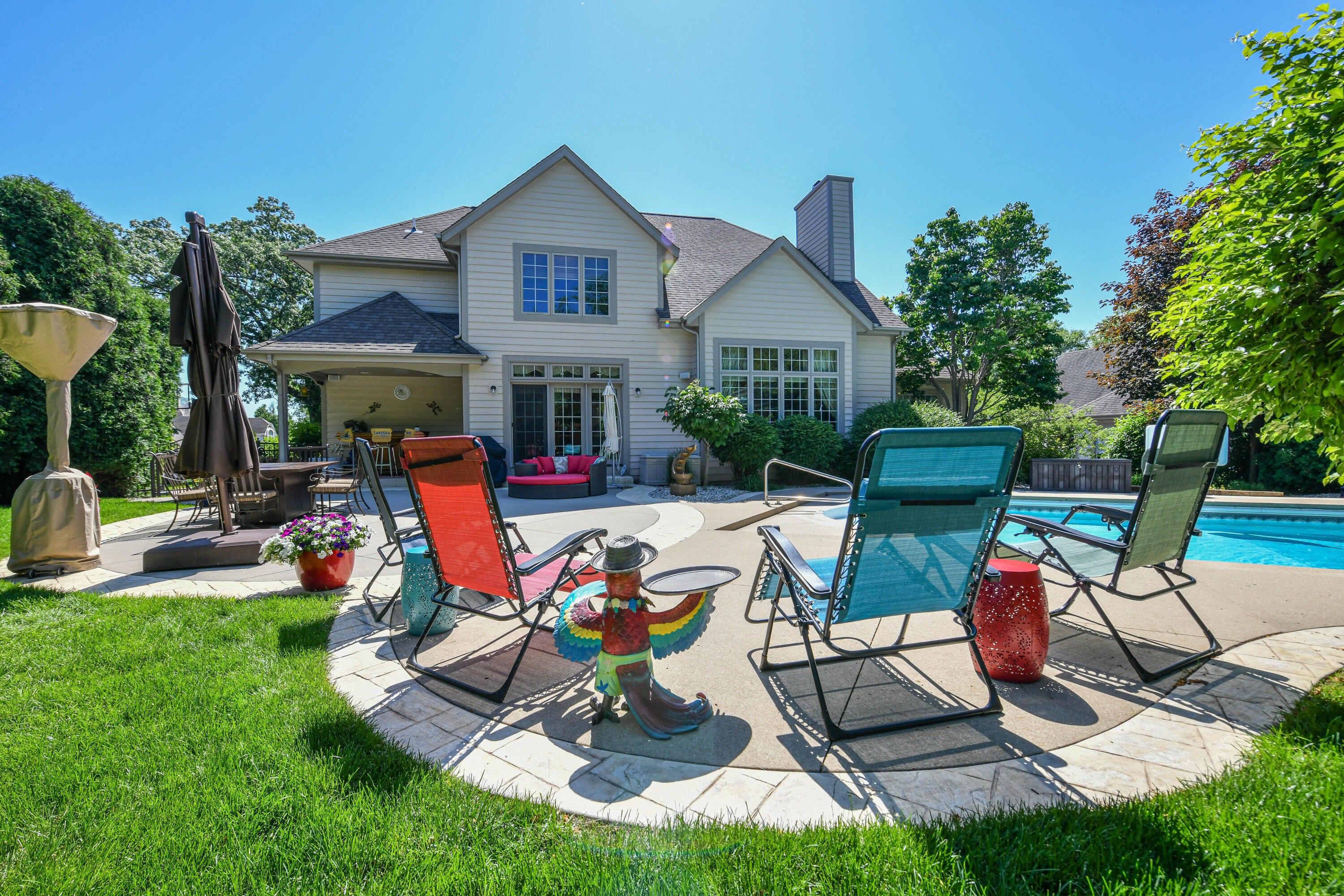 Exceptional executive home showcasing timeless architecture and upscale finishes, impeccably maintained. A dramatic 2-story foyer with vaulted ceilings and a striking fireplace sets the tone. Gourmet kitchen offers granite counters, SS appliances, pantry, custom tilework and dinette. Dining room features a custom painted ceiling. Primary suite boasts volume ceilings, large WIC, and expansive spa bath with jetted walk-in shower. Main-floor laundry/drop zone. Upper level includes loft, 3 BRs and Jack & Jill bath. Finished LL with 2nd kitchen, media and game area plus full bath. Resort-style paradise with a fenced in-ground pool, covered patio, stamped concrete entertaining space and serene wooded views. A truly magnificent home.
