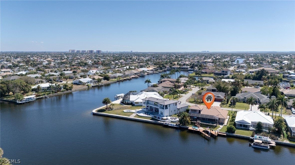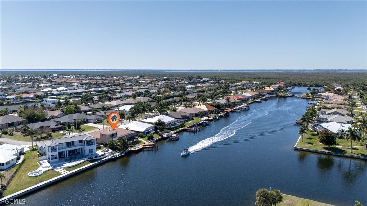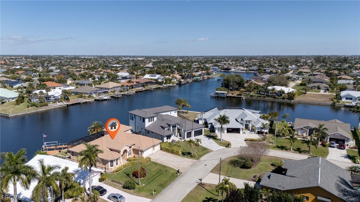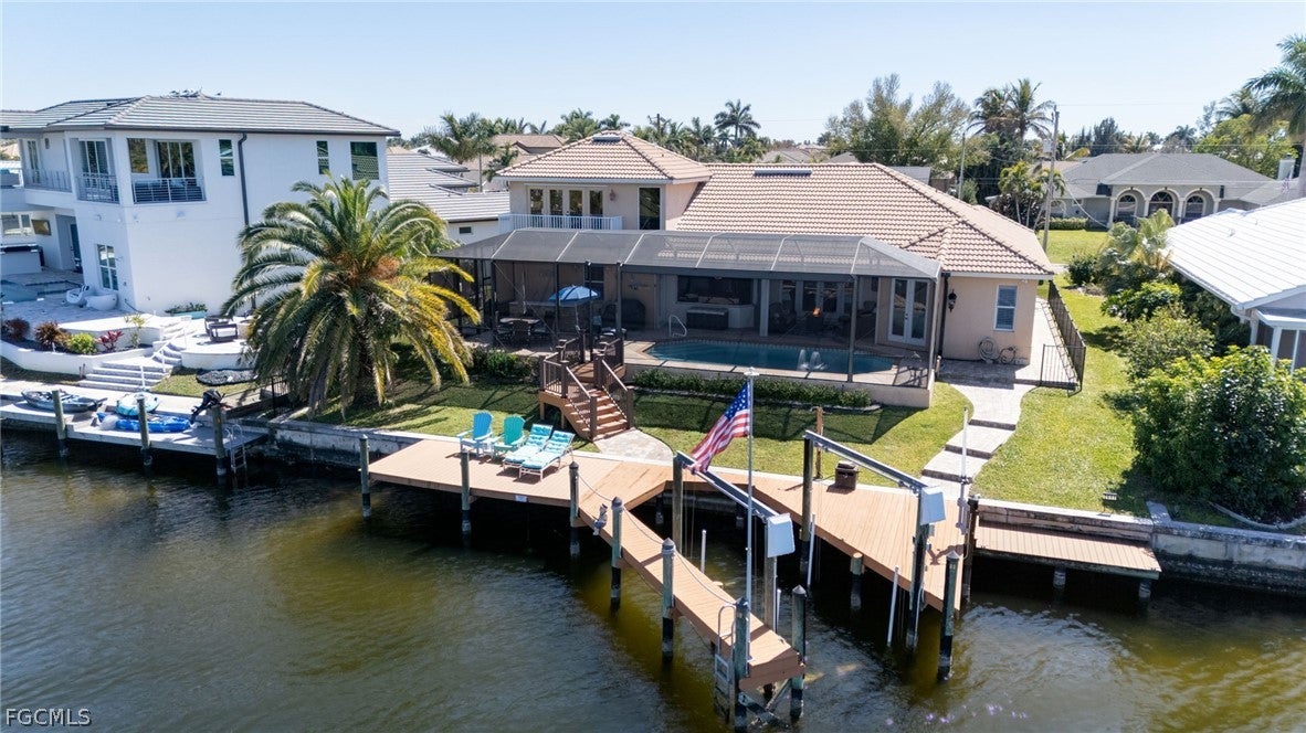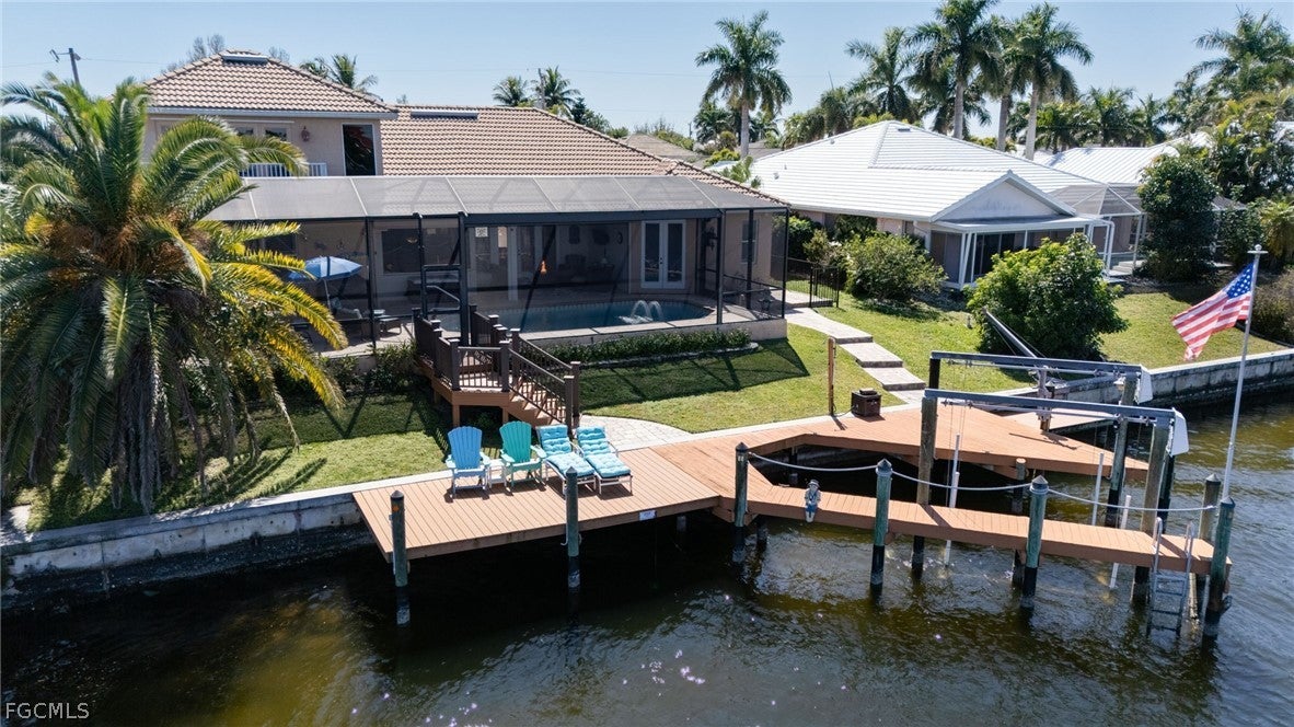 Come see this boaters dream home with insane views. This stunning pool home has a 3 car garage, 4 bedrooms including an upstairs flex room, 4.5 baths, a den, lanai, large stamped concrete deck, 8000# boat lift with wrap around dock, and much, much more.It comes turnkey so bring the whole gang and your toothbrushes and move right in. Situated on a wide water canal this home boasts spectacular intersecting canal views straight from your front door, through the French doors, overlooking the pool, across a 200 foot wide canal and straight down the intersecting canal. You really have to see this home to truly appreciate all it has to offer. The gorgeous kitchen features wood cabinetry, stainless appliances, granite countertops and backsplash, a center island for extra work space and a large walk-in pantry complete with wine fridge. The oversized kitchen also features a breakfast nook with spectacular water views. The giant lanai is perfect for entertaining poolside with expansive views and plenty of room for entertaining. Dont miss the pool bath located under the stairwell but accessible from outside for a genius use of space. Back inside the spacious primary suite features tray ceilings and incredible views and the ensuite has dual sinks, an oversized walk in tiled shower and a soaking tub. Head to the other side of the home and one guest room also has its own ensuite and the other has lanai views. next, go on upstairs to the large flex room which can be used for media room, a fourth bedroom, a family room, ect., the possibilities are endless. This home is ready to go, move in today and start living your best life immediately!