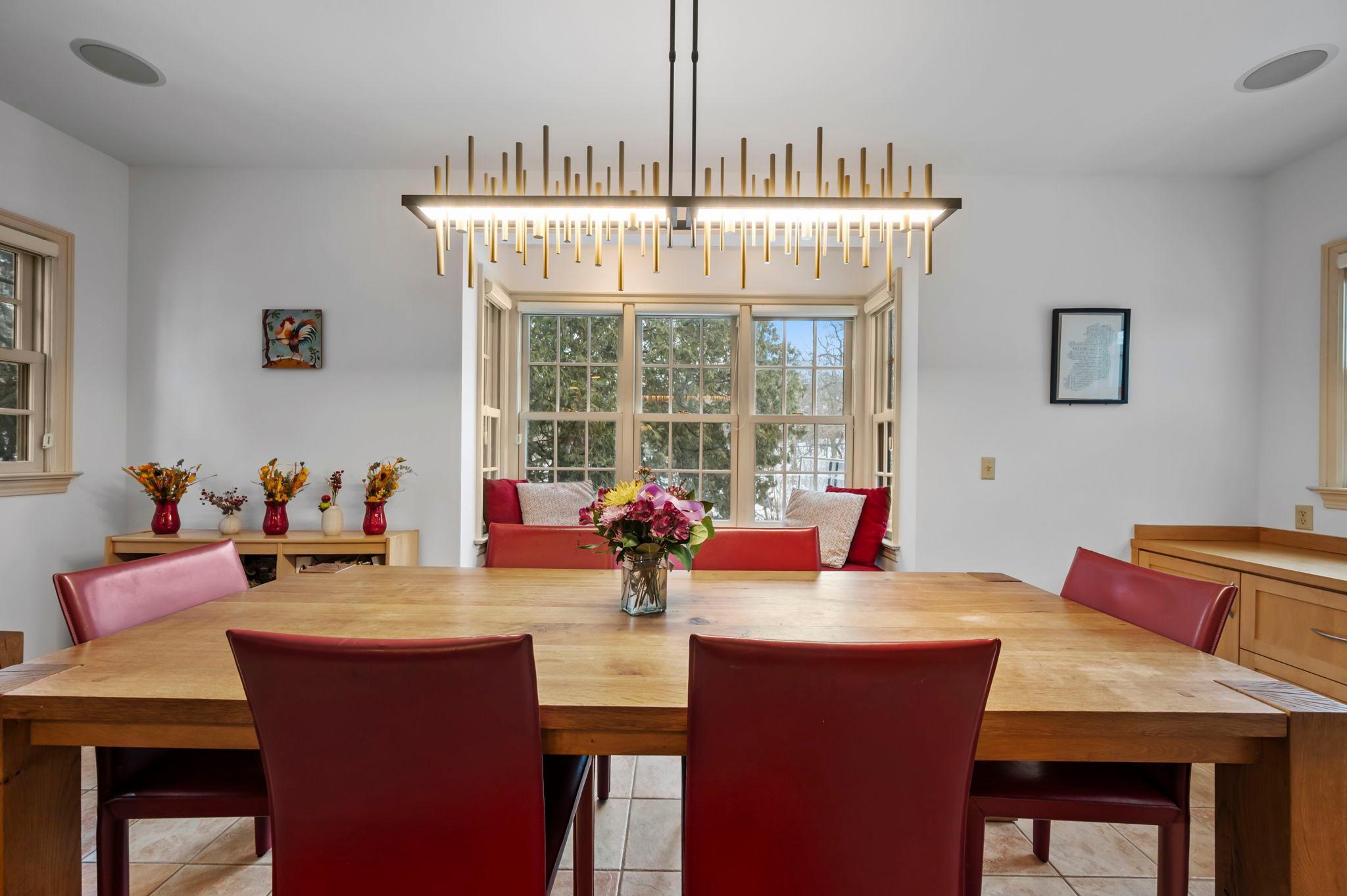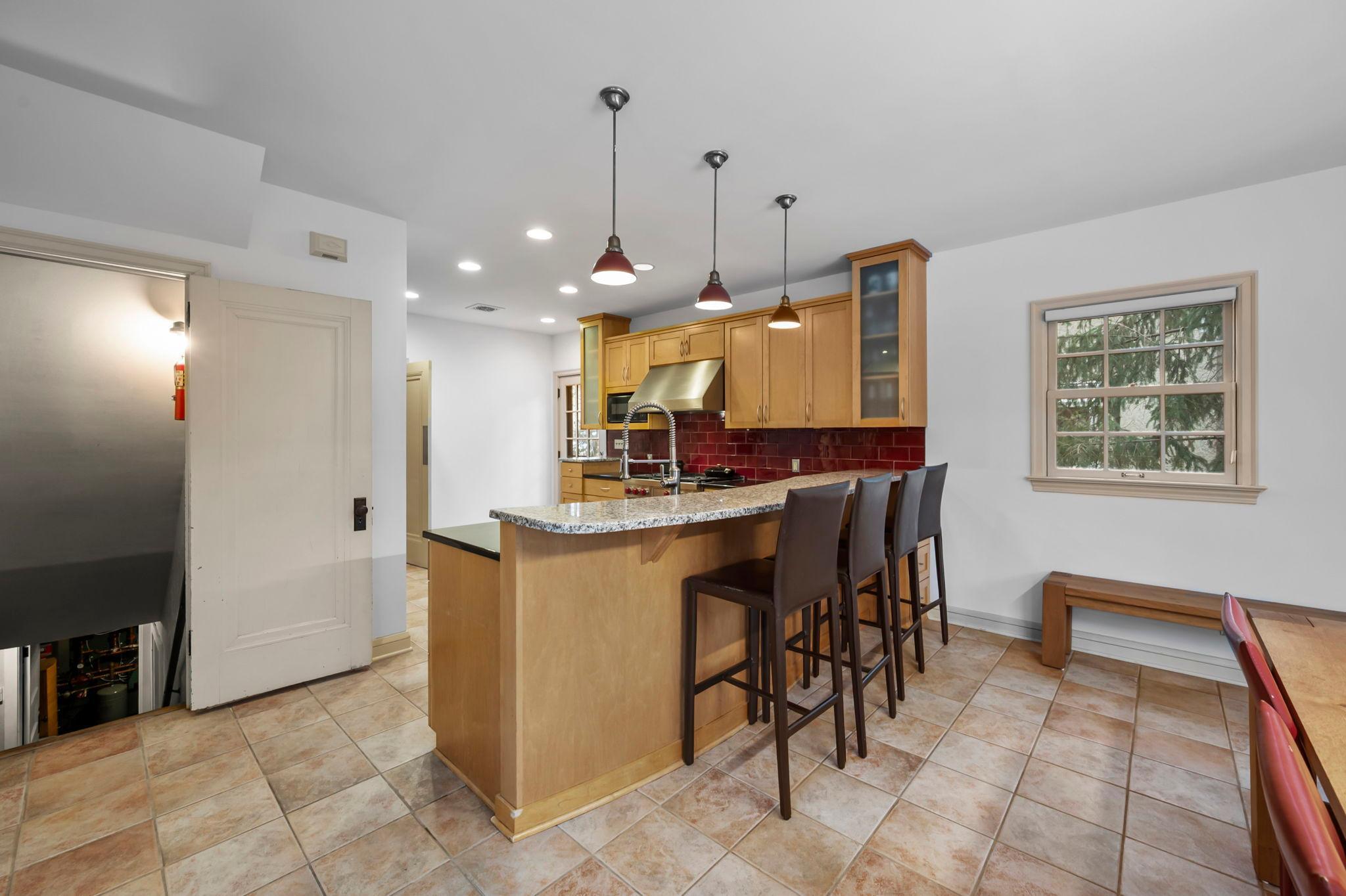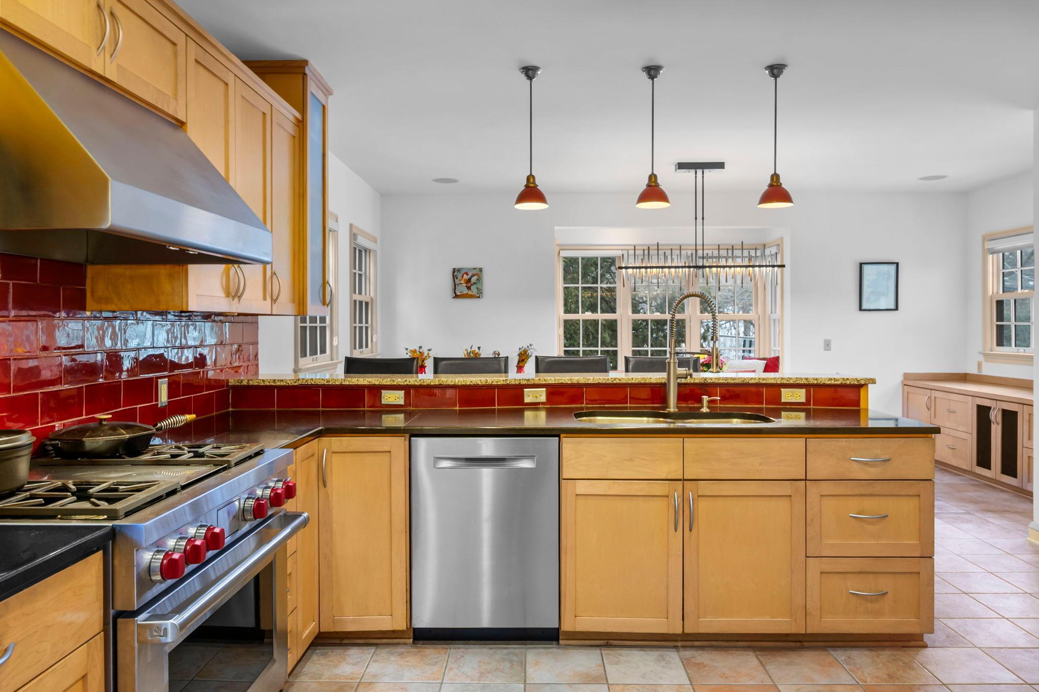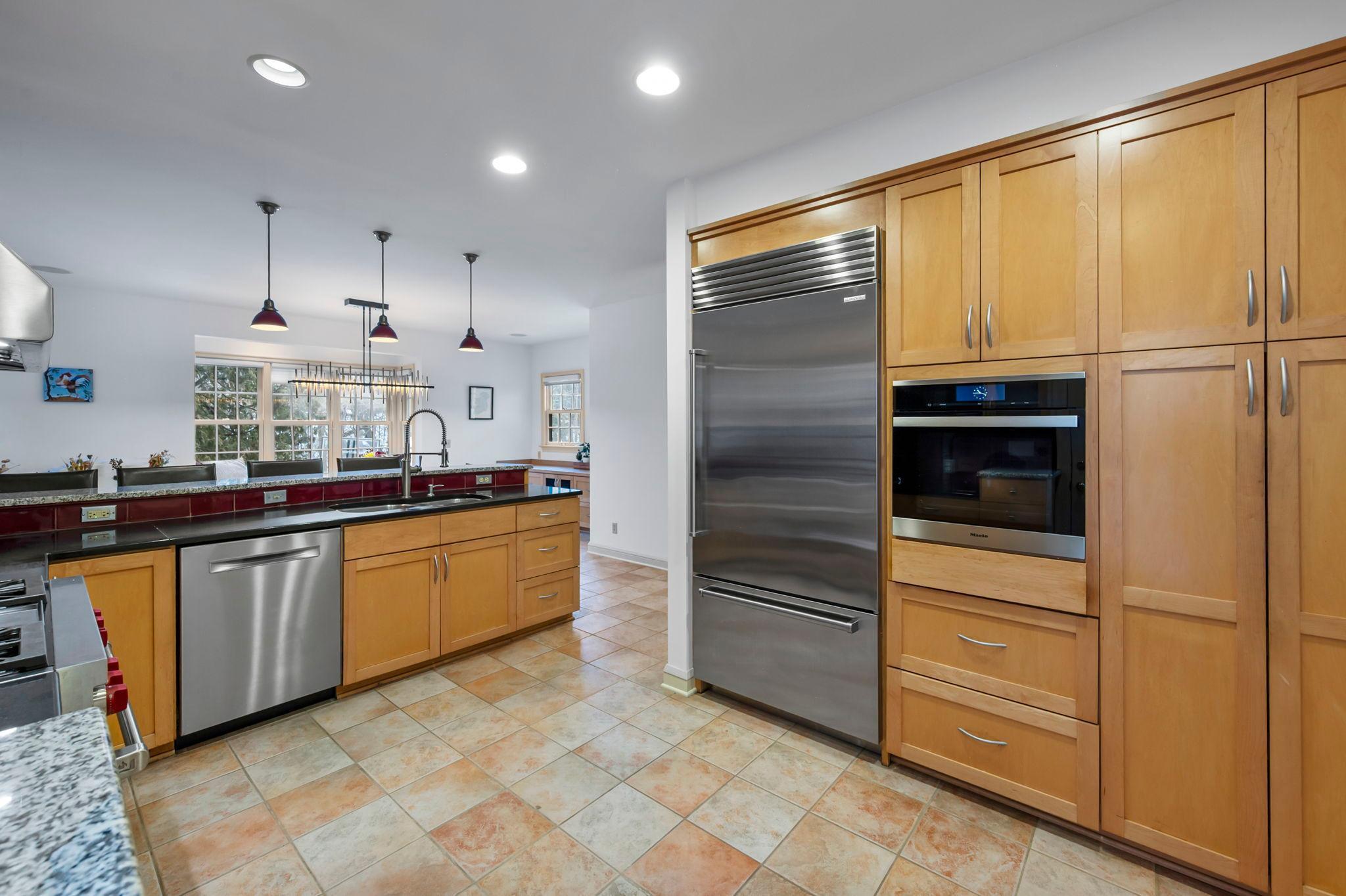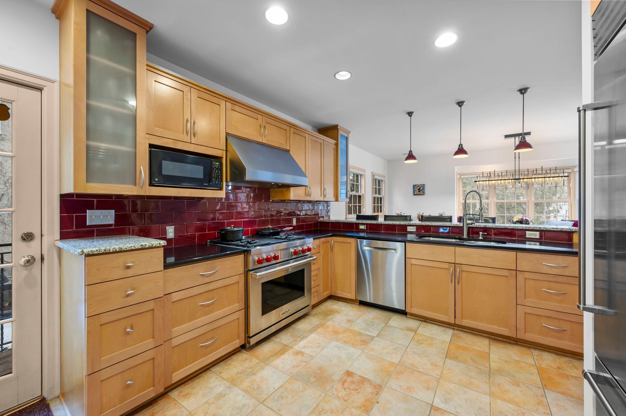 Natural light pours in through numerous windows, illuminating every space, including the delightful sunroom currently used as an office. The large eat-in kitchen is truly a chefs dream, featuring high-end stainless steel appliances from Wolf, Bosch, Miele, & Sub zero, granite countertops, abundant cabinet and prep space, tile backsplash, and tile flooring.