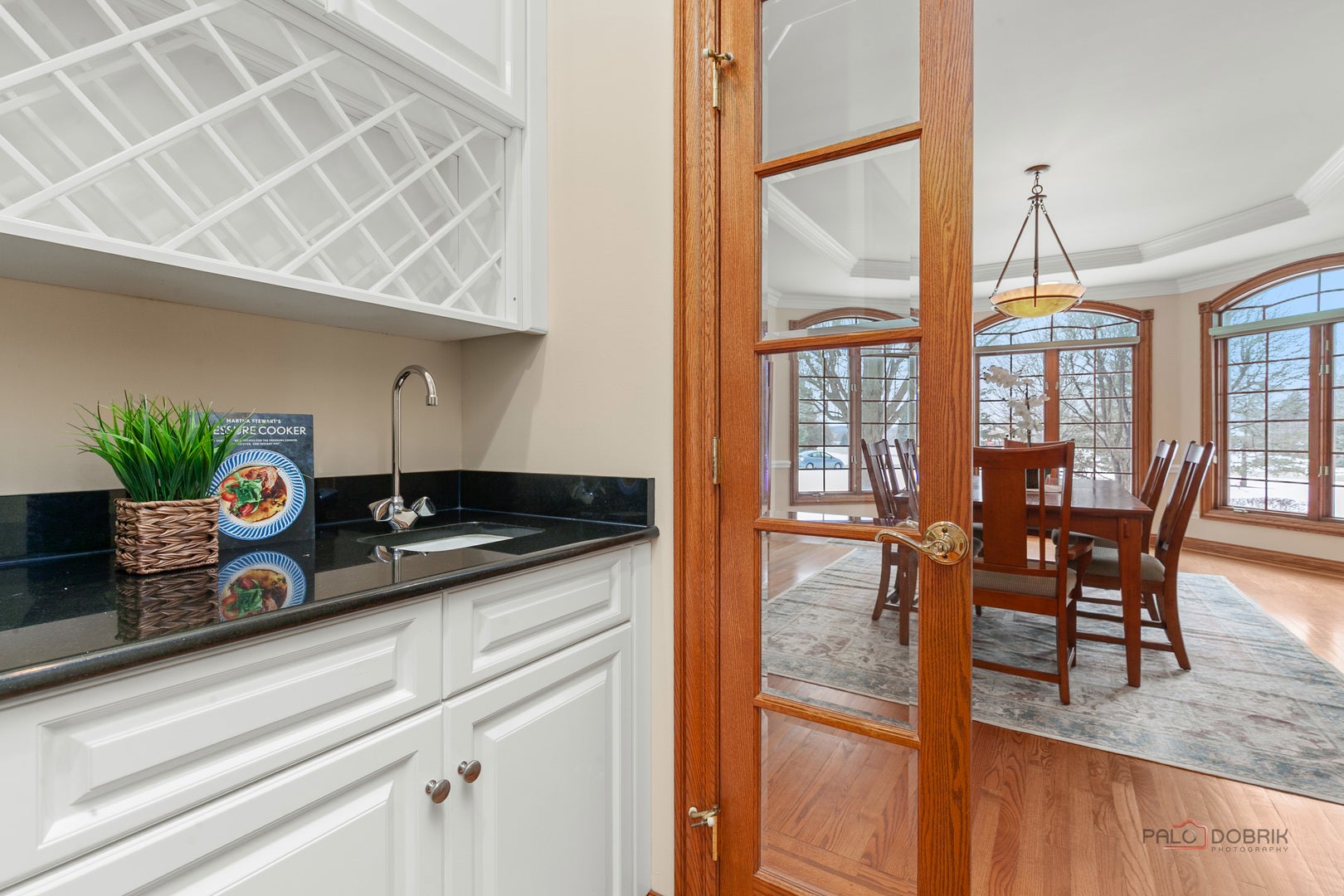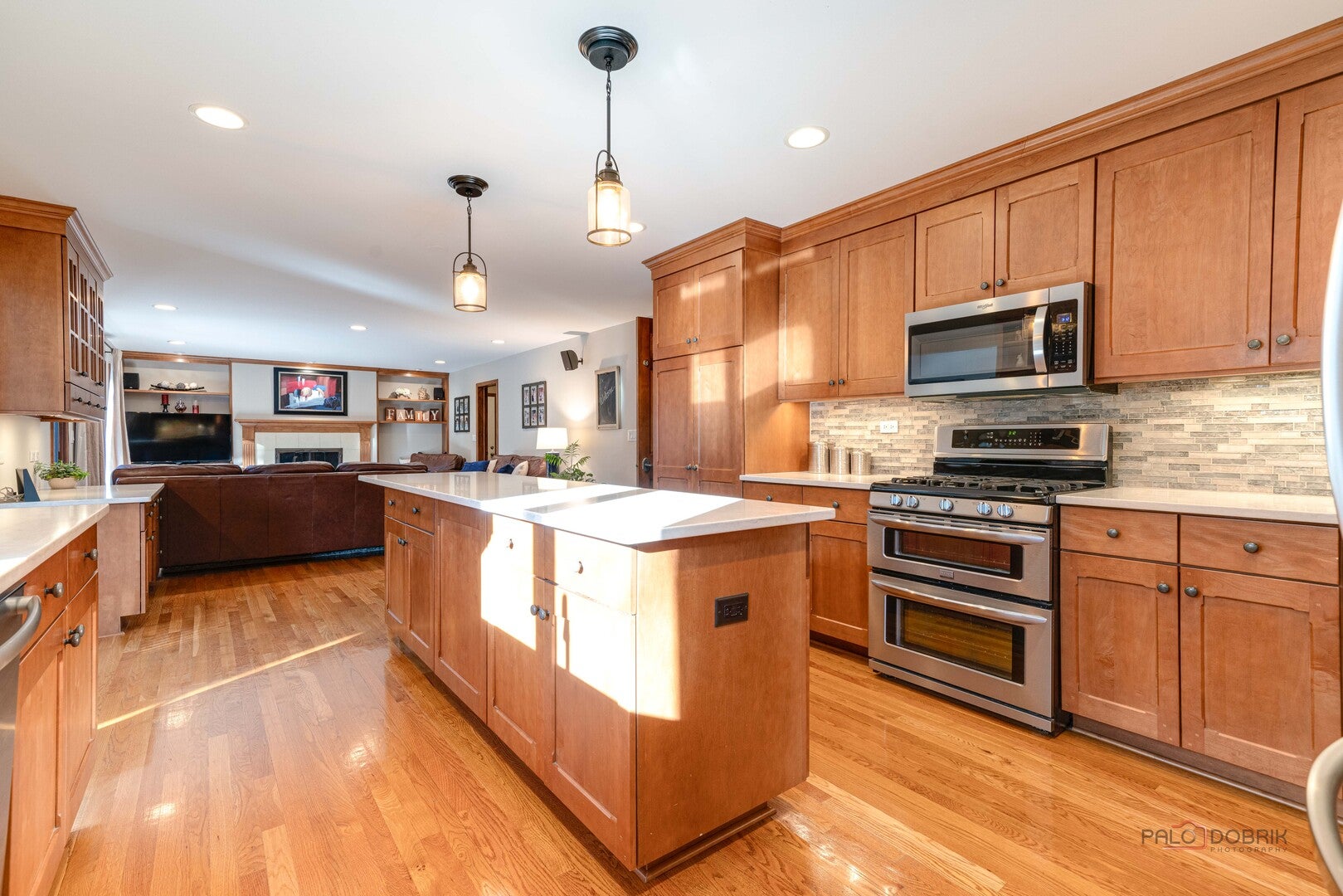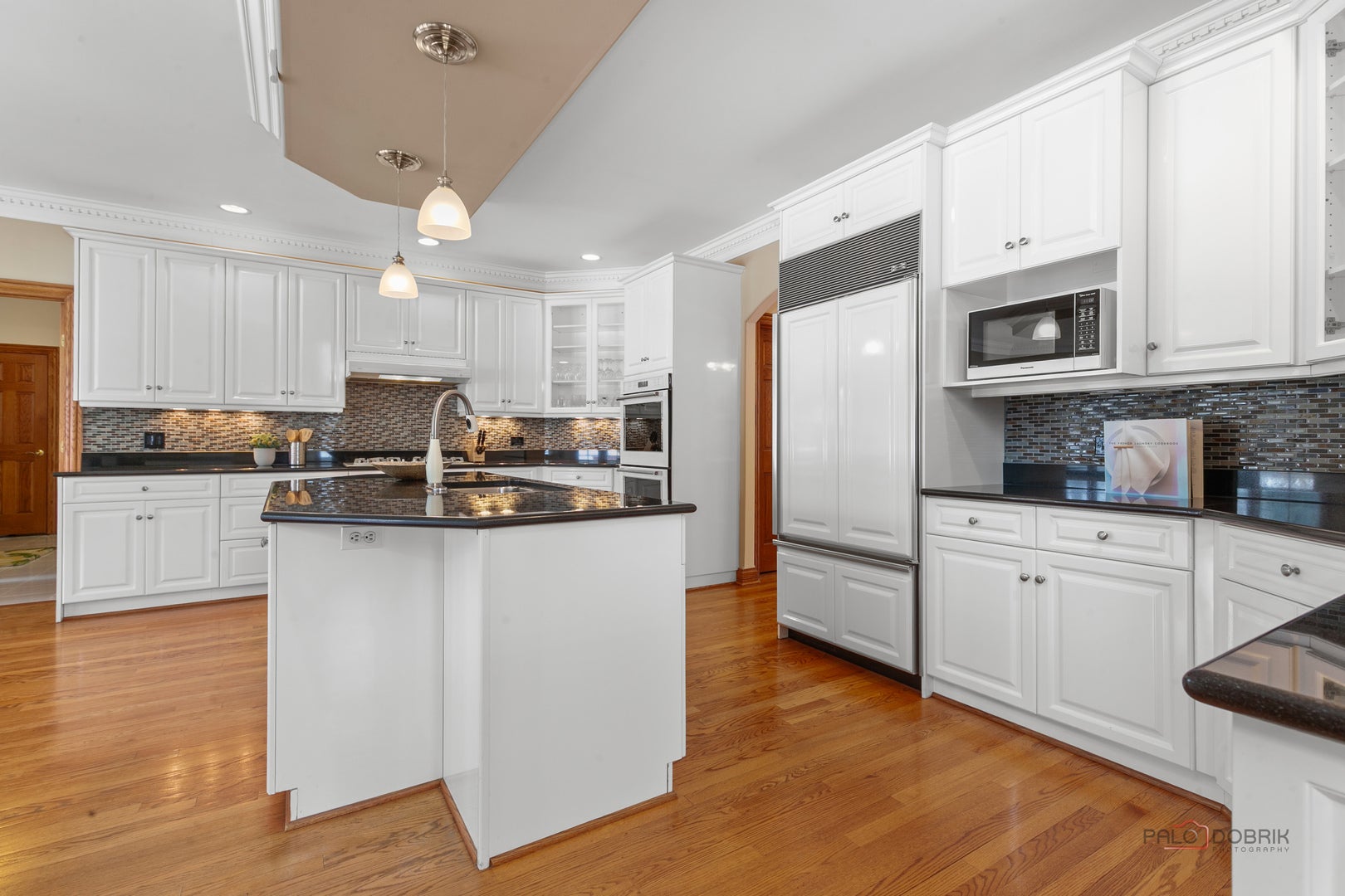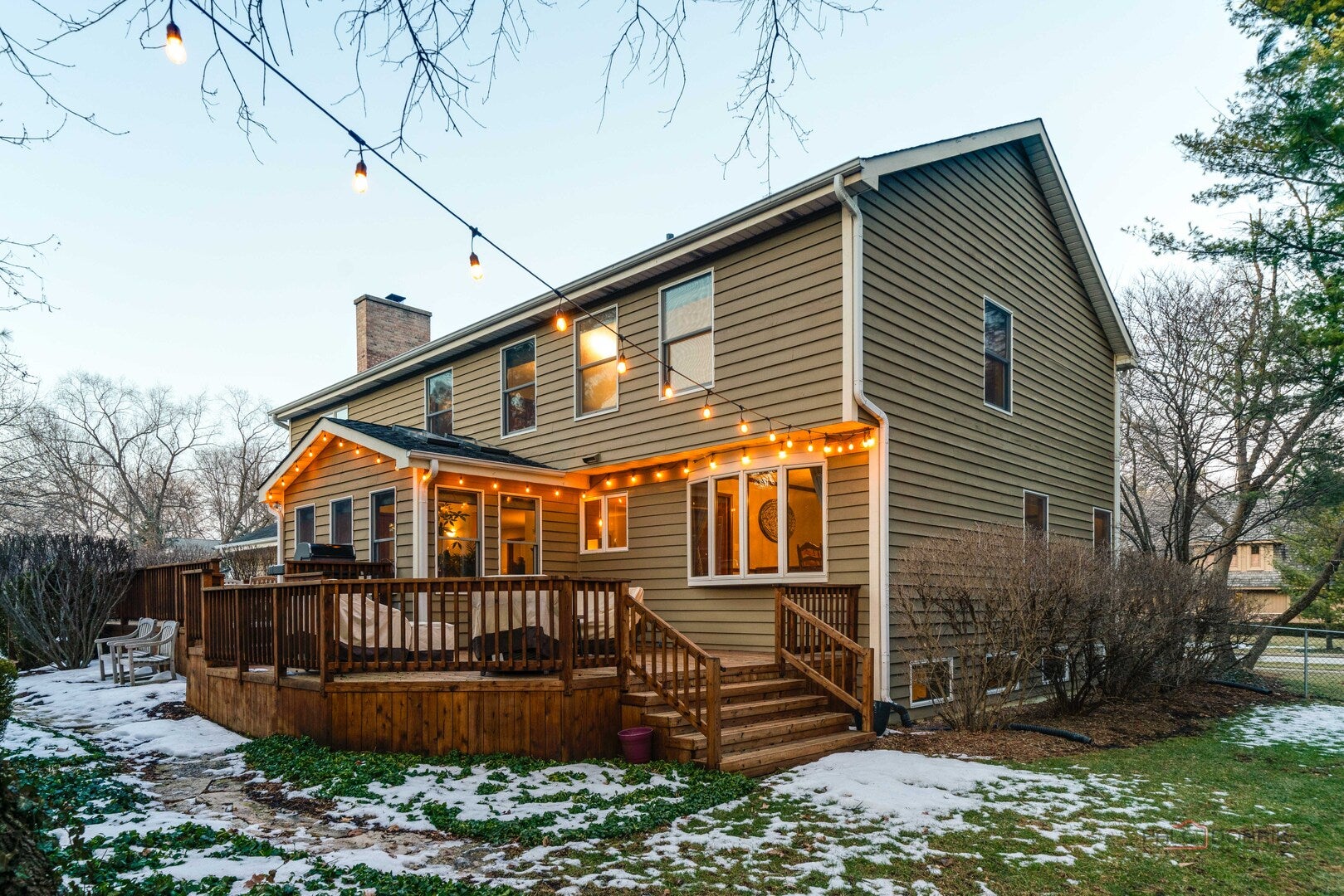 MINUTES TO LAKE MINEAR WITH SCENIC WALKING AND BIKE TRAILS! Impressive 6 bedroom, 4 full bath home on almost a half-acre lot, featuring a finished basement with wet bar, bright sunroom, and fenced backyard, all in a prime Libertyville location near downtown amenities and top-rated schools. The welcoming front porch sets the tone for the peaceful surroundings and offers a perfect place to enjoy morning coffee or unwind at the end of the day. Inside, guests are greeted by a warm foyer and beautifully maintained hardwood flooring that flows throughout the main level, creating a seamless and sophisticated feel. The sun-filled living room and formal dining room offer an ideal layout for both entertaining and everyday living. French doors provide privacy for gatherings, while large windows fill the space with natural light. The eat-in kitchen is the heart of the home, showcasing custom cabinetry with crowned uppers and under-cabinet lighting, quartz countertops, a chic tile backsplash, and stainless steel appliances including an LG refrigerator (2021), Whirlpool microwave (2021), KitchenAid double oven, and Bosch dishwasher. An extra-long center island with breakfast bar seating offers ample prep space or a place to gather for a quick bite, and a built-in planners desk keeps everything organized. Just beyond, the bright heated sunroom overlooks the beautifully landscaped, fenced backyard with mature trees and provides easy access to the expansive deck, creating effortless indoor-outdoor living that is ideal for entertaining. The family room is the perfect retreat to unwind after a long day, featuring a warm gas fireplace with a raised hearth, flanked by built-ins that combine style with storage, and immersive surround sound speakers, offering an ideal space to curl up with a book, enjoy movie nights, or simply relax in comfort. This level also includes a first-floor office great for working remotely, a laundry room, and a full bath. Upstairs, the expansive primary suite features cathedral ceilings, a large walk-in closet with custom organizers, and a spa-inspired bath with dual vanities, whirlpool tub, and separate shower. Four additional generously sized bedrooms with ample closet space and a centrally located full bath complete the second level, accommodating family or guests. The finished basement extends your living space with a large recreation room, wet bar, game area, additional bedroom, and full bath-ideal for guests, entertaining, or creating a media room, home gym, or private retreat. A three-car attached garage and storage shed provide exceptional storage. Located just minutes from Adler Park, the pool, Adler School, boutique shopping, dining, the farmers market, and Metra access. This is a must see!