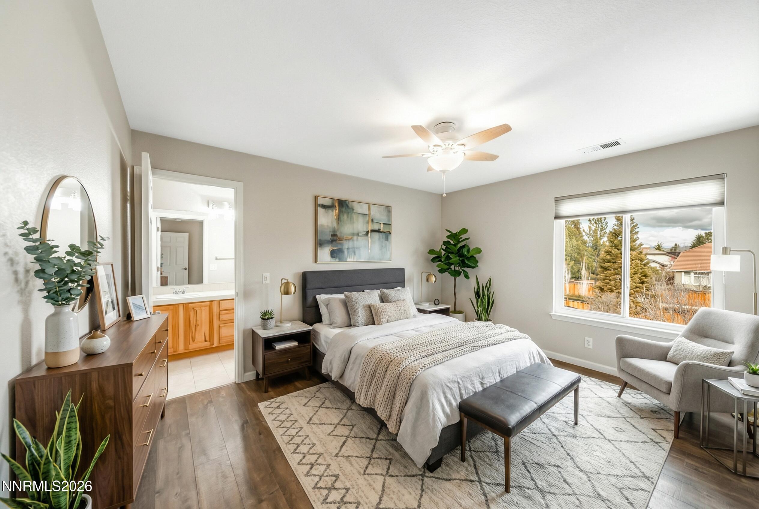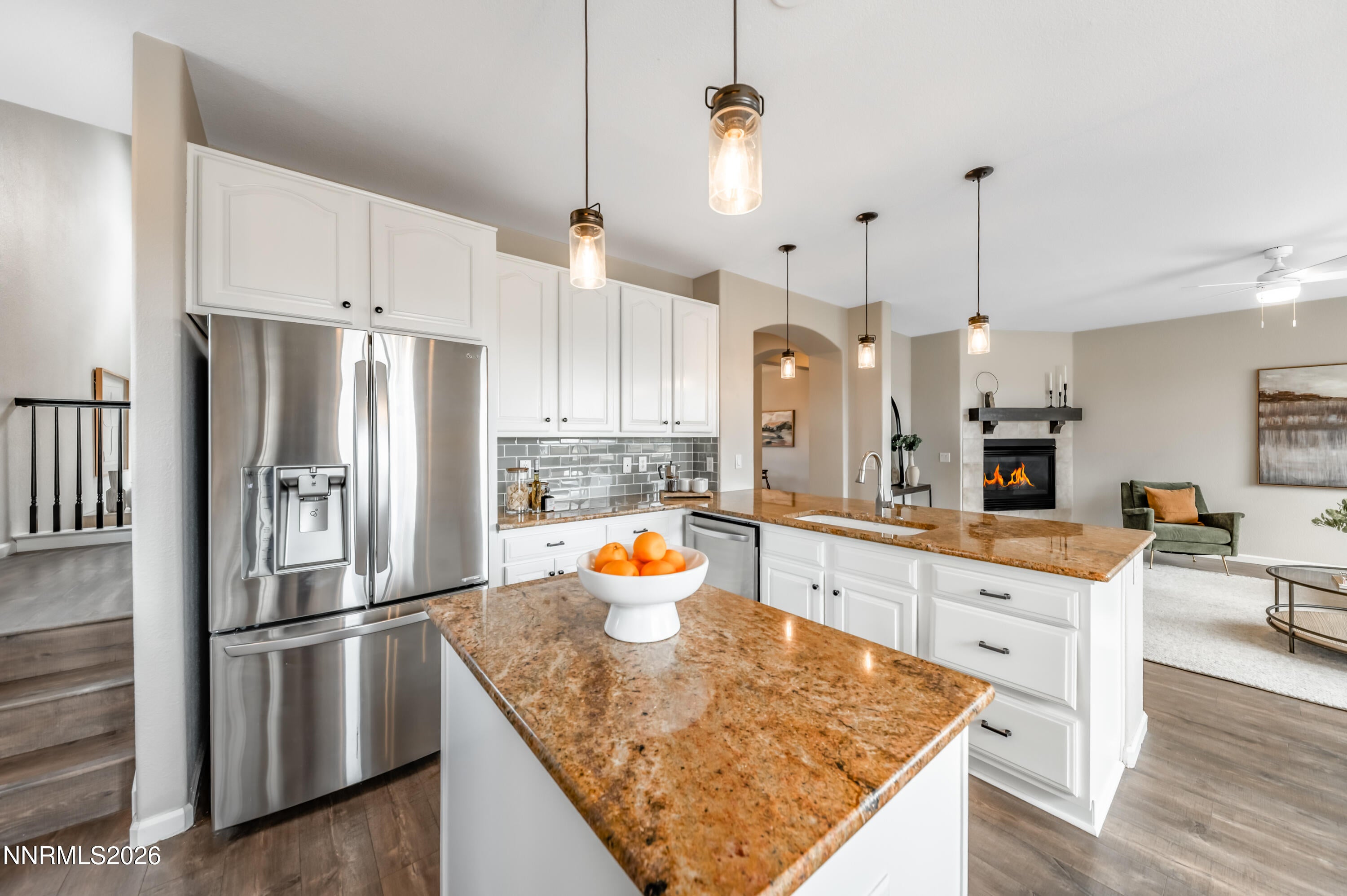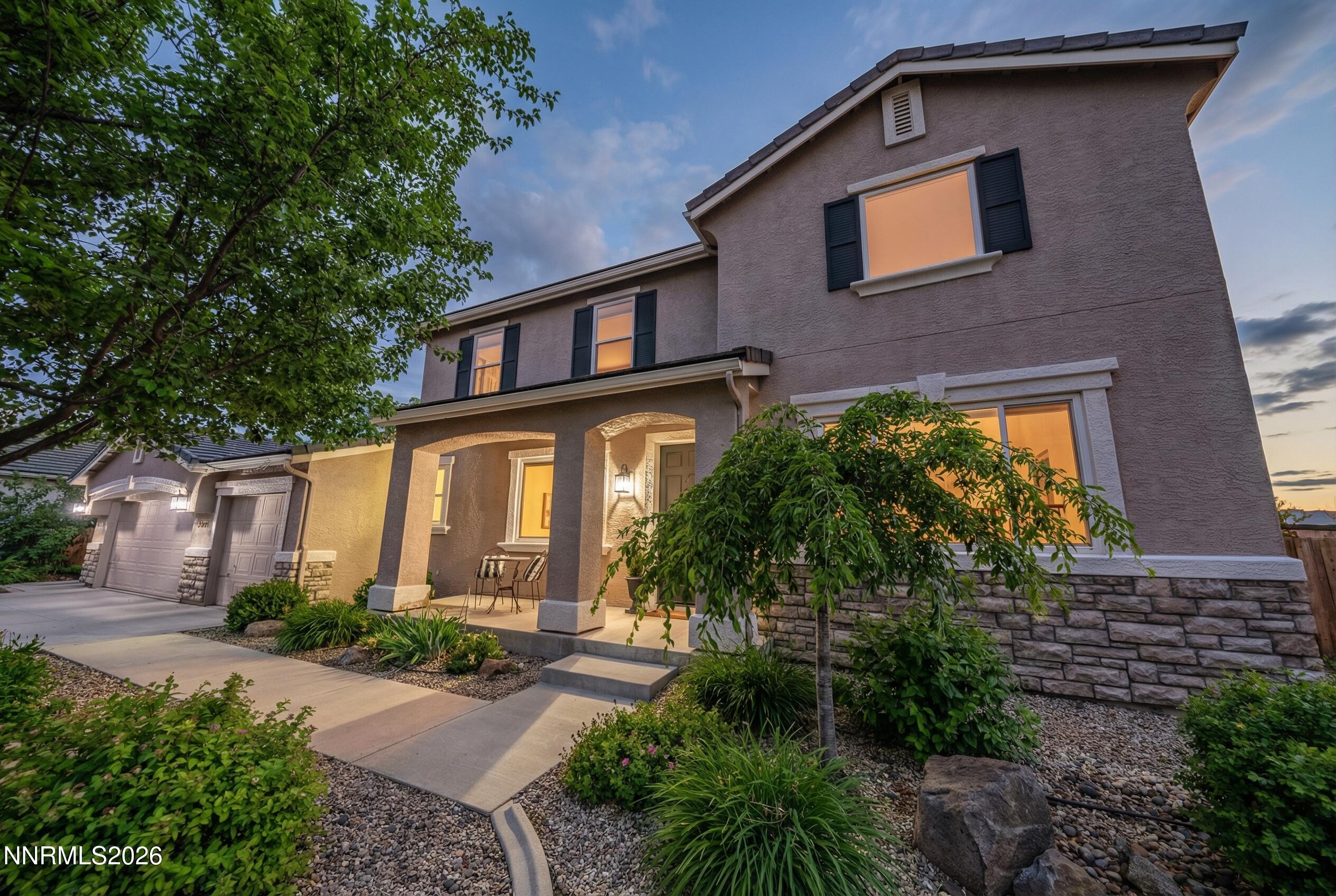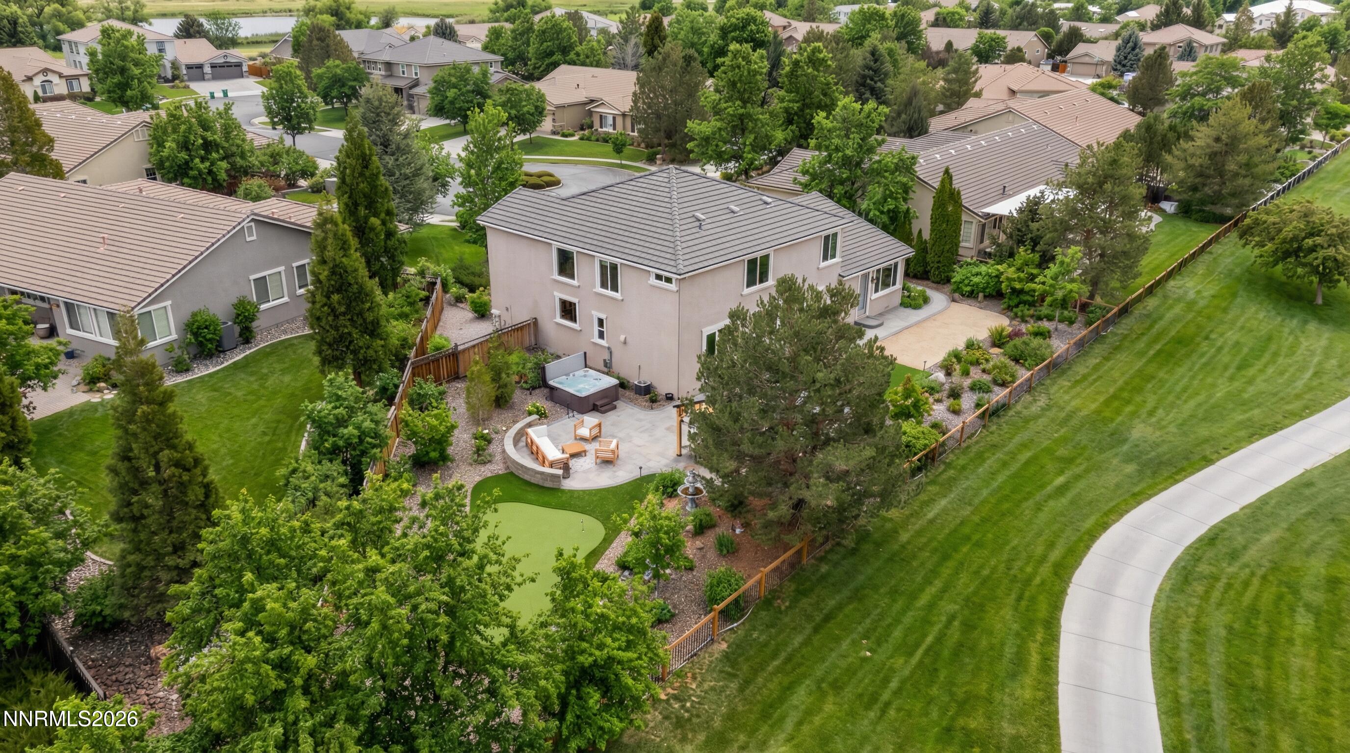 Welcome to 2880 Thistle Belle Ct, a stunning home nestled on a quiet cul-de-sac in the highly sought-after Wingfield Springs community of Sparks, Nevada. Perched directly on the 10th green of the Lakes Course at Red Hawk, this five-bedroom, three-and-a-half-bathroom residence delivers 3,171 square feet of thoughtfully designed living space on one third of an acre where everyday comfort meets resort-style luxury. Step through the inviting foyer and you will immediately notice the soaring vaulted ceilings, abundant windows, and natural light that floods every corner of this beautifully maintained home. Just off the foyer, a large separate family room provides a welcoming gathering space distinct from the main living area perfect for movie nights, a quiet reading retreat, or simply spreading out when the house is full of guests. The great room concept creates a seamless flow perfect for both intimate gatherings and grand celebrations, anchored by one of two gas log fireplaces that add warmth and ambiance throughout the seasons. The refreshed kitchen is a showstopper, featuring crisp white cabinetry, classic subway tile backsplash, double ovens, and a gas cooktop that will make any home chef feel right at home. A formal dining room provides an elegant setting for special occasions, while luxury vinyl plank flooring runs throughout the home for a clean, cohesive aesthetic that is as durable as it is beautiful. The main-level primary bedroom is a true retreat, complete with its own gas log fireplace because nothing says I have arrived quite like a fireplace in your bedroom. This generous suite features a private en suite bathroom and direct walkout access to the backyard, seamlessly connecting your personal sanctuary to the outdoor paradise just beyond the door. Upstairs, four spacious bedrooms await, including a convenient jack and jill configuration that is perfect for families. Two of the four bedrooms offer wonderful flexibility, easily serving as a bonus room and a dedicated home office to suit your lifestyle needs. All upstairs rooms are virtually staged, allowing you to envision the full potential of each space. The quality of construction throughout this home is evident in every detail, from the thoughtful layout to the premium finishes. Now, let us talk about the backyard where the magic truly happens. The western-exposed outdoor space serves up breathtaking Sierra sunsets with stunning views of Mount Rose as your nightly backdrop. An entertainers dream, the yard features a putting green, a jetted hot tub, a charming gazebo, a classic fountain, and a gas firepit table combo. All backyard furniture conveys with the sale, and interior furniture is available for purchase making a seamless move-in even easier. Golf lovers, grab your cart and you are on the course in moments. The generous driveway accommodates approximately nine vehicles, complemented by a spacious three-car bay garage because around here, we take parking seriously. The neighborhood places you just moments from Davids Grill and the Red Hawk Golf and Resort, with convenient access to Raleys and Costco for those weekend stock-up runs. Tech professionals will appreciate easy access to USA Parkway, Tesla, Google, Switch, and more, with the Reno Tahoe International Airport just twenty minutes away and Lake Tahoe a short drive for skiing, hiking, and every outdoor adventure imaginable. Low homeowners association fees make this an even sweeter opportunity. Schedule your private showing today before this gem finds its new owner.