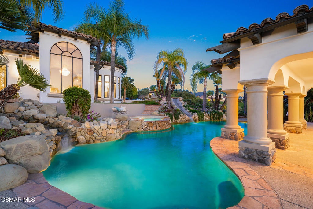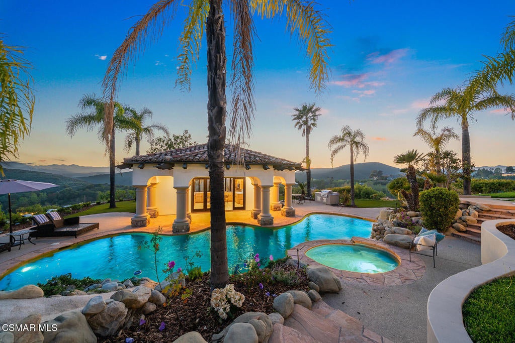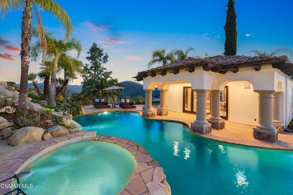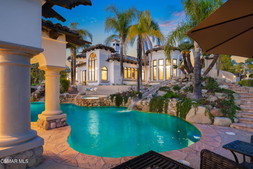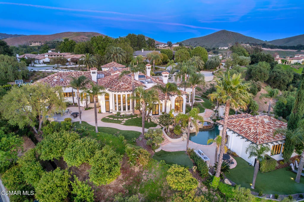 The ultimate masterpiece estate in guard gated North Ranch Country Club Estates! A completely reimagined Spanish transitional sitting behind private gates on an epic 3.16 acres with panoramic views! A very rare compound featuring a detached guest house, separate pool house and too many amenities to mention! The main residence (8384 square feet) provides 7 bedrooms and 9 bathrooms, theater, ELEVATOR from garage to main living areas, office/library, teen/bonus room, and more. The dream center island kitchen boasts top of the line appliances and opens seamlessly to the family room. There is also a jaw dropping great room that will leave you speechless! The primary suite is warmed by a custom fireplace and boasts a sitting room and newly remodeled awe inspiring Four Seasons quality bathroom! The resort quality grounds are second to none! There are two pools, pool house/cabana, water features, an abundance of manicured lawns and a very special lower yard with entertainment areas, (second pool) and an ideal space for possible tennis court. All of this with panoramic unobstructed views and complete privacy! Among the homes many other attributes are a solar system, smart home technology and simply too much to mention! This is a one of one masterpiece property professionally designed and built using the very finest finishes throughout!