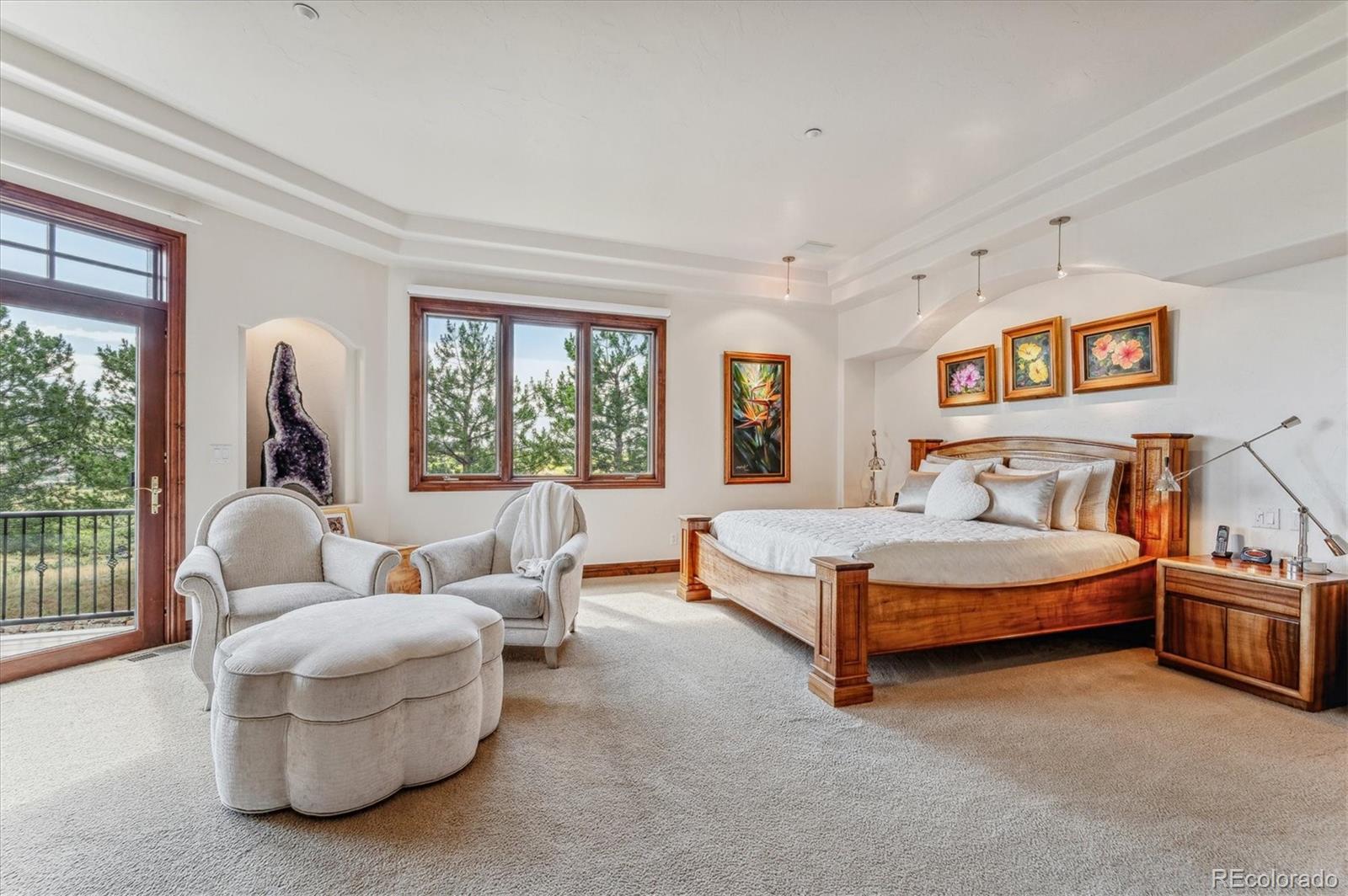 Discover this exceptional Summit Chalet home, distinguished by its unique design and expansive ranch floorplan. Enter through a grand foyer to literally gleaming hardwood floors to find a formal living room, dining room and main floor office. The gourmet kitchen has everything you would ever need including a gas cooktop, breakfast nook and fabulous island. The huge main floor master suite includes a luxurious 5-piece spa like master bath and walk-in closet with built-ins. Marvel at the floor-to-ceiling windows offering unparalleled 360-degree views. The home features large bedrooms with generous walk-in closets and a stunning walkout lower level with a huge family room, built-in bar, entertainment area, and library. Art niches, sculptured drywall and three fireplaces are just a few of the many features. Over six acres of land adorned with pine trees, scrub oak, and Juniper trees enhance the charm. Wildlife is abundant, and the landscape is beautifully designed with moss rock retaining walls. The property boasts upper and lower decks and thousands of acres of open space just across the street. Additional amenities include a security system, humidifier, fire protection sprinkler system, and central vacuum system readiness. Recent updates include new exterior paint and stain, a new deck, and a new dishwasher.