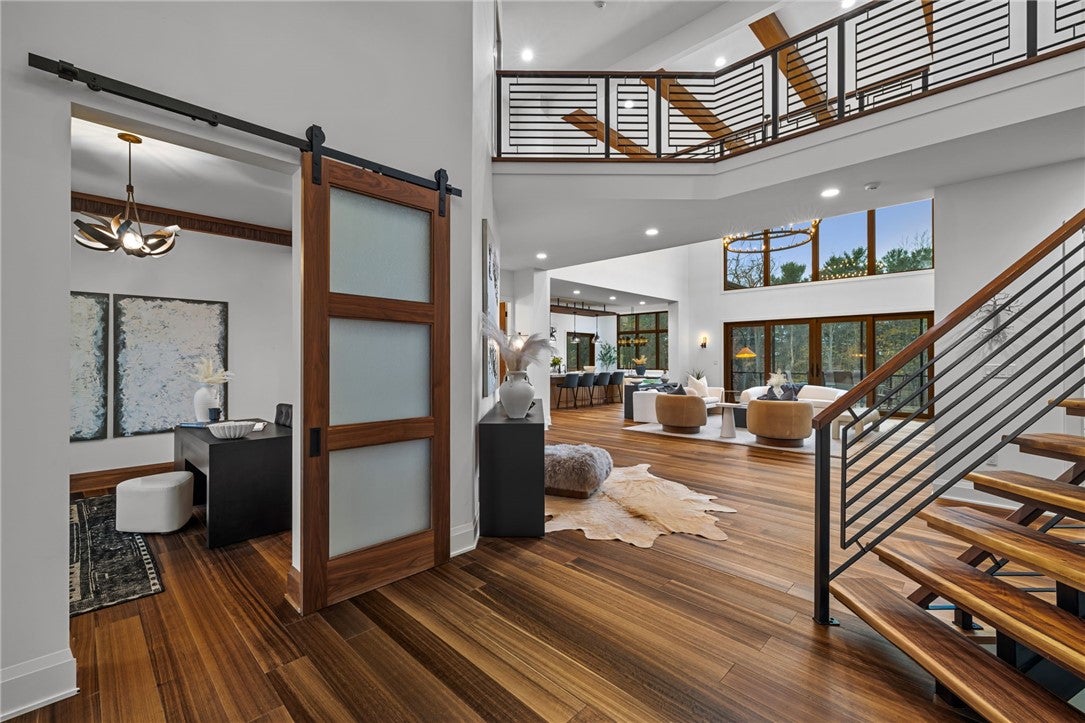 Welcome to 150 Flat Rock Ridge, a stunning custom Timber Frame home on 6 beautiful acres with majestic mountain views. Created by an engineer as a loving gift to his wife and family, this 6,000 sf masterpiece is both home & work of art. The entryway is breathtaking with extraordinary views framed by double curved staircases and beams above.