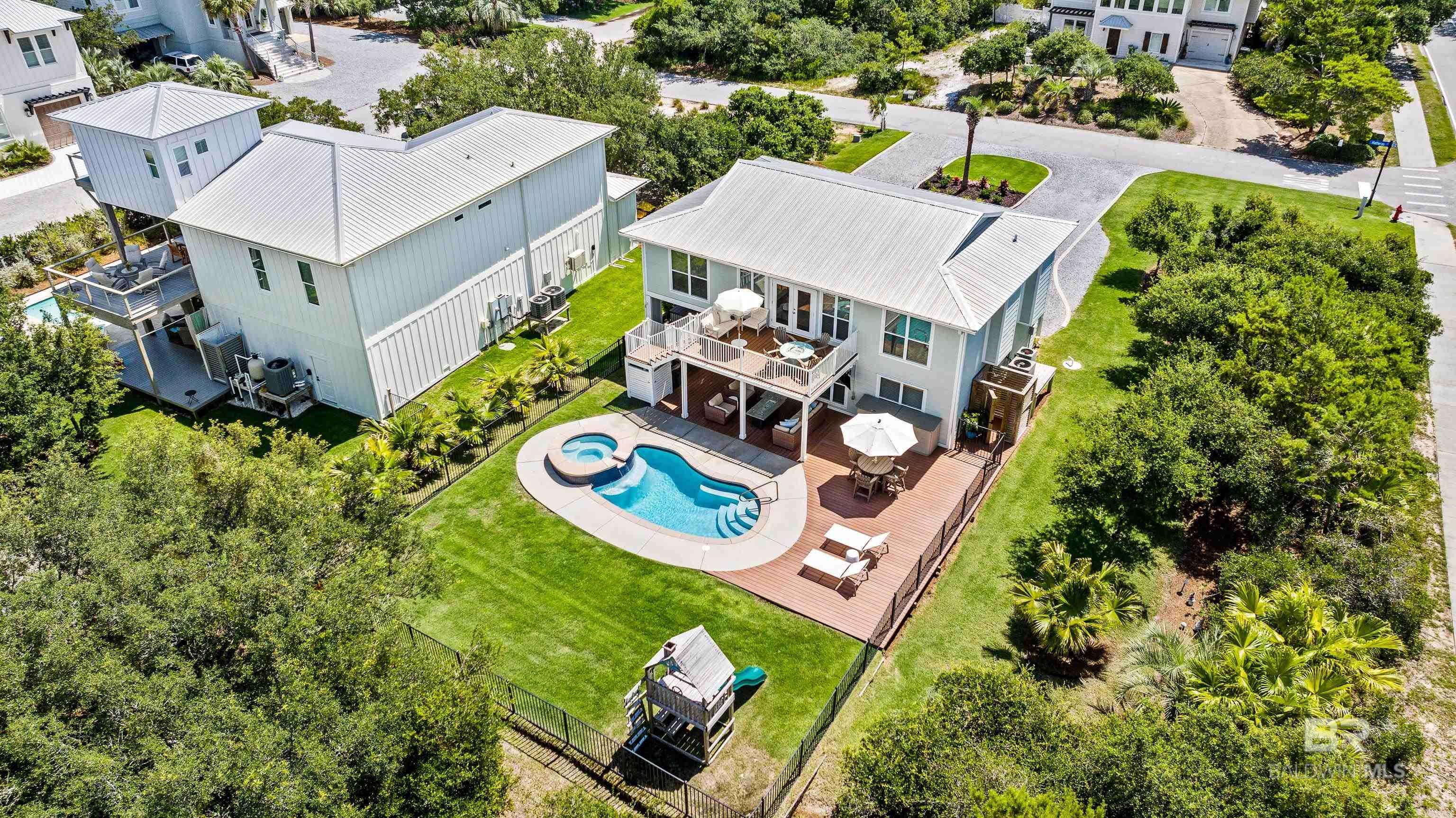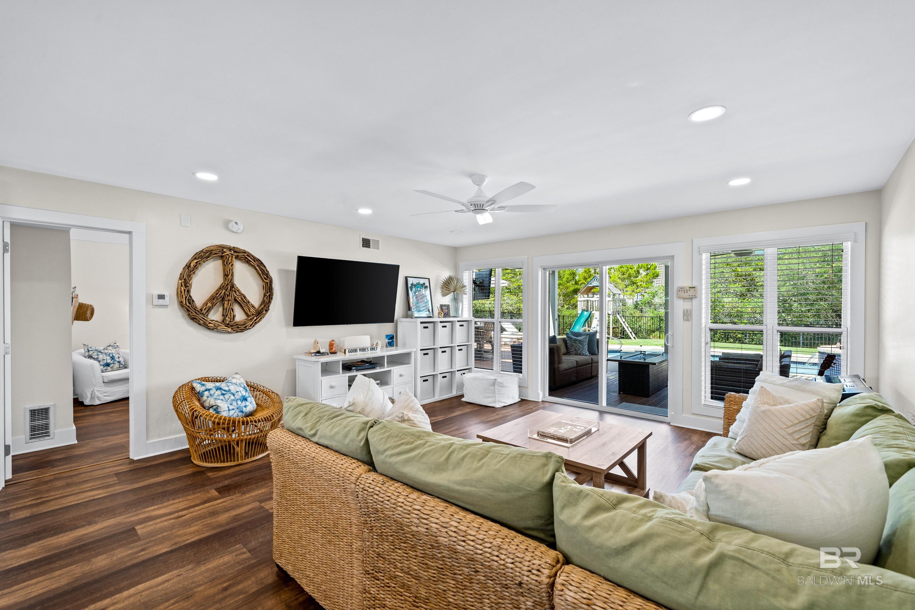 Turnkey Ono Island home with a pool and deeded water access! This beautifully updated property is situated on a spacious corner lot and has been crafted into an outdoor oasis designed with a heated pool and spa, Trex Transcend decking, fenced backyard, covered rear patio, elevated rear porch, electric sunshade, and dense tropical landscaping that provides and abundance of privacy.