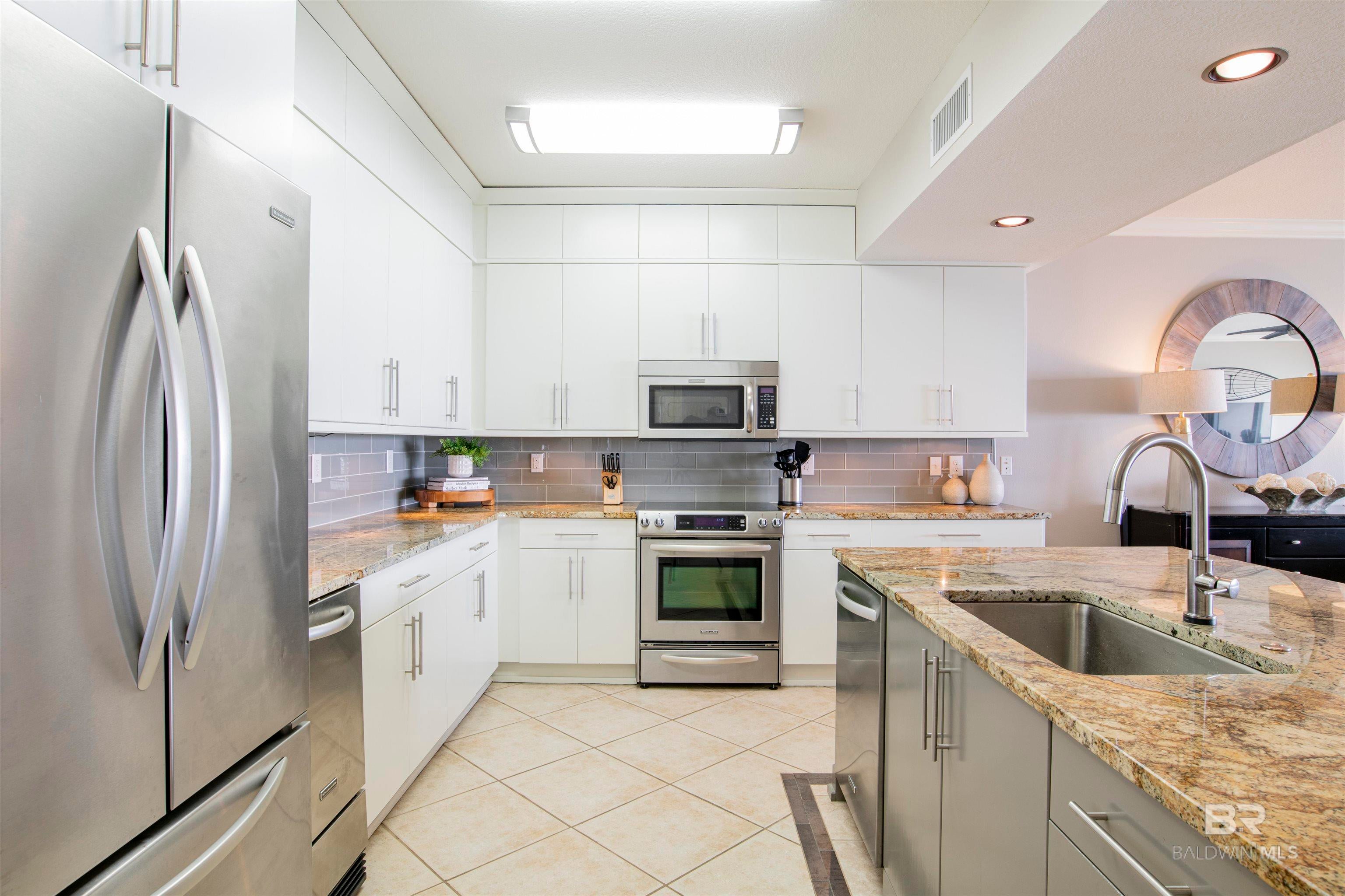 Elegant and pristine 3-bedroom, 3-bath condo at Admirals Quarters in the heart of Orange Beach. Each bedroom features a beautifully remodeled en-suite bath with walk-in showers, while the primary suite offers private access to the large balcony for sweeping Gulf views, beautiful sunsets and breathtaking views of Perdido Pass - the perfect place to relax after a long day! Unit 708 also comes with an 80 gallon commercial water heater and roll down hurricane shutters. The stunning kitchen showcases stainless steel appliances, granite countertops, and a large center island ideal for entertaining. Upscale furnishings, all tile floors, new paint, luxurious king sleep number bed in the primary bedroom and so much more make this unit stand above the rest! Admirals Quarters features an array of amenities including indoor and outdoor pools, hot tub, sauna, fitness center, and BBQ area, as well as beach access. The complex is only a short walk or drive to several local restaurants, bars, and shops. Sold fully turn-key and already a proven rental machine, this Gulf-front retreat is perfect for investors or those seeking effortless coastal luxury. Buyer to verify all information during due diligence.