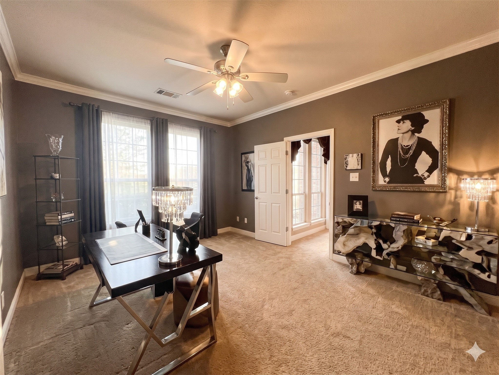 Modern deluxe appointments. The Windsongs welcoming covered entry and soaring foyer reveal a view of the stunning private courtyard, flowing into the bright office, expansive dining room and great room with cathedral ceilings, and large desirable covered patio beyond.