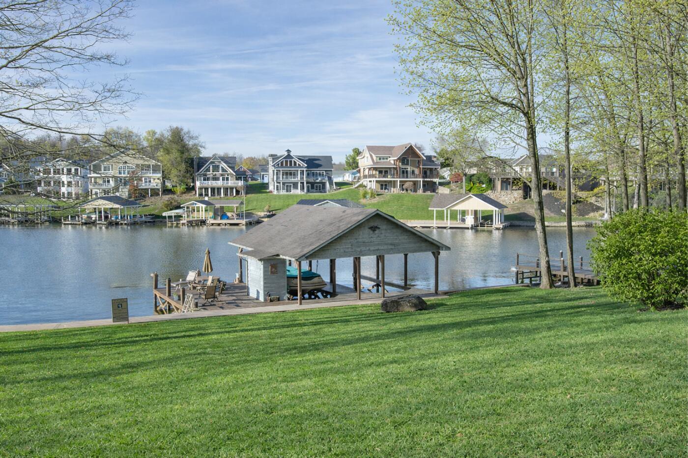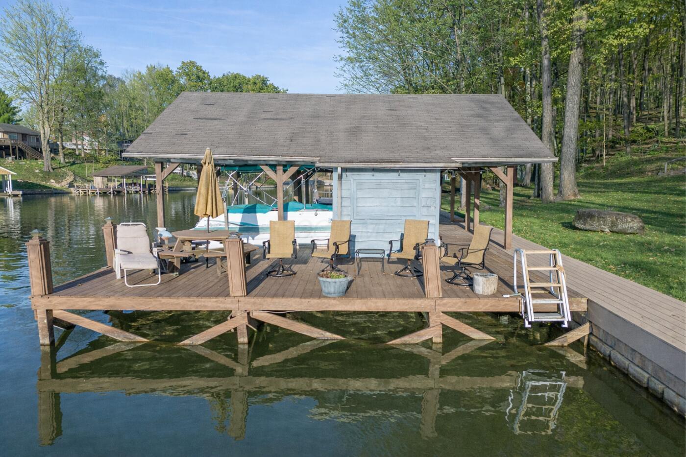 Lakefront living designed for relaxation and entertaining. This custom-built Amish home offers 4 bedrooms, 3 baths, comfortable living spaces, and beautiful water views throughout. The spacious kitchen with oak cabinetry and appliances opens to a warm four-season room, perfect for morning coffee or quiet evenings overlooking the lake. Step onto the large rear deck or enjoy the covered lower deck with steps leading down to the dock. The vaulted living room features a striking floor-to-ceiling brick fireplace that creates a cozy focal point. The private primary suite includes its own bath and two walk-in closets, with an additional bedroom on the main level. The finished lower level offers great flexibility with a large family room with a second propane gas-log fireplace, two additional bedrooms, a full bath, recreation room, office space, and workshop area. Outside, enjoy 101 FT of water frontage with a safe swimming area, 2024 Amish-built seawall and 2-bay covered boat dock. Also, enjoy the wonderful 3-car garage with workshop space. We got this on early so you can enjoy the start of the boating season!! .