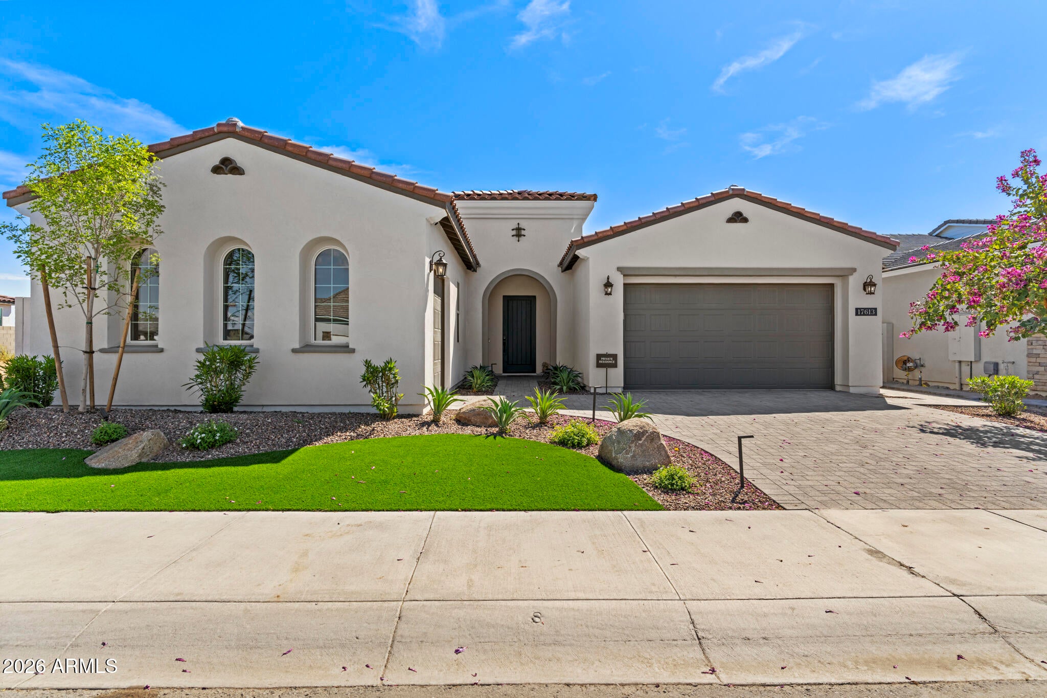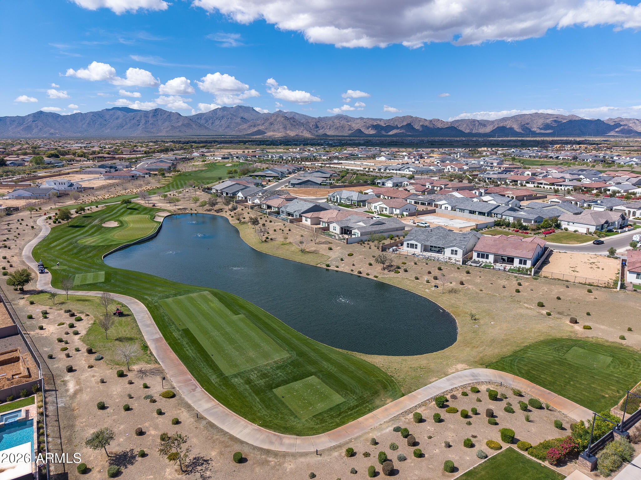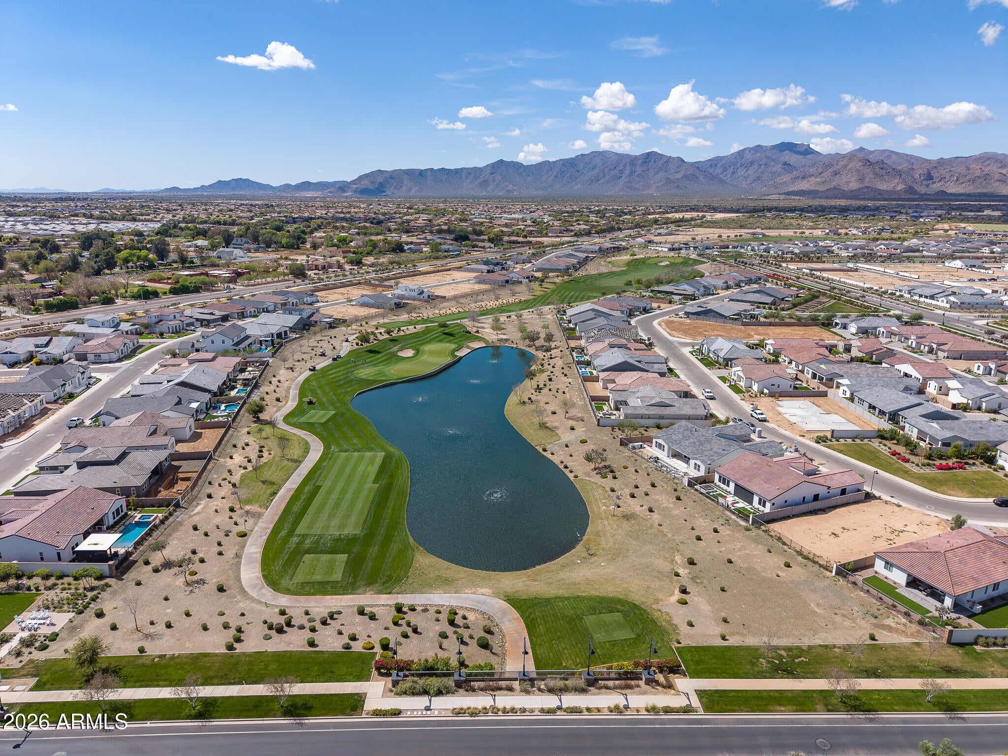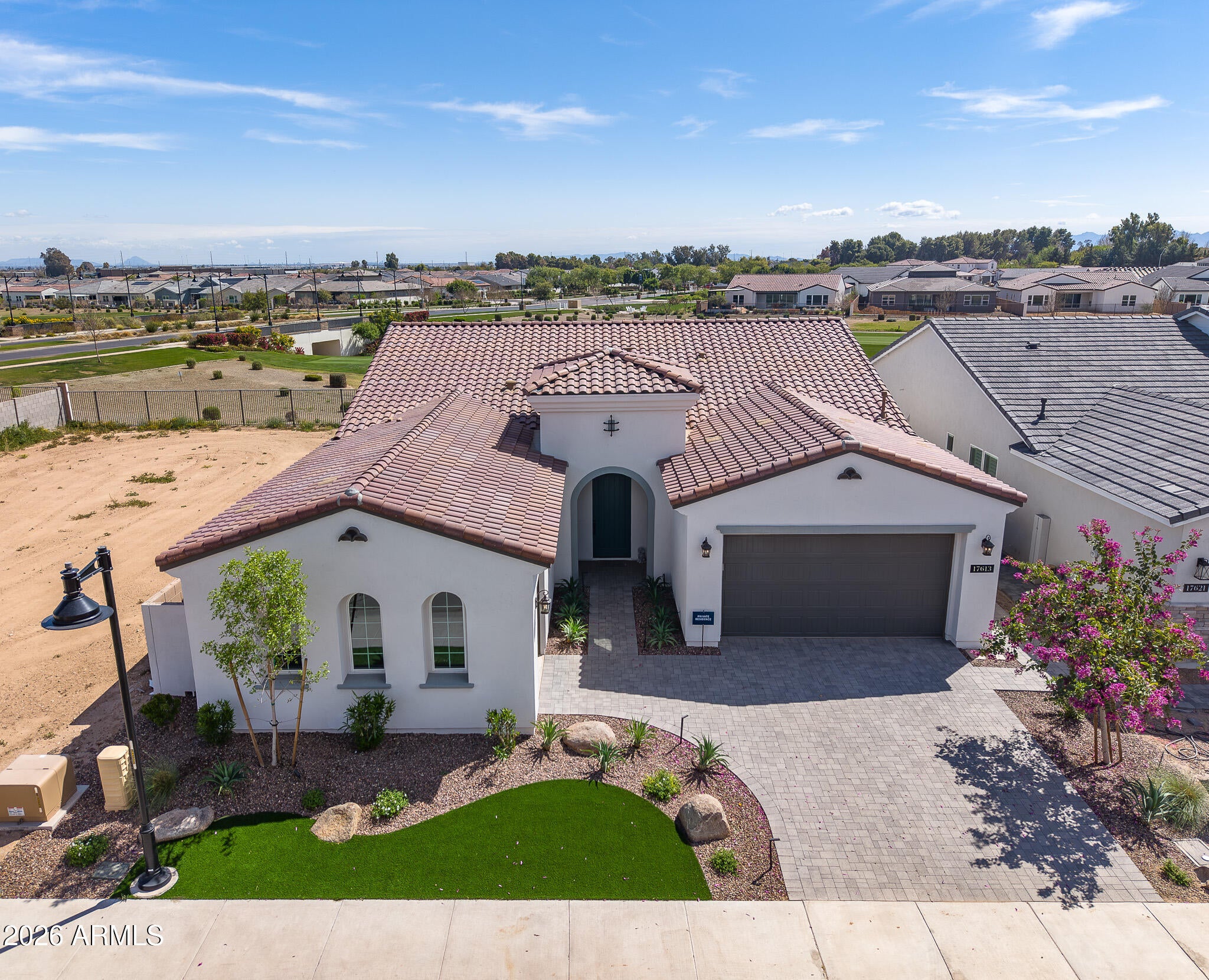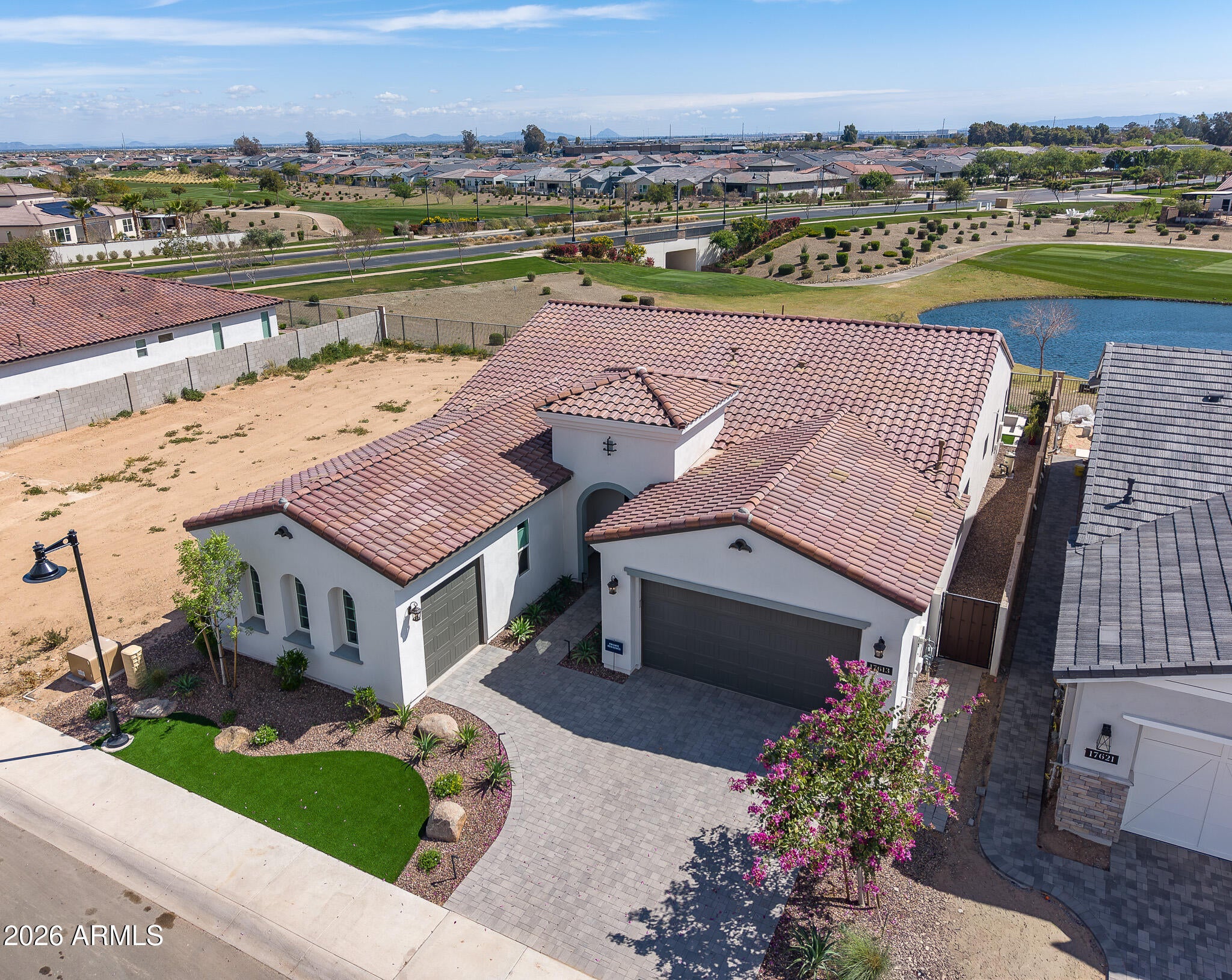 Wake up every day to unobstructed water and golf course views overlooking the 13th hole at Sterling Grove Golf & Country Club, where birds fish along the waters edge and soar overhead--pure Arizona serenity. This two-year-old, very lightly lived-in Spanish Matthews model sits on a premium golf lot and offers refined single-level living designed for comfort and style.