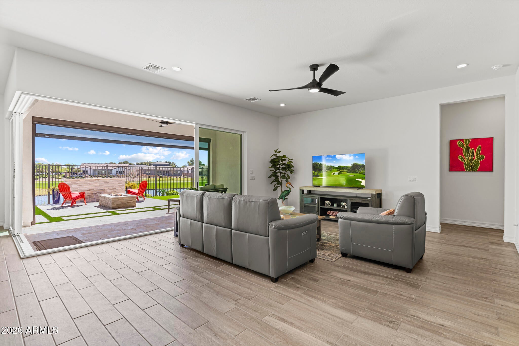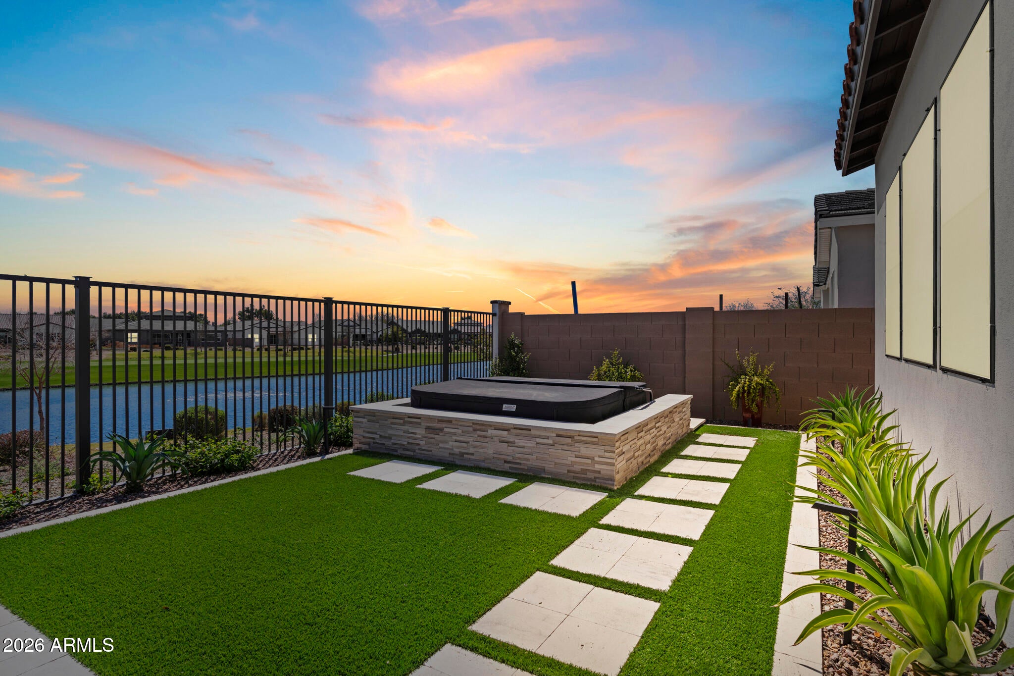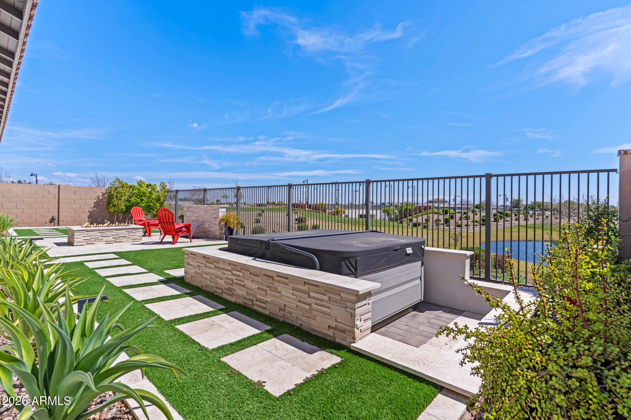 Wake up every day to unobstructed water and golf course views overlooking the 13th hole at Sterling Grove Golf & Country Club, where birds fish along the waters edge and soar overhead--pure Arizona serenity. This two-year-old, very lightly lived-in Spanish Matthews model sits on a premium golf lot and offers refined single-level living designed for comfort and style. The primary suite is a true retreat with a spa-inspired, resort-style bathroom, while two additional en-suite bedrooms provide ideal privacy for guests. A flexible bonus room is perfect for a home office, den, or media space. The chefs kitchen is a showstopper, featuring a quartzite waterfall island, upgraded cabinetry, and high-end finishes. An upgraded laundry room with additional cabinetry and a sink adds... ...everyday convenience. The living and dining spaces are framed by a dramatic 90-degree stacking sliding glass door, creating a seamless indoor-outdoor transition. Step outside to the covered patio with a motorized sun screen, complemented by sun-filtering window screens throughout the home.The backyard is professionally landscaped with travertine tile, low-maintenance turf, a tranquil water feature, and a sunken Jacuzzi hot tub--perfect for relaxing or entertaining. A gas line is already plumbed and ready for your BBQ. Front and backyard lighting complete the outdoor experience.A spacious three-car garage offers ample room for vehicles, golf carts, and other recreational equipment. Community & Lifestyle Sterling Grove is the West Valleys newest premier golf destination, featuring a world-class Nicklaus Design golf course operated by Troon Golf Management Services, thoughtfully designed for both seasoned golfers and newcomers. State-of-the-art practice facilities include a driving range, putting and chipping greens, and an on-site golf simulator.Residents enjoy a resort-style pool, spa services, fitness center, restaurant, and an elegant clubhouse with first-class amenities. Step outside your door to bike or jog through this beautifully landscaped, gated community, all just minutes from shopping and dining at Prasada.Luxury, lifestyle, and views--this is Arizona golf course living at its finest.