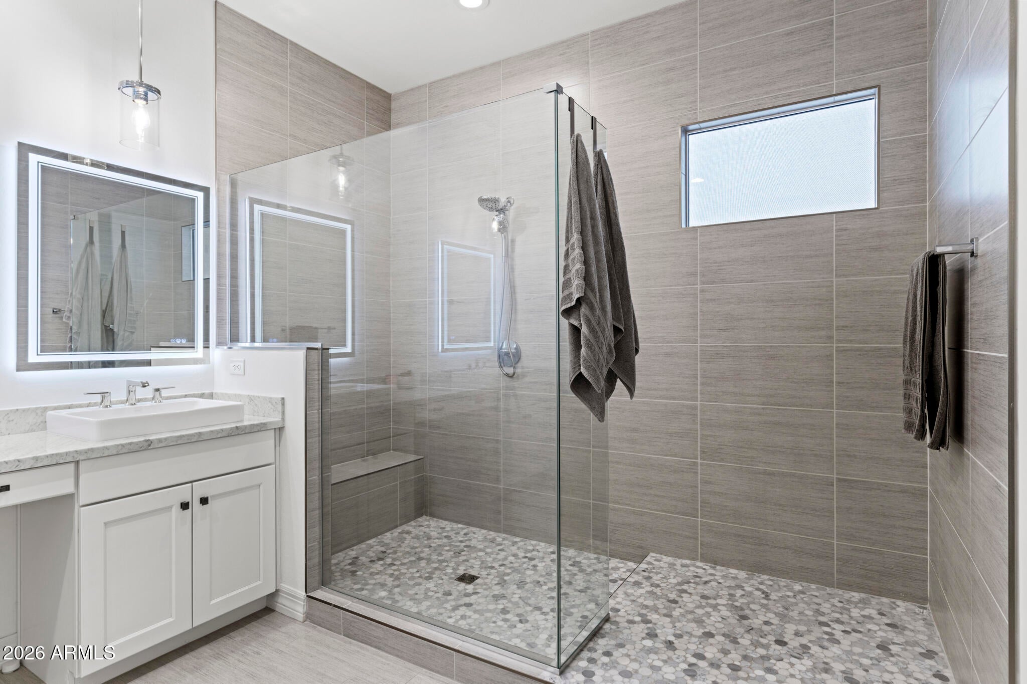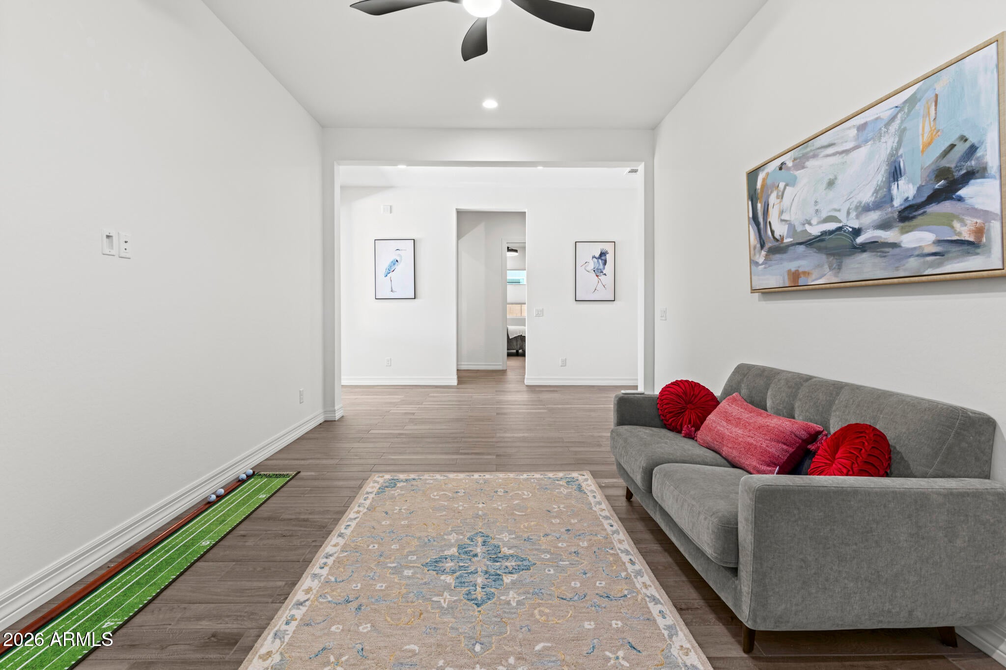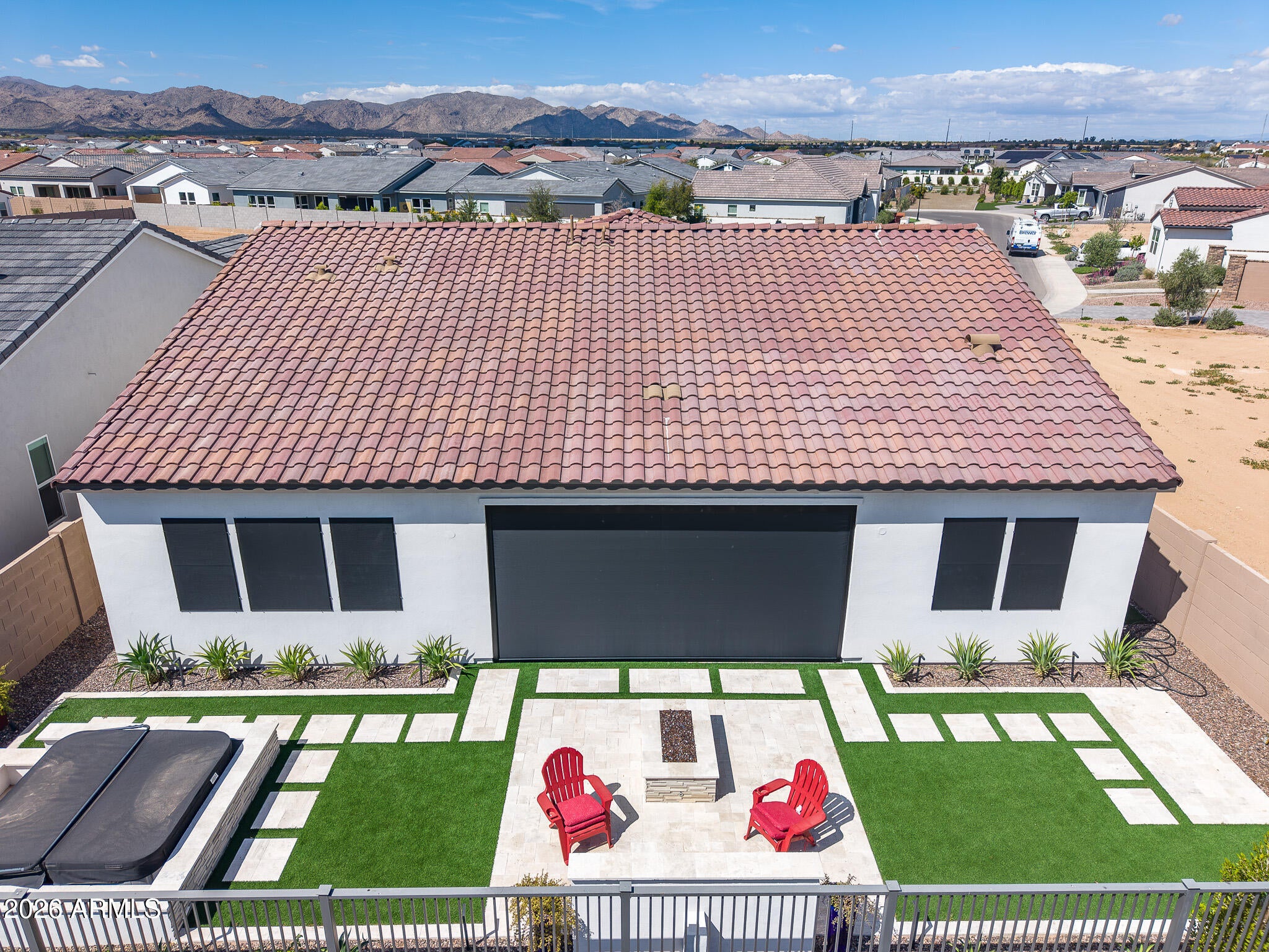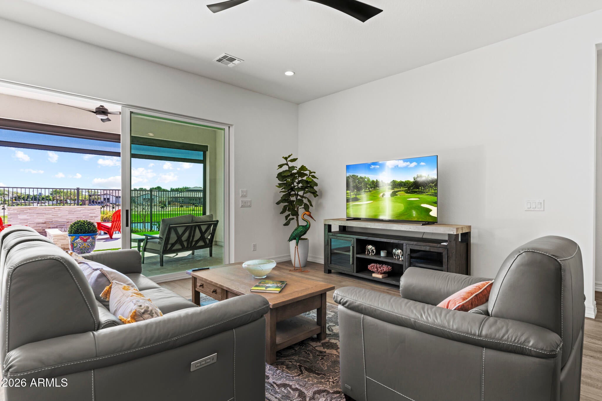 Wake up every day to unobstructed water and golf course views overlooking the 13th hole at Sterling Grove Golf & Country Club, where birds fish along the waters edge and soar overhead--pure Arizona serenity. This two-year-old, very lightly lived-in Spanish Matthews model sits on a premium golf lot and offers refined single-level living designed for comfort and style. The primary suite is a true retreat with a spa-inspired, resort-style bathroom, while two additional en-suite bedrooms provide ideal privacy for guests. A flexible bonus room is perfect for a home office, den, or media space. The chefs kitchen is a showstopper, featuring a quartzite waterfall island, upgraded cabinetry, and high-end finishes. An upgraded laundry room with additional cabinetry and a sink adds... ...everyday convenience. The living and dining spaces are framed by a dramatic 90-degree stacking sliding glass door, creating a seamless indoor-outdoor transition. Step outside to the covered patio with a motorized sun screen, complemented by sun-filtering window screens throughout the home.The backyard is professionally landscaped with travertine tile, low-maintenance turf, a tranquil water feature, and a sunken Jacuzzi hot tub--perfect for relaxing or entertaining. A gas line is already plumbed and ready for your BBQ. Front and backyard lighting complete the outdoor experience.A spacious three-car garage offers ample room for vehicles, golf carts, and other recreational equipment. Community & Lifestyle Sterling Grove is the West Valleys newest premier golf destination, featuring a world-class Nicklaus Design golf course operated by Troon Golf Management Services, thoughtfully designed for both seasoned golfers and newcomers. State-of-the-art practice facilities include a driving range, putting and chipping greens, and an on-site golf simulator.Residents enjoy a resort-style pool, spa services, fitness center, restaurant, and an elegant clubhouse with first-class amenities. Step outside your door to bike or jog through this beautifully landscaped, gated community, all just minutes from shopping and dining at Prasada.Luxury, lifestyle, and views--this is Arizona golf course living at its finest.