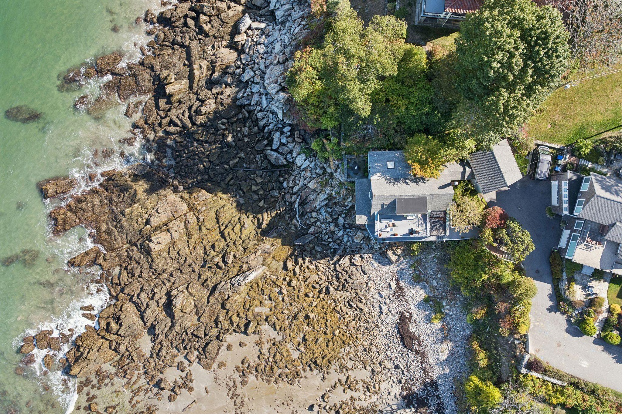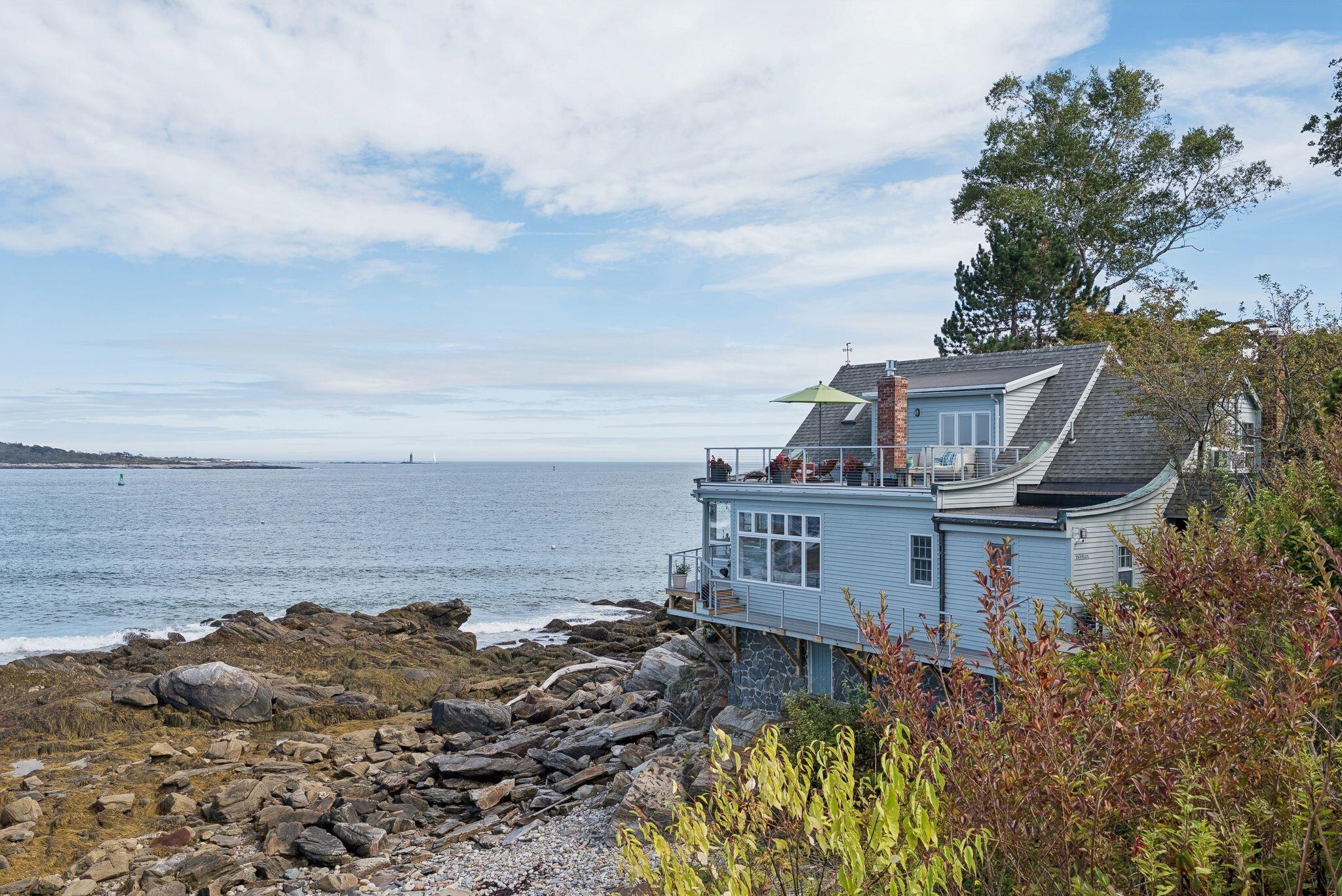 Perched like the prow of a ship with panoramic waterfront vistas, 2 Drew Road presents incomparable seaside living. This unique home is sited on a promontory along the coast with premier views over Maines iconic lighthouses, Fort Gorges, and the bustling shipping channel. A natural wooded buffer ensures an uncommon level of privacy, allowing the beauty of the ocean to take center stage. Multiple outdoor living spaces, including a stone patio and rooftop deck, invite you to host, relax in the sun, or simply watch the boats sail by. The original 1920s cottage has been updated and expanded for modern living. The open layout centers on a chefs kitchen and large dining area, while the sunroom sparkles with a wall of windows and outdoor access. Gather with family and friends in the sunken living room with a gas fireplace and stunning views. A calming retreat, the primary bedroom on the first floor overlooks easterly sunrises and the gardens, with year round comfort from a heat pump. A second bedroom on the main level is ideal for guests, near the contemporary full bathroom with curbless shower. Upstairs, a spacious third bedroom lives like a suite, with room for an office, its own private deck, and a second full bath. Enjoy the convenience of an attached two car garage, with mudroom, pantry, and laundry room. Beyond the property itself, Danforth Cove residents enjoy access to a private neighborhood beach and tennis courts. Its a coastal lifestyle of rare privilege just minutes from the shopping and dining in South Portland, and the vibrant sites of downtown Portland.