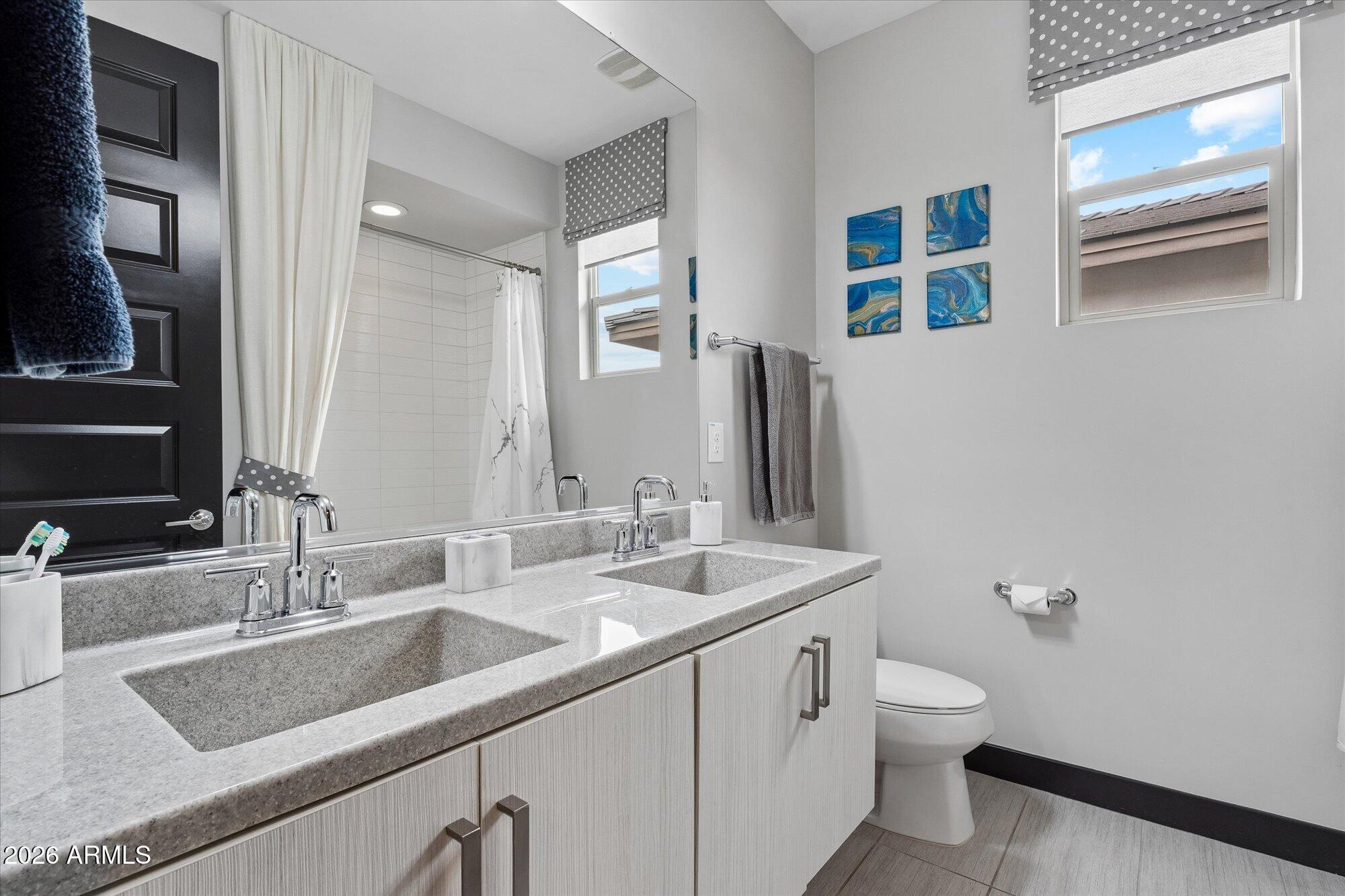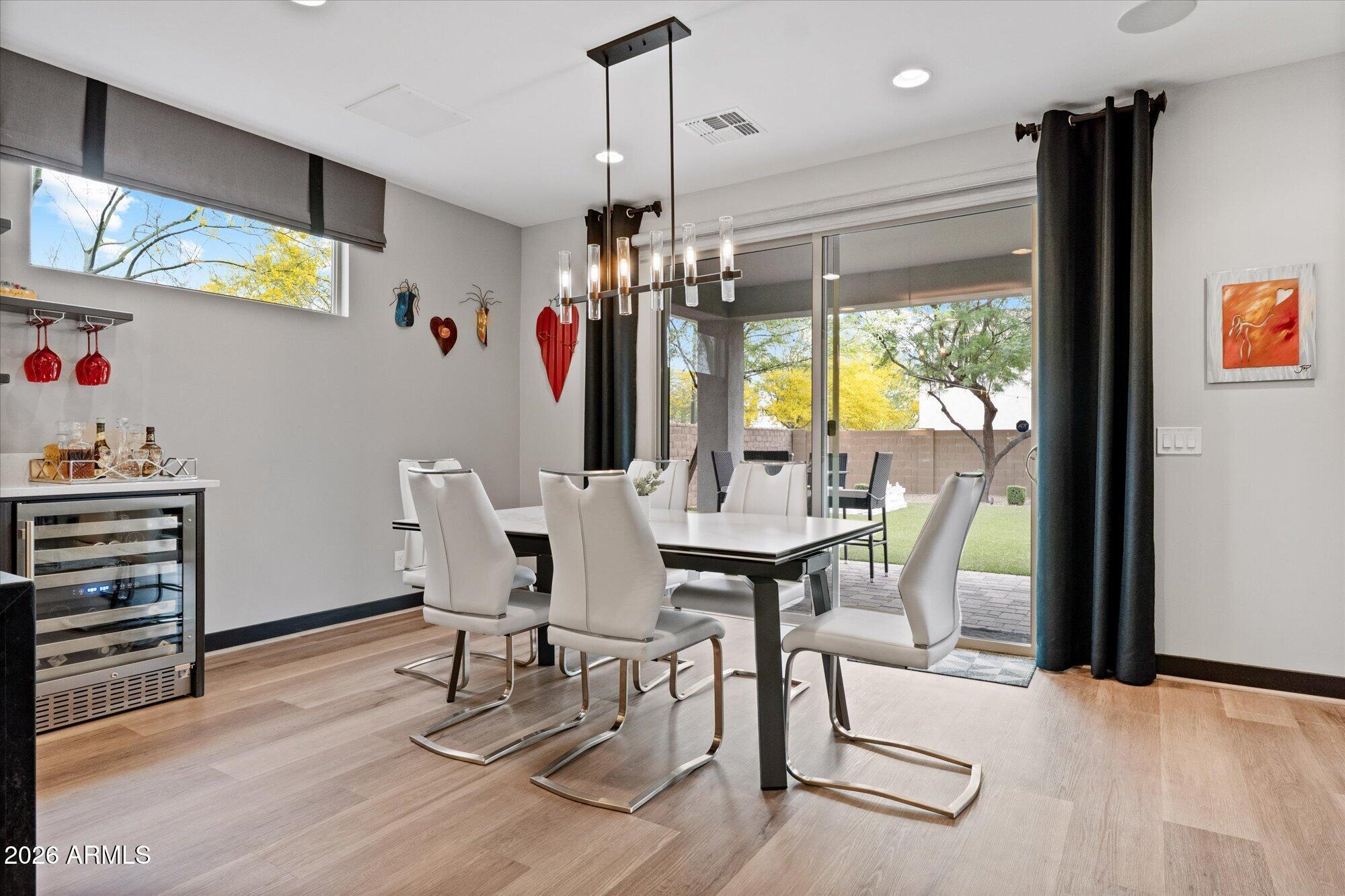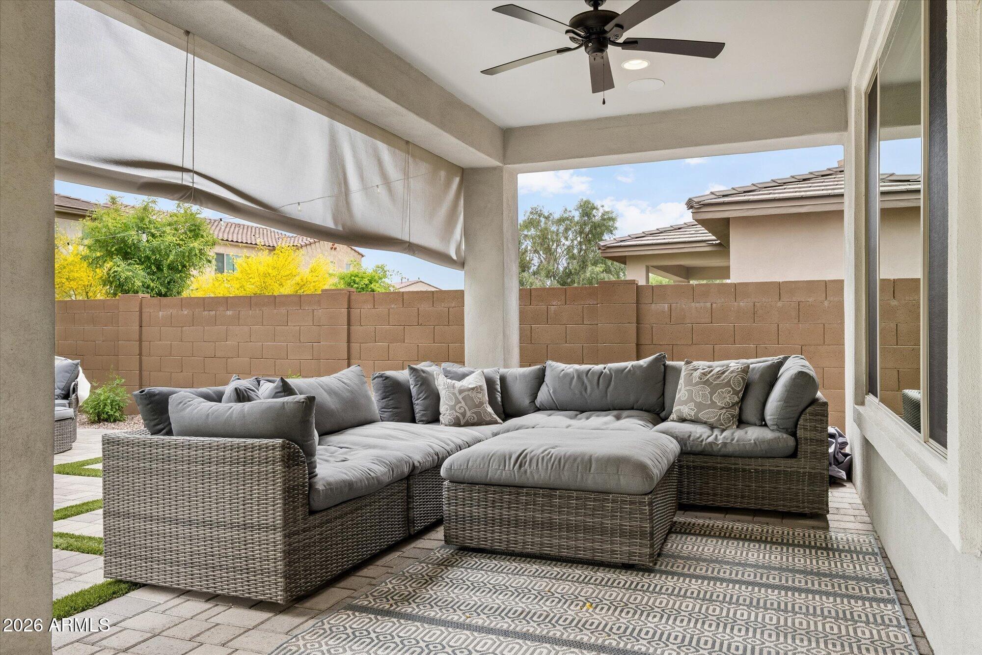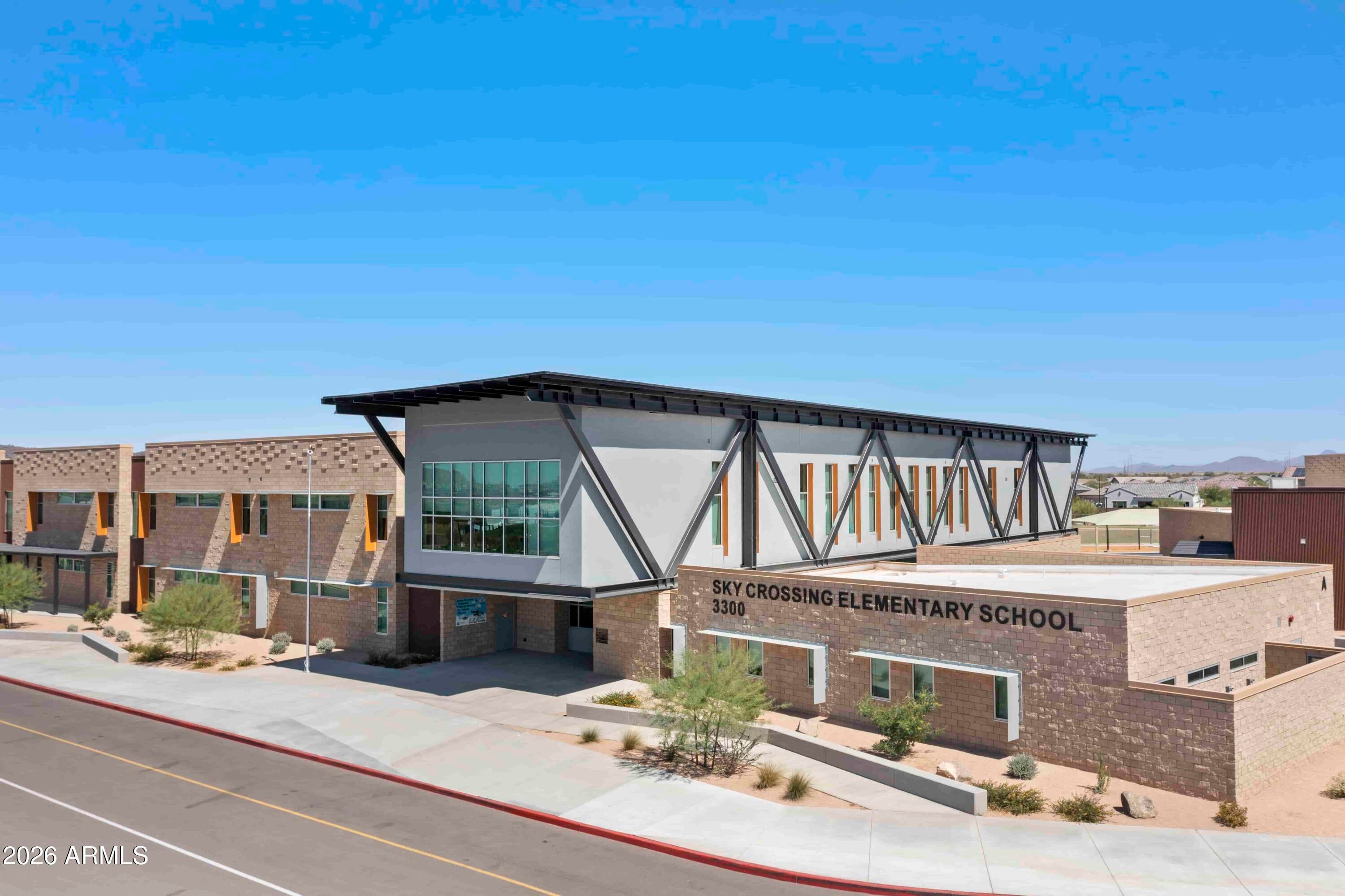 Situated on one of the most desirable streets in Sky Crossing, this former model home offers a rare combination of thoughtful design, premium upgrades, and an unbeatable location just moments from the communitys most sought-after amenities. Set on a premium extended corner lot-larger than most for this floor plan-on a quiet, no-outlet street with two cul-de-sacs, the home is just a short 2-minute walk to the main park, community center, and Sky Crossing Elementary. Enjoy convenient access to the Loop 101 and SR-51, making commuting and getting around the Valley effortless. Inside, the home showcases a beautifully upgraded kitchen featuring black stainless KitchenAid appliance suite with gas cooktop, a striking quartz waterfall island, full slab quartz backsplash, extended cabinetry with integrated beverage cooler, and custom lighting details throughout. The adjacent great room is designed for both comfort and entertaining, complete with a custom fireplace, built-in shelving, surround sound, and automated shades. The main floor bonus room offers versatility for a home office, gym, or additional living space, while the upstairs loft adds even more flexibility. The primary suite is a true retreat with designer finishes, a spa-inspired bathroom featuring floating vanities, an oversized walk-in shower with rain head, and a custom walk-in closet. Step outside to a thoughtfully designed backyard with mature landscaping, an expansive covered patio with built-in speakers, a full outdoor kitchen with BBQ and beverage cooler, bistro lighting, and multiple areas to relax or entertain. Additional highlights include luxury vinyl flooring, upgraded trim and door package, glass panel garage door, tankless water heater, EV charger outlet, and a new A/C system installed in 2025. With its model-quality finishes, oversized lot, prime location, and close proximity to Sky Crossings top amenities, this home offers an exceptional opportunity in one of Desert Ridges most sought-after communities. Additional upgrades/updates can be found in the docs tab!