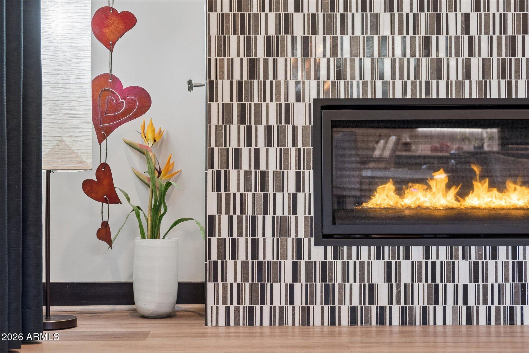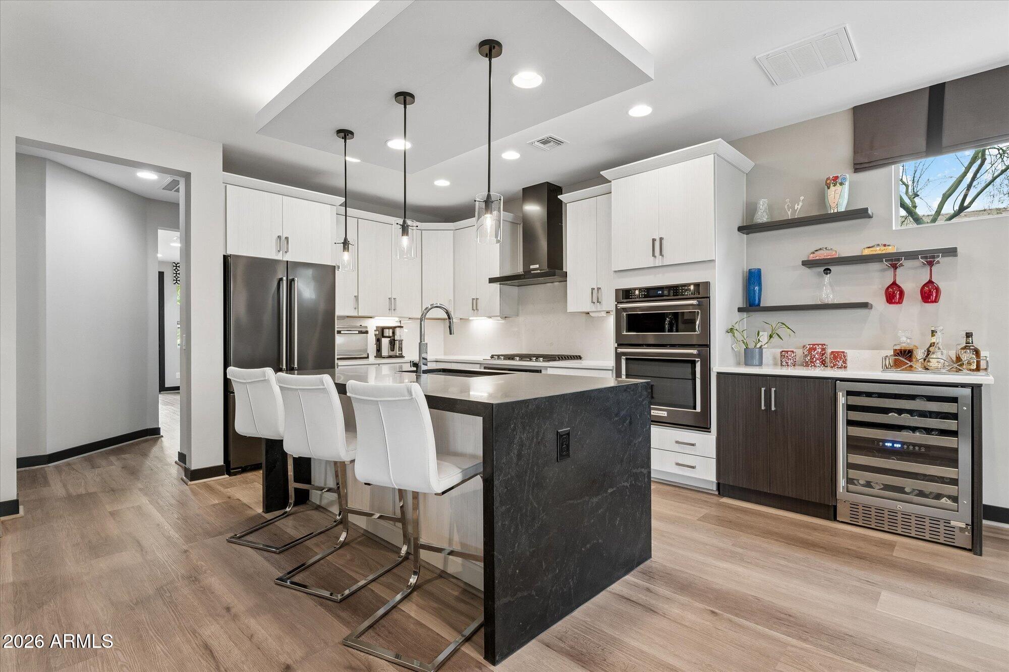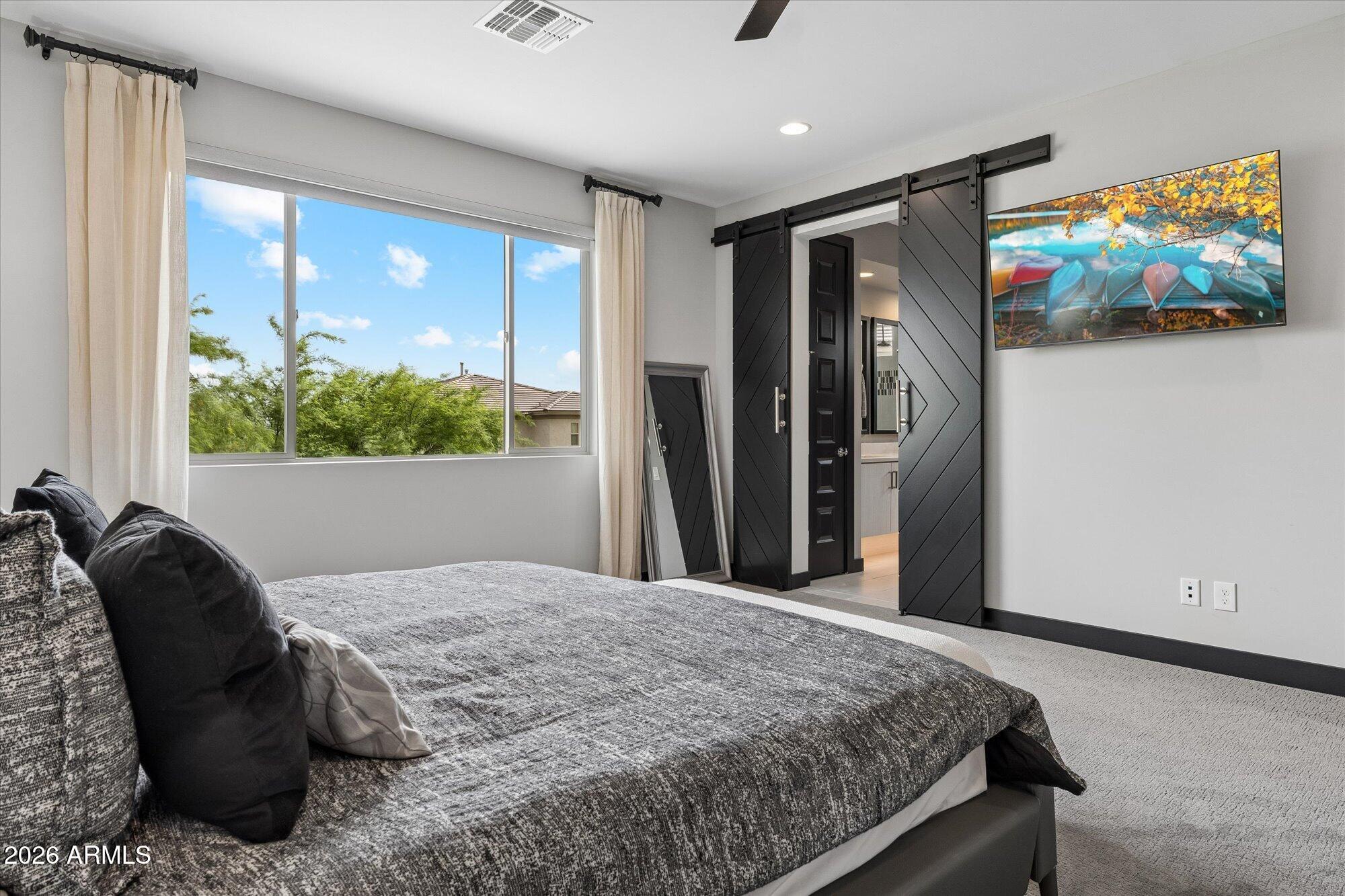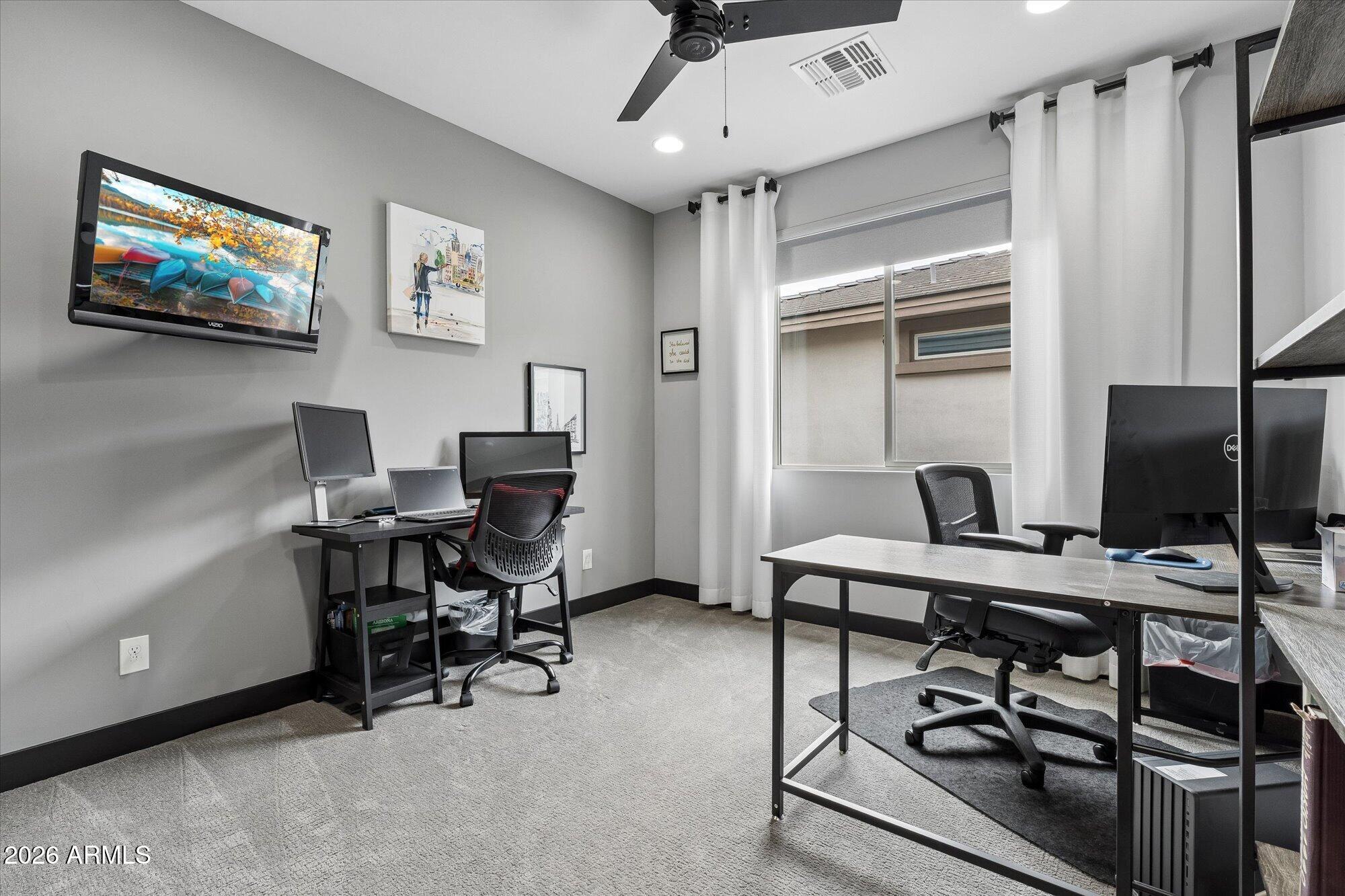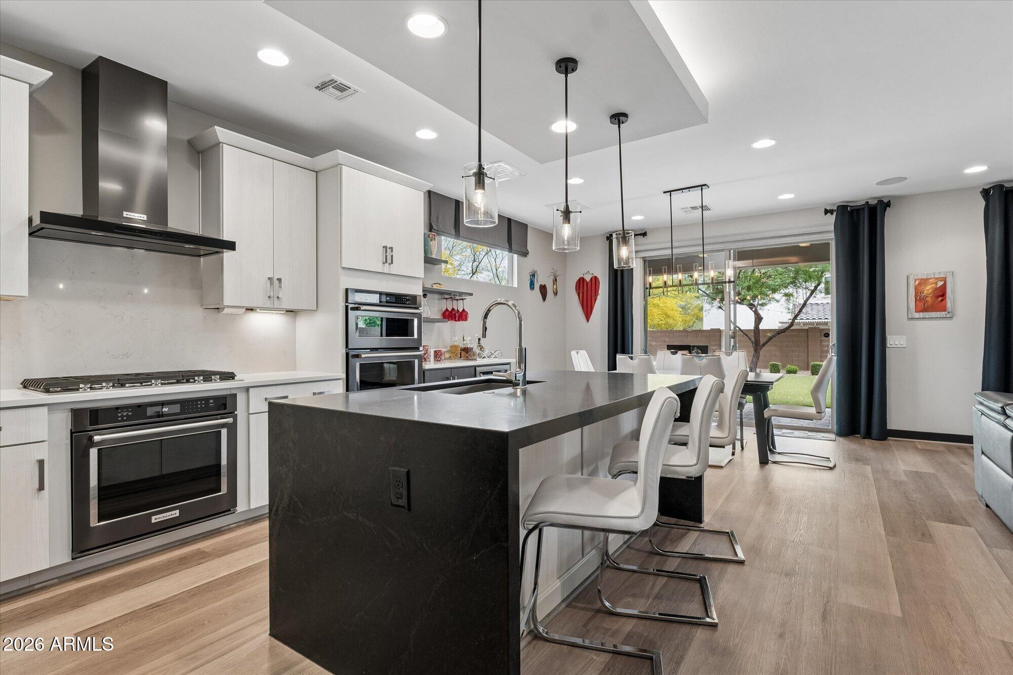 Situated on one of the most desirable streets in Sky Crossing, this former model home offers a rare combination of thoughtful design, premium upgrades, and an unbeatable location just moments from the communitys most sought-after amenities. Set on a premium extended corner lot-larger than most for this floor plan-on a quiet, no-outlet street with two cul-de-sacs, the home is just a short 2-minute walk to the main park, community center, and Sky Crossing Elementary. Enjoy convenient access to the Loop 101 and SR-51, making commuting and getting around the Valley effortless. Inside, the home showcases a beautifully upgraded kitchen featuring black stainless KitchenAid appliance suite with gas cooktop, a striking quartz waterfall island, full slab quartz backsplash, extended cabinetry with integrated beverage cooler, and custom lighting details throughout. The adjacent great room is designed for both comfort and entertaining, complete with a custom fireplace, built-in shelving, surround sound, and automated shades. The main floor bonus room offers versatility for a home office, gym, or additional living space, while the upstairs loft adds even more flexibility. The primary suite is a true retreat with designer finishes, a spa-inspired bathroom featuring floating vanities, an oversized walk-in shower with rain head, and a custom walk-in closet. Step outside to a thoughtfully designed backyard with mature landscaping, an expansive covered patio with built-in speakers, a full outdoor kitchen with BBQ and beverage cooler, bistro lighting, and multiple areas to relax or entertain. Additional highlights include luxury vinyl flooring, upgraded trim and door package, glass panel garage door, tankless water heater, EV charger outlet, and a new A/C system installed in 2025. With its model-quality finishes, oversized lot, prime location, and close proximity to Sky Crossings top amenities, this home offers an exceptional opportunity in one of Desert Ridges most sought-after communities. Additional upgrades/updates can be found in the docs tab!