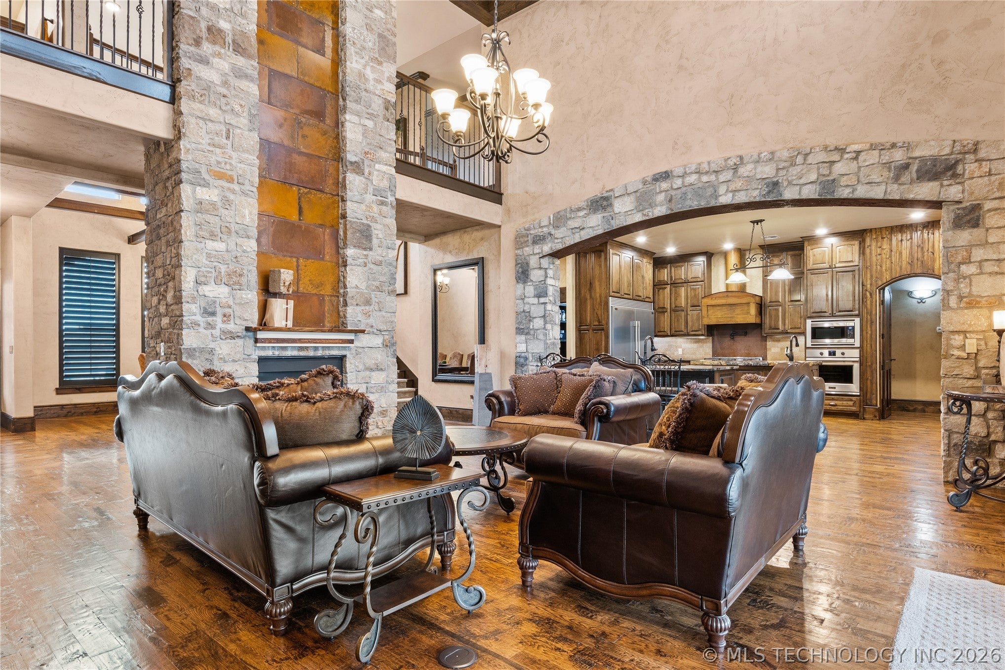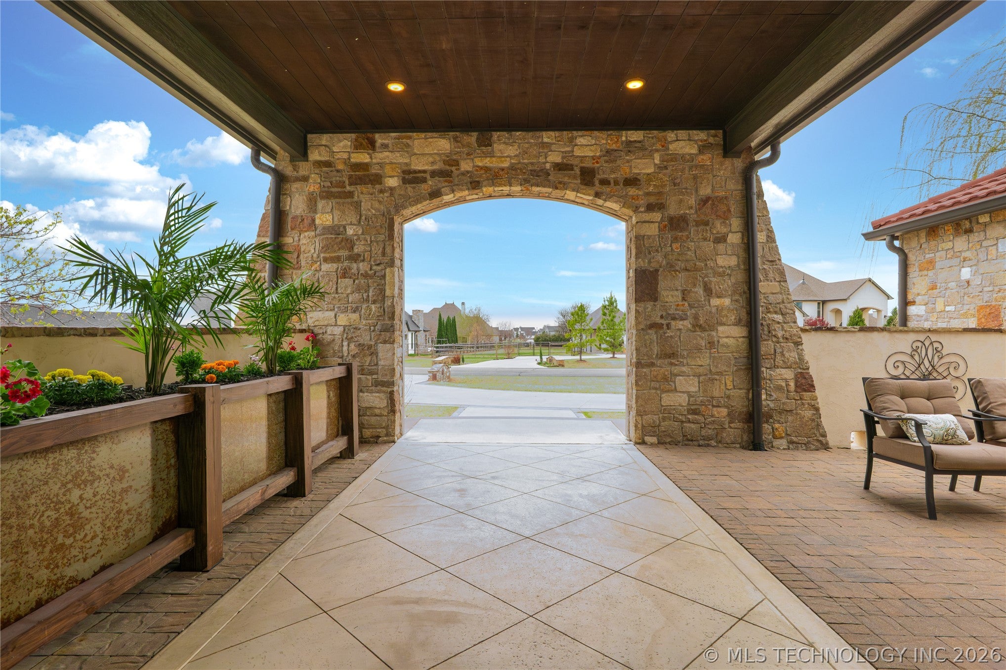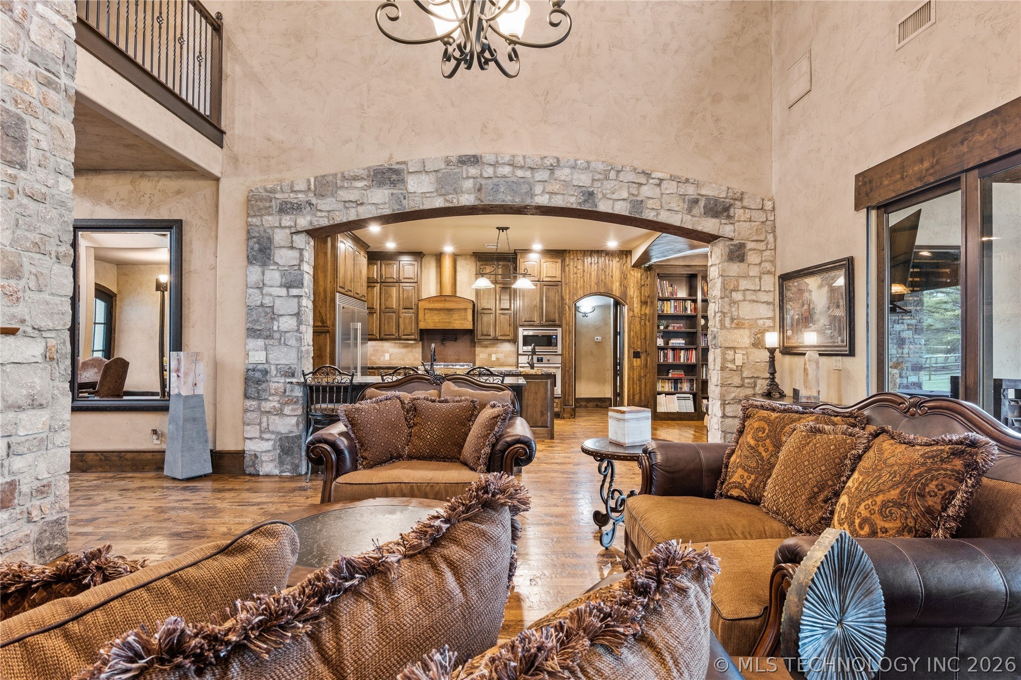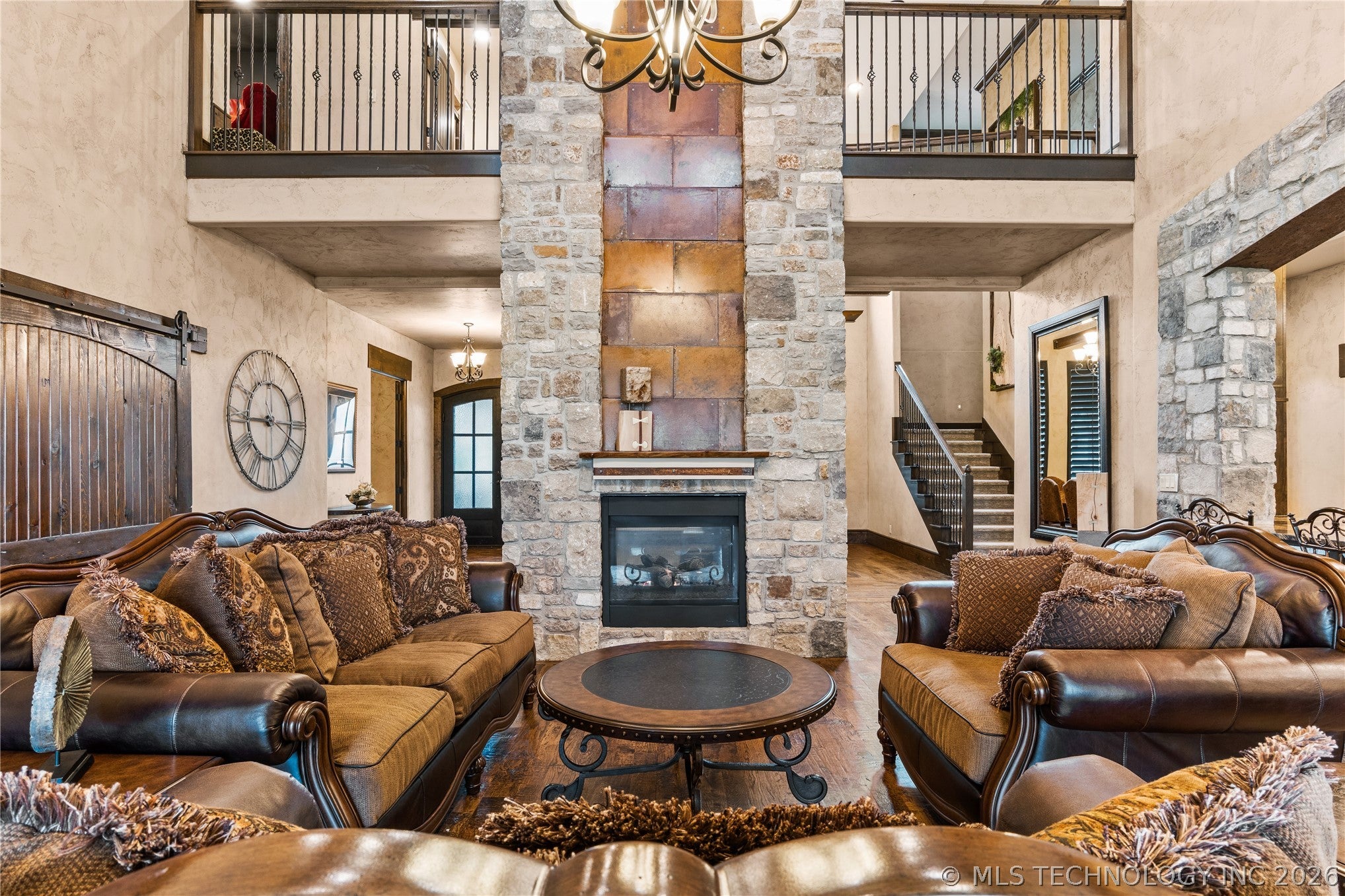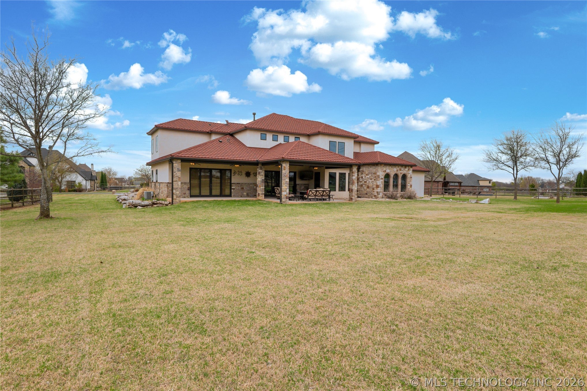 Experience the pinnacle of Mediterranean luxury in the exclusive, gated Highland Pointe of Stone Canyon. This Mission-style masterpiece commands a sprawling lot and features a signature tile roof, authentic stone masonry, and grand architectural arches. The interior reveals a sophisticated open-concept floor plan defined by 22-foot vaulted ceilings, rich hardwoods, and a gourmet chefs kitchen equipped with expansive granite countertops and professional-grade appliances. The primary suite offers a resort-style sanctuary with a spa-inspired bath including a hot rock steam sauna and double shower with body sprays and rain heads. There is a secondary downstairs suite complete w its own living room and bathroom, perfect for generational living options. An executive office, movie theater with snack bar, fitness room and another living area anchoring the bedrooms upstairs allows for function and fun! Residents enjoy elite community amenities including a gated entrance, the Patriot Golf Club (membership required), a 100-acre private lake, and scenic hiking trails, all within the top-rated Owasso school district.