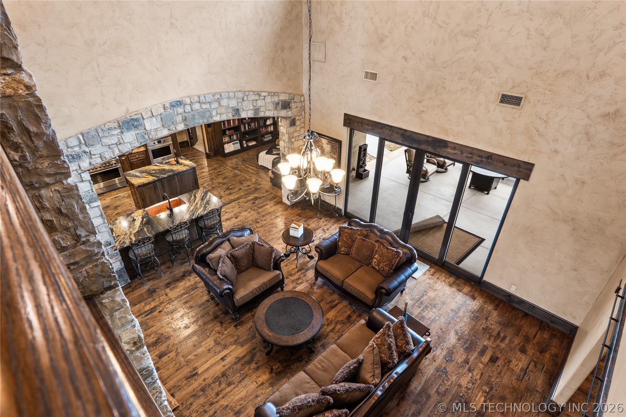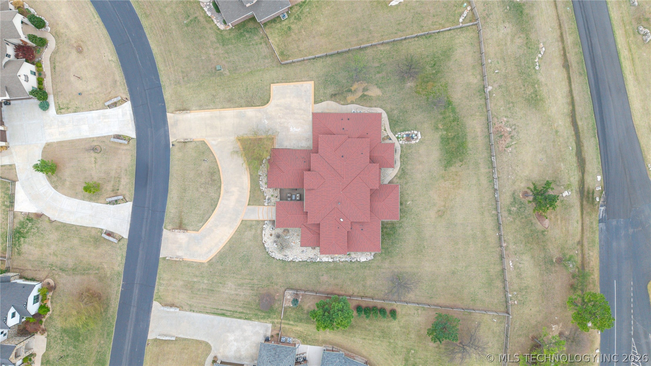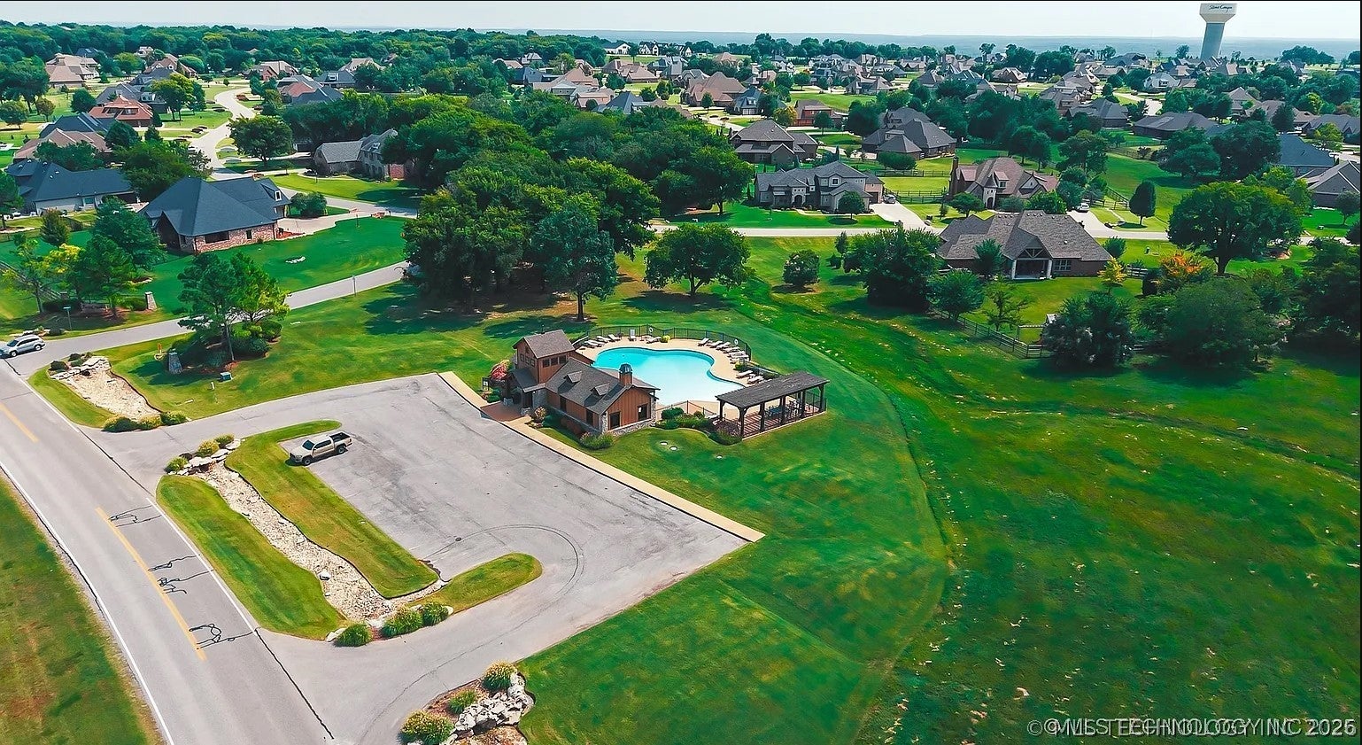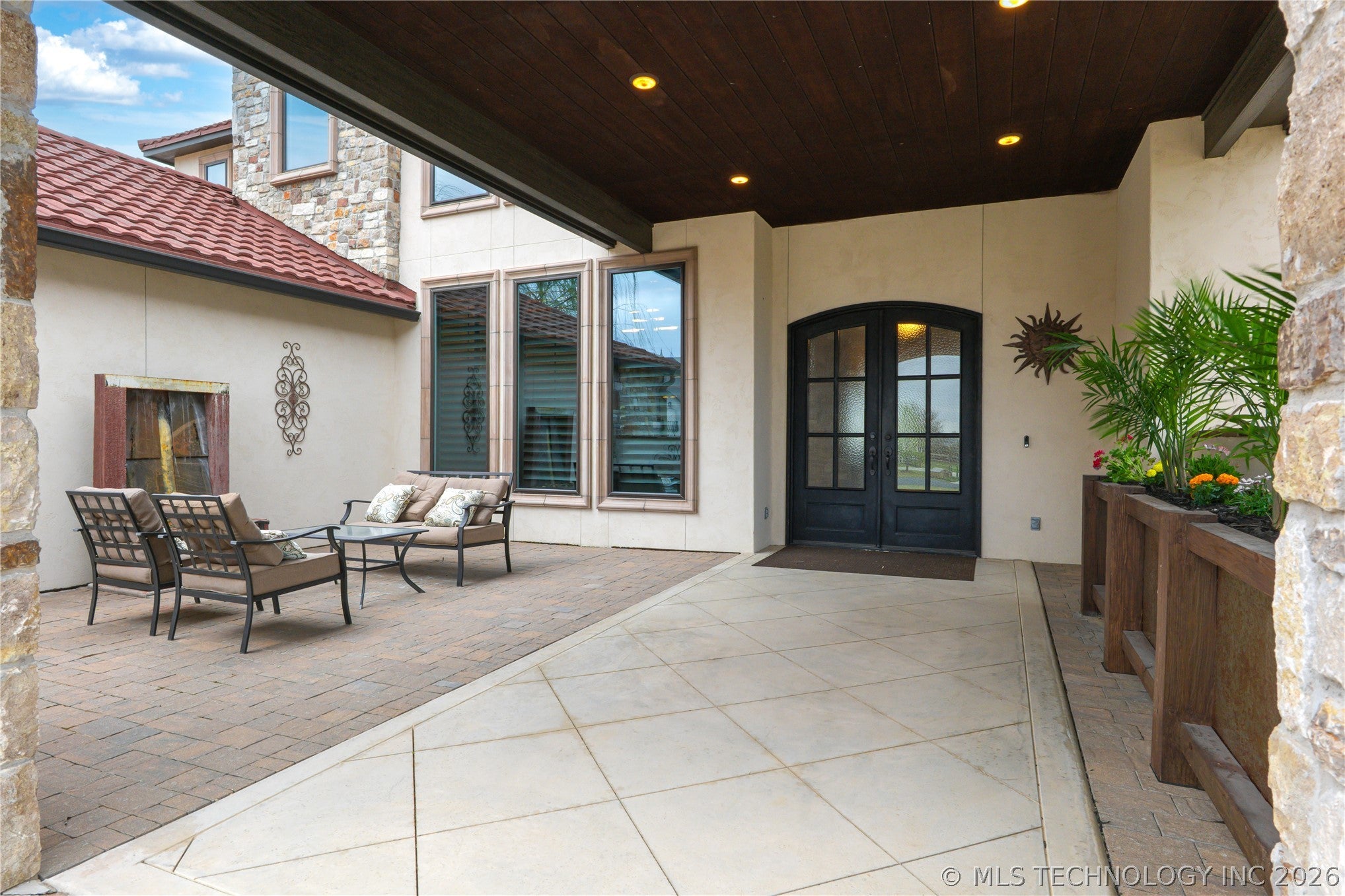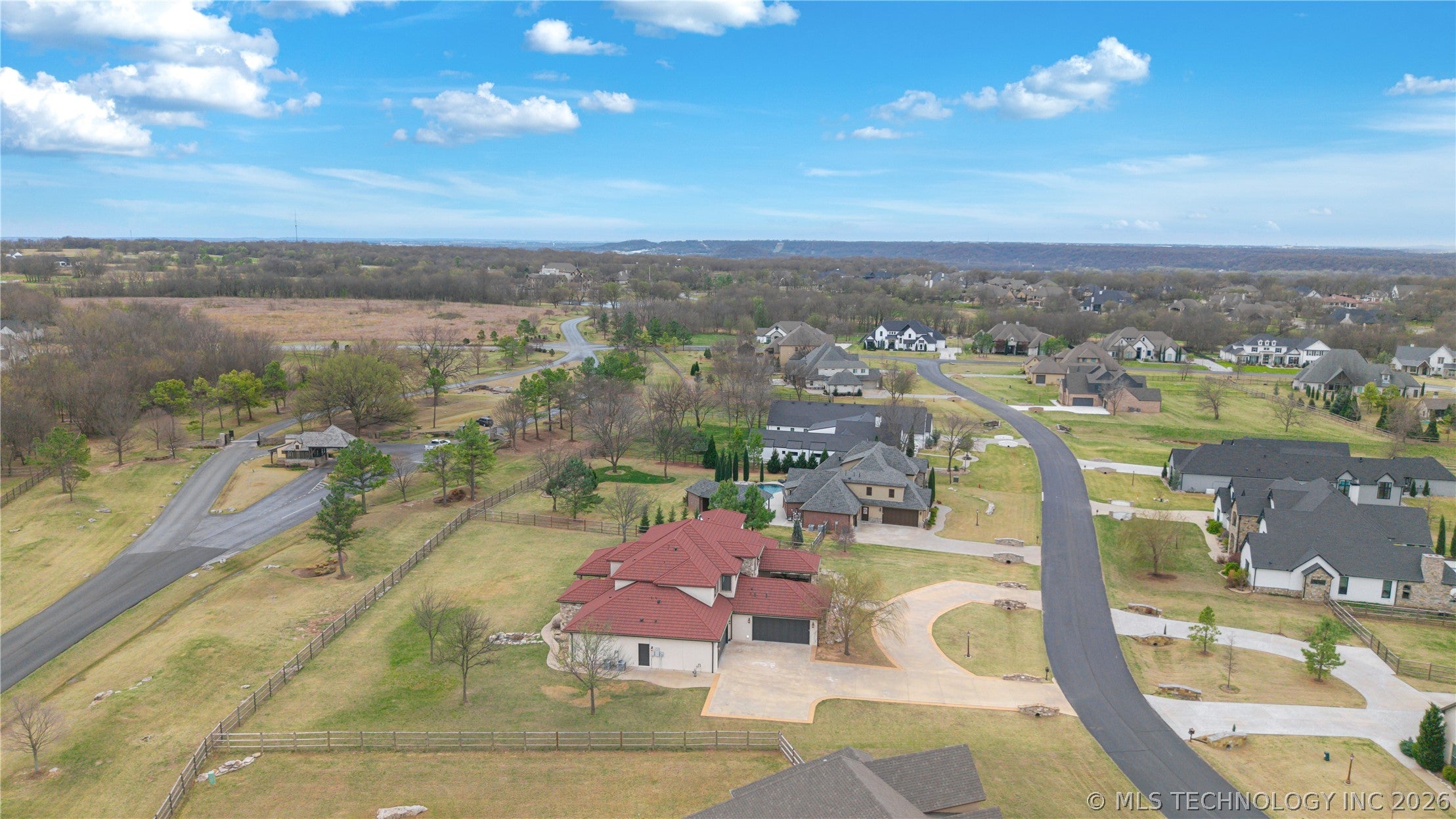 Experience the pinnacle of Mediterranean luxury in the exclusive, gated Highland Pointe of Stone Canyon. This Mission-style masterpiece commands a sprawling lot and features a signature tile roof, authentic stone masonry, and grand architectural arches. The interior reveals a sophisticated open-concept floor plan defined by 22-foot vaulted ceilings, rich hardwoods, and a gourmet chefs kitchen equipped with expansive granite countertops and professional-grade appliances. The primary suite offers a resort-style sanctuary with a spa-inspired bath including a hot rock steam sauna and double shower with body sprays and rain heads. There is a secondary downstairs suite complete w its own living room and bathroom, perfect for generational living options. An executive office, movie theater with snack bar, fitness room and another living area anchoring the bedrooms upstairs allows for function and fun! Residents enjoy elite community amenities including a gated entrance, the Patriot Golf Club (membership required), a 100-acre private lake, and scenic hiking trails, all within the top-rated Owasso school district.