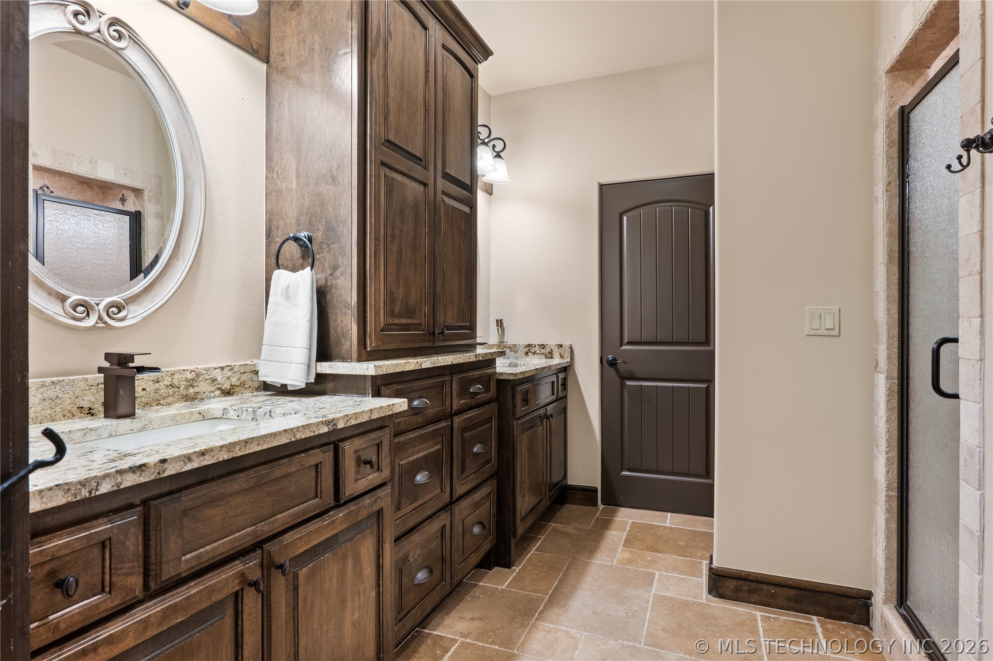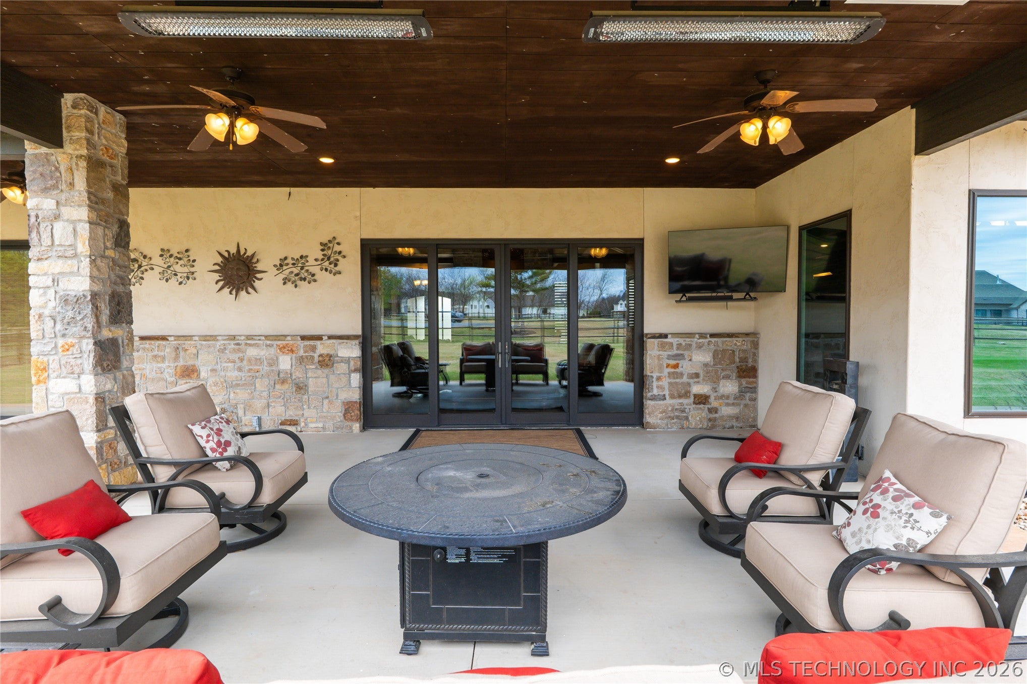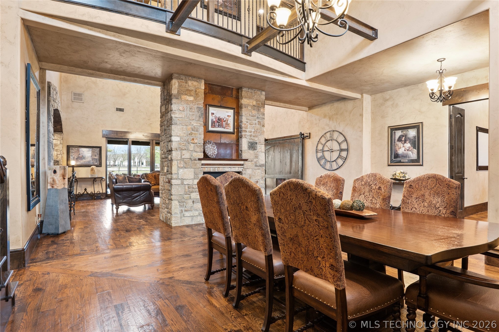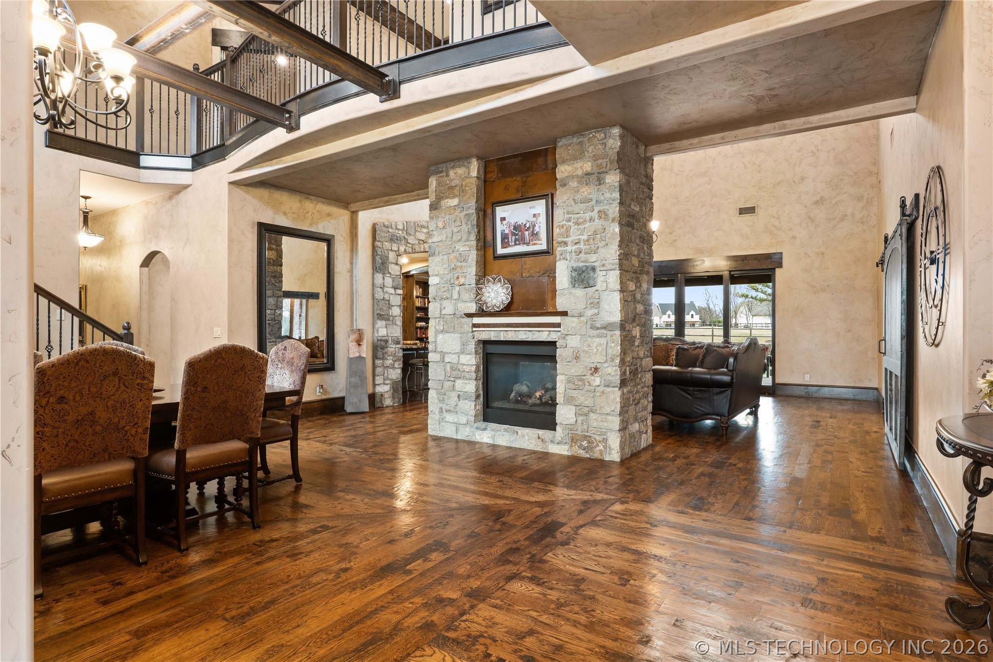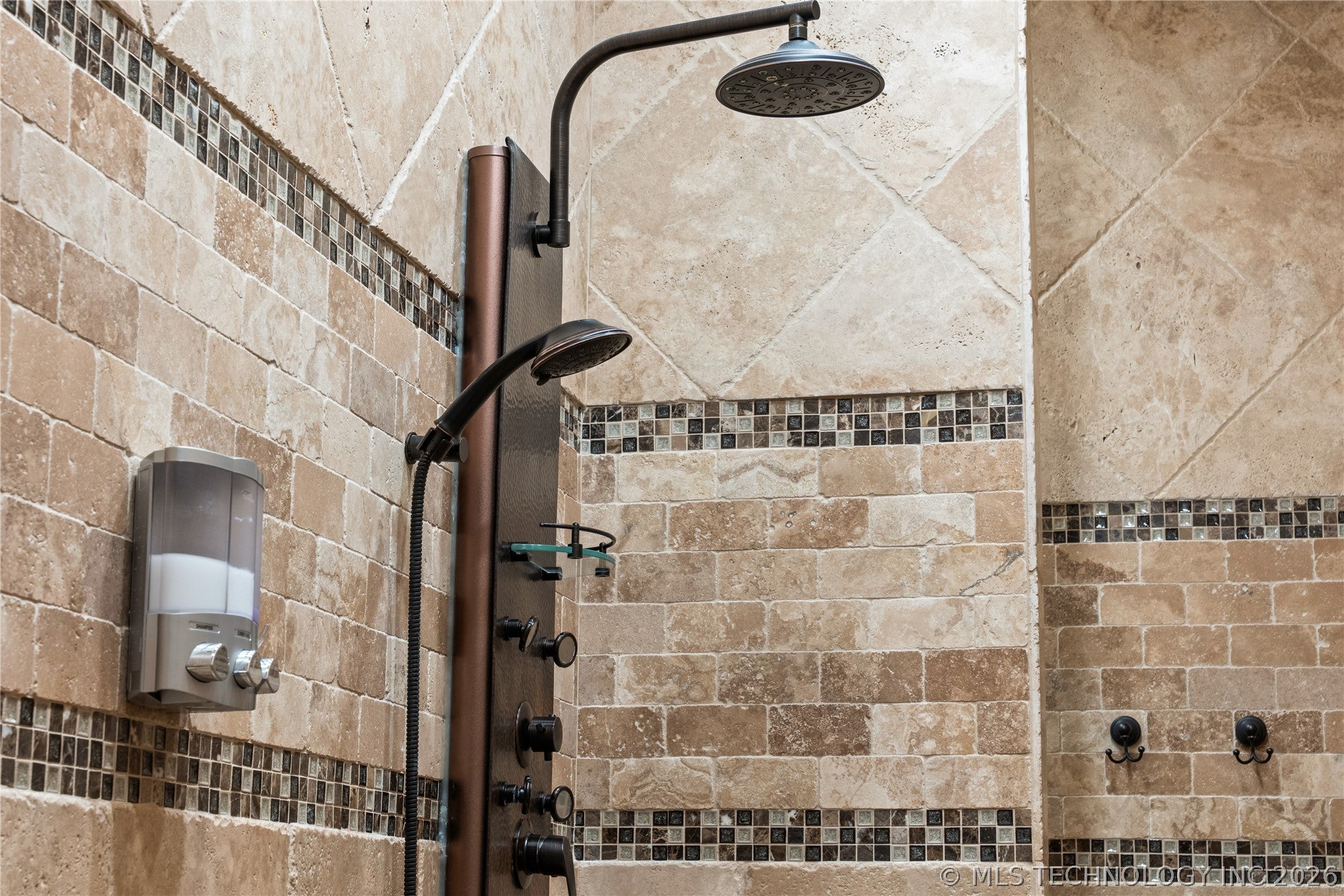 Experience the pinnacle of Mediterranean luxury in the exclusive, gated Highland Pointe of Stone Canyon. This Mission-style masterpiece commands a sprawling lot and features a signature tile roof, authentic stone masonry, and grand architectural arches. The interior reveals a sophisticated open-concept floor plan defined by 22-foot vaulted ceilings, rich hardwoods, and a gourmet chefs kitchen equipped with expansive granite countertops and professional-grade appliances. The primary suite offers a resort-style sanctuary with a spa-inspired bath including a hot rock steam sauna and double shower with body sprays and rain heads. There is a secondary downstairs suite complete w its own living room and bathroom, perfect for generational living options. An executive office, movie theater with snack bar, fitness room and another living area anchoring the bedrooms upstairs allows for function and fun! Residents enjoy elite community amenities including a gated entrance, the Patriot Golf Club (membership required), a 100-acre private lake, and scenic hiking trails, all within the top-rated Owasso school district.