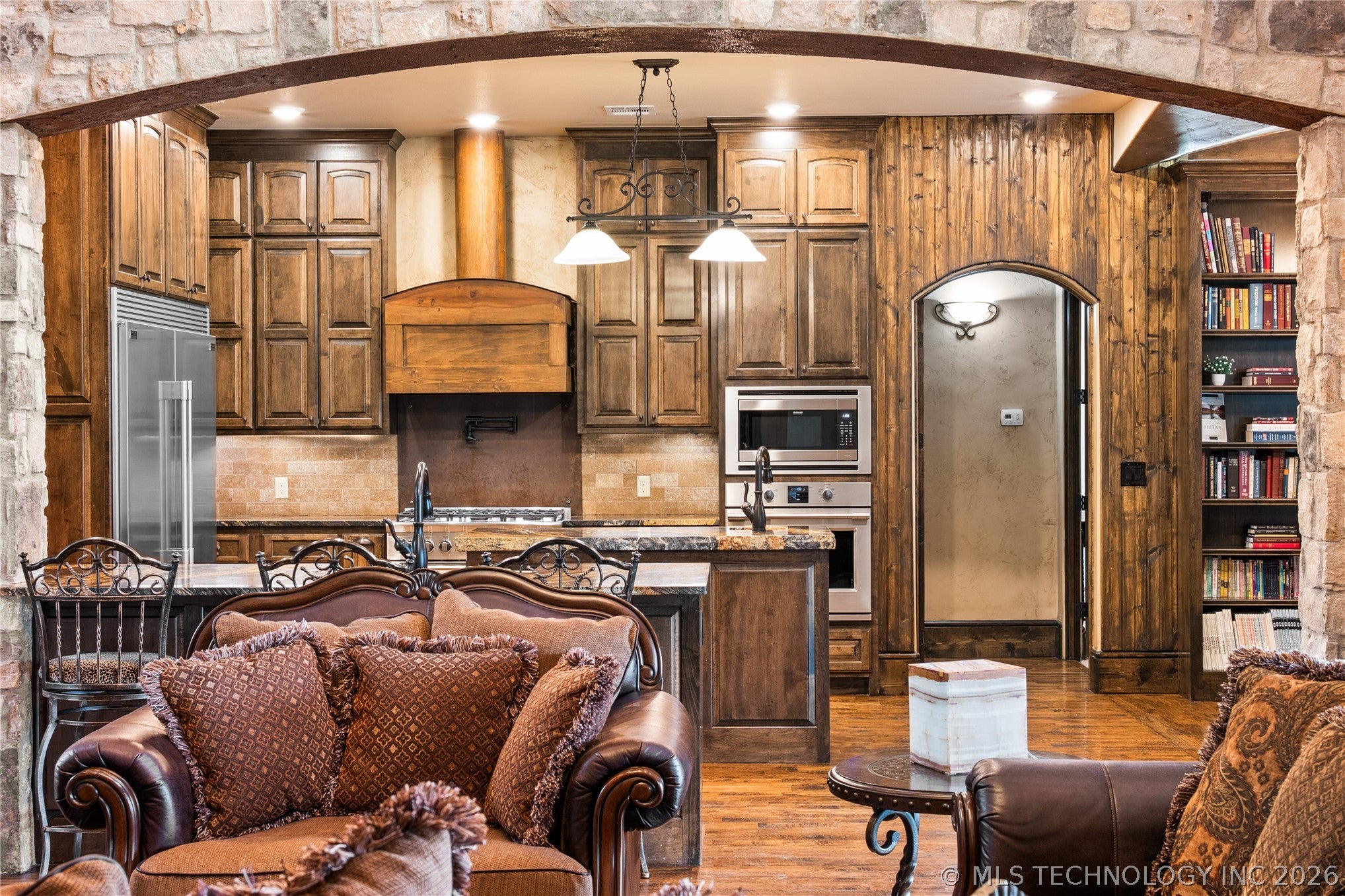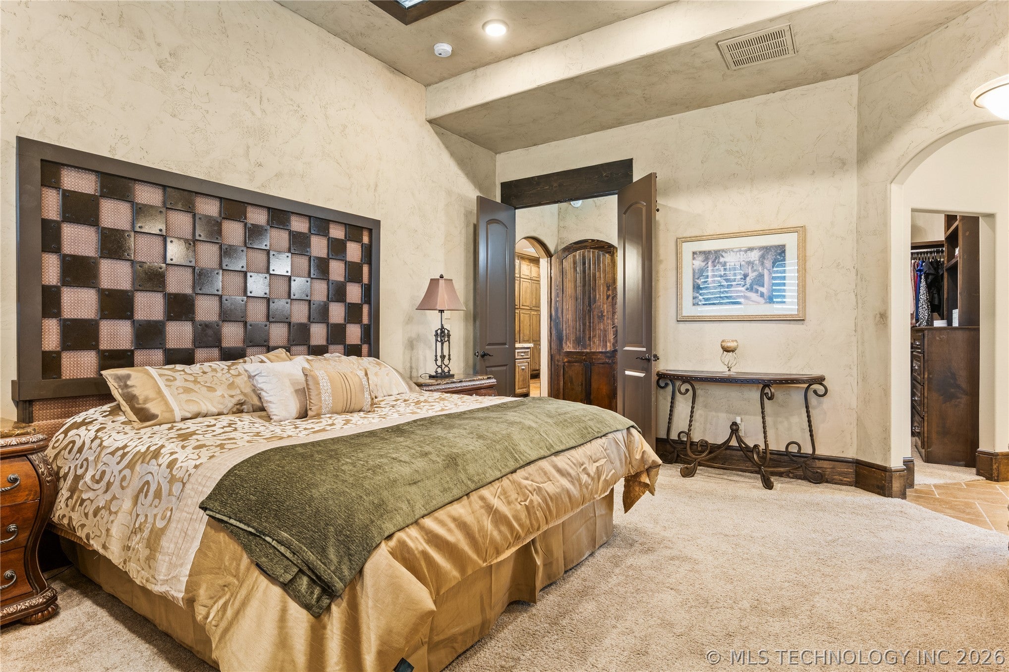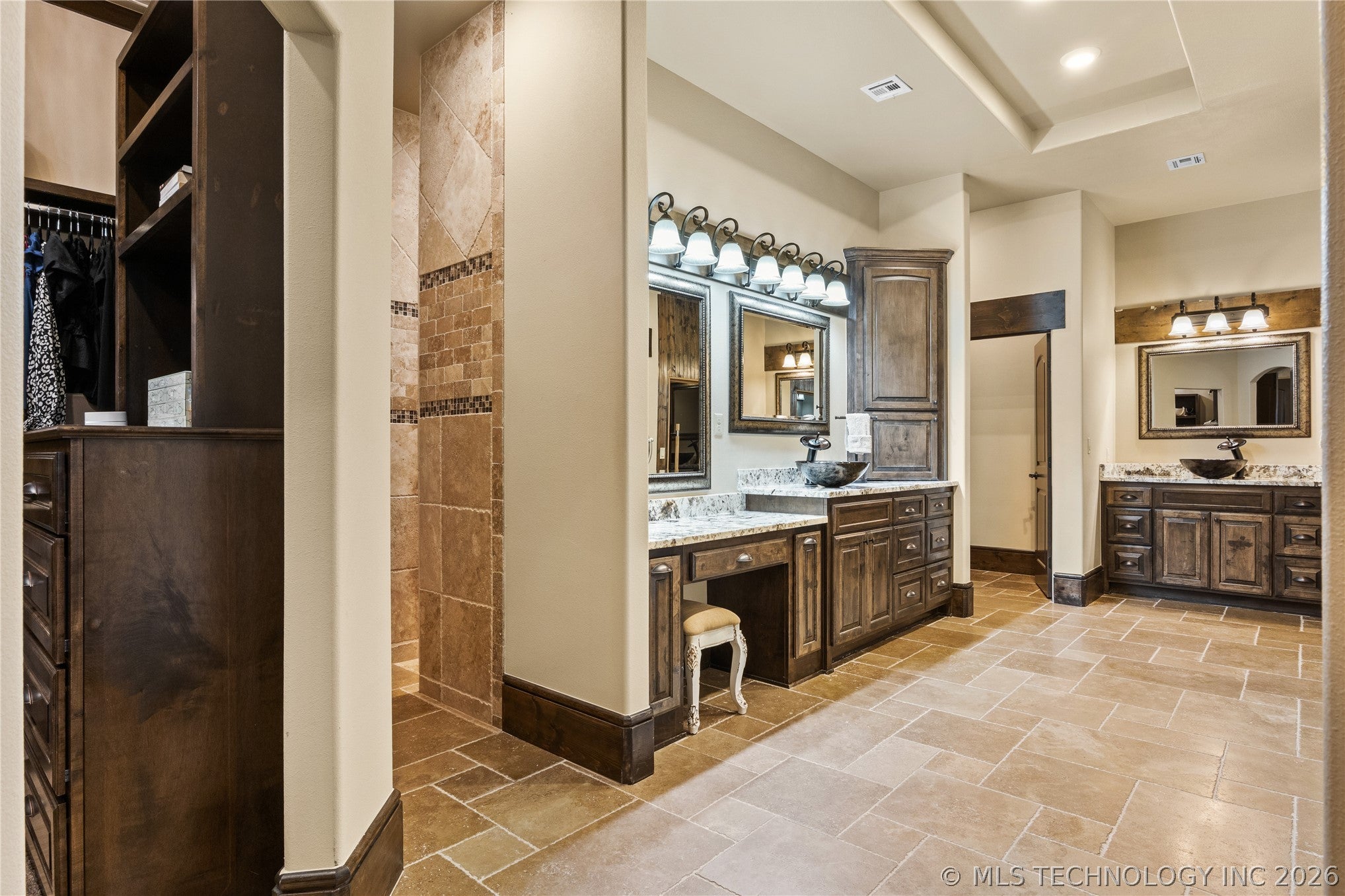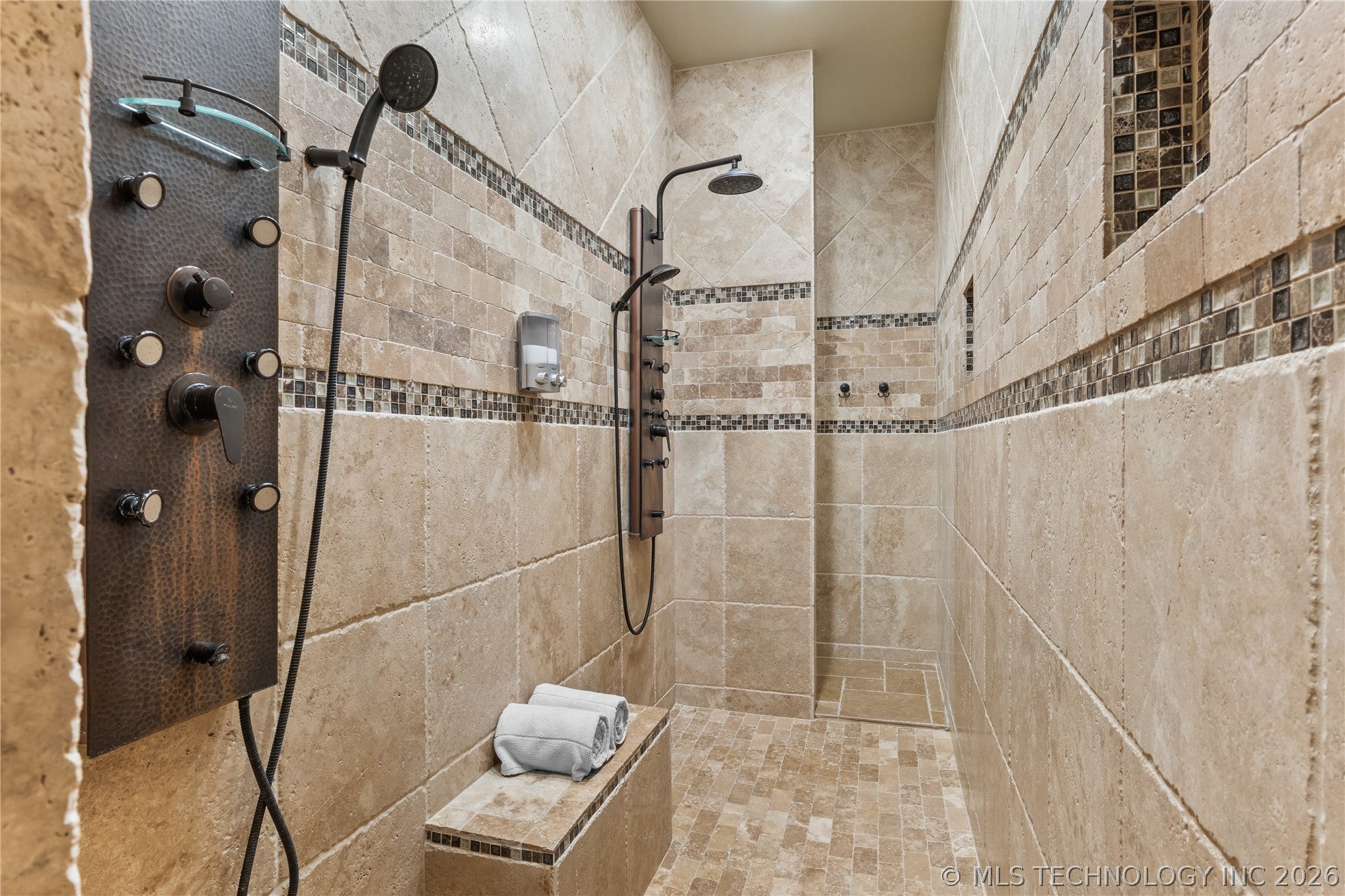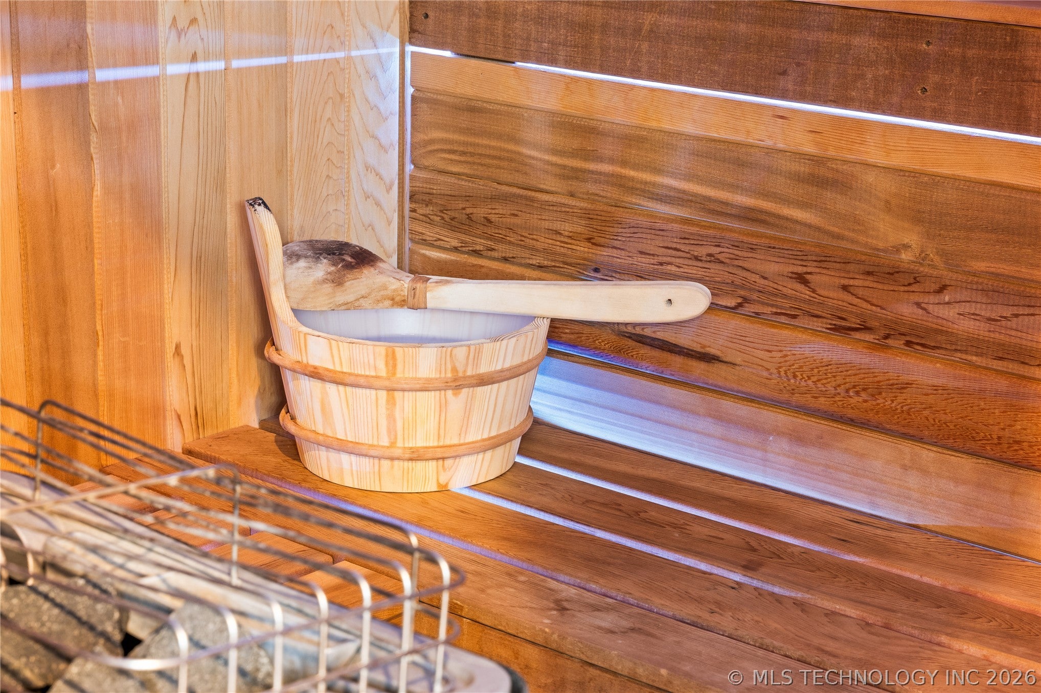 Experience the pinnacle of Mediterranean luxury in the exclusive, gated Highland Pointe of Stone Canyon. This Mission-style masterpiece commands a sprawling lot and features a signature tile roof, authentic stone masonry, and grand architectural arches. The interior reveals a sophisticated open-concept floor plan defined by 22-foot vaulted ceilings, rich hardwoods, and a gourmet chefs kitchen equipped with expansive granite countertops and professional-grade appliances. The primary suite offers a resort-style sanctuary with a spa-inspired bath including a hot rock steam sauna and double shower with body sprays and rain heads. There is a secondary downstairs suite complete w its own living room and bathroom, perfect for generational living options. An executive office, movie theater with snack bar, fitness room and another living area anchoring the bedrooms upstairs allows for function and fun! Residents enjoy elite community amenities including a gated entrance, the Patriot Golf Club (membership required), a 100-acre private lake, and scenic hiking trails, all within the top-rated Owasso school district.