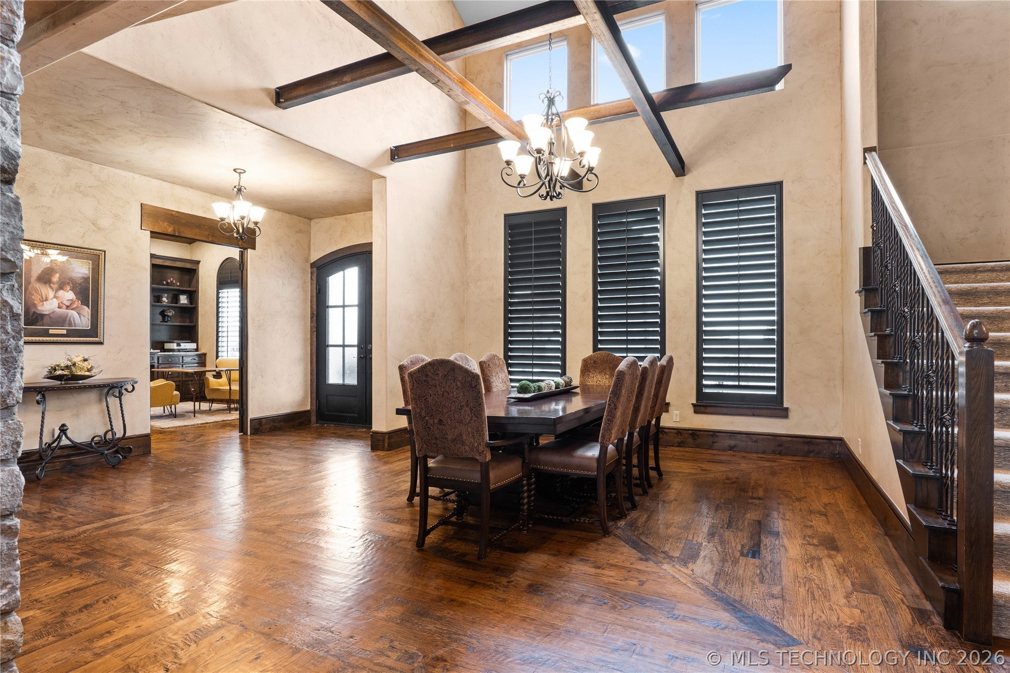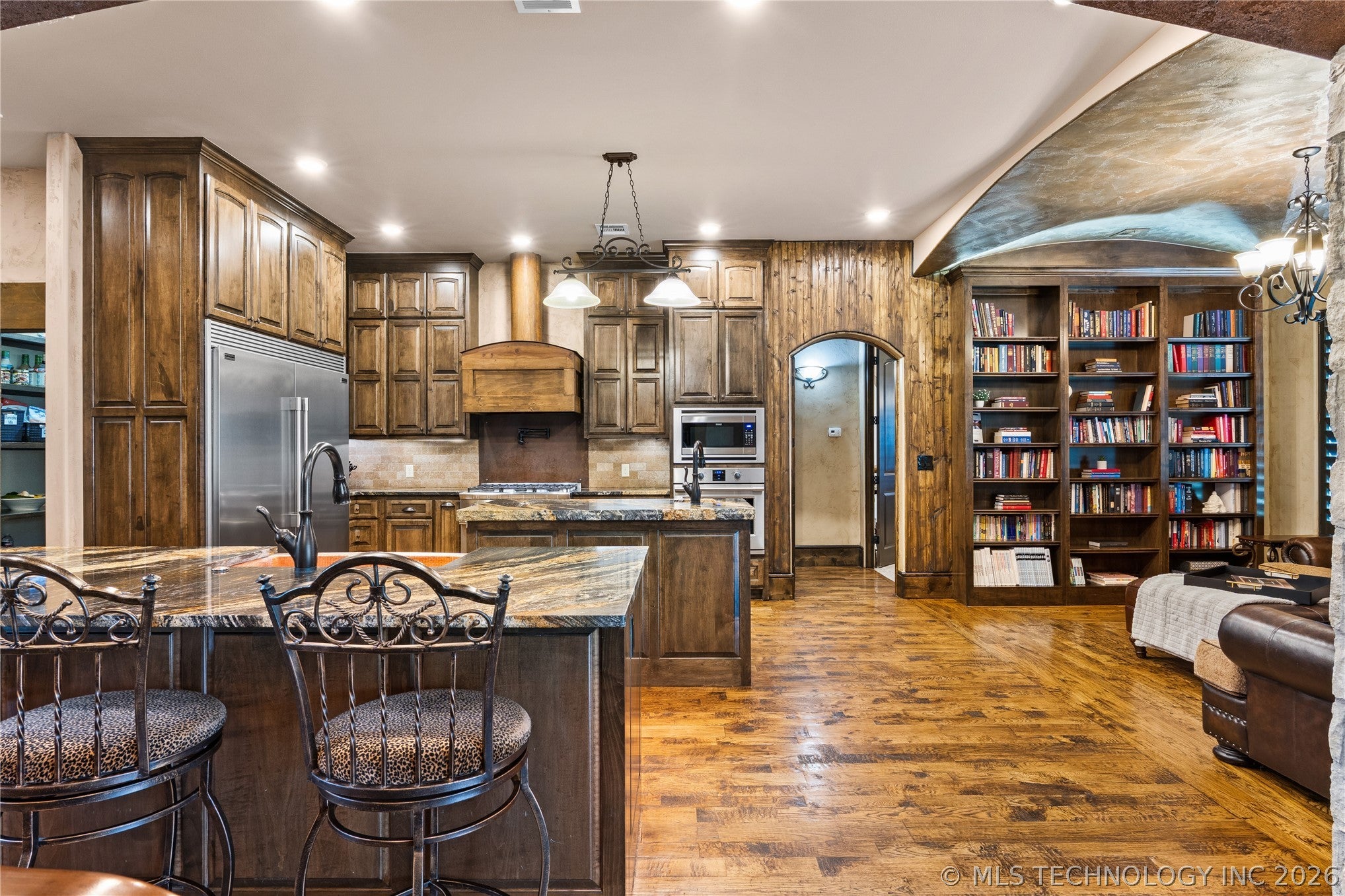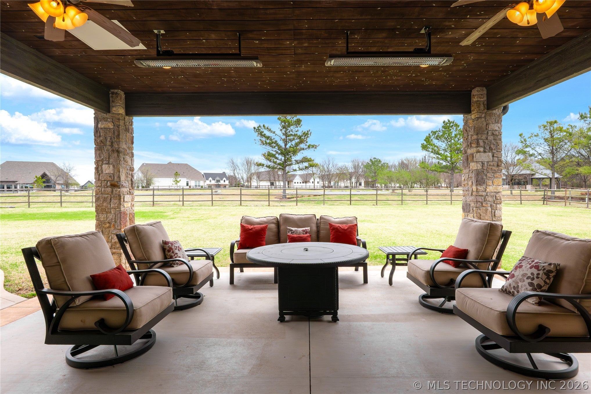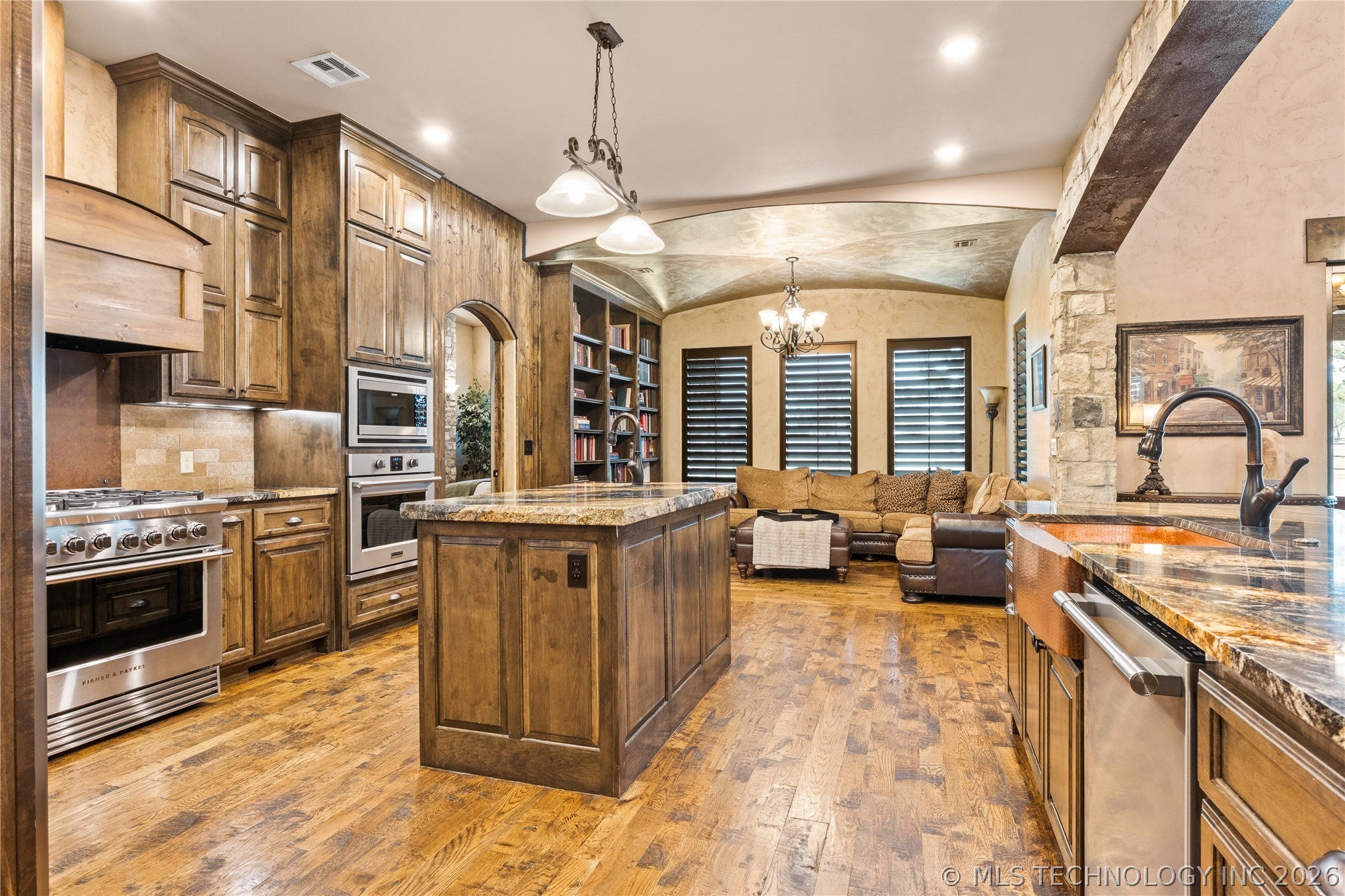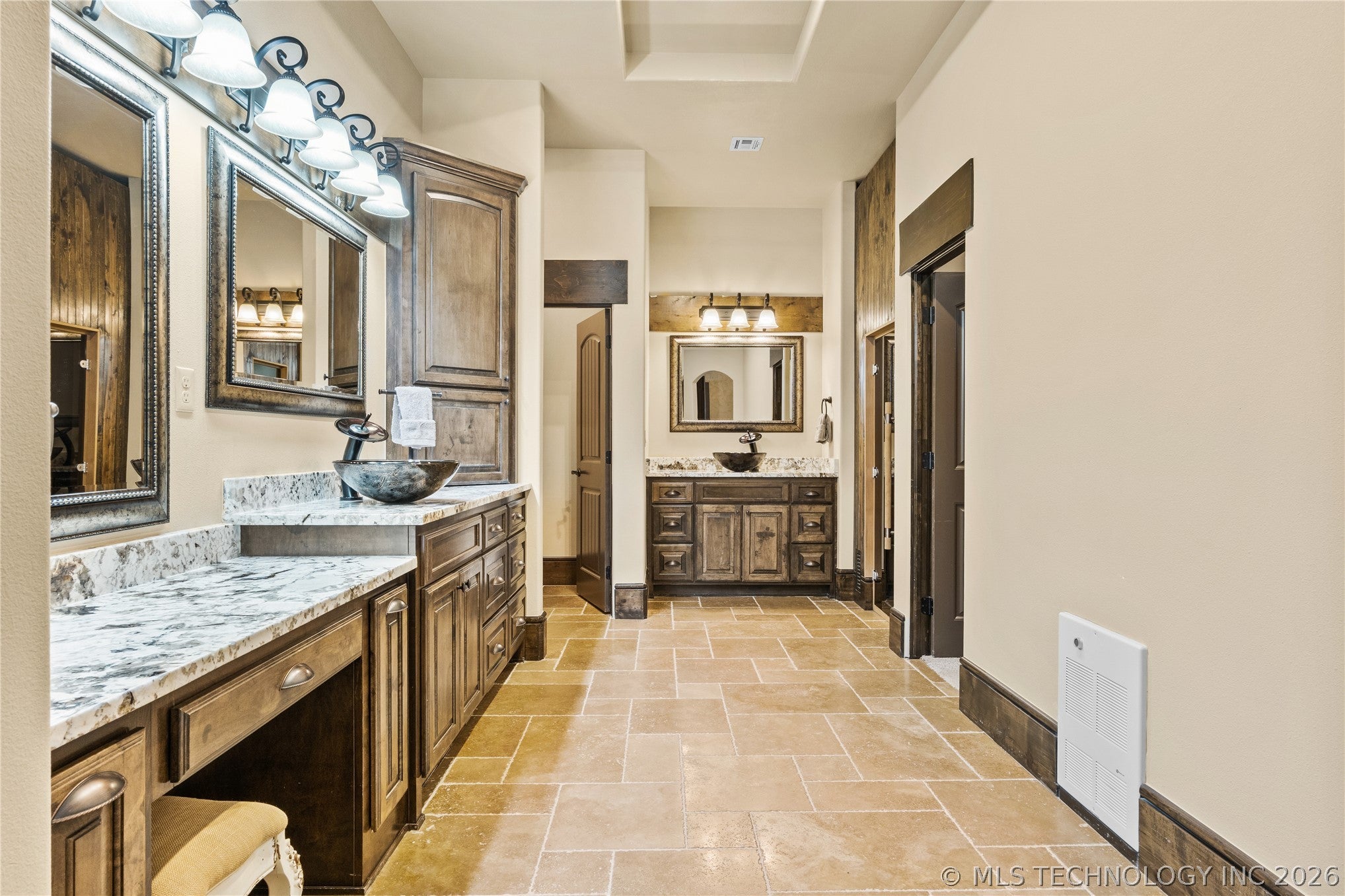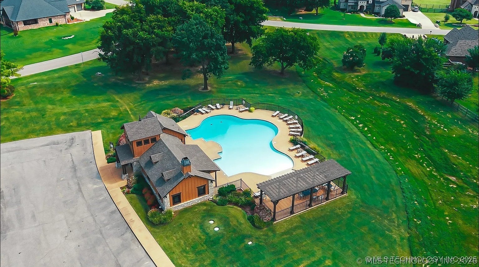 Experience the pinnacle of Mediterranean luxury in the exclusive, gated Highland Pointe of Stone Canyon. This Mission-style masterpiece commands a sprawling lot and features a signature tile roof, authentic stone masonry, and grand architectural arches. The interior reveals a sophisticated open-concept floor plan defined by 22-foot vaulted ceilings, rich hardwoods, and a gourmet chefs kitchen equipped with expansive granite countertops and professional-grade appliances. The primary suite offers a resort-style sanctuary with a spa-inspired bath including a hot rock steam sauna and double shower with body sprays and rain heads. There is a secondary downstairs suite complete w its own living room and bathroom, perfect for generational living options. An executive office, movie theater with snack bar, fitness room and another living area anchoring the bedrooms upstairs allows for function and fun! Residents enjoy elite community amenities including a gated entrance, the Patriot Golf Club (membership required), a 100-acre private lake, and scenic hiking trails, all within the top-rated Owasso school district.