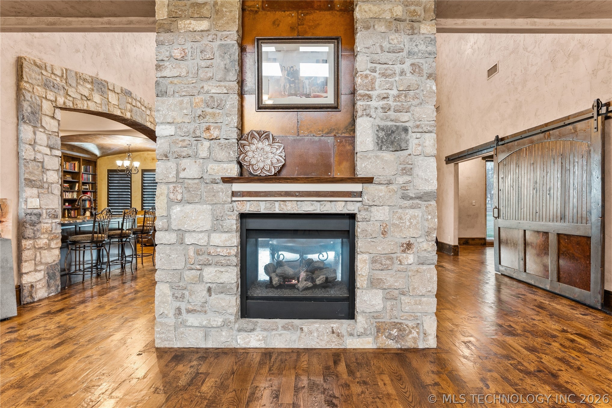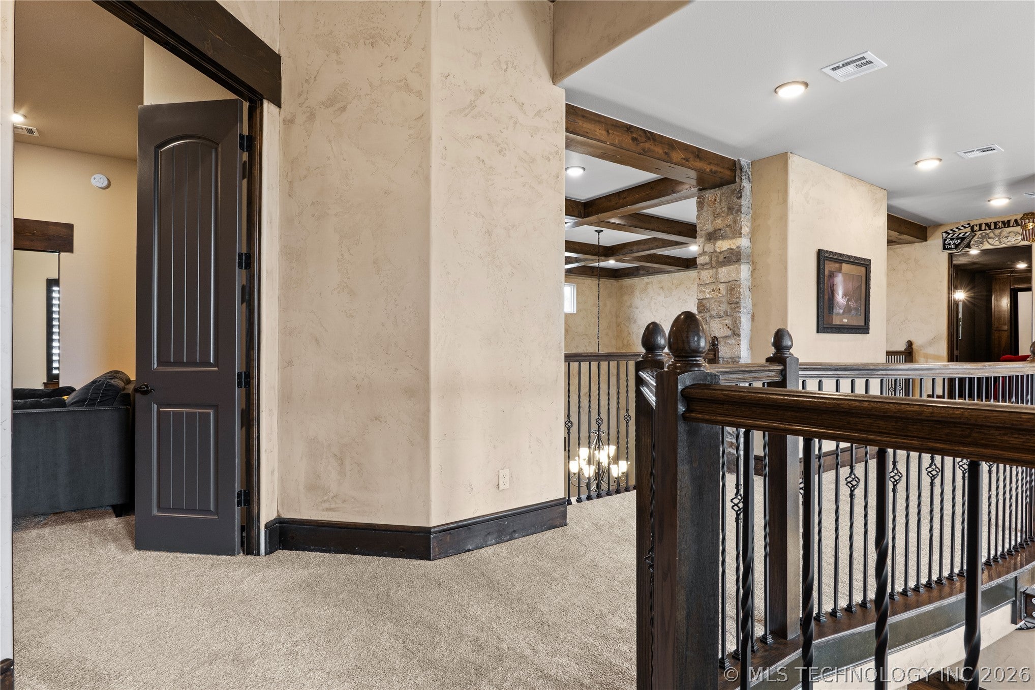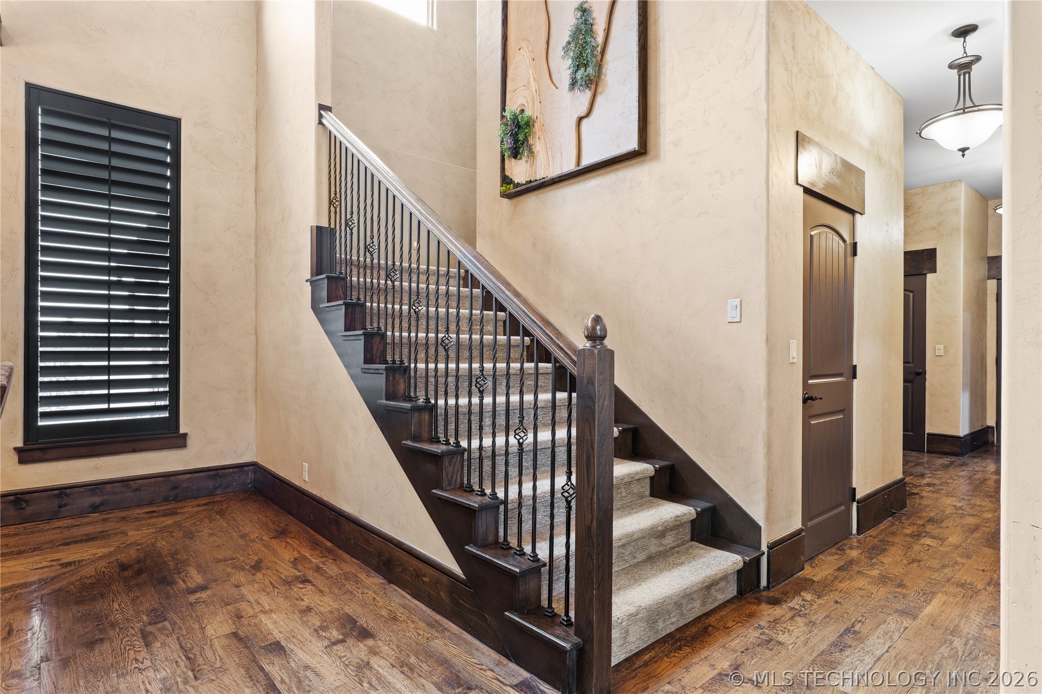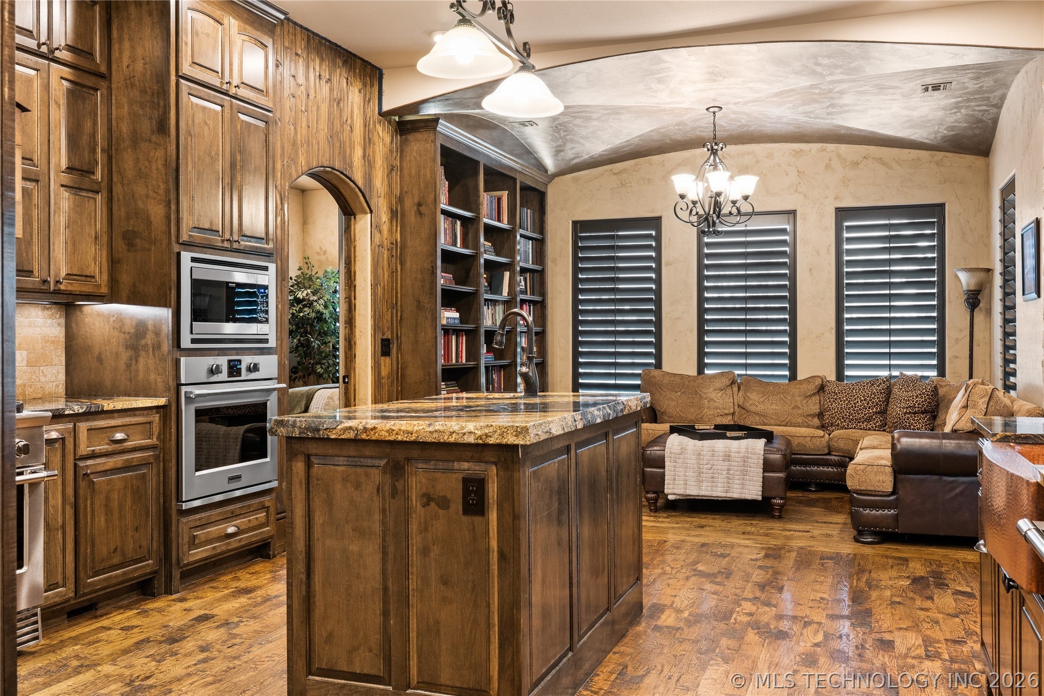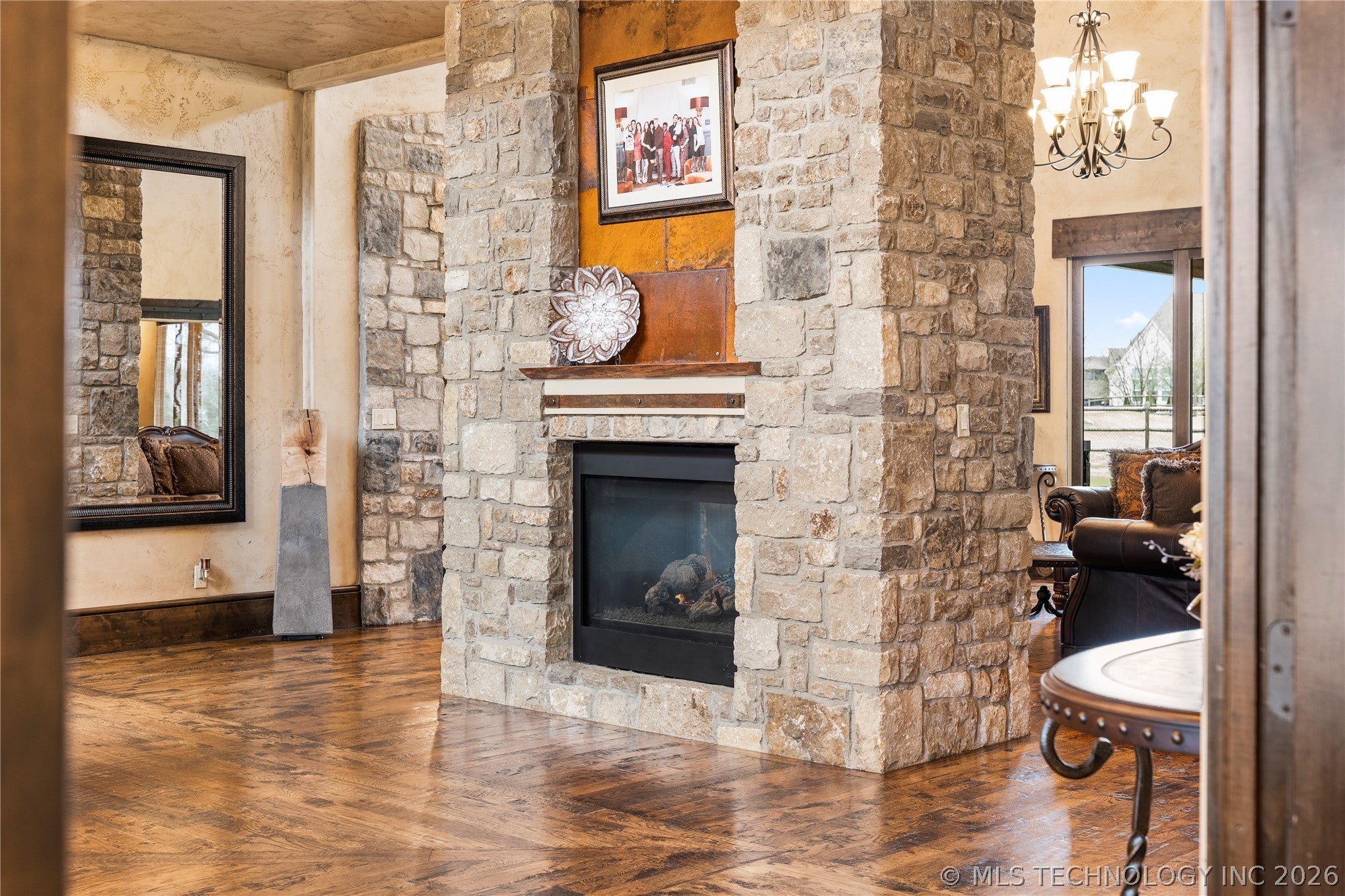Experience the pinnacle of Mediterranean luxury in the exclusive, gated Highland Pointe of Stone Canyon. This Mission-style masterpiece commands a sprawling lot and features a signature tile roof, authentic stone masonry, and grand architectural arches. The interior reveals a sophisticated open-concept floor plan defined by 22-foot vaulted ceilings, rich hardwoods, and a gourmet chefs kitchen equipped with expansive granite countertops and professional-grade appliances. The primary suite offers a resort-style sanctuary with a spa-inspired bath including a hot rock steam sauna and double shower with body sprays and rain heads. There is a secondary downstairs suite complete w its own living room and bathroom, perfect for generational living options. An executive office, movie theater with snack bar, fitness room and another living area anchoring the bedrooms upstairs allows for function and fun! Residents enjoy elite community amenities including a gated entrance, the Patriot Golf Club (membership required), a 100-acre private lake, and scenic hiking trails, all within the top-rated Owasso school district.