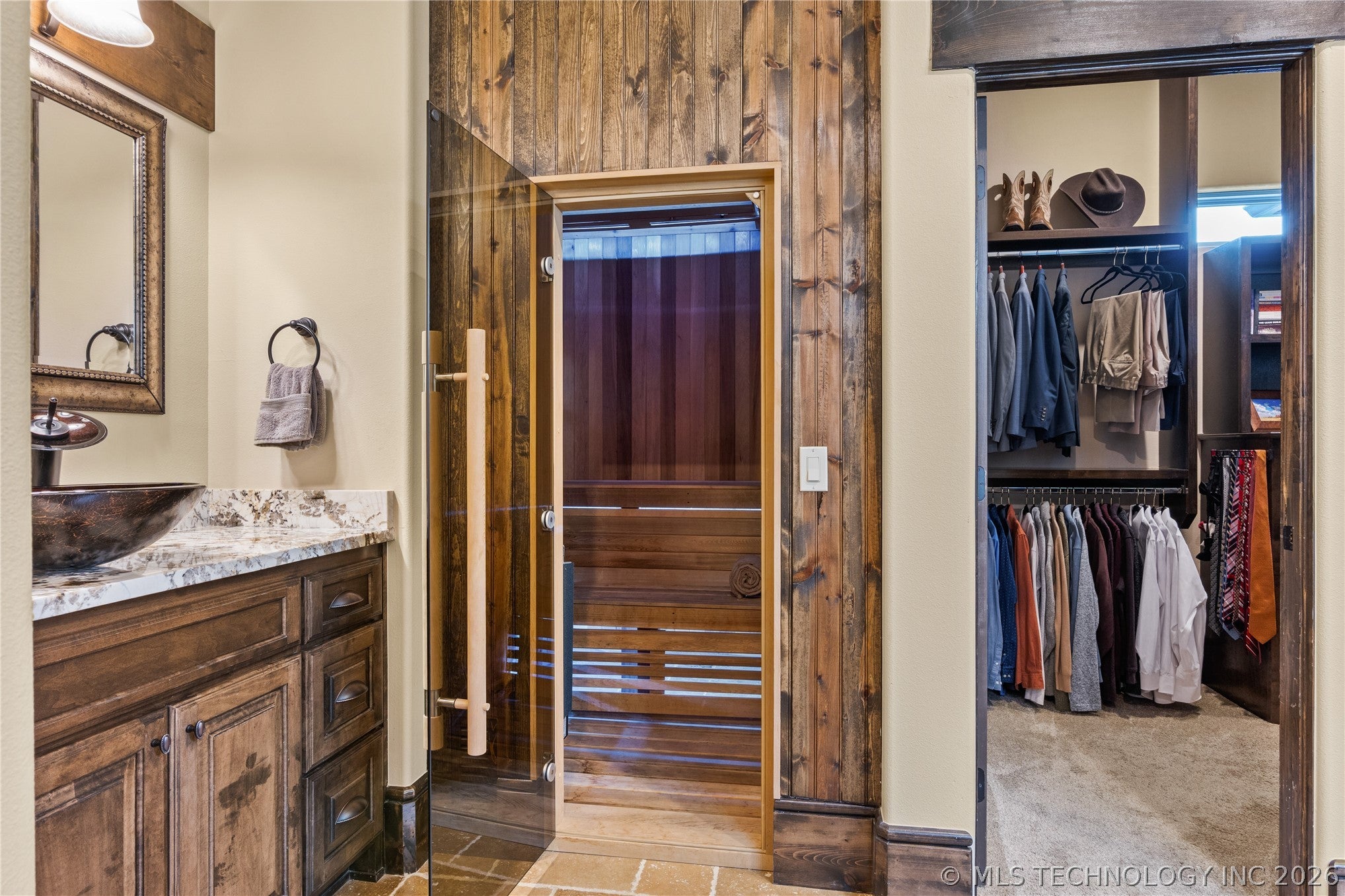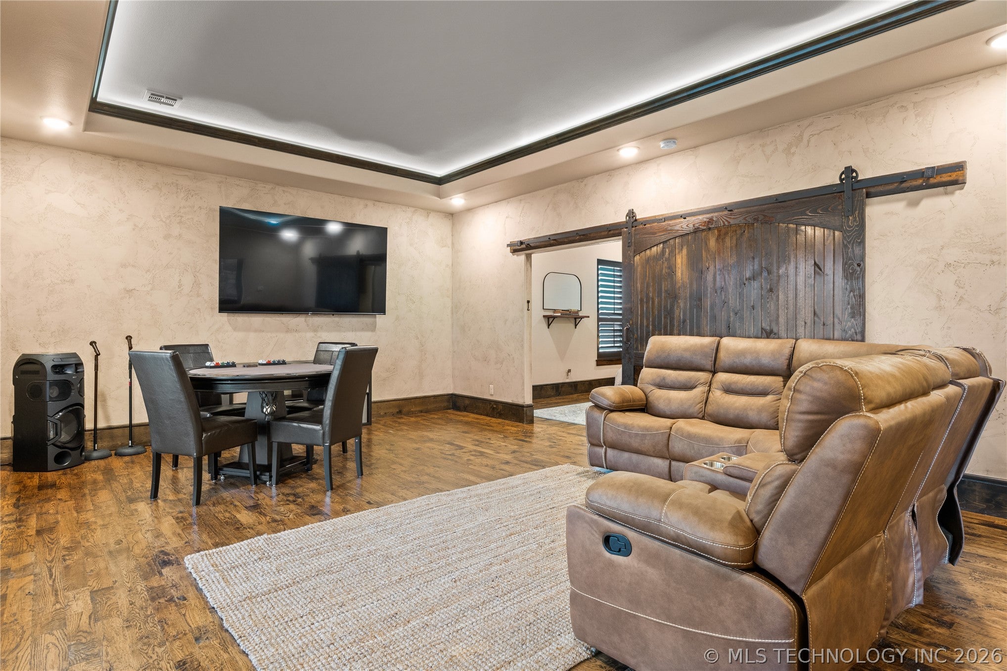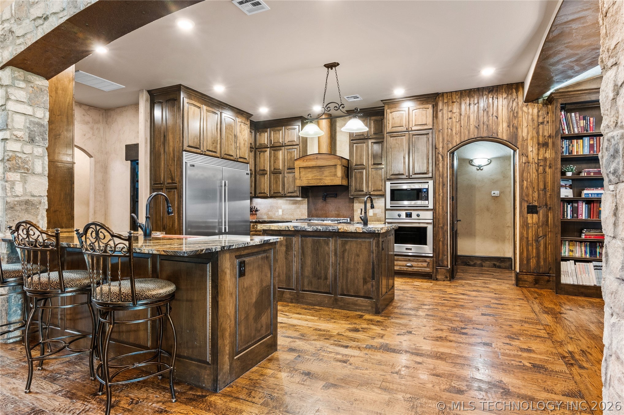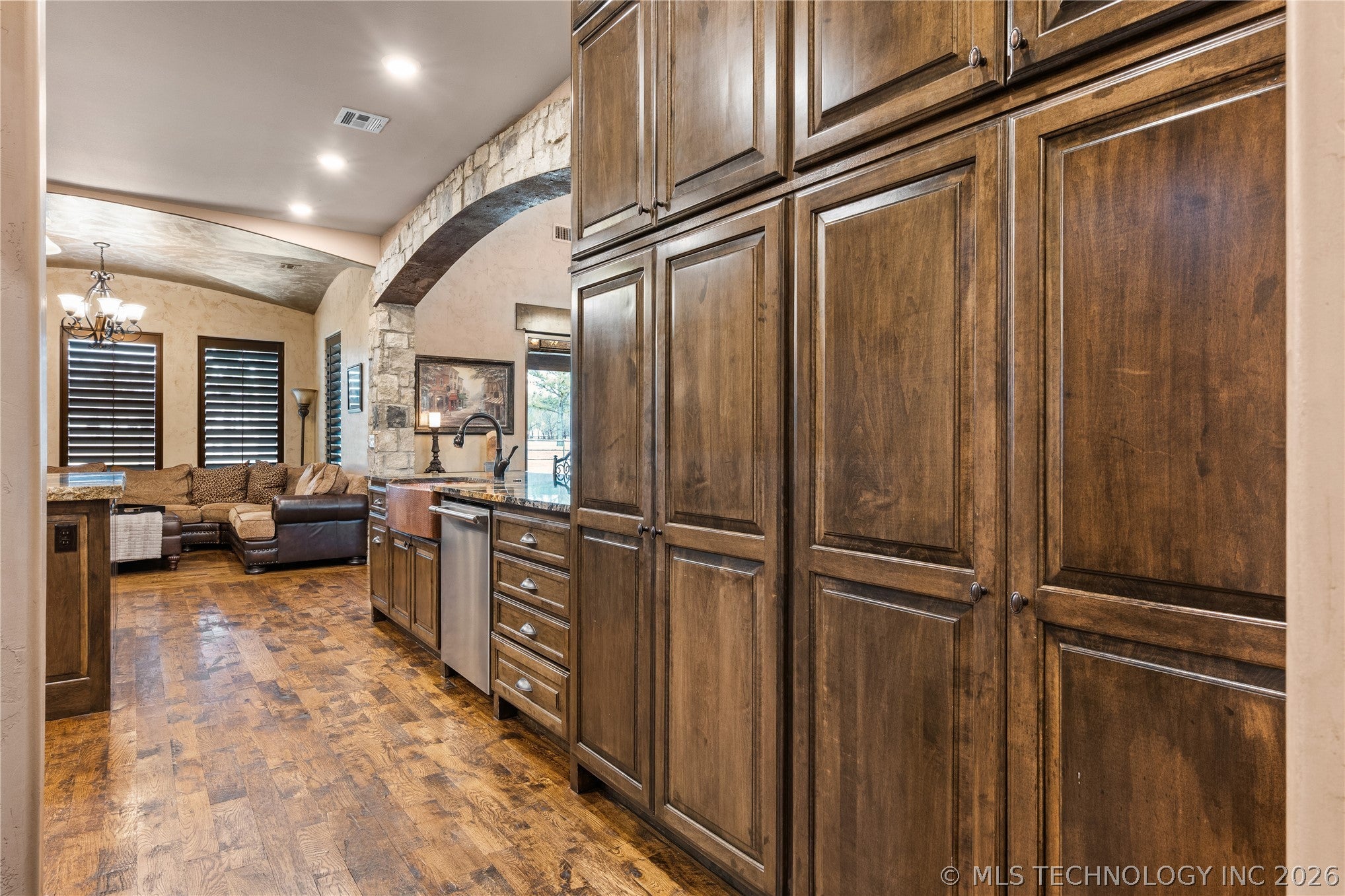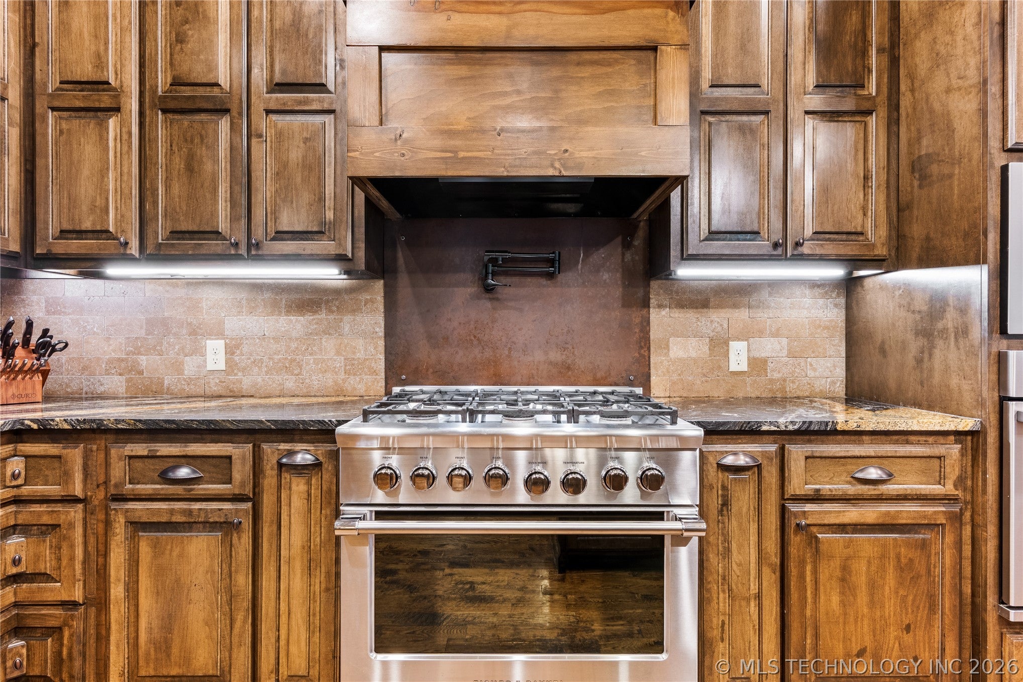Experience the pinnacle of Mediterranean luxury in the exclusive, gated Highland Pointe of Stone Canyon. This Mission-style masterpiece commands a sprawling lot and features a signature tile roof, authentic stone masonry, and grand architectural arches. The interior reveals a sophisticated open-concept floor plan defined by 22-foot vaulted ceilings, rich hardwoods, and a gourmet chefs kitchen equipped with expansive granite countertops and professional-grade appliances. The primary suite offers a resort-style sanctuary with a spa-inspired bath including a hot rock steam sauna and double shower with body sprays and rain heads. There is a secondary downstairs suite complete w its own living room and bathroom, perfect for generational living options. An executive office, movie theater with snack bar, fitness room and another living area anchoring the bedrooms upstairs allows for function and fun! Residents enjoy elite community amenities including a gated entrance, the Patriot Golf Club (membership required), a 100-acre private lake, and scenic hiking trails, all within the top-rated Owasso school district.