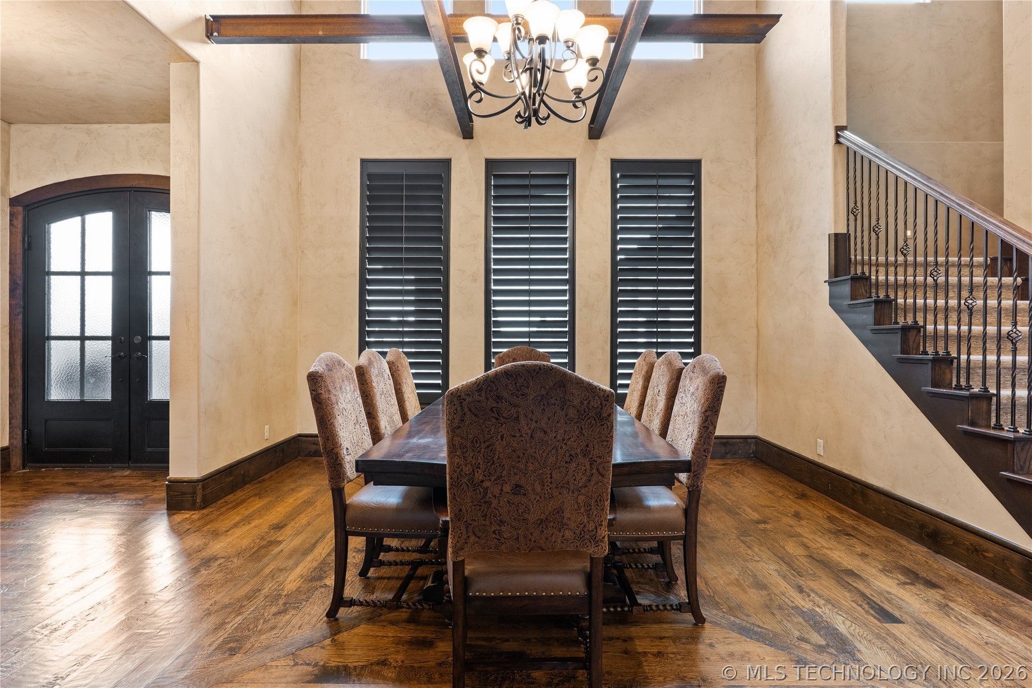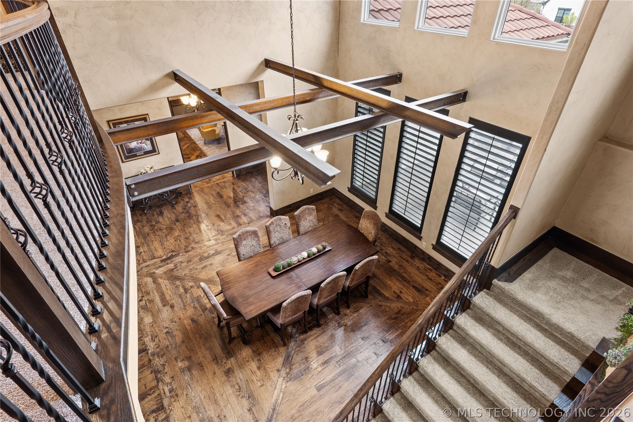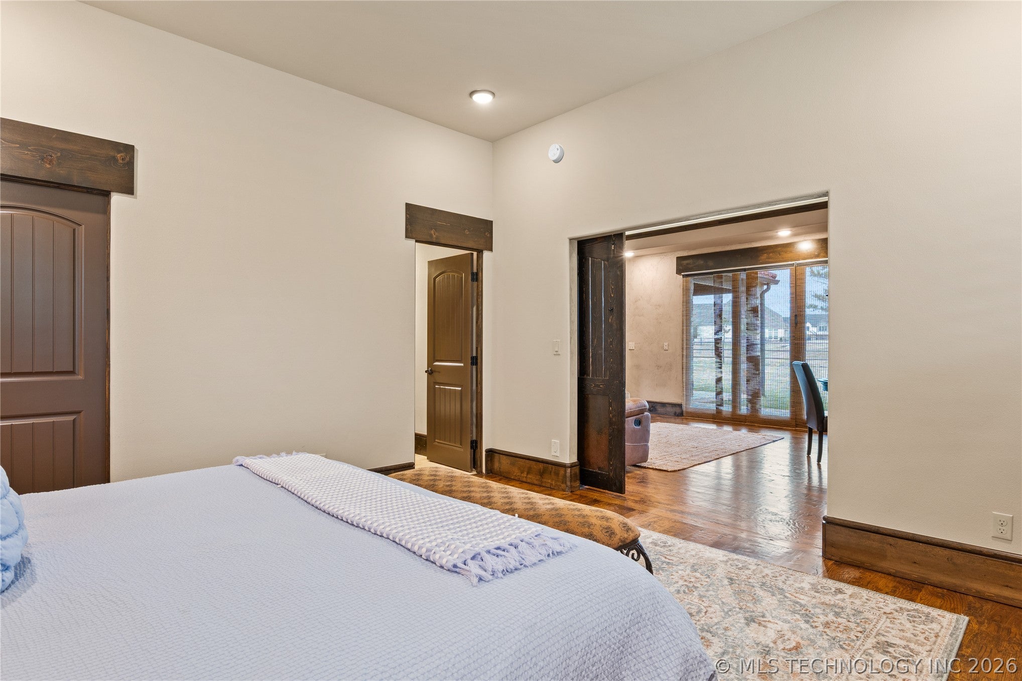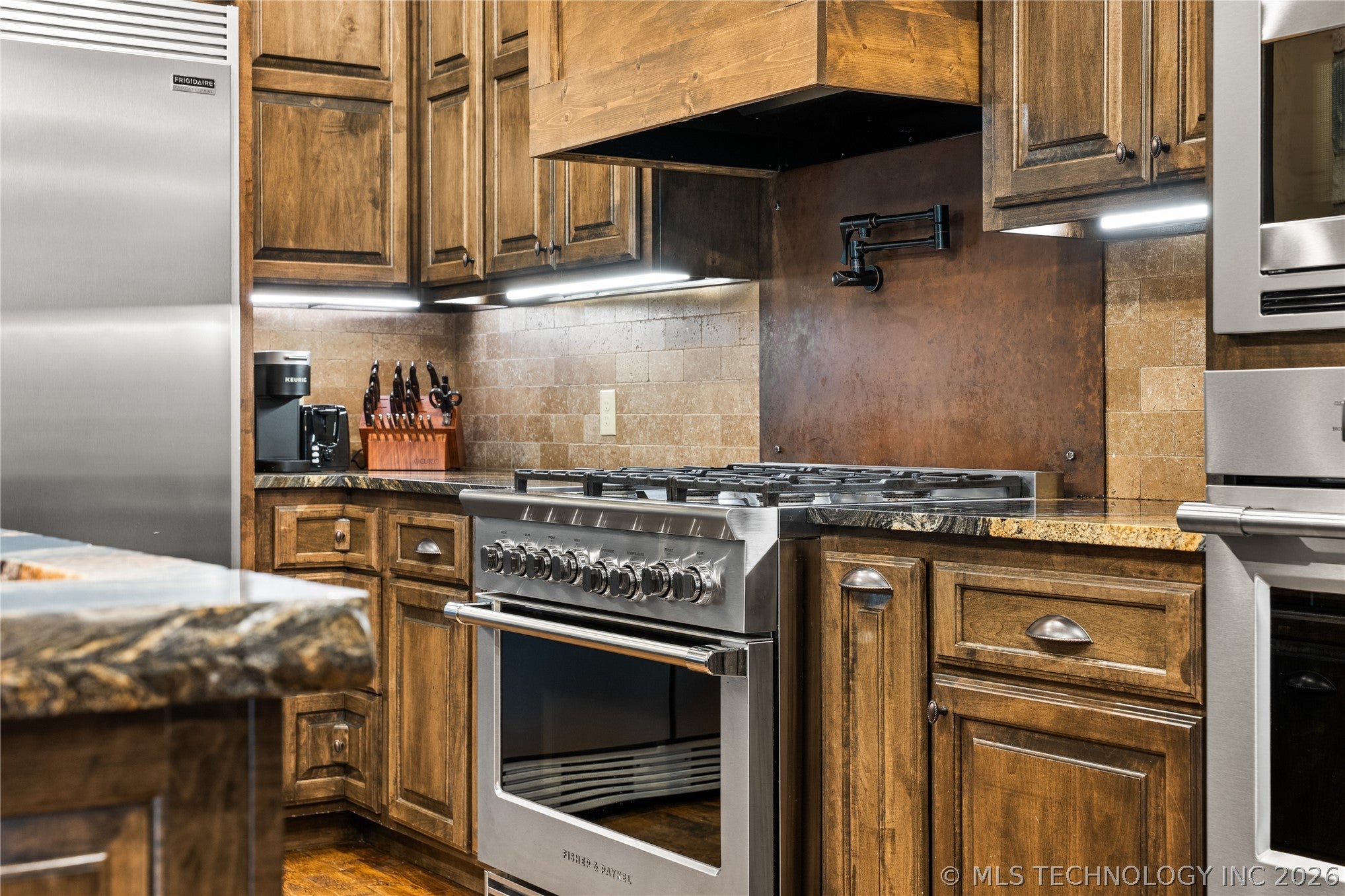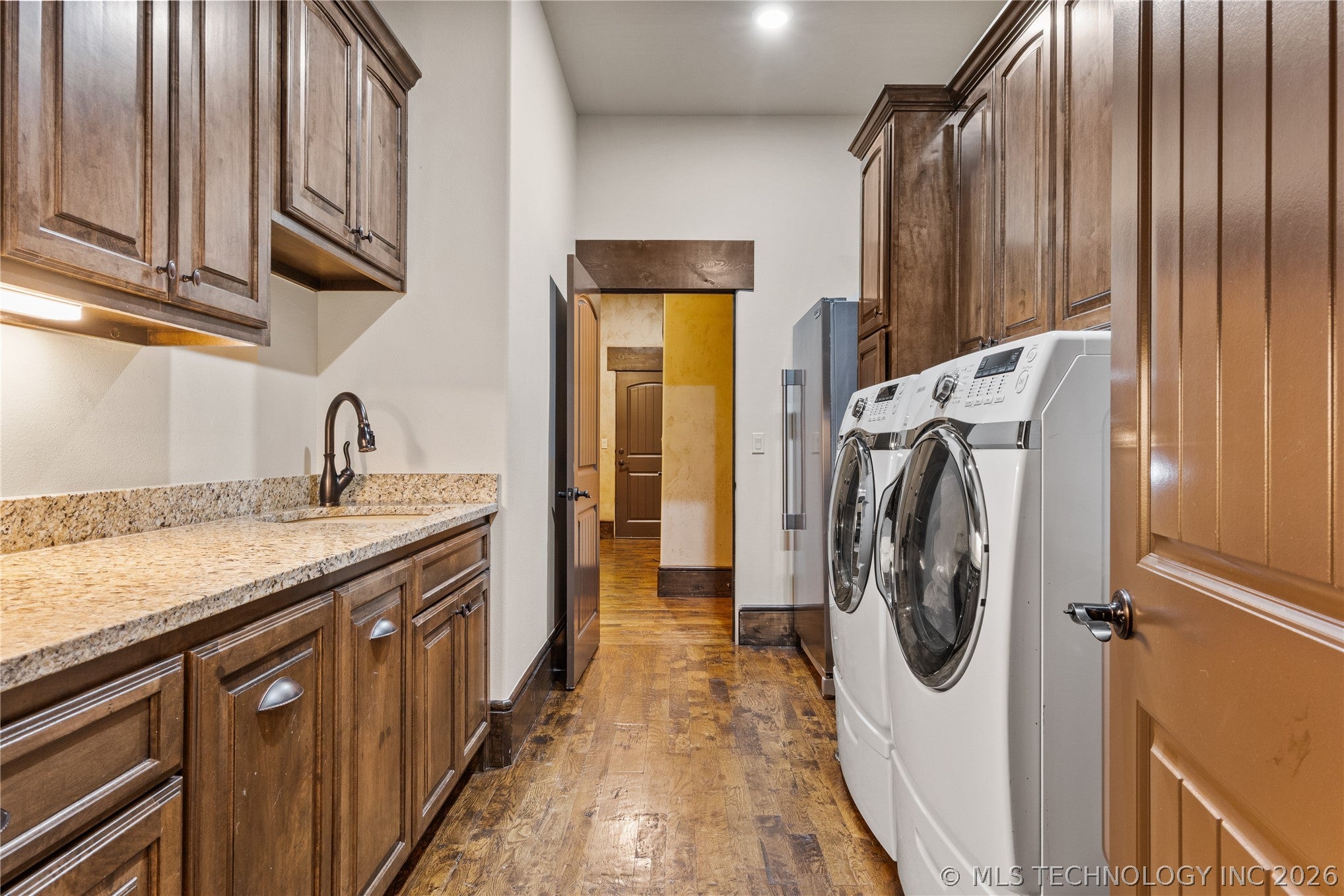 Experience the pinnacle of Mediterranean luxury in the exclusive, gated Highland Pointe of Stone Canyon. This Mission-style masterpiece commands a sprawling lot and features a signature tile roof, authentic stone masonry, and grand architectural arches. The interior reveals a sophisticated open-concept floor plan defined by 22-foot vaulted ceilings, rich hardwoods, and a gourmet chefs kitchen equipped with expansive granite countertops and professional-grade appliances. The primary suite offers a resort-style sanctuary with a spa-inspired bath including a hot rock steam sauna and double shower with body sprays and rain heads. There is a secondary downstairs suite complete w its own living room and bathroom, perfect for generational living options. An executive office, movie theater with snack bar, fitness room and another living area anchoring the bedrooms upstairs allows for function and fun! Residents enjoy elite community amenities including a gated entrance, the Patriot Golf Club (membership required), a 100-acre private lake, and scenic hiking trails, all within the top-rated Owasso school district.