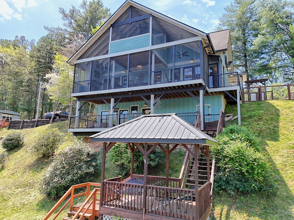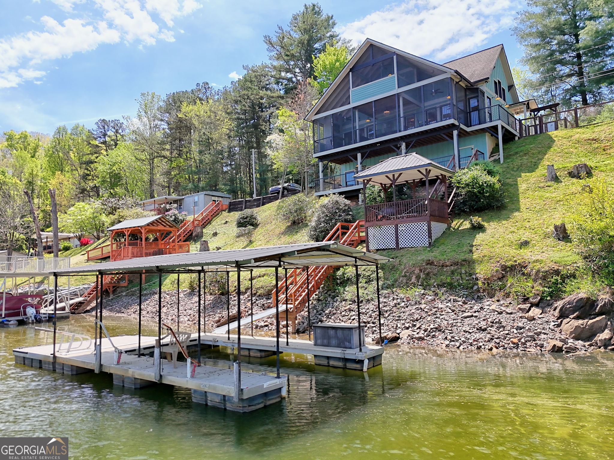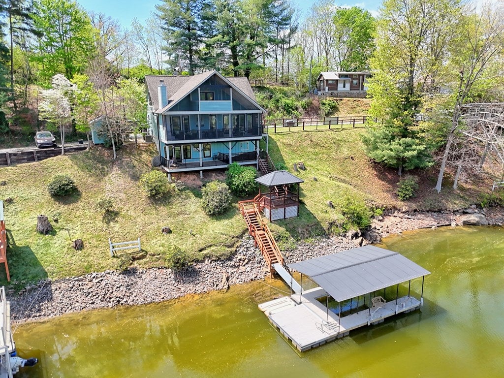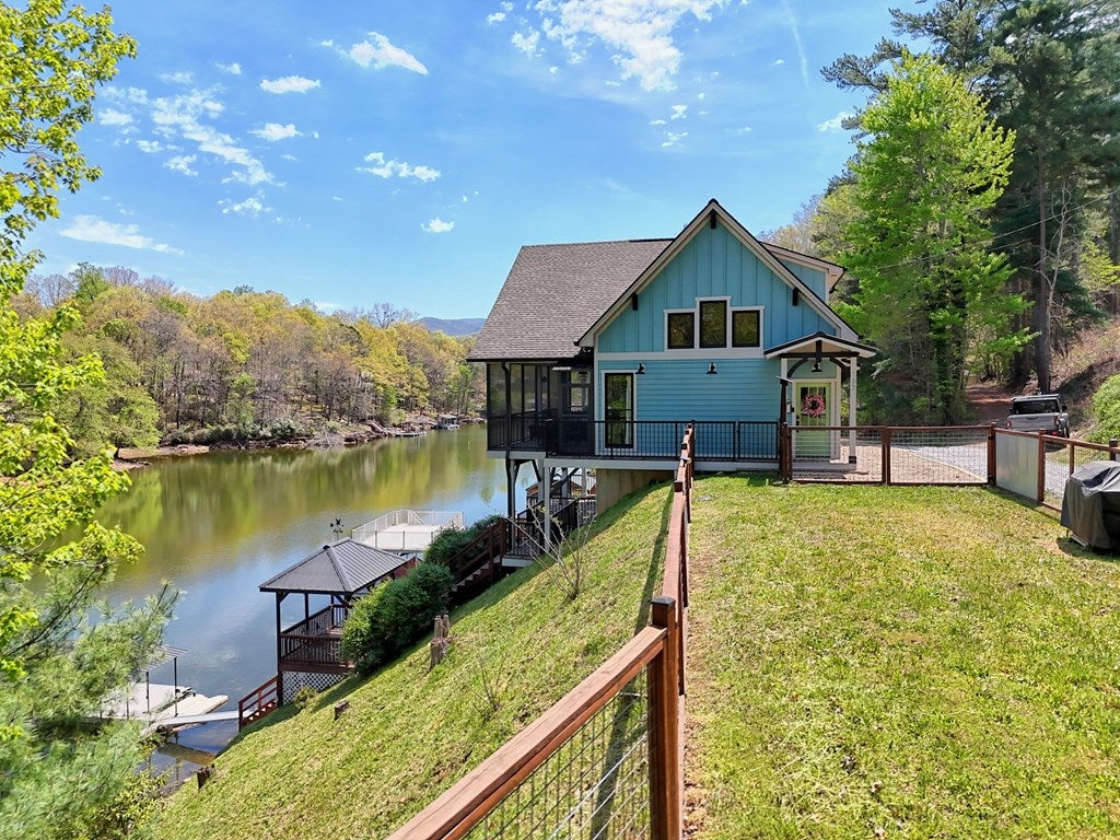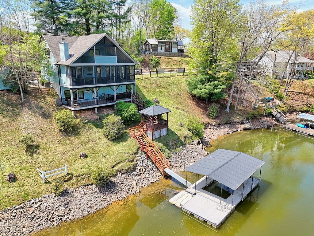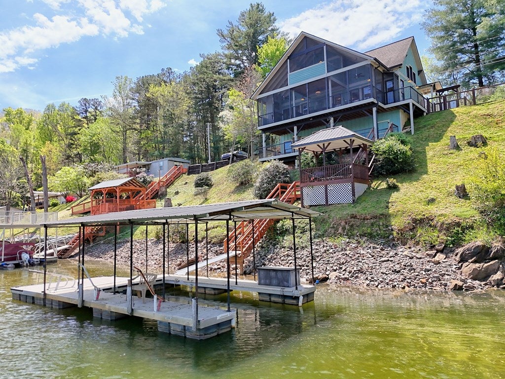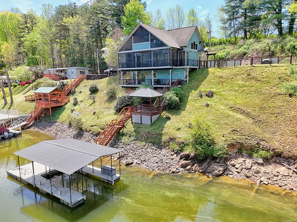 Enjoy year-round water and seamless indoor-outdoor living in this fully furnished, turnkey lakefront retreat on Lake Chatuge. Built by a builder for his own family, this thoughtfully designed home is ideally positioned in a quiet no-wake zone offering calm deep water, perfect for swimming, kayaking, and relaxing in every season. The 3BR/2BA/2HBA home features an open-concept layout with cathedral ceilings, exposed beams, a gas log fireplace with custom built-in surround. The main level opens directly onto a full-length screened porch, with a wood burning fire place and Tiger wood decking. This creates an ideal extension of the living space for entertaining or unwinding while taking in peaceful lake and mountain views. The kitchen is well appointed with granite countertops, stainless steel appliances, dishwasher, a gas cooktop, built in wall oven and microwave, coffee bar and pantry. The main level also offers convenient single-level living with a primary bed room and private bath with custom tiled walk-in shower. 1/2 bath and laundry complete this level. Upstairs, youll find two guest bedrooms, a full bath, tile shower and a charming sleeping porch with custom convertible hanging swings/beds. The lower level provides additional flexibility with a family room, half bath, bonus room, and access to another large deck. A lakeside gazebo, fenced side yard, and storage building. Aluminum covered single-slip dock with swim platform and jet ski dock completes this exceptional lakefront offering.