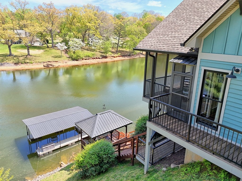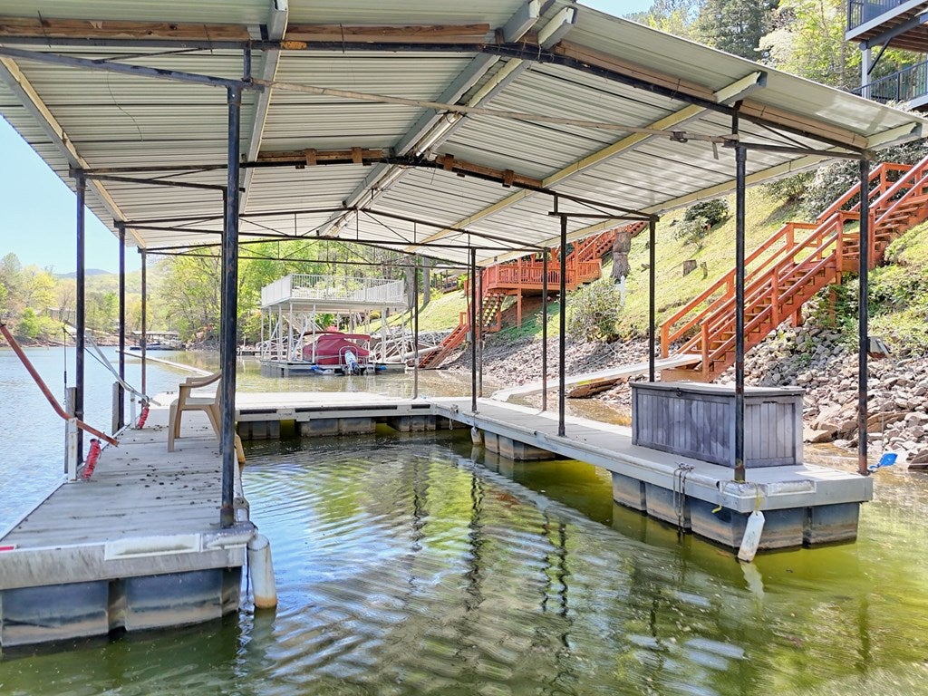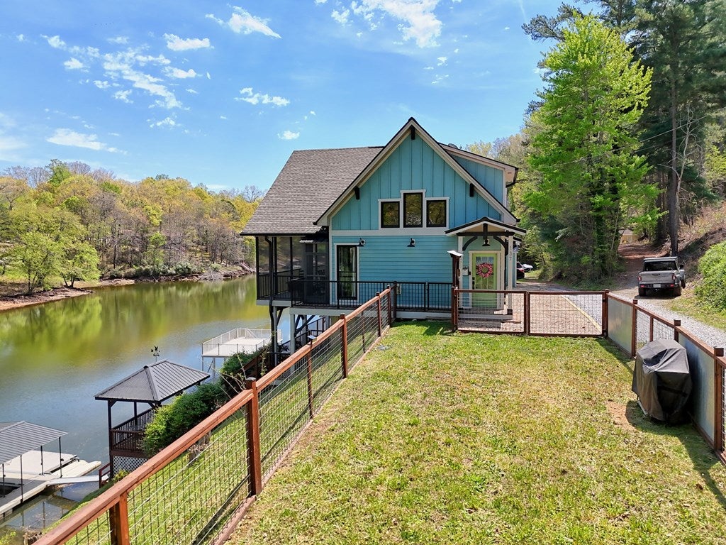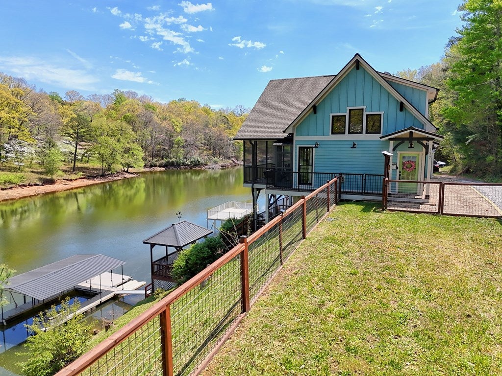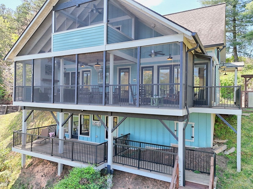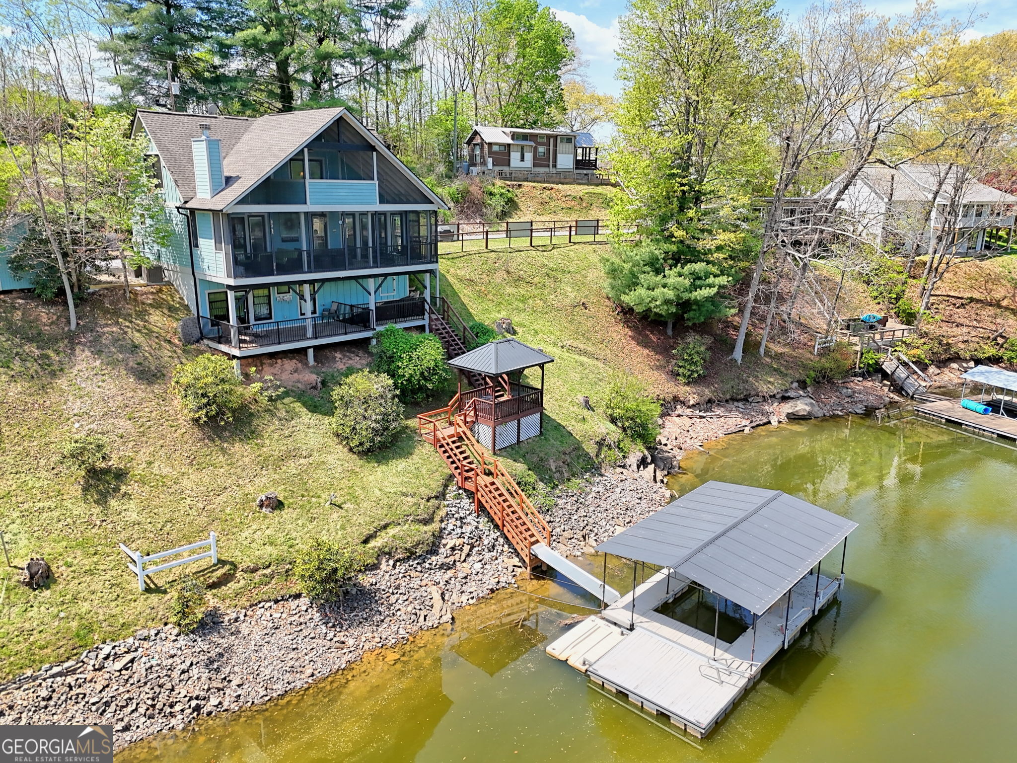 Enjoy year-round water and seamless indoor-outdoor living in this fully furnished, turnkey lakefront retreat on Lake Chatuge. Built by a builder for his own family, this thoughtfully designed home is ideally positioned in a quiet no-wake zone offering calm deep water, perfect for swimming, kayaking, and relaxing in every season. The 3BR/2BA/2HBA home features an open-concept layout with cathedral ceilings, exposed beams, a gas log fireplace with custom built-in surround. The main level opens directly onto a full-length screened porch, with a wood burning fire place and Tiger wood decking. This creates an ideal extension of the living space for entertaining or unwinding while taking in peaceful lake and mountain views. The kitchen is well appointed with granite countertops, stainless steel appliances, dishwasher, a gas cooktop, built in wall oven and microwave, coffee bar and pantry. The main level also offers convenient single-level living with a primary bed room and private bath with custom tiled walk-in shower. 1/2 bath and laundry complete this level. Upstairs, youll find two guest bedrooms, a full bath, tile shower and a charming sleeping porch with custom convertible hanging swings/beds. The lower level provides additional flexibility with a family room, half bath, bonus room, and access to another large deck. A lakeside gazebo, fenced side yard, and storage building. Aluminum covered single-slip dock with swim platform and jet ski dock completes this exceptional lakefront offering.