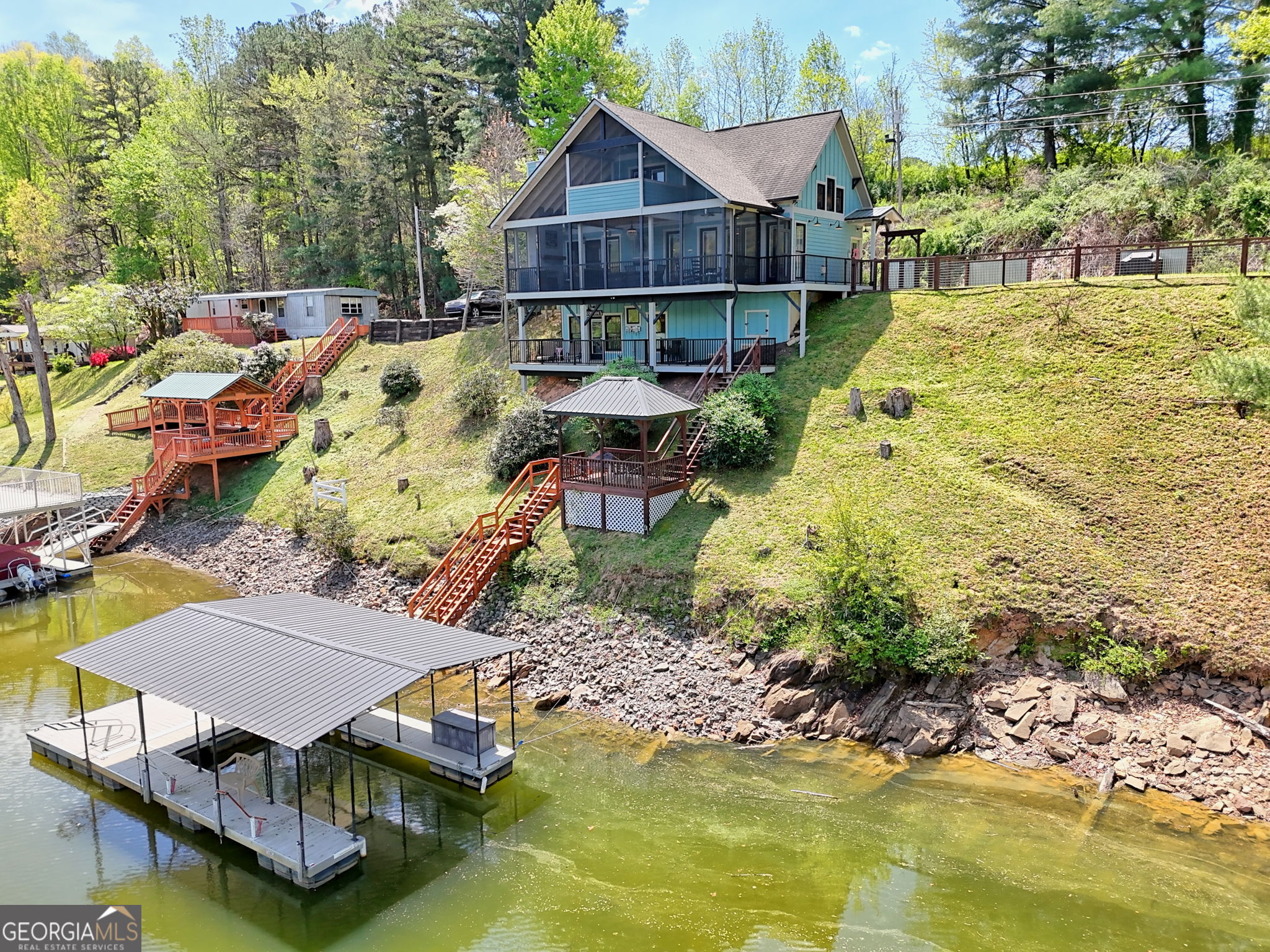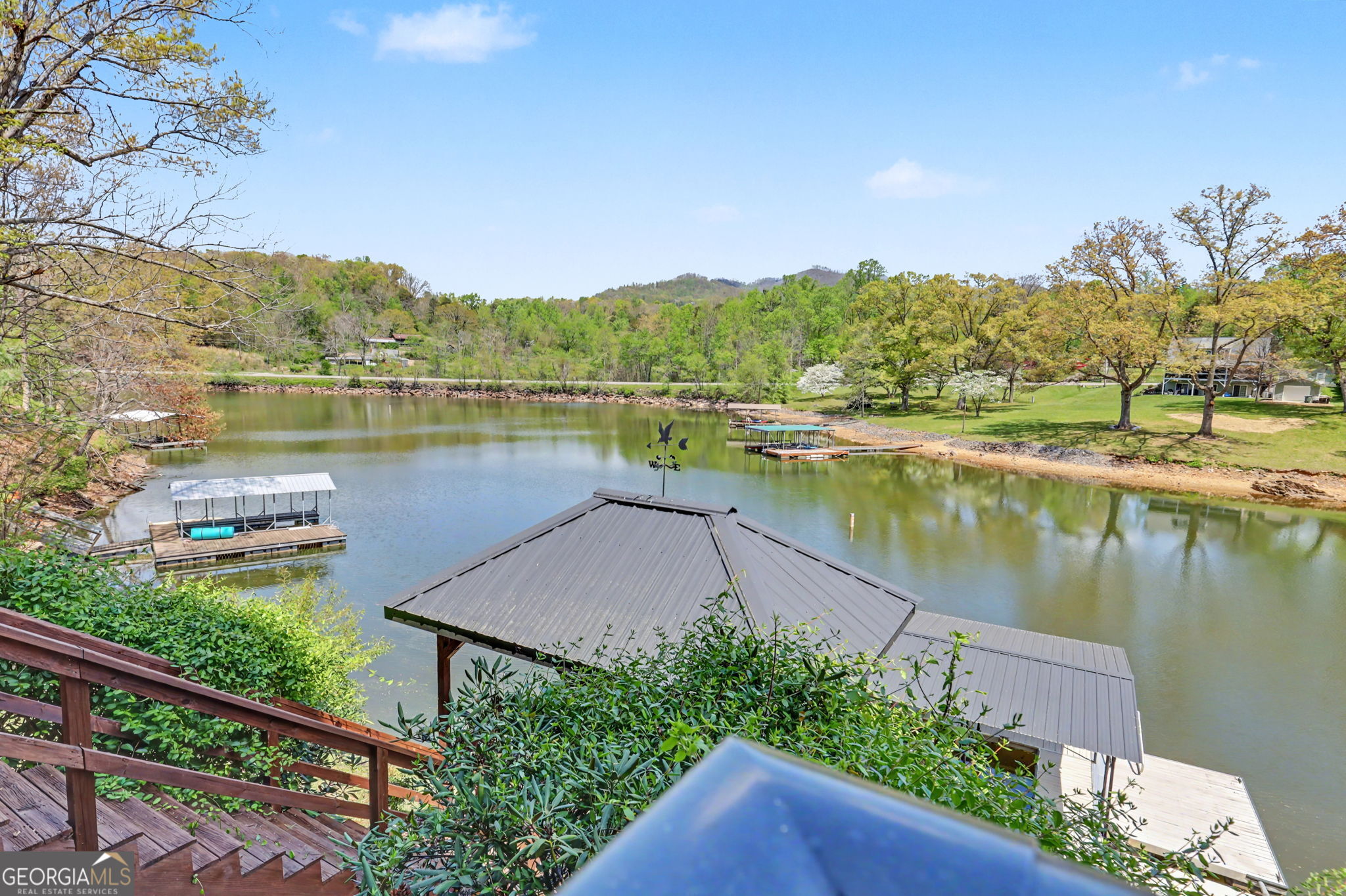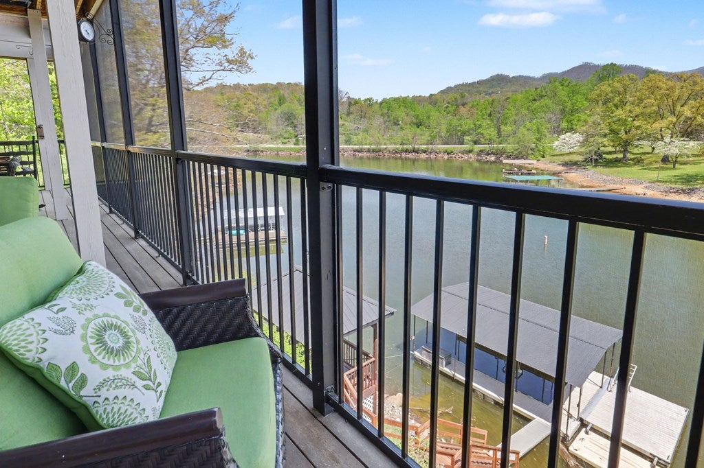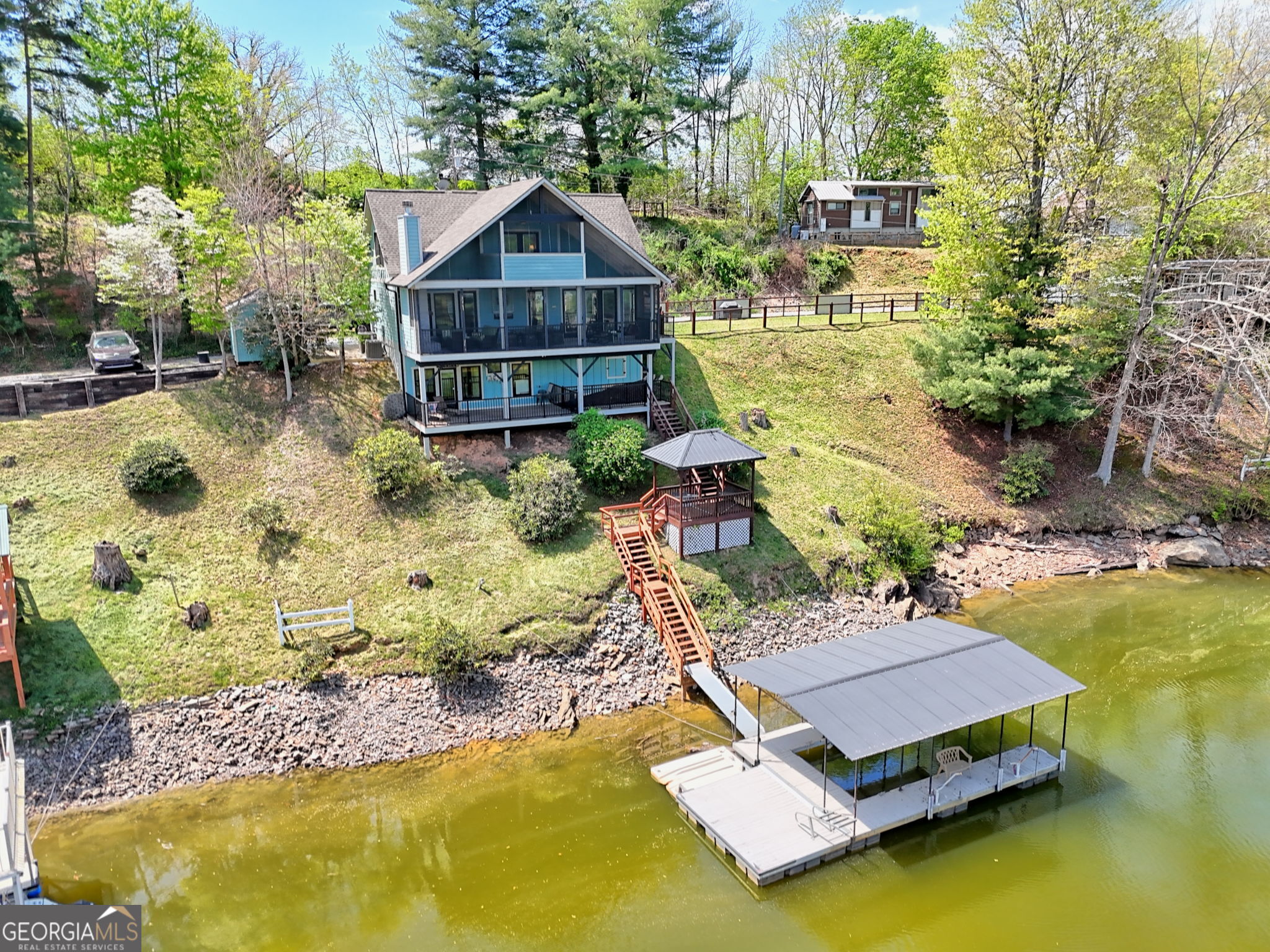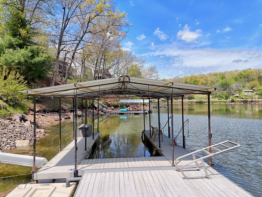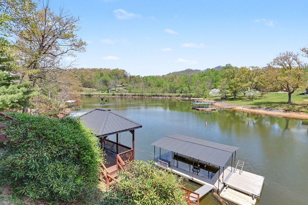 Enjoy year-round water and seamless indoor-outdoor living in this fully furnished, turnkey lakefront retreat on Lake Chatuge. Built by a builder for his own family, this thoughtfully designed home is ideally positioned in a quiet no-wake zone offering calm deep water, perfect for swimming, kayaking, and relaxing in every season. The 3BR/2BA/2HBA home features an open-concept layout with cathedral ceilings, exposed beams, a gas log fireplace with custom built-in surround. The main level opens directly onto a full-length screened porch, with a wood burning fire place and Tiger wood decking. This creates an ideal extension of the living space for entertaining or unwinding while taking in peaceful lake and mountain views. The kitchen is well appointed with granite countertops, stainless steel appliances, dishwasher, a gas cooktop, built in wall oven and microwave, coffee bar and pantry. The main level also offers convenient single-level living with a primary bed room and private bath with custom tiled walk-in shower. 1/2 bath and laundry complete this level. Upstairs, youll find two guest bedrooms, a full bath, tile shower and a charming sleeping porch with custom convertible hanging swings/beds. The lower level provides additional flexibility with a family room, half bath, bonus room, and access to another large deck. A lakeside gazebo, fenced side yard, and storage building. Aluminum covered single-slip dock with swim platform and jet ski dock completes this exceptional lakefront offering.