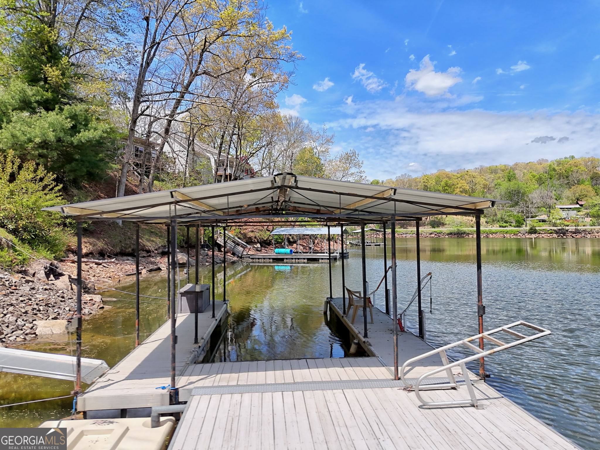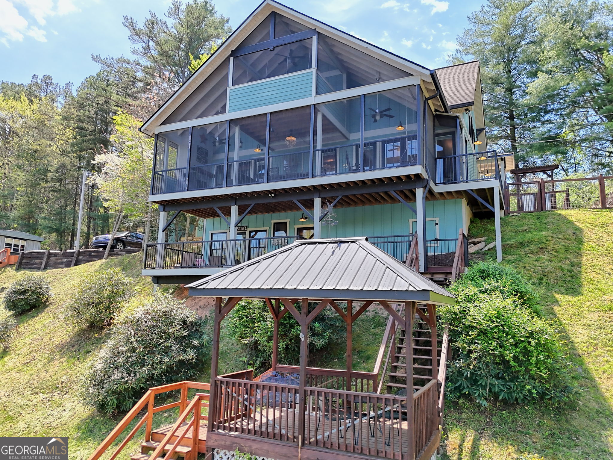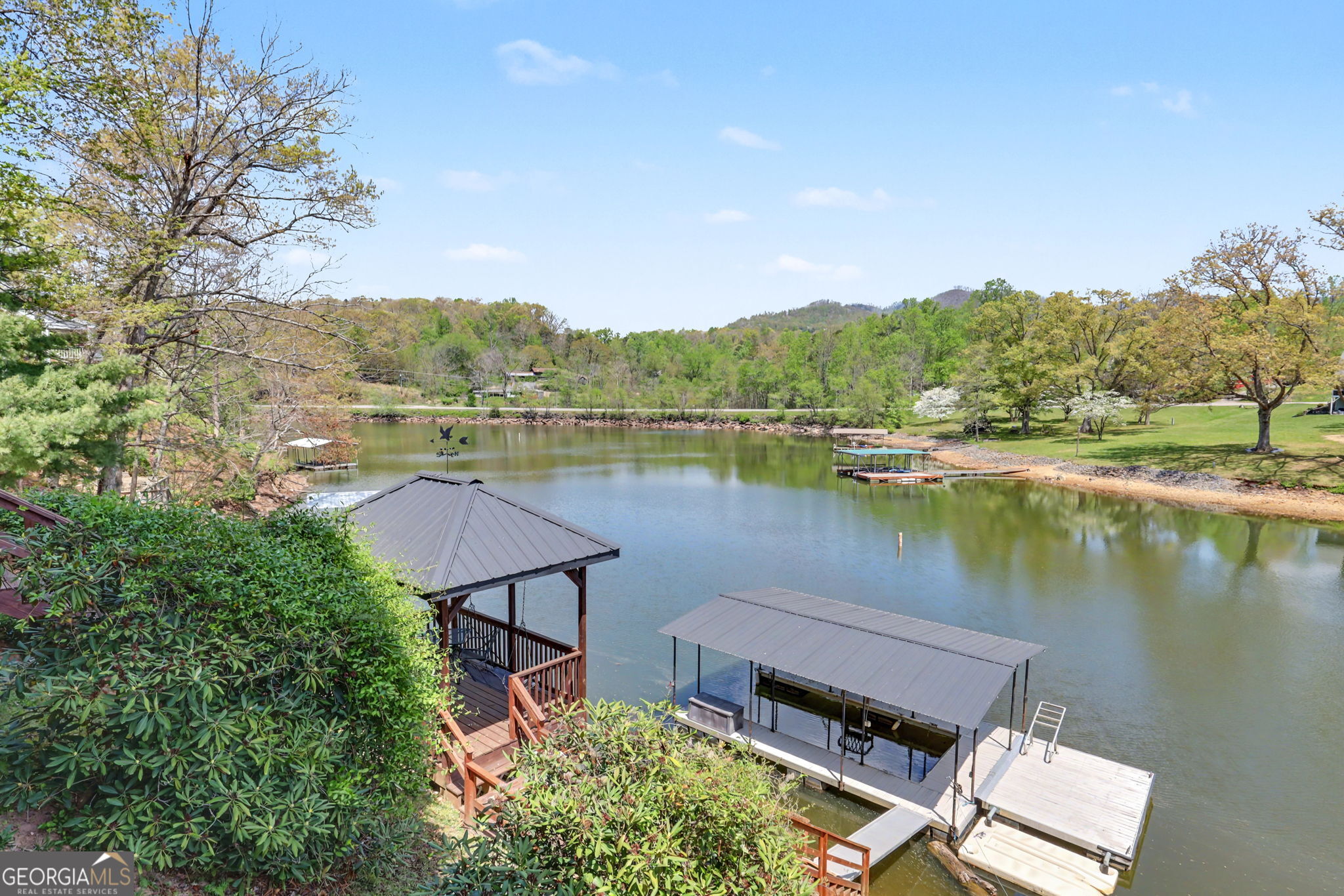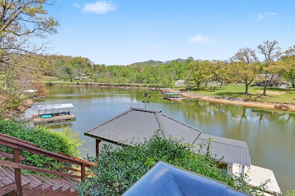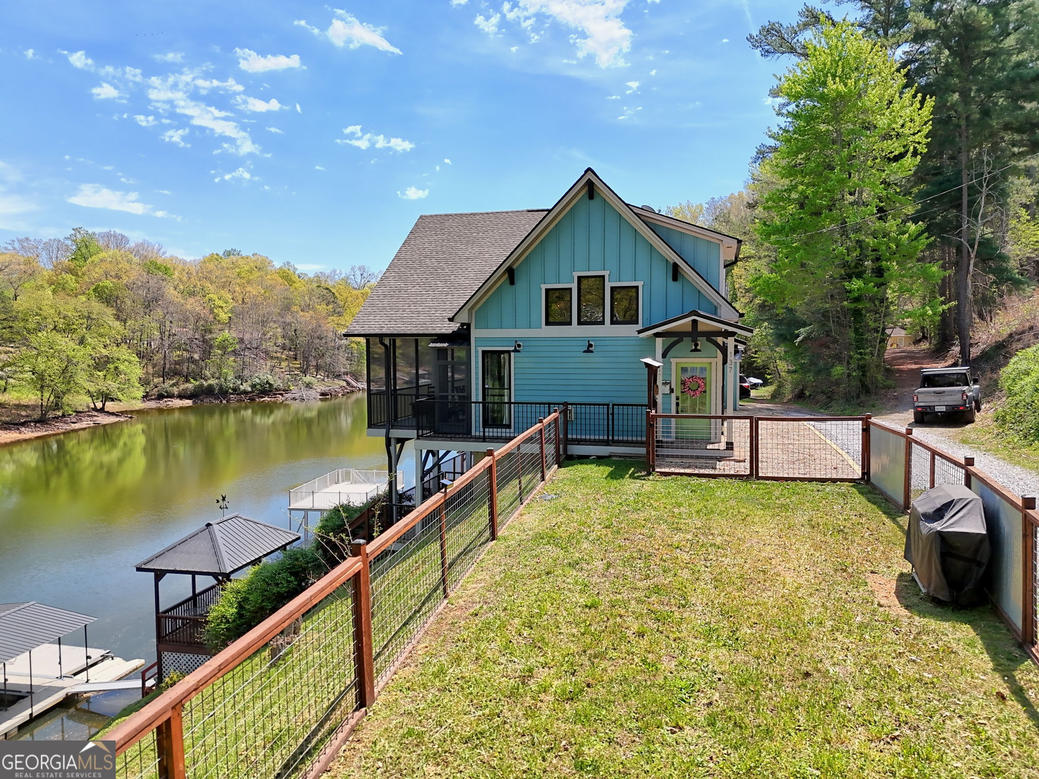 Enjoy year-round water and seamless indoor-outdoor living in this fully furnished, turnkey lakefront retreat on Lake Chatuge. Built by a builder for his own family, this thoughtfully designed home is ideally positioned in a quiet no-wake zone offering calm deep water, perfect for swimming, kayaking, and relaxing in every season. The 3BR/2BA/2HBA home features an open-concept layout with cathedral ceilings, exposed beams, a gas log fireplace with custom built-in surround. The main level opens directly onto a full-length screened porch, with a wood burning fire place and Tiger wood decking. This creates an ideal extension of the living space for entertaining or unwinding while taking in peaceful lake and mountain views. The kitchen is well appointed with granite countertops, stainless steel appliances, dishwasher, a gas cooktop, built in wall oven and microwave, coffee bar and pantry. The main level also offers convenient single-level living with a primary bed room and private bath with custom tiled walk-in shower. 1/2 bath and laundry complete this level. Upstairs, youll find two guest bedrooms, a full bath, tile shower and a charming sleeping porch with custom convertible hanging swings/beds. The lower level provides additional flexibility with a family room, half bath, bonus room, and access to another large deck. A lakeside gazebo, fenced side yard, and storage building. Aluminum covered single-slip dock with swim platform and jet ski dock completes this exceptional lakefront offering.