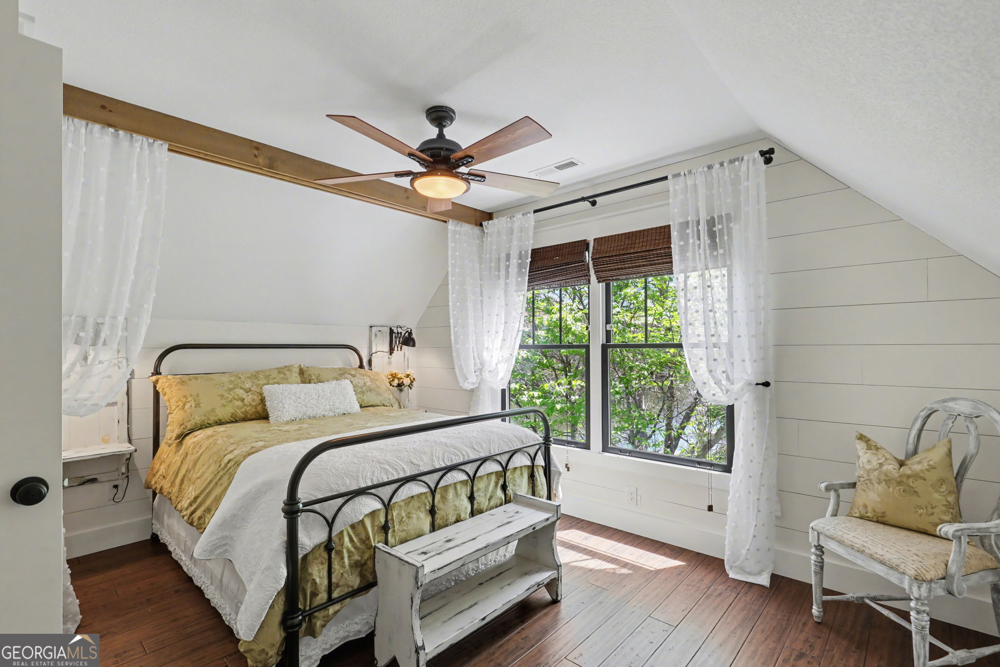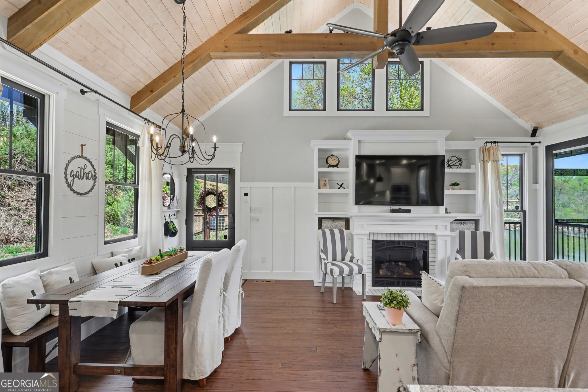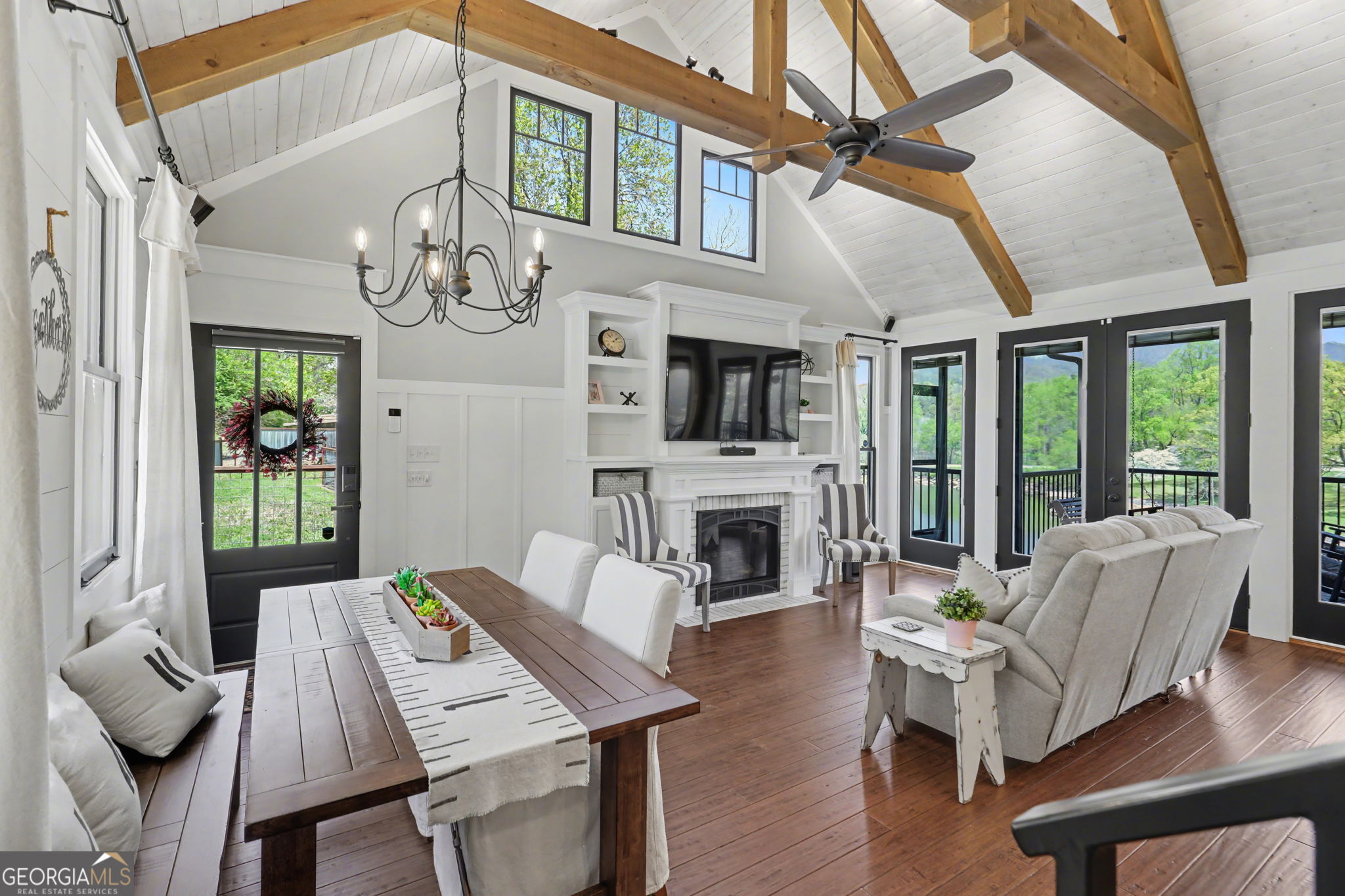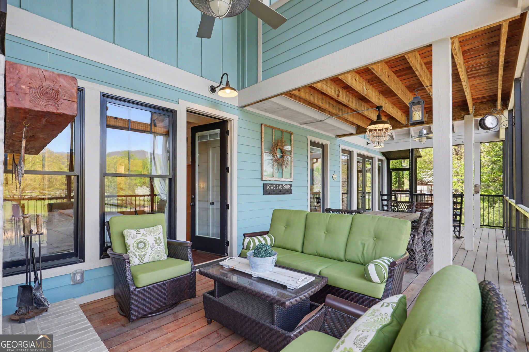Enjoy year-round water and seamless indoor-outdoor living in this fully furnished, turnkey lakefront retreat on Lake Chatuge. Built by a builder for his own family, this thoughtfully designed home is ideally positioned in a quiet no-wake zone offering calm deep water, perfect for swimming, kayaking, and relaxing in every season. The 3BR/2BA/2HBA home features an open-concept layout with cathedral ceilings, exposed beams, a gas log fireplace with custom built-in surround. The main level opens directly onto a full-length screened porch, with a wood burning fire place and Tiger wood decking. This creates an ideal extension of the living space for entertaining or unwinding while taking in peaceful lake and mountain views. The kitchen is well appointed with granite countertops, stainless steel appliances, dishwasher, a gas cooktop, built in wall oven and microwave, coffee bar and pantry. The main level also offers convenient single-level living with a primary bed room and private bath with custom tiled walk-in shower. 1/2 bath and laundry complete this level. Upstairs, youll find two guest bedrooms, a full bath, tile shower and a charming sleeping porch with custom convertible hanging swings/beds. The lower level provides additional flexibility with a family room, half bath, bonus room, and access to another large deck. A lakeside gazebo, fenced side yard, and storage building. Aluminum covered single-slip dock with swim platform and jet ski dock completes this exceptional lakefront offering.