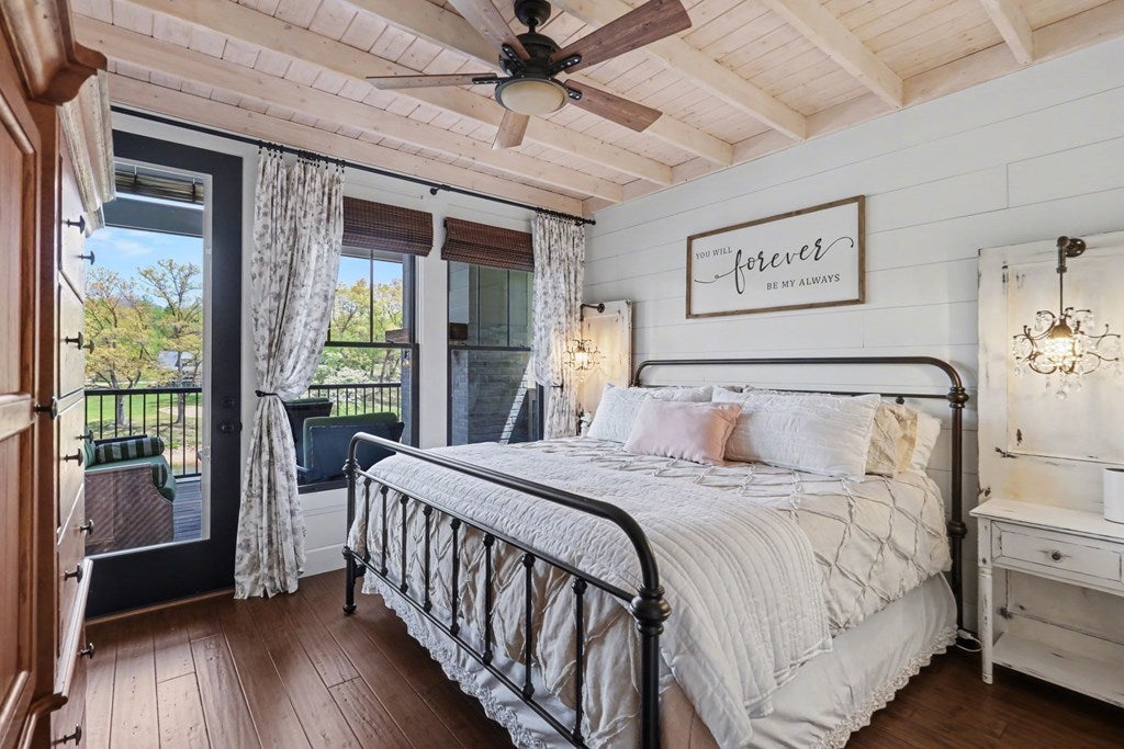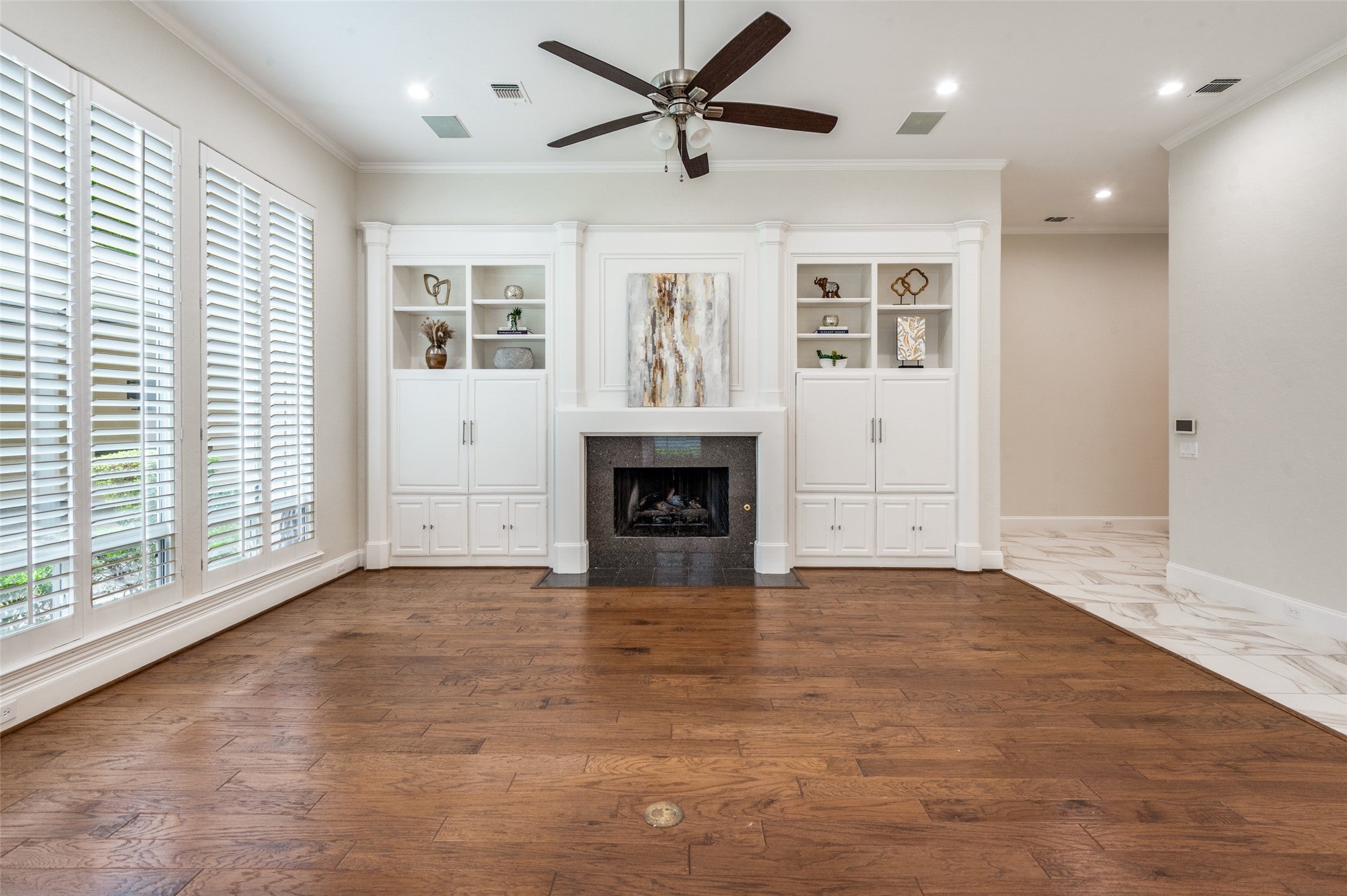 Steve Roberts custom on a wooded creek lot in exclusive Starwood. Double iron front doors open to a light-filled custom home with creek views from nearly every room, plus tall ceilings, built-in speakers, plantation shutters, and iron balusters throughout. The family room features a wall of windows, built-in entertainment center and bookshelves, and a gas-log fireplace with wood mantel.