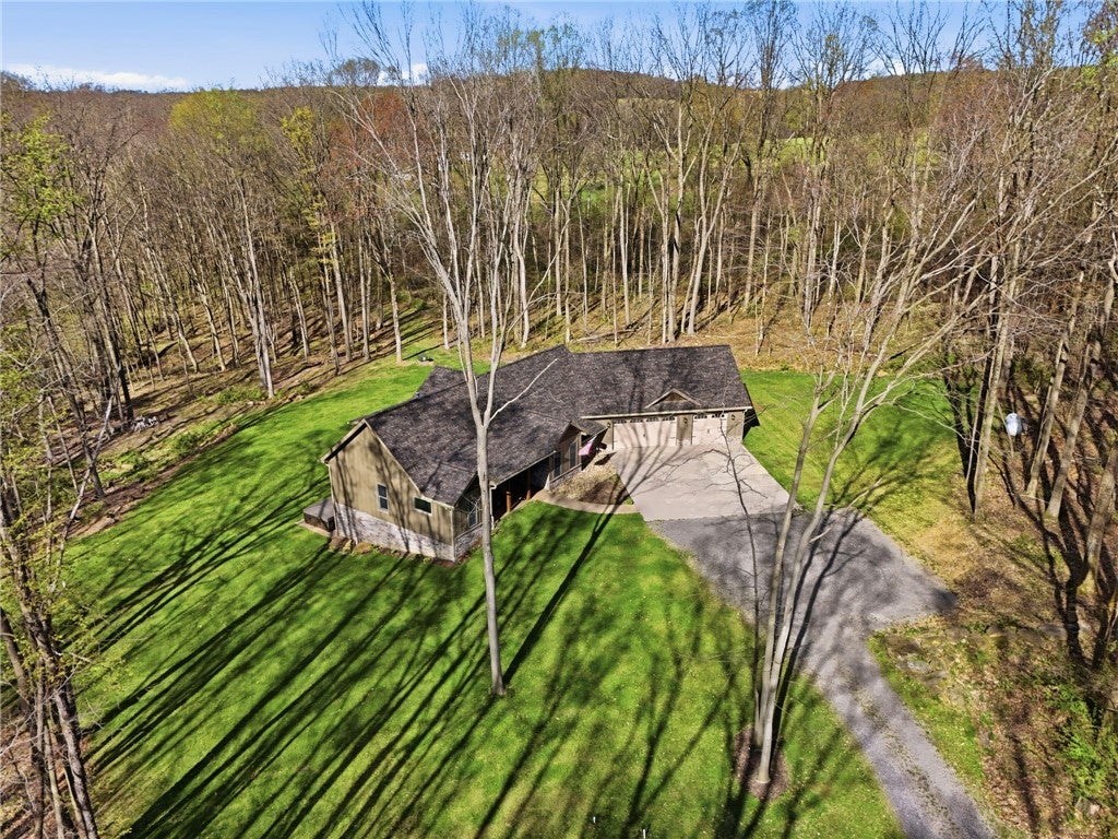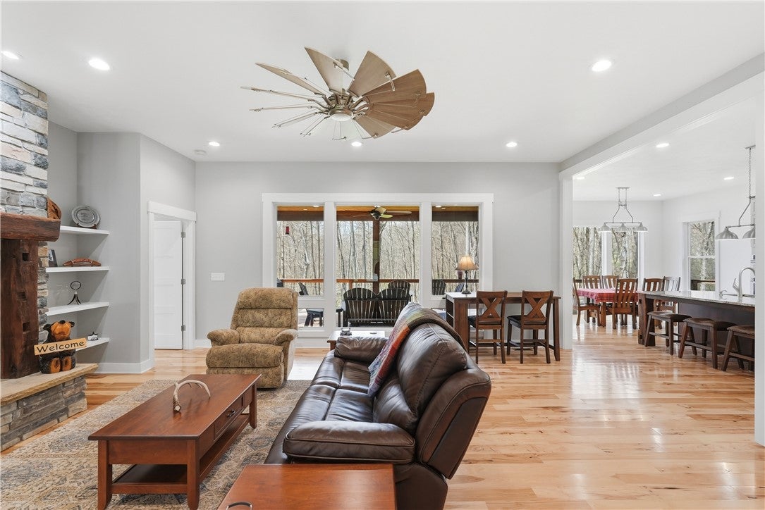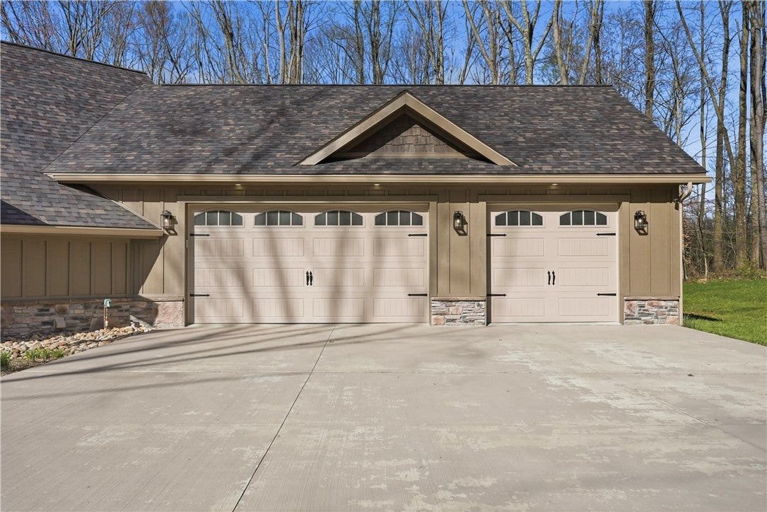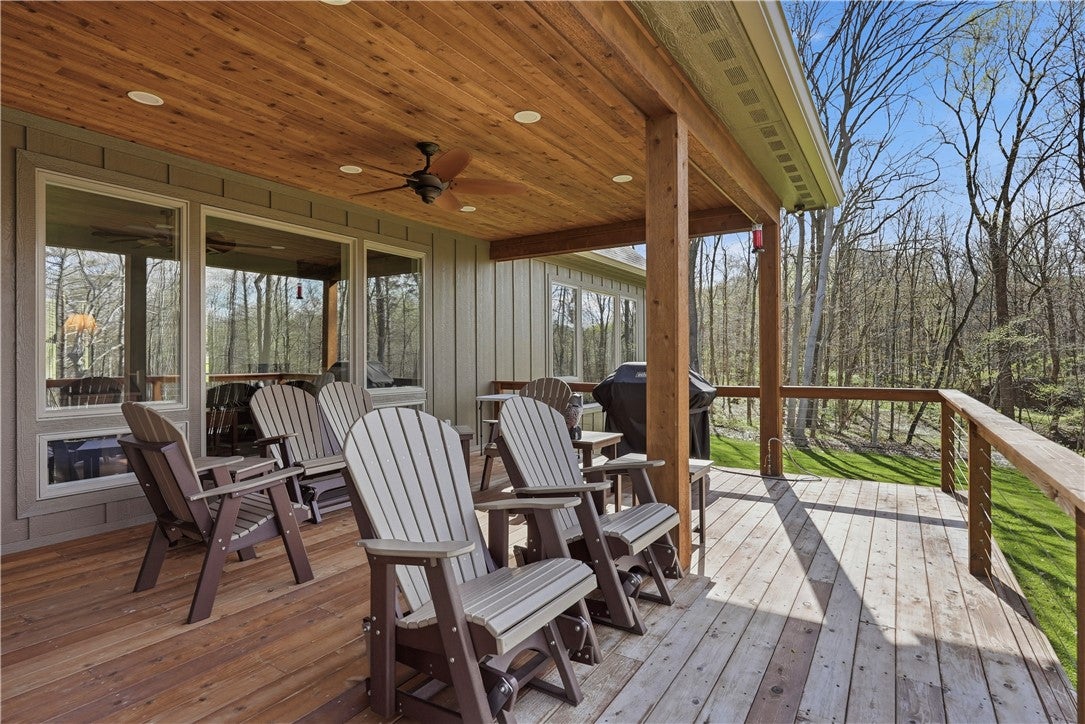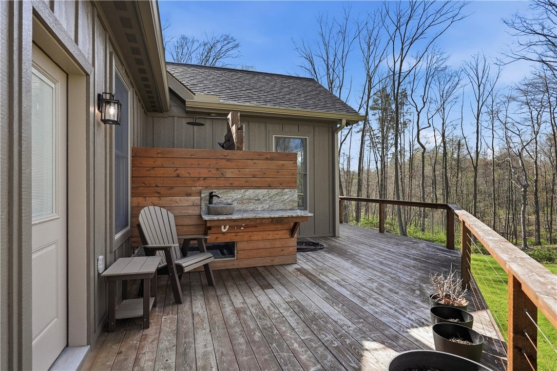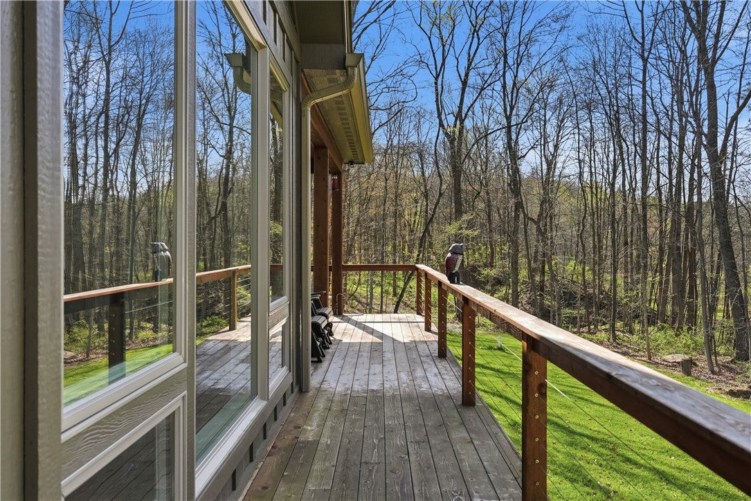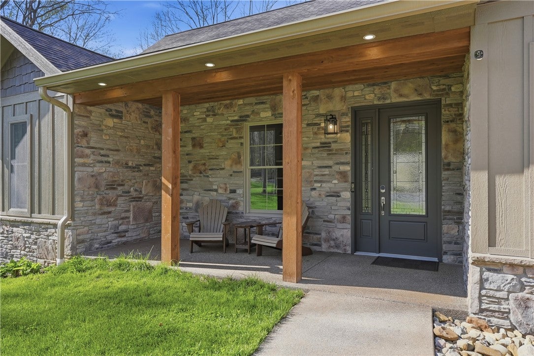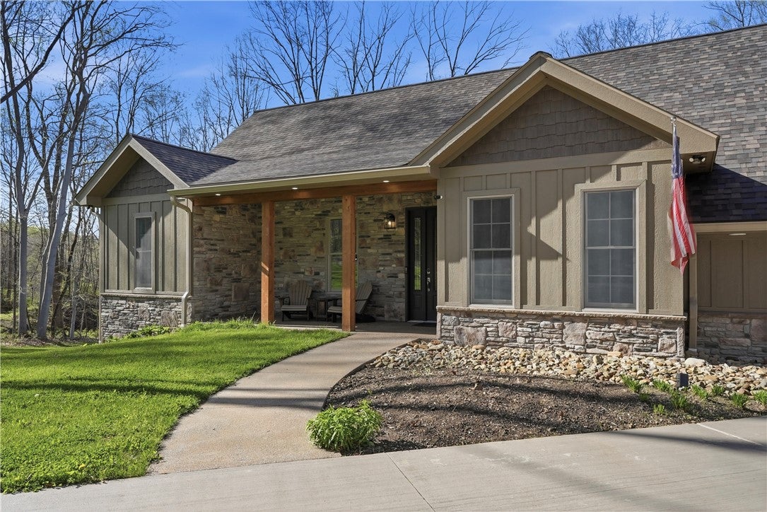 Rarely does a property offer this convergence of modern luxury and untouched natural beauty. Set on 14-plus private wooded acres beside McConnells Mill State Park, this meticulously maintained 2023 ranch home delivers the ultimate private retreat without sacrificing comfort or quality. Offering 2,309 finished square feet, three bedrooms, and three full bathrooms, every detail has been thoughtfully considered, from the beautifully grained hickory hardwood floors and stunning stone fireplace to the open-concept living spaces, western red cedar porches, and custom outdoor shower that together frame a lifestyle as breathtaking as the natural setting itself. Two creeks originate on the property, flowing into the park and feeding Breakneck Falls, a feature so rare it cannot be replicated. Inside, the spa-inspired primary suite, designer kitchen, and warm gathering spaces complete a home that is as beautiful as the land it sits on. This is not just a home, it is a lifestyle. Encompassing the spectacular Slippery Rock Creek Gorge, a National Natural Landmark formed by glacial lakes thousands of years ago, McConnells Mill State Park is celebrated for its dramatic rock formations, massive boulders, scenic overlooks, and waterfalls, all accessible from your own backyard.Entering via the covered front porch finished with western red cedar, the home opens to a stunning open-concept living room and eat-in kitchen anchored by a beautiful stone fireplace. Natural light pours over richly grained hickory hardwood floors and soft neutral gray walls, creating the perfect blank canvas. The primary suite enjoys a private corner with a spacious walk-in closet and a bath complete with an oversized shower and soaking tub. Designed for true single-floor living, the home features wide doorways for seamless flow. The second main-level bedroom offers ensuite access and a generous closet. The kitchen is built for gathering with a large island, stainless steel appliances, shaker cabinetry, and walk-out access to the oversized rear deck.Outdoor spaces are equally impressive. The expansive cedar-wrapped deck is partially covered for year-round enjoyment, complemented by a custom outdoor shower with sink. Fourteen-plus private acres offer trails and a seamless connection to the park, with two creeks originating on the property and flowing into Breakneck Falls. A lower patio with hot tub area enhances the outdoor experience. The finished basement includes a family room, an additional bedroom with ensuite access, and walk-out access to the patio. A 13x32 unfinished section, roughed in for plumbing, offers potential for an in-law suite, Airbnb, additional primary suite, or storage with double doors and walk-out access. An additional 22x19 area provides further flexibility. The attached 3-car garage accommodates large vehicles, includes a workbench, ample storage, and a private home office. A long, tree-lined driveway sets the tone for this secluded retreat, all just minutes from I-79 and 20 minutes to Cranberrys shopping and amenities. Have all the opportunity to live in basically new construction home, ready for your enjoyment!