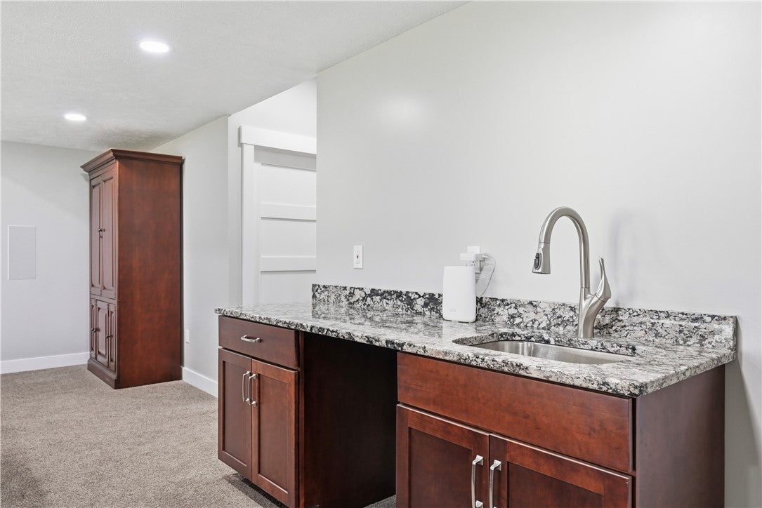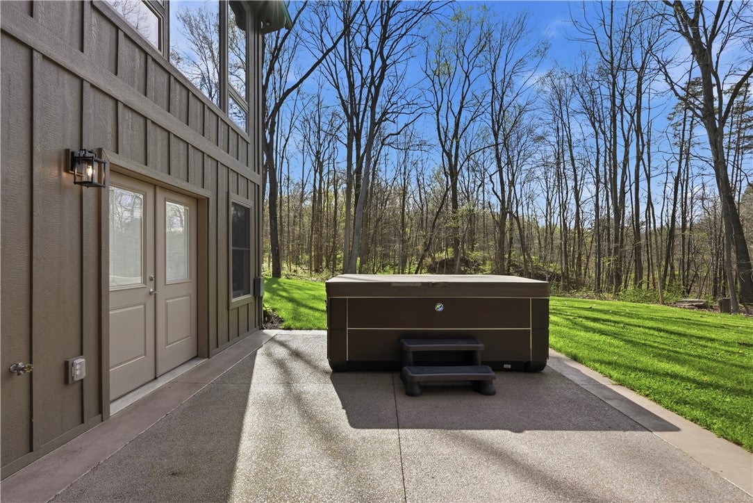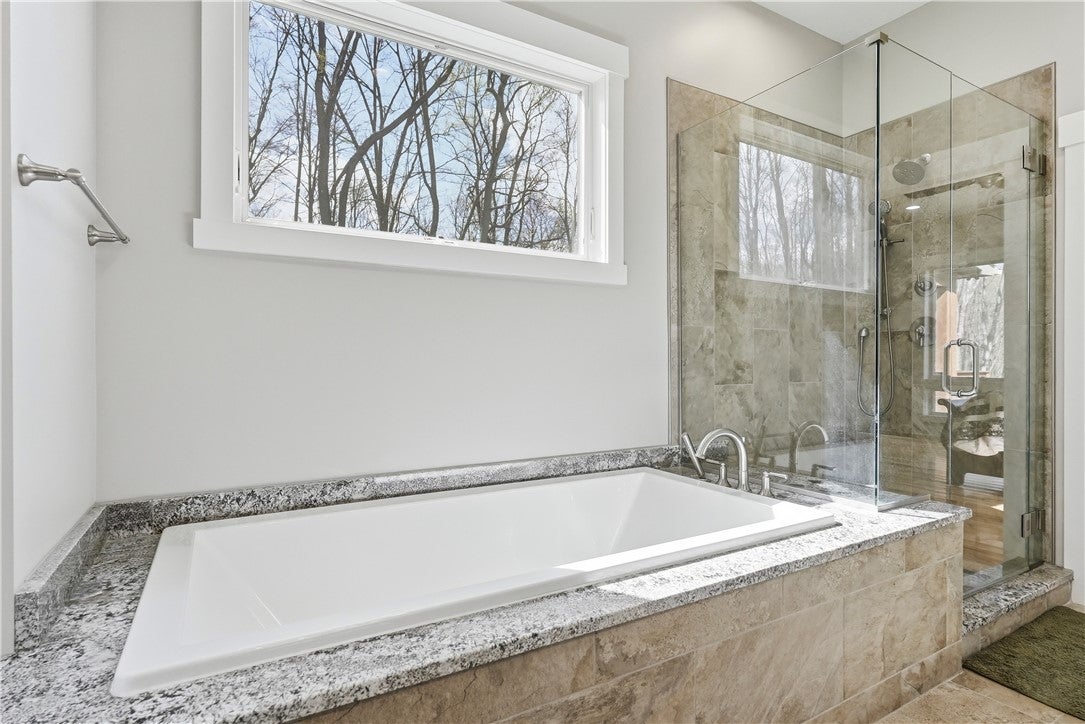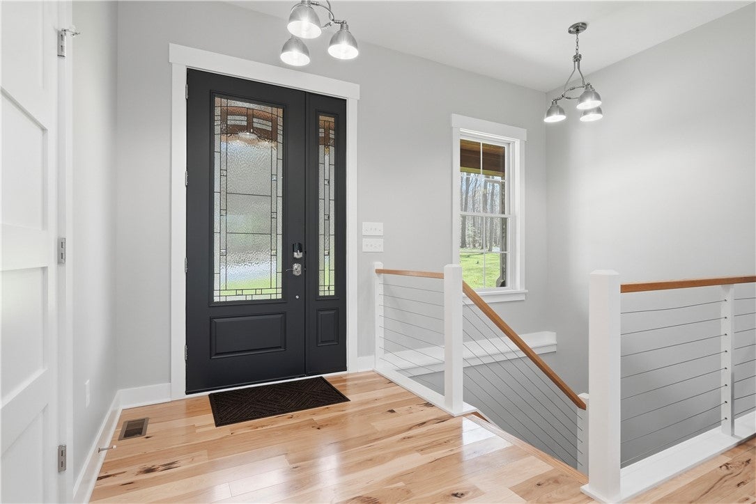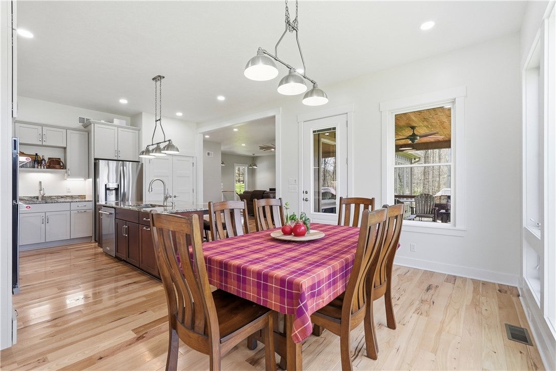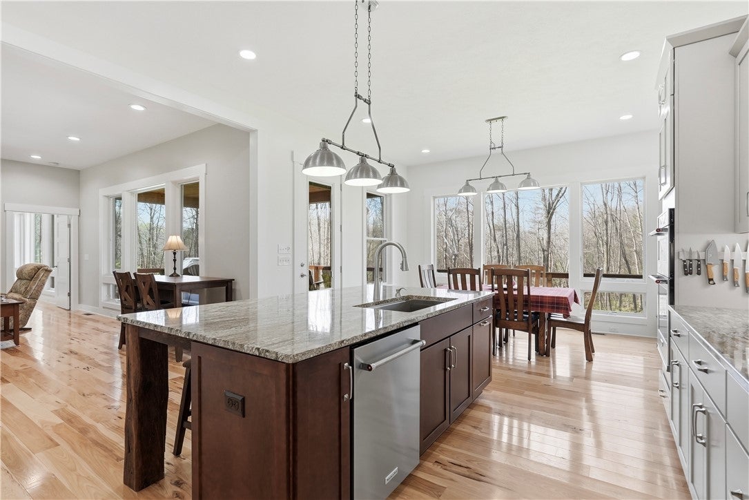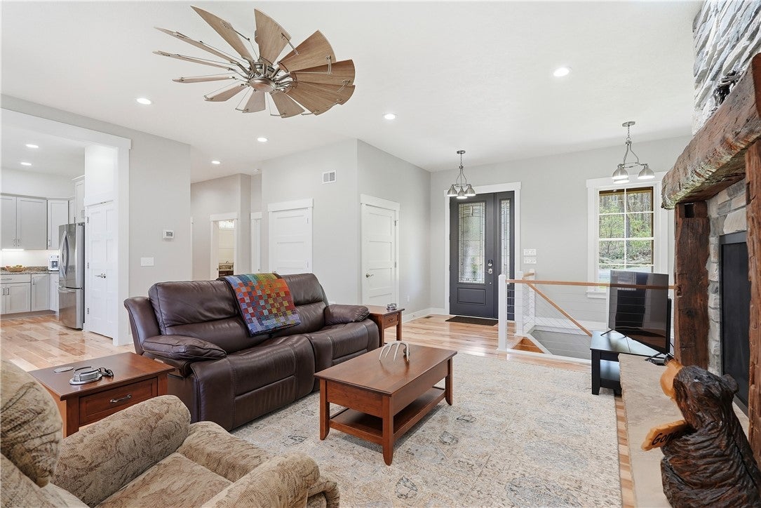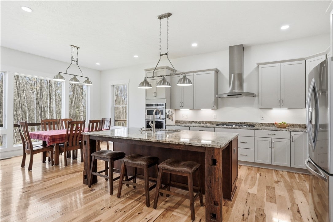 Rarely does a property offer this convergence of modern luxury and untouched natural beauty. Set on 14-plus private wooded acres beside McConnells Mill State Park, this meticulously maintained 2023 ranch home delivers the ultimate private retreat without sacrificing comfort or quality. Offering 2,309 finished square feet, three bedrooms, and three full bathrooms, every detail has been thoughtfully considered, from the beautifully grained hickory hardwood floors and stunning stone fireplace to the open-concept living spaces, western red cedar porches, and custom outdoor shower that together frame a lifestyle as breathtaking as the natural setting itself. Two creeks originate on the property, flowing into the park and feeding Breakneck Falls, a feature so rare it cannot be replicated. Inside, the spa-inspired primary suite, designer kitchen, and warm gathering spaces complete a home that is as beautiful as the land it sits on. This is not just a home, it is a lifestyle. Encompassing the spectacular Slippery Rock Creek Gorge, a National Natural Landmark formed by glacial lakes thousands of years ago, McConnells Mill State Park is celebrated for its dramatic rock formations, massive boulders, scenic overlooks, and waterfalls, all accessible from your own backyard.Entering via the covered front porch finished with western red cedar, the home opens to a stunning open-concept living room and eat-in kitchen anchored by a beautiful stone fireplace. Natural light pours over richly grained hickory hardwood floors and soft neutral gray walls, creating the perfect blank canvas. The primary suite enjoys a private corner with a spacious walk-in closet and a bath complete with an oversized shower and soaking tub. Designed for true single-floor living, the home features wide doorways for seamless flow. The second main-level bedroom offers ensuite access and a generous closet. The kitchen is built for gathering with a large island, stainless steel appliances, shaker cabinetry, and walk-out access to the oversized rear deck.Outdoor spaces are equally impressive. The expansive cedar-wrapped deck is partially covered for year-round enjoyment, complemented by a custom outdoor shower with sink. Fourteen-plus private acres offer trails and a seamless connection to the park, with two creeks originating on the property and flowing into Breakneck Falls. A lower patio with hot tub area enhances the outdoor experience. The finished basement includes a family room, an additional bedroom with ensuite access, and walk-out access to the patio. A 13x32 unfinished section, roughed in for plumbing, offers potential for an in-law suite, Airbnb, additional primary suite, or storage with double doors and walk-out access. An additional 22x19 area provides further flexibility. The attached 3-car garage accommodates large vehicles, includes a workbench, ample storage, and a private home office. A long, tree-lined driveway sets the tone for this secluded retreat, all just minutes from I-79 and 20 minutes to Cranberrys shopping and amenities. Have all the opportunity to live in basically new construction home, ready for your enjoyment!