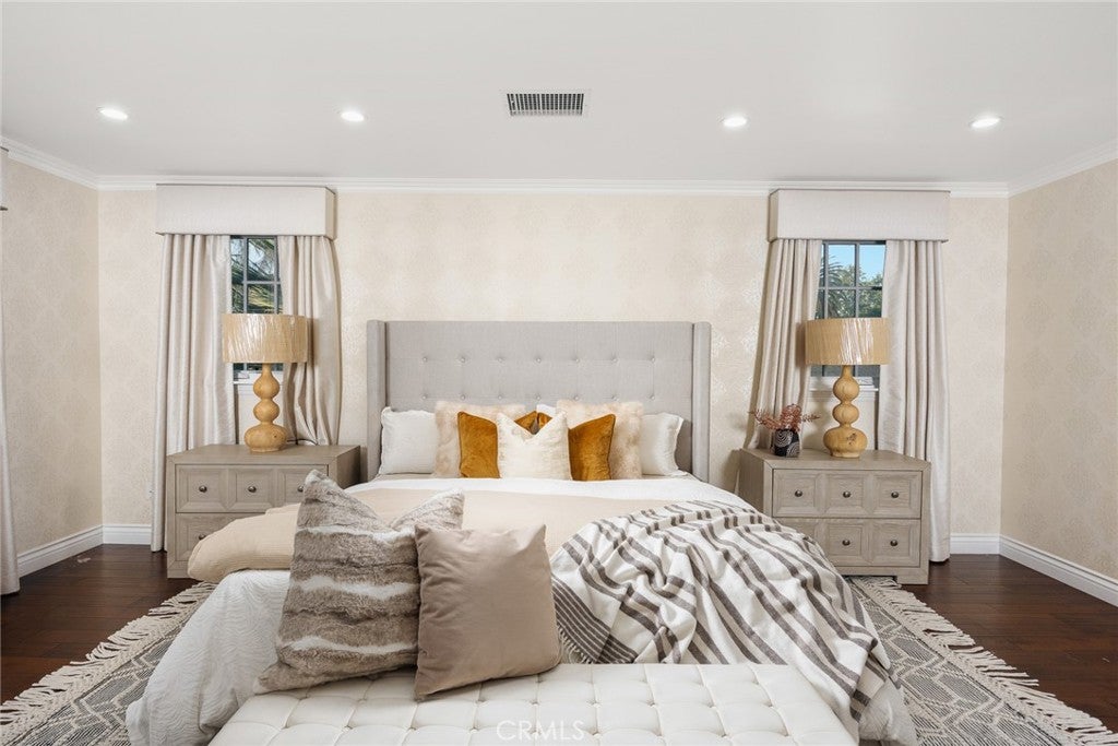Located within the highly sought-after Arcadia Unified School District, this exceptional custom estate offers 4 bedrooms and 5 bathrooms, with each bedroom designed as a private suite, complete with custom-built closets that enhance both comfort and functionality. The home showcases an elevated standard of craftsmanship throughout, highlighted by calcutta gold marble flooring at the entry, hardwood floors, designer wallpaper, and extensive custom wall paneling. Architectural detailing includes 5 piece molding recessed ceilings, pancake ceilings, and elegant lighting design with over 140 recessed LED fixtures. The gourmet kitchen is a centerpiece of the home, appointed with premium custom Drees cabinetry, Italian Calcutta Gold marble slabs, Viking Professional appliances, and Rohl fixturesdelivering both sophistication and performance. A separate WOK kitchen further enhances culinary versatility, featuring a powerful 1200 CFM hood and a 64,000 BTU wok cooker, ideal for authentic cooking experiences. The home also includes a cozy family room, a dedicated study for work or reading, and a luxurious primary suite with a spacious custom walk-in closet. The primary bathroom is designed as a spa-like retreat, offering a soaking bathtub, walk-in shower, and dual vanities. Additional highlights include a 120-bottle dual-zone wine refrigerator, pre-wiring for alarm, entertainment, and whole-home speaker systems, ensuring modern convenience and seamless living. The beautifully designed backyard features a pool and spa, along with a spacious patio ideal for entertaining or relaxing in a private outdoor setting. Combining timeless materials, exceptional craftsmanship, and a convenient location, this residence delivers an outstanding lifestyle opportunity in Arcadia.