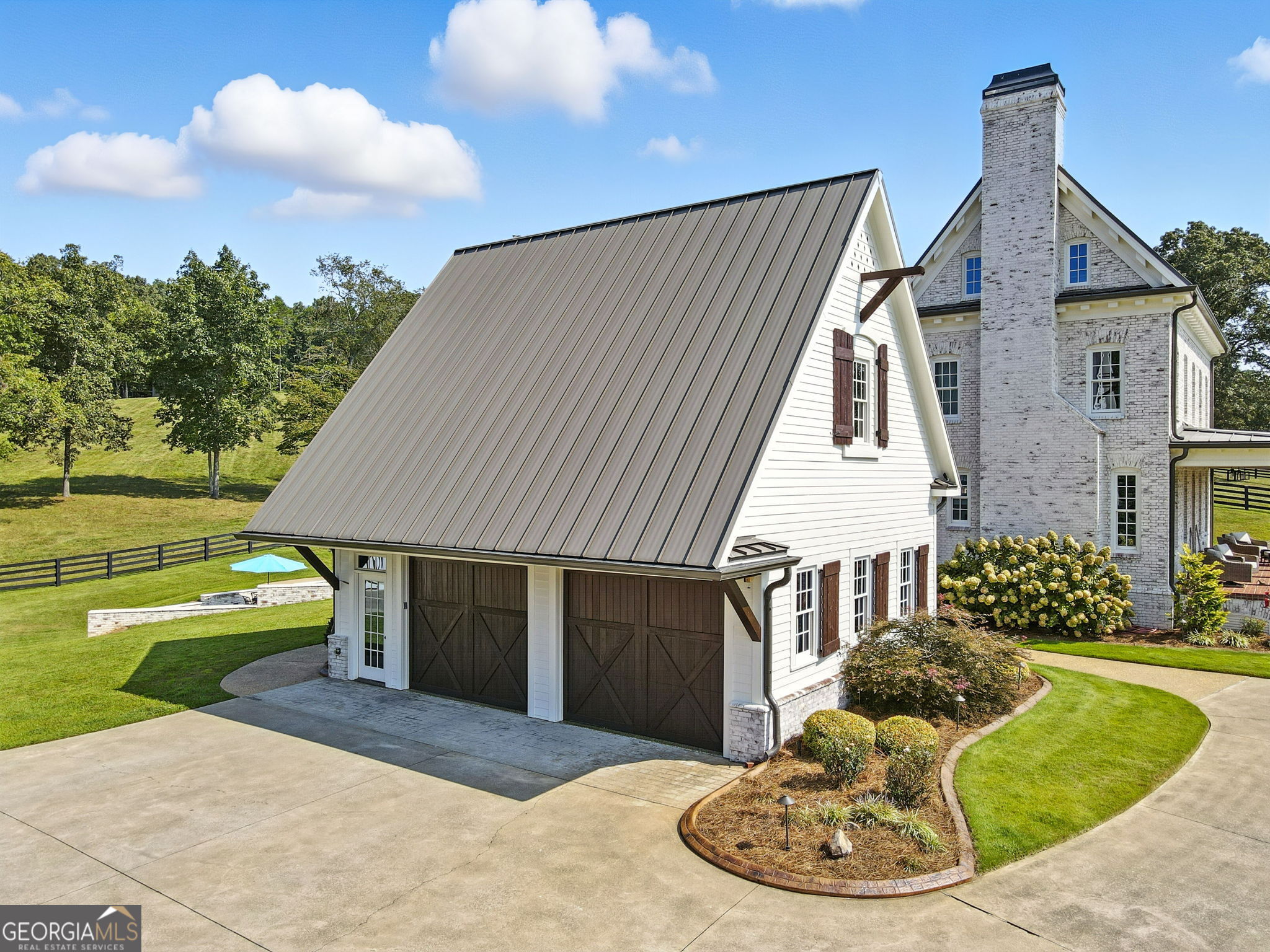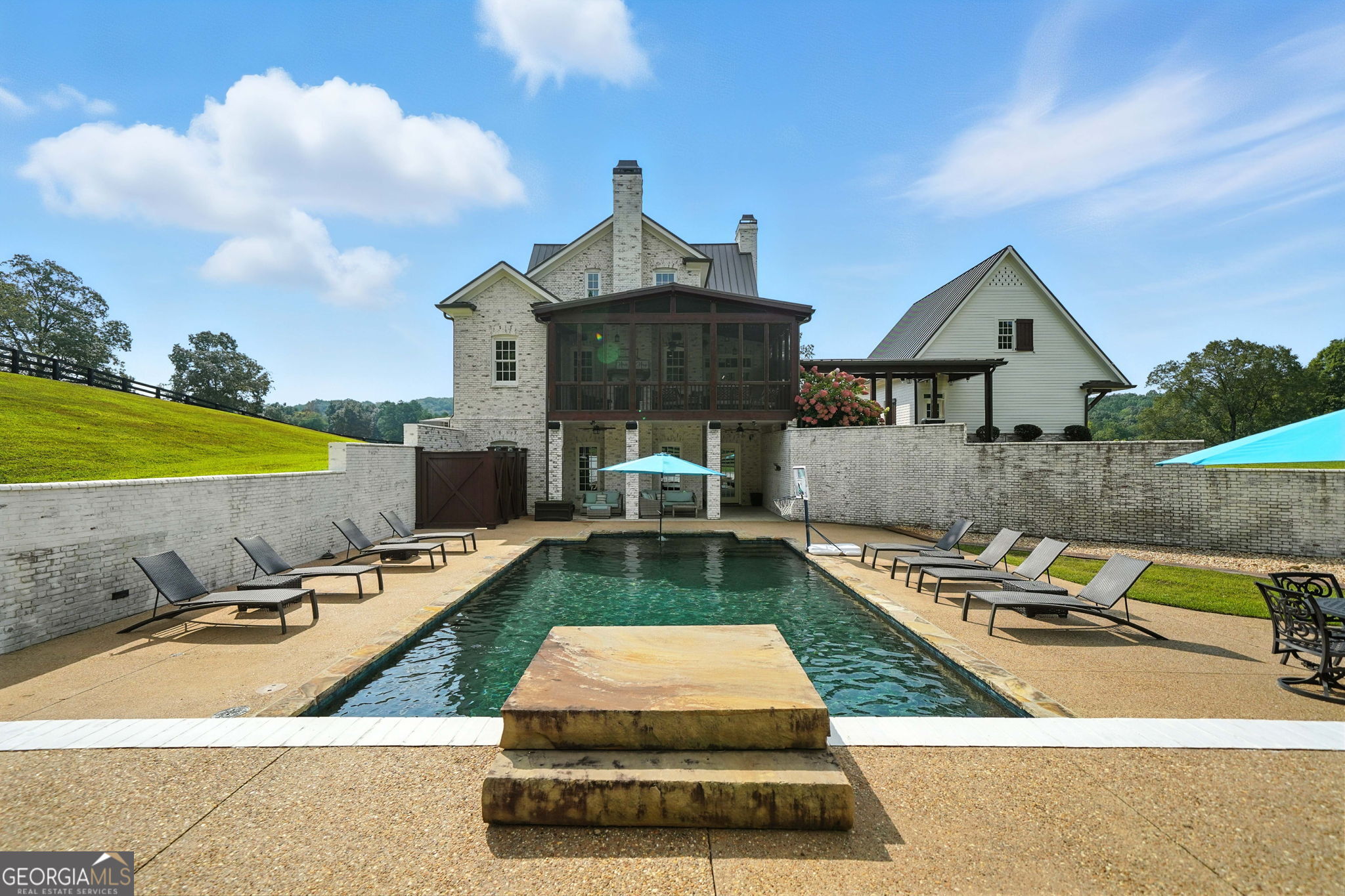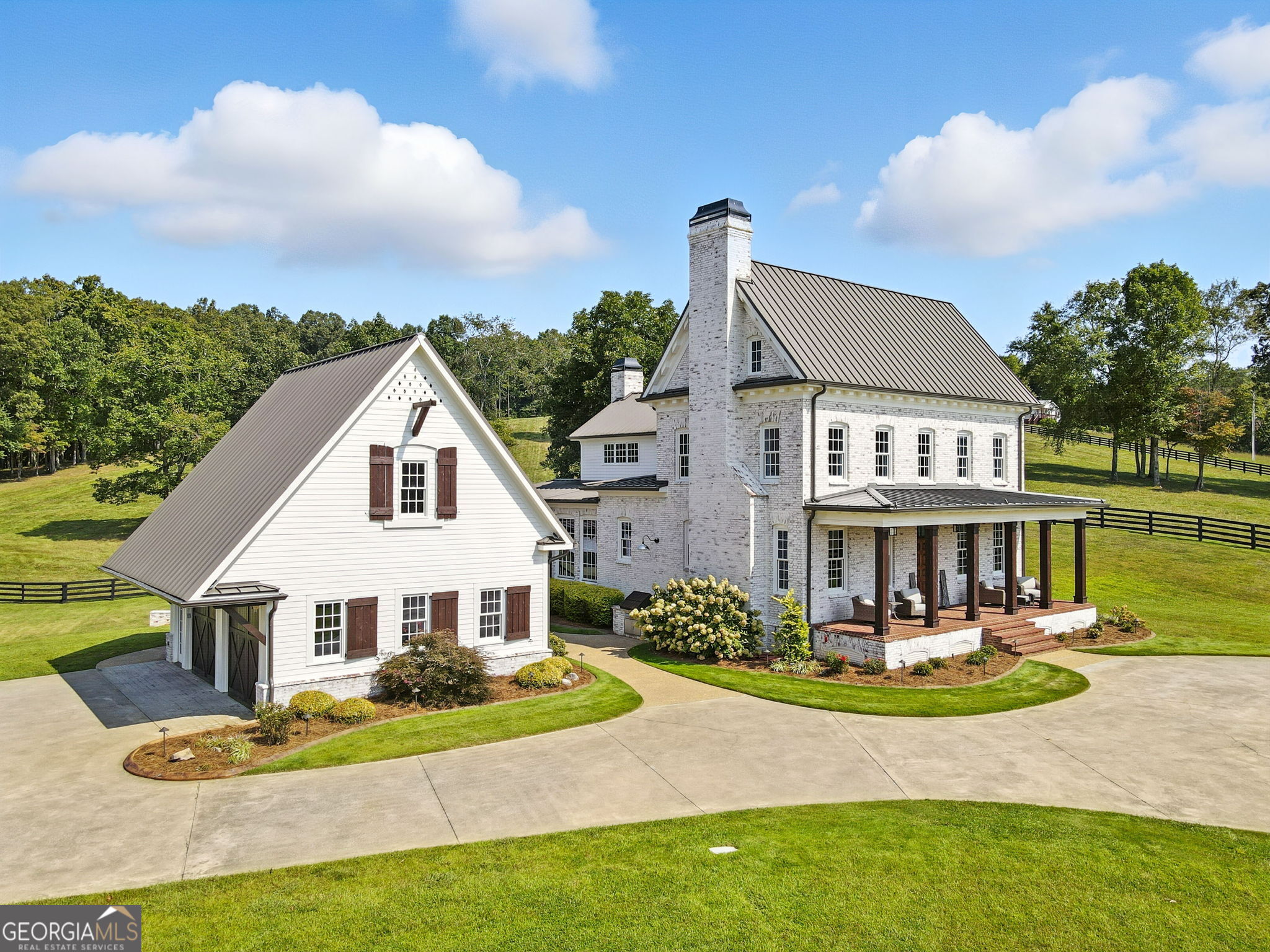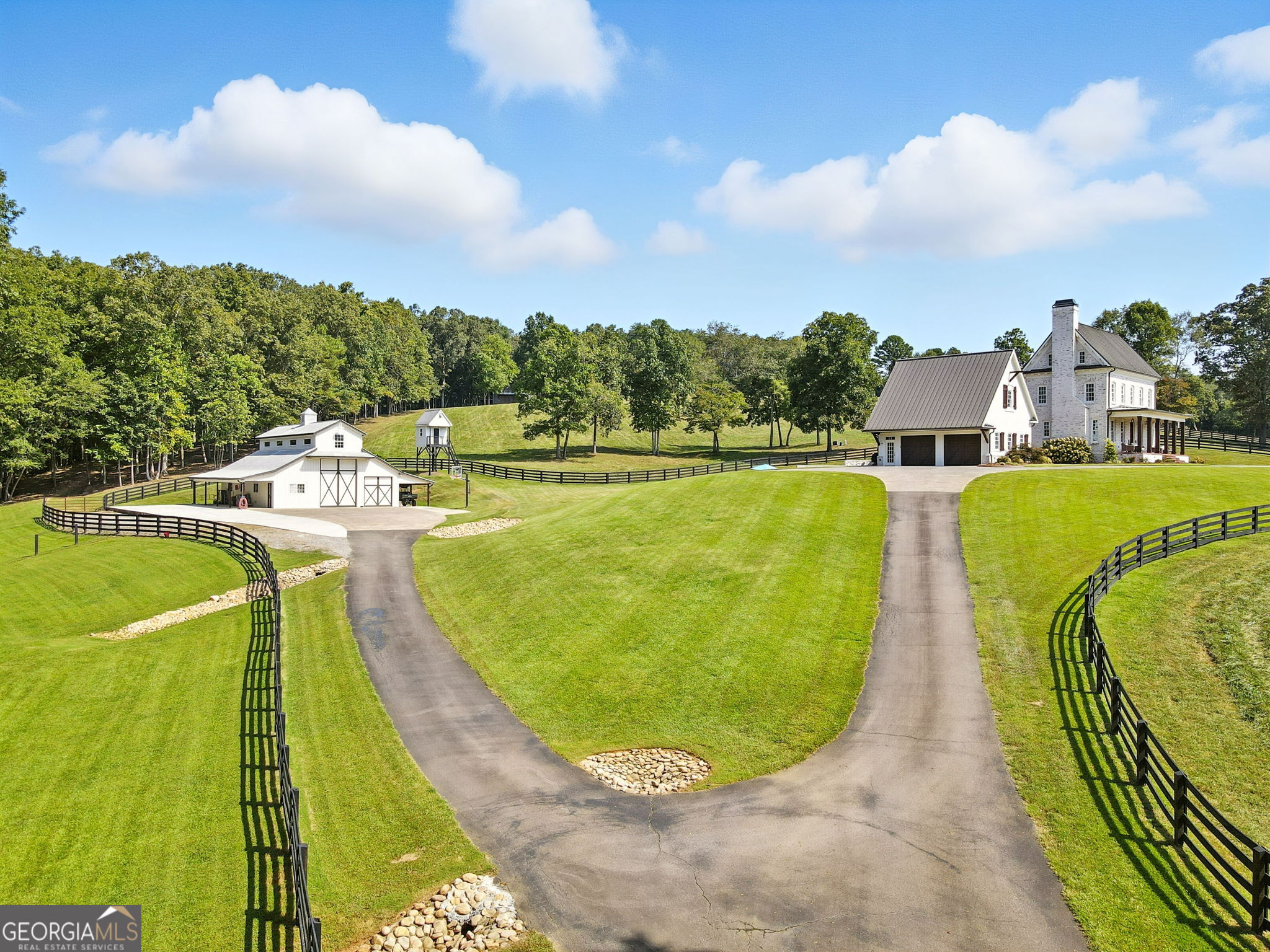 Prepare to be captivated by this extraordinary 18 acre estate, a timeless Colonial Williamsburg-inspired property in sought-after Cherokee County. Back on the market as the sellers have solidified their relocation plans, this is a renewed opportunity for the next owner to enjoy a home that has been thoughtfully cared for over the years.Fully fenced and gated, the property offers exceptional versatility with room for equestrian use, hobby farming, recreation, or a private retreat with panoramic hilltop views. Two barns, subdivided pastures, and a PebbleTec pool enhance the grounds, while rolling hills and a creek-lined rear border create a serene setting. A cedar front porch captures long-range views, and a detached garage with breezeway and loft provides flexible space for guests, a studio, or storage. A circular drive completes the setting.The 6,500 square foot residence blends refined craftsmanship with updated style. Freshly painted, it features 5 bedrooms, 5 full baths, and 1 half bath. Brazilian cherry floors span the main level. The formal dining room includes a fireplace, built-ins, and detailed millwork. The kitchen offers marble countertops, a large island with prep sink, farmhouse sink, custom cabinetry, and a butlers pantry, opening to a screened porch overlooking the pool and pastures.The main-level family room features a fireplace with built-ins and beadboard ceiling. The primary suite includes crown molding, dual-entry custom closet, and a marble bath with soaking tub, separate shower, and double vanity. A main-level laundry room adds convenience.Upstairs, a loft landing with built-ins and study nook leads to three ensuite bedrooms, including one with a clawfoot tub, plus a second laundry room. The third floor offers two flexible loft spaces for guests, office, or recreation.The terrace level includes a third fireplace, gym area, fifth bedroom suite, full bath, laundry closet, and ample storage. Outdoor living features a screened porch with fireplace overlooking the PebbleTec pool with ozone purification, fountain, and waterfall, along with covered patio space and under-deck system.The main barn includes a loft apartment with bedroom, full bath, kitchenette, separate utilities, and Wi-Fiideal for guests or extended living. Below are three oversized garage bays suitable for RVs or large vehicles, plus workshop space. Additional features include fenced pastures, a fitness area, irrigation, and a second barn originally designed for 5 stalls with tack room.An air-conditioned playhouse with electricity adds charm and flexibility. This rare property offers a unique combination of acreage, functionality, and refined livingready for its next chapter.