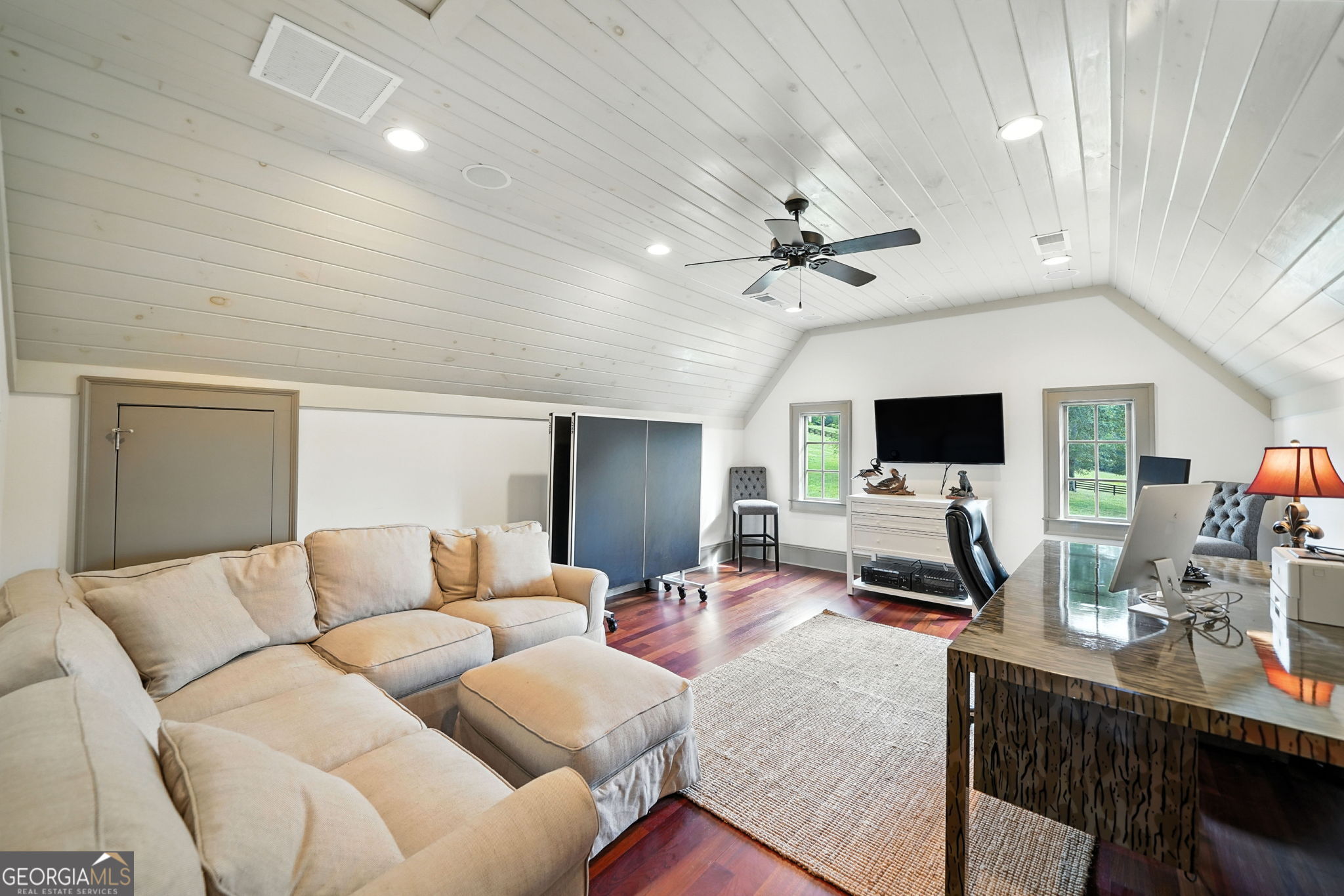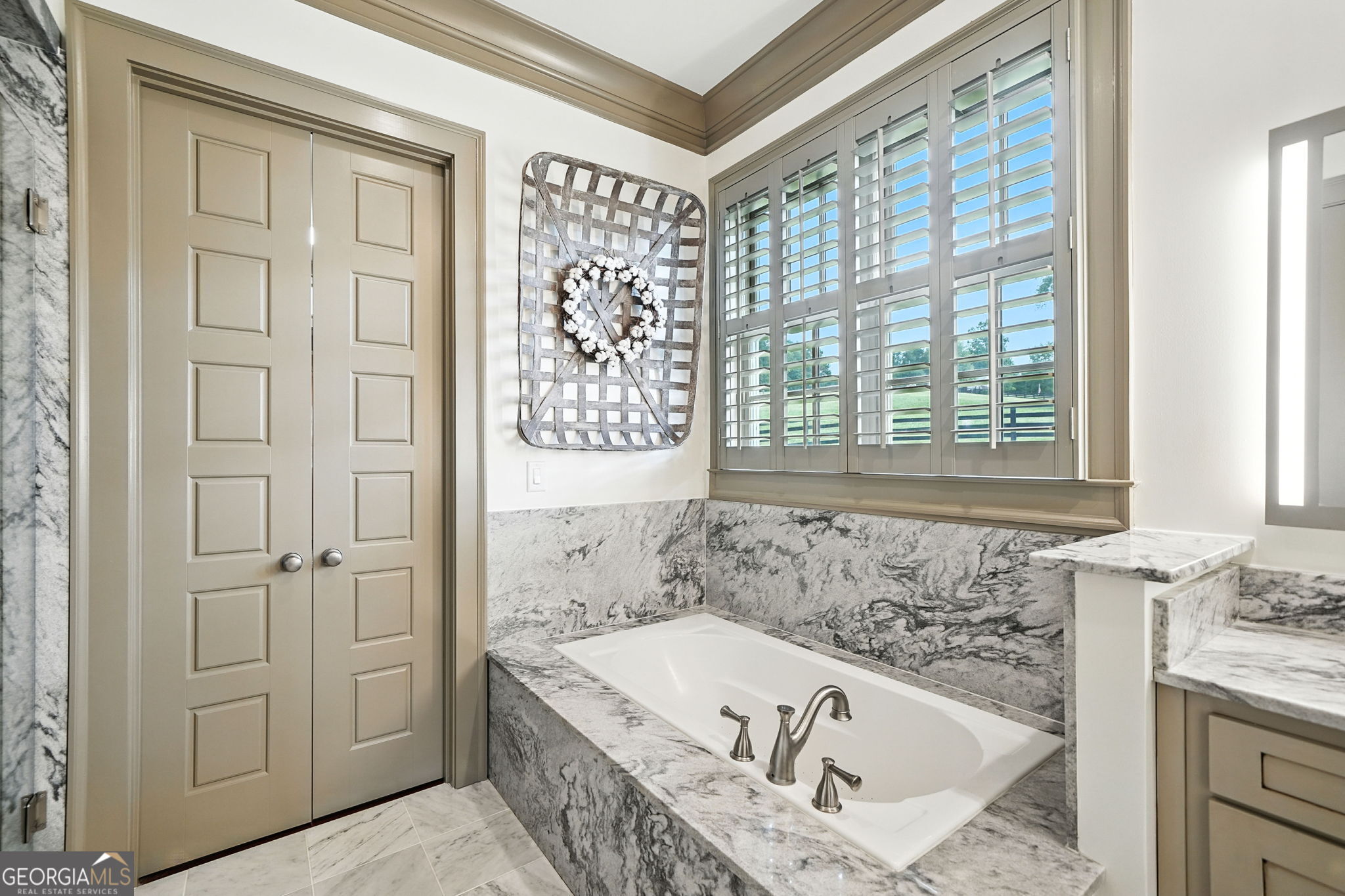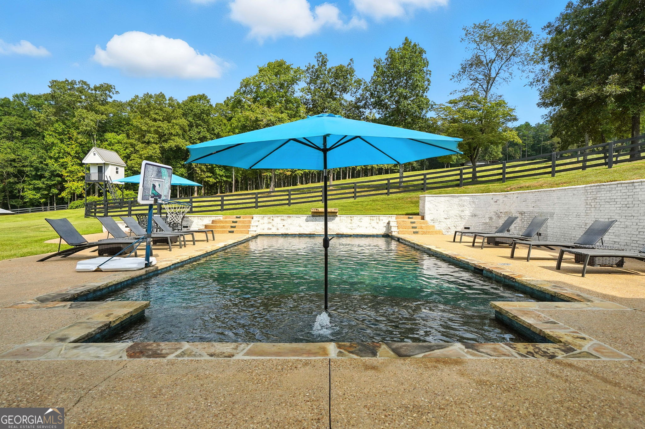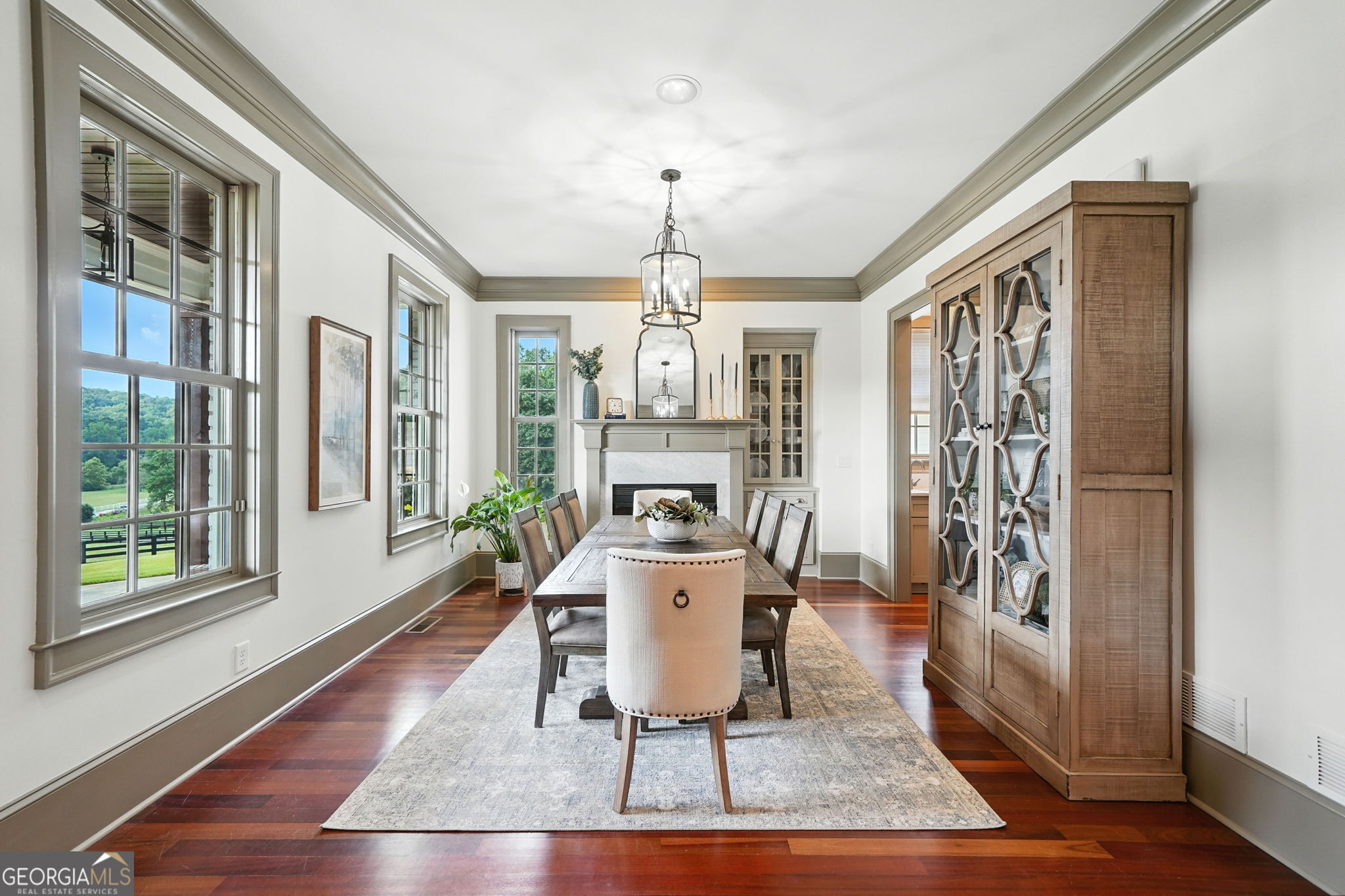 Prepare to be captivated by this extraordinary 18 acre estate, a timeless Colonial Williamsburg-inspired property in sought-after Cherokee County. Back on the market as the sellers have solidified their relocation plans, this is a renewed opportunity for the next owner to enjoy a home that has been thoughtfully cared for over the years.Fully fenced and gated, the property offers exceptional versatility with room for equestrian use, hobby farming, recreation, or a private retreat with panoramic hilltop views. Two barns, subdivided pastures, and a PebbleTec pool enhance the grounds, while rolling hills and a creek-lined rear border create a serene setting. A cedar front porch captures long-range views, and a detached garage with breezeway and loft provides flexible space for guests, a studio, or storage. A circular drive completes the setting.The 6,500 square foot residence blends refined craftsmanship with updated style. Freshly painted, it features 5 bedrooms, 5 full baths, and 1 half bath. Brazilian cherry floors span the main level. The formal dining room includes a fireplace, built-ins, and detailed millwork. The kitchen offers marble countertops, a large island with prep sink, farmhouse sink, custom cabinetry, and a butlers pantry, opening to a screened porch overlooking the pool and pastures.The main-level family room features a fireplace with built-ins and beadboard ceiling. The primary suite includes crown molding, dual-entry custom closet, and a marble bath with soaking tub, separate shower, and double vanity. A main-level laundry room adds convenience.Upstairs, a loft landing with built-ins and study nook leads to three ensuite bedrooms, including one with a clawfoot tub, plus a second laundry room. The third floor offers two flexible loft spaces for guests, office, or recreation.The terrace level includes a third fireplace, gym area, fifth bedroom suite, full bath, laundry closet, and ample storage. Outdoor living features a screened porch with fireplace overlooking the PebbleTec pool with ozone purification, fountain, and waterfall, along with covered patio space and under-deck system.The main barn includes a loft apartment with bedroom, full bath, kitchenette, separate utilities, and Wi-Fiideal for guests or extended living. Below are three oversized garage bays suitable for RVs or large vehicles, plus workshop space. Additional features include fenced pastures, a fitness area, irrigation, and a second barn originally designed for 5 stalls with tack room.An air-conditioned playhouse with electricity adds charm and flexibility. This rare property offers a unique combination of acreage, functionality, and refined livingready for its next chapter.