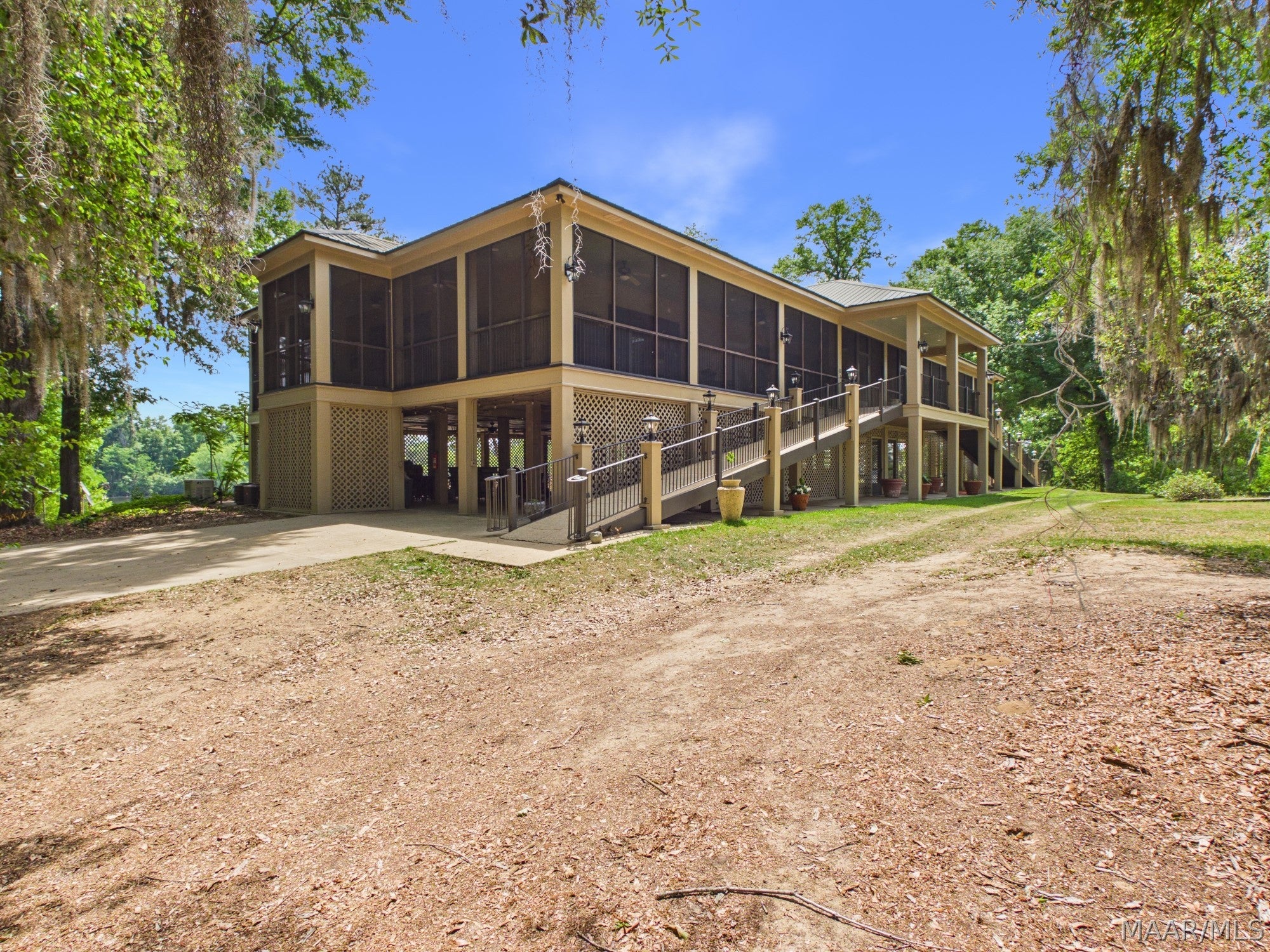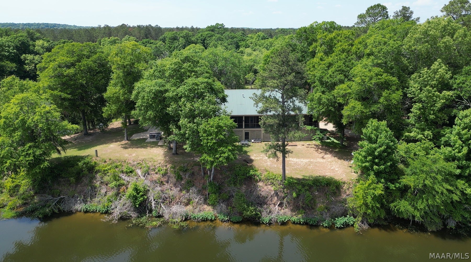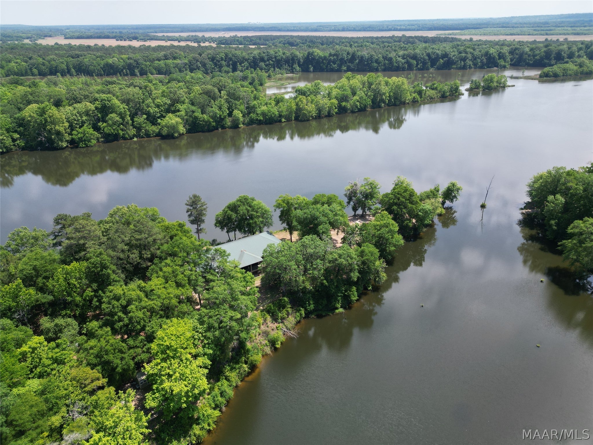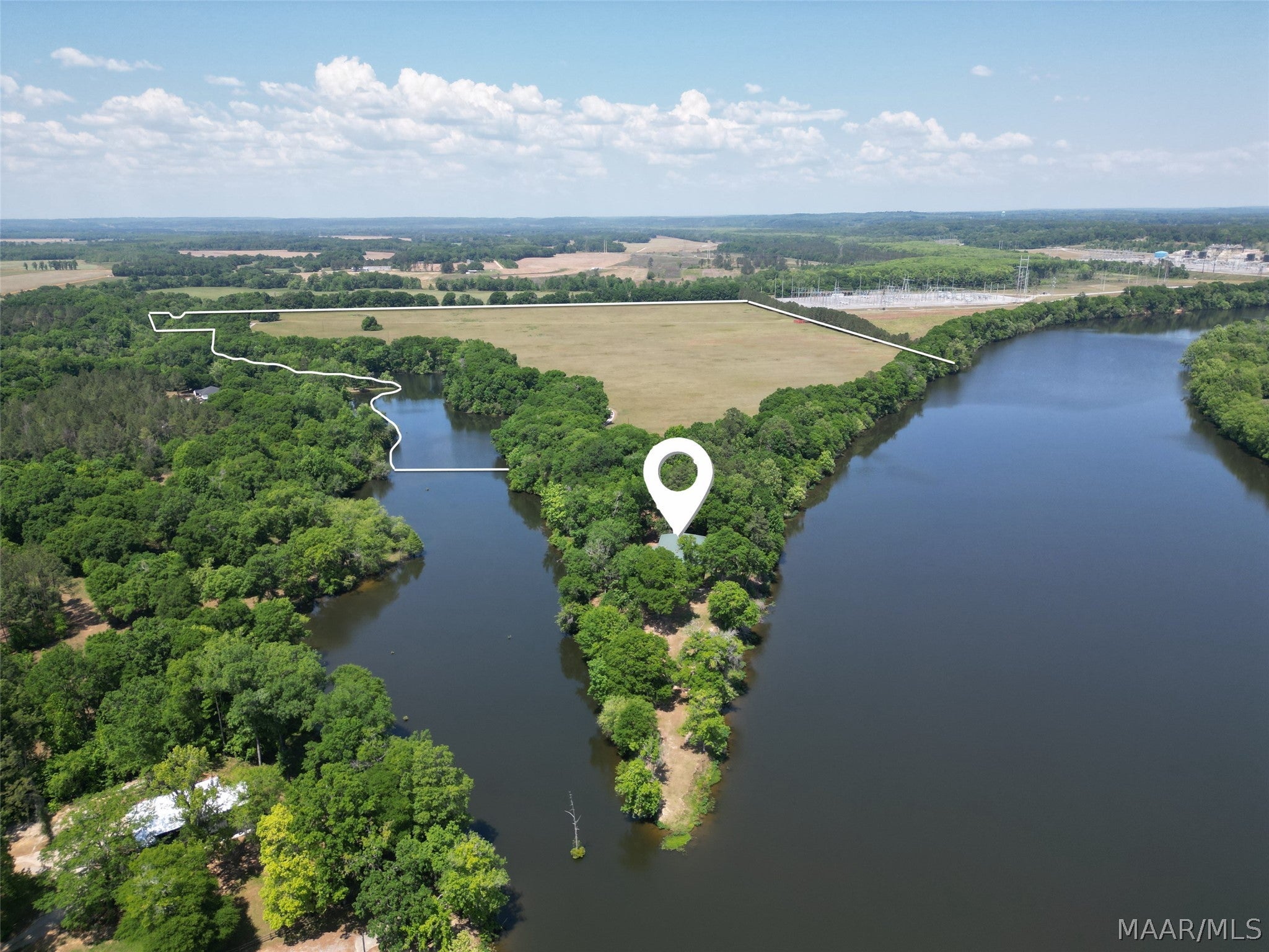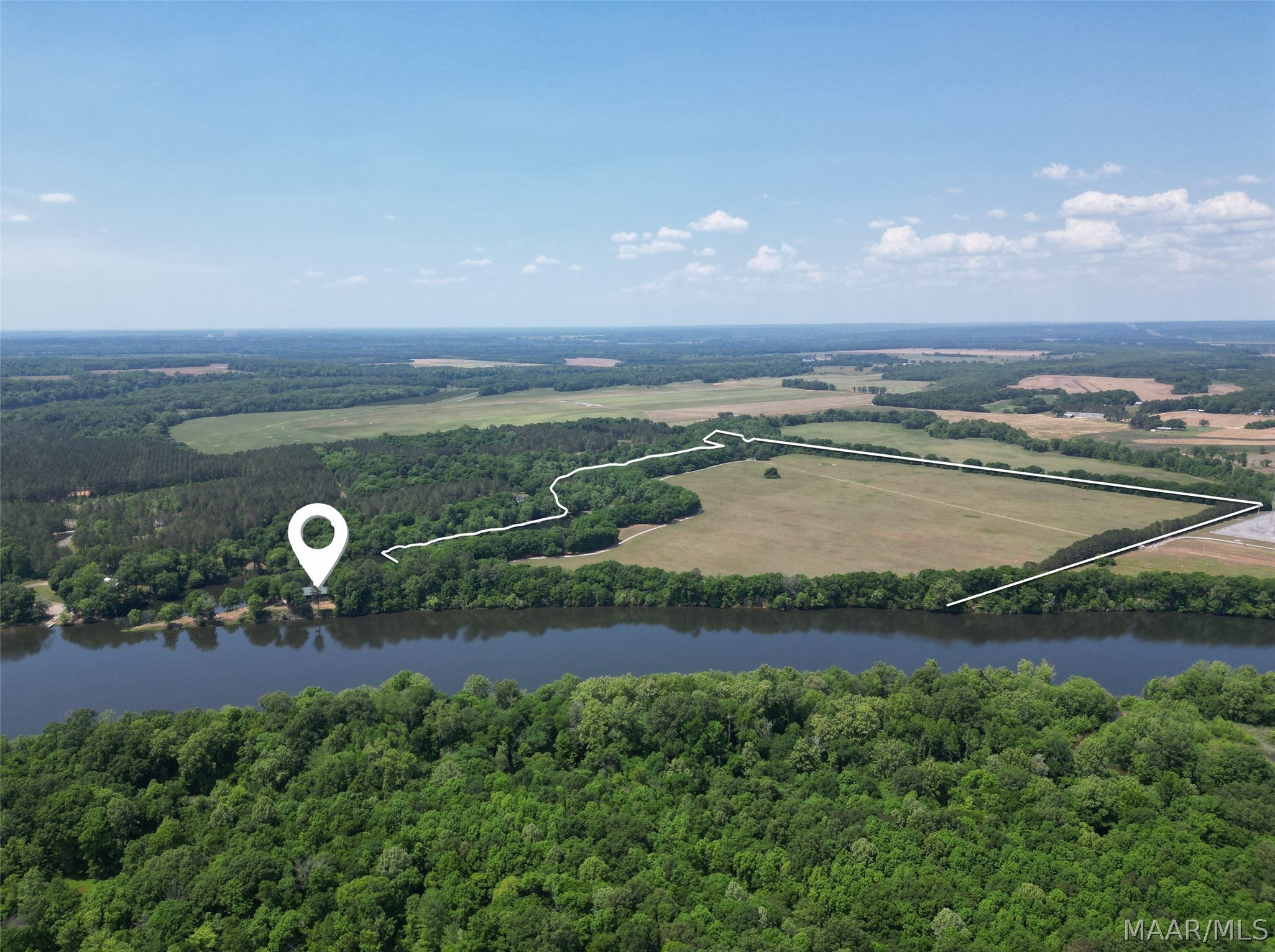 This extraordinary riverfront estate offers a rare opportunity to own over 133 acres at the confluence of Bear Creek and the Alabama River in southern Autauga County. With more than 5,000 feet of water frontage and a private drive stretching over three-quarters of a mile along the wooded shoreline, the property combines breathtaking natural beauty with exceptional privacy and versatility. Expansive hay fields, and panoramic water views create a truly one-of-a-kind setting. Elevated on piers, the nearly 3,000 square foot custom home features drive-thru covered parking below with ample space for multiple vehicles, storage, or use as an entertainment area, along with elevator access to the main living level. Inside, elegant open living spaces are anchored by a grand fireplace and hearth, while abundant windows frame stunning views of the surrounding landscape. The kitchen features granite countertops and professional-grade appliances including a six-burner gas range with griddle and vent hood, four ovens, electric cooktop with built-in vent, warming drawer, and moreperfect for serving large gatherings. Just off the kitchen sits the dining room with custom built-ins and views up and down the river. The home offers two spacious bedrooms, each with vaulted shiplap ceilings, French door access to the veranda, walk-in closets, and private en suite bathrooms. The covered wrap-around and screened veranda serves as a spectacular gathering space, offering unmatched views of the water and ample room for entertaining. Beyond the home, the property features the renowned River Pointe Venue, an exceptional outdoor event space ideal for special celebrations. Amenities include a riverside patio, cooking station, firepit, and a private boat ramp. With its unparalleled water frontage, event-ready amenities, and stunning natural surroundings, this remarkable estate offers limitless possibilities as a private retreat, recreational property, working farm, or income-producing venue.