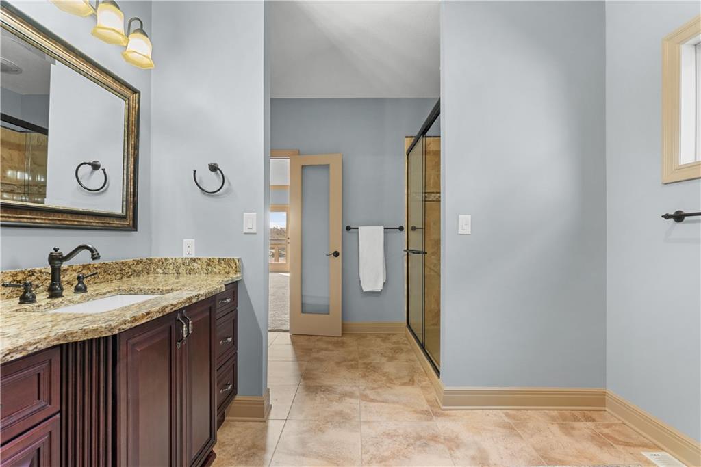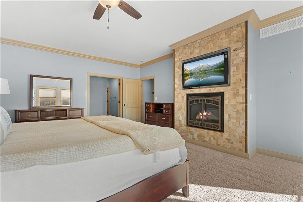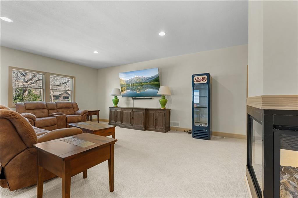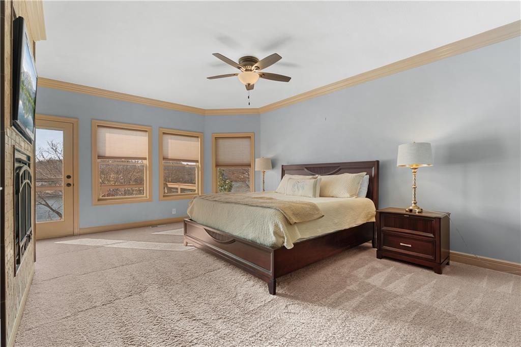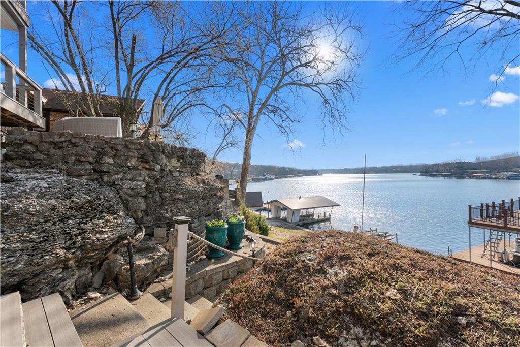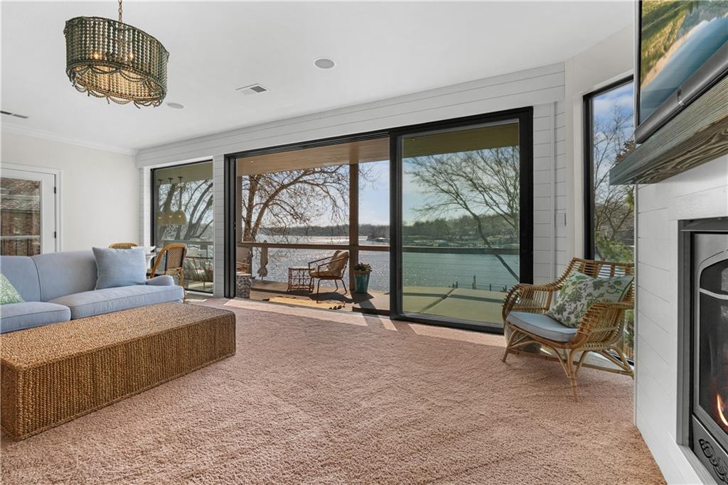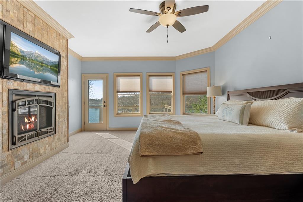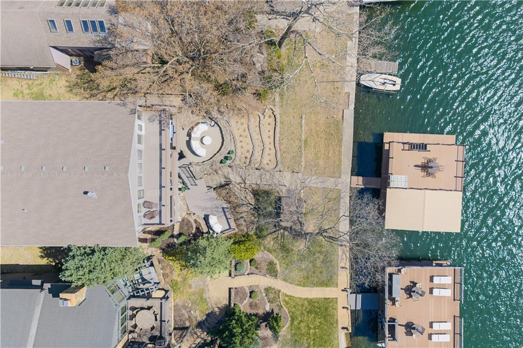 Experience exceptional lakefront living in this stunning main-channel home offering deep water and breathtaking views. Perfectly positioned with a double-well dock and boat lift and sun deck, this property is designed for both relaxation and recreation. The beautifully landscaped grounds lead to a thoughtfully designed home featuring a spacious 4-car garage and high-end finishes throughout. Inside, the gourmet kitchen boasts a walk-in pantry and flows seamlessly into a formal dining room and an impressive great room with a fireplace. The true showstopper is the wall of moving glass wall, creating a completely unobstructed opening that blends indoor and outdoor living while showcasing the lake beyond. Step outside to a lakeside Trex deck spanning the length of the home, complete with a sunken hot tub, or unwind in the enclosed screened-in patio. The luxurious primary suite offers its own fireplace, private balcony with panoramic lake views, and a spa-like bath with separate vanities and a spacious closet. Two additional lakeside bedrooms provide incredible views and access to a screened-in deck, while a generously sized fourth bedroom above the garage offers added privacy. Designed for entertaining, the expansive family room that is ideal as a man cave or bunk roomfeatures another fireplace, making it the perfect gathering space for family and guests. This is lake living at its finest.