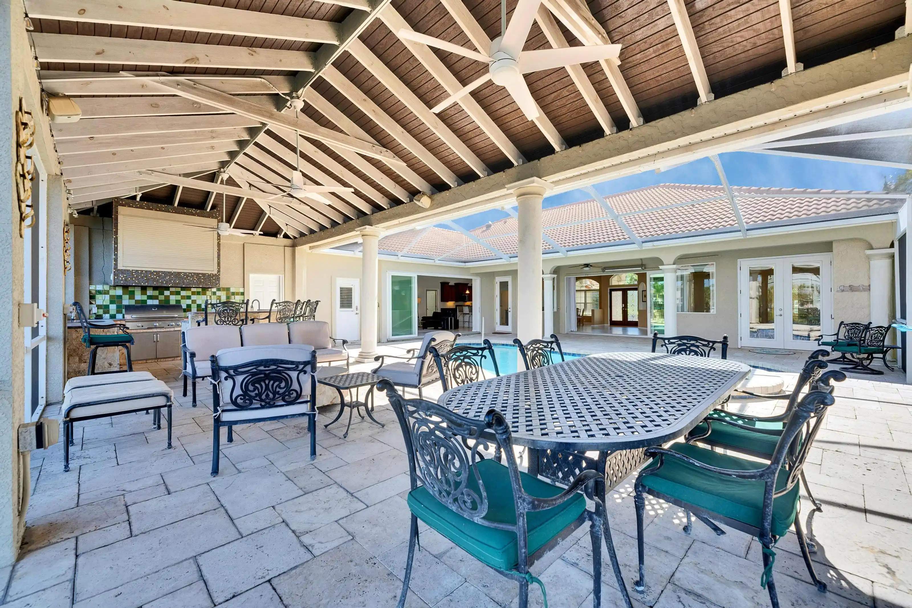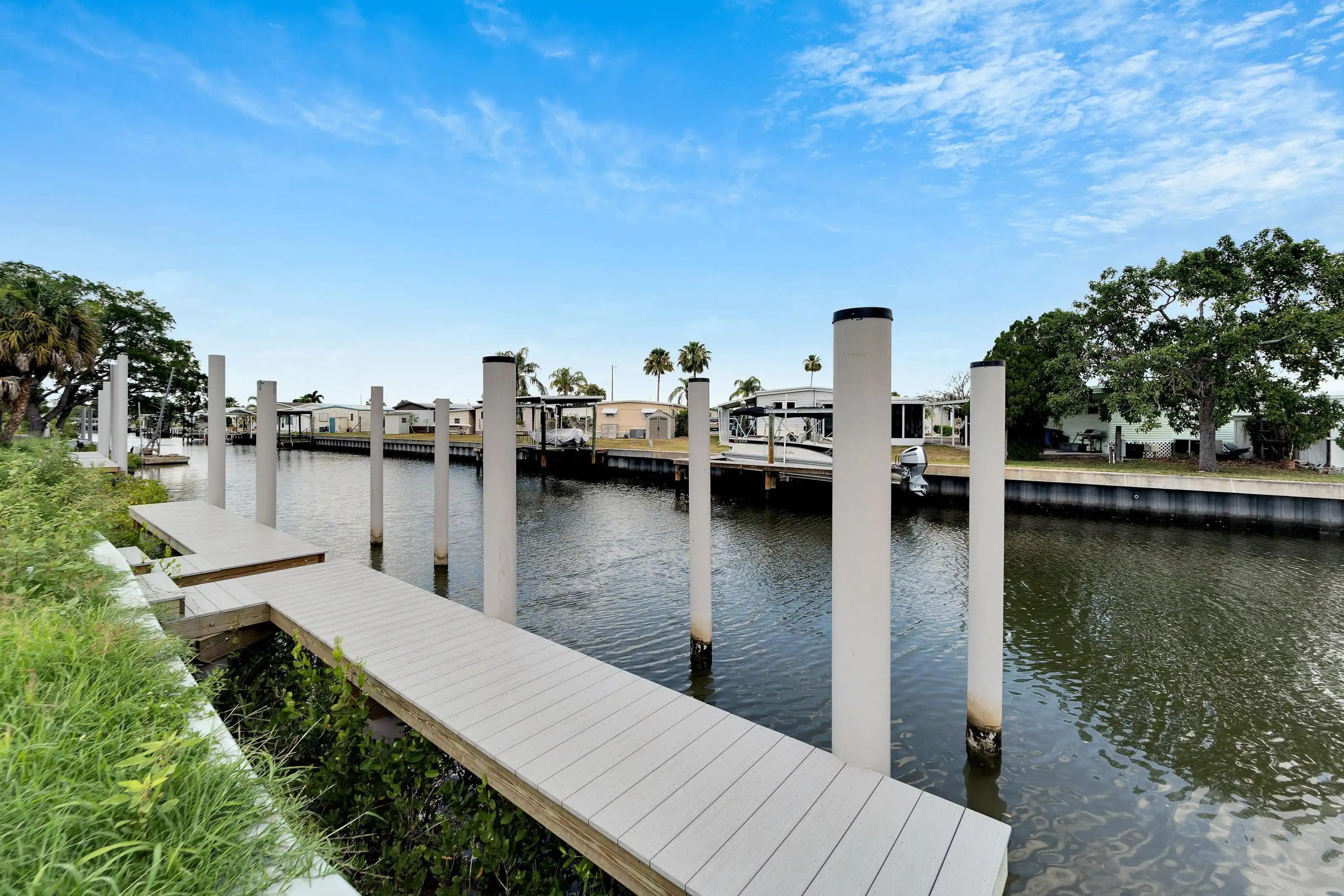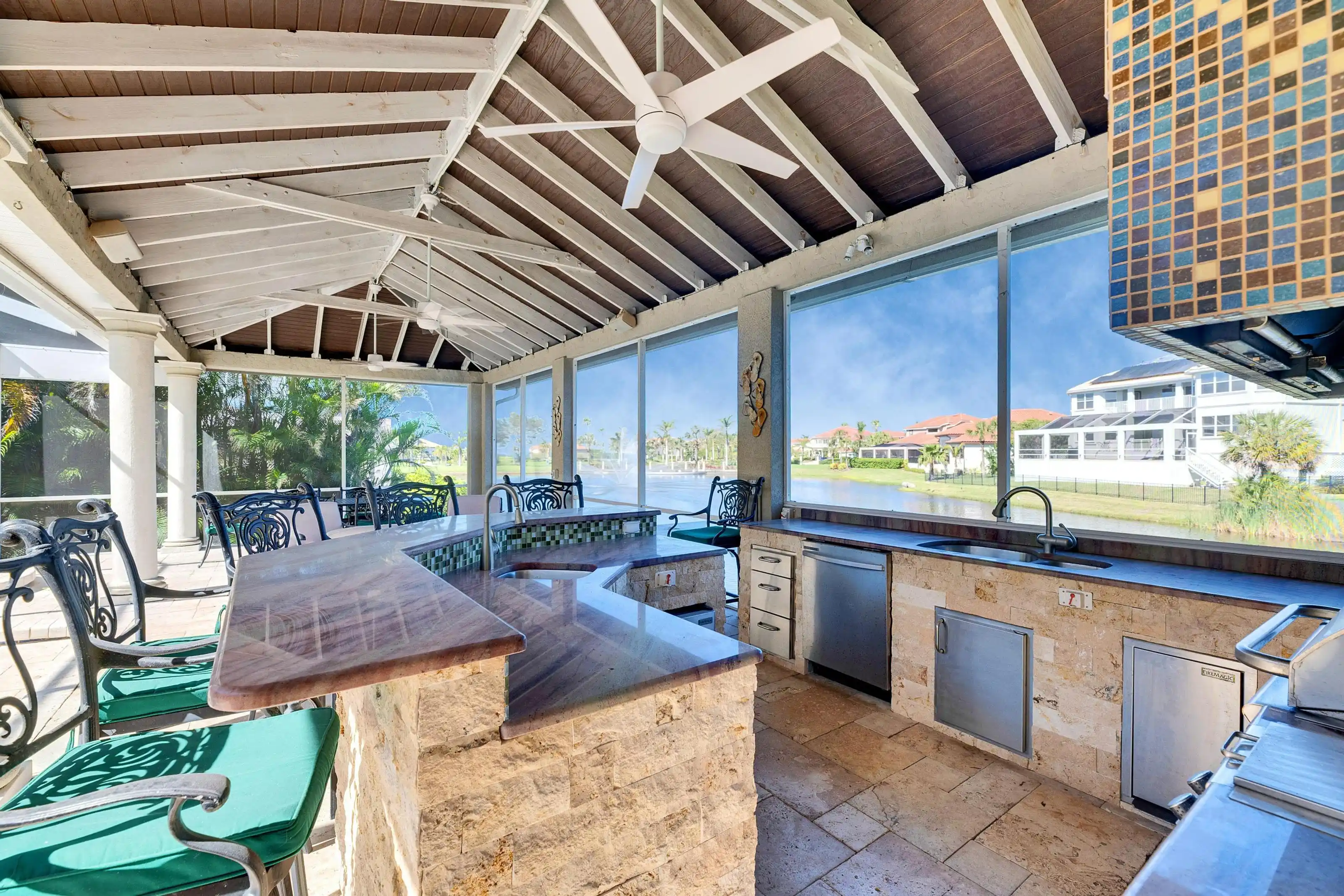 1335 Jumana Loop | Apollo Beach, FL 4 Beds | 3 Baths | Den | 3-Car Garage | Pool & Spa | Private Dock Slip (A8) Located in the staffed and gated waterfront community of Andalucia, this four-bedroom, three-bathroom home with a den and a three-car garage offers deep water access and a rare marina opportunity. The property includes assigned Dock Slip A8 at the Andalucia Yacht Club—an endcap slip that accommodates up to a yacht-sized vessel, with deep-water access and a jet ski lift available for purchase. The centerpiece of the home is a sprawling outdoor courtyard overlooking Alhambra Lake, featuring over 600 sq ft of covered space—one of the largest in the community. The screened lanai, installed in 2021 with no-see-um mesh, encloses a private heated saltwater pool and spa, perfect for entertaining or relaxing. The outdoor kitchen is fully equipped with a gas grill, refrigerator, dishwasher, ice maker, microwave, wet bar, and a stow-away TV. A fire pit, water feature, and covered lounge area complete the space. Inside, the open kitchen features gas appliances, granite counters, a decorative tile backsplash, cherry wood cabinetry with deep drawers, and stainless steel appliances. A breakfast nook and bar seating provide flexible dining options. The family room includes a fireplace and triple pocket hurricane-impact sliding glass doors that open fully to the lanai. The formal dining room is filled with natural light and overlooks the landscaped front yard. A dedicated office/den includes built-in cabinetry and workspace. The primary suite has hardwood floors, large pond-view windows, and impact doors to the lanai. The ensuite bath includes dual vanities, a soaking tub, and a walk-in shower. All three additional bedrooms have hardwood floors and custom closets. The second bathroom features granite counters and a tub-shower combo, while the third full bath offers lanai access with a walk-in shower and pedestal sink. Additional features include: Hurricane-rated windows and doors Generator with transfer panel (2018) Buried propane tank & gas appliances HVAC system replaced in 2021 Tile roof replaced in 2013 Updated pool equipment (2022) with remote control and new platform R-46 insulation, spa heater (2019), and heat pump water heater Andalucia amenities include a waterfront clubhouse, clay tennis courts, community pool, playground, private marina, and a pier with sunset views over Tampa Bay. This home is move-in ready and provides the ultimate Florida waterfront lifestyle with direct bay access and the rare bonus of a yacht-capable marina slip. Schedule your private showing today.