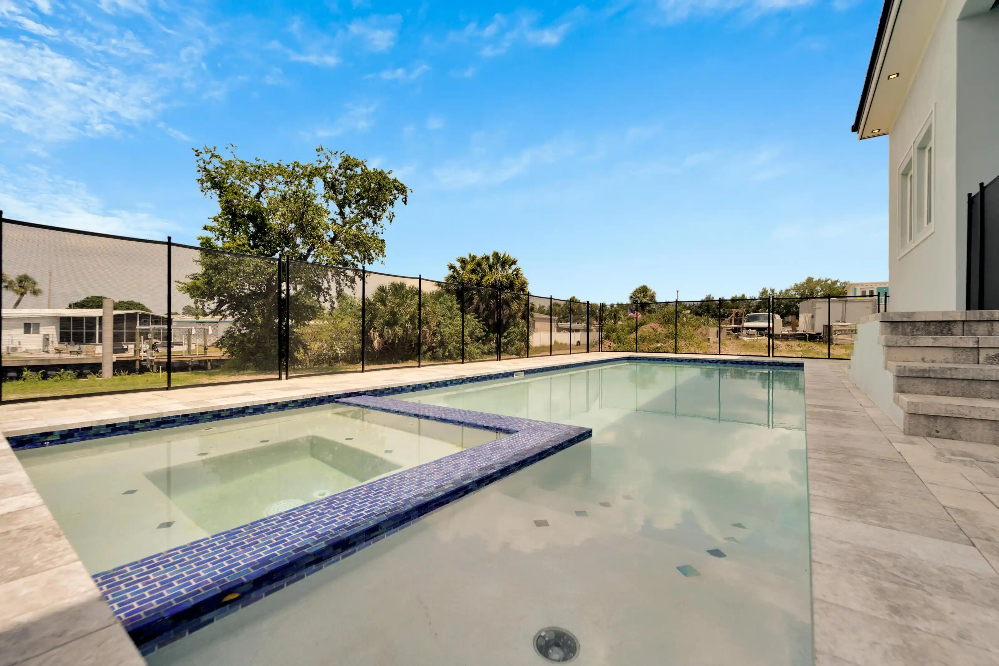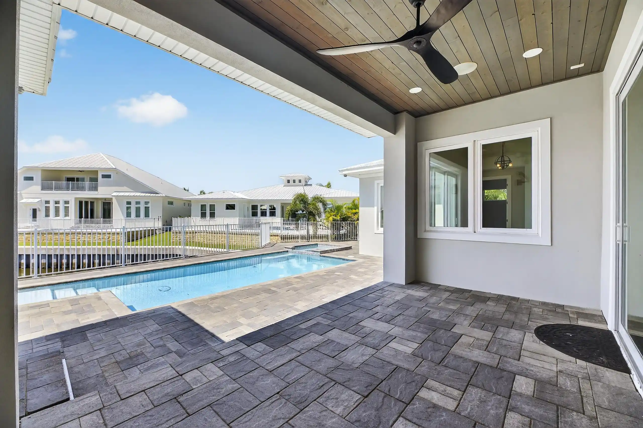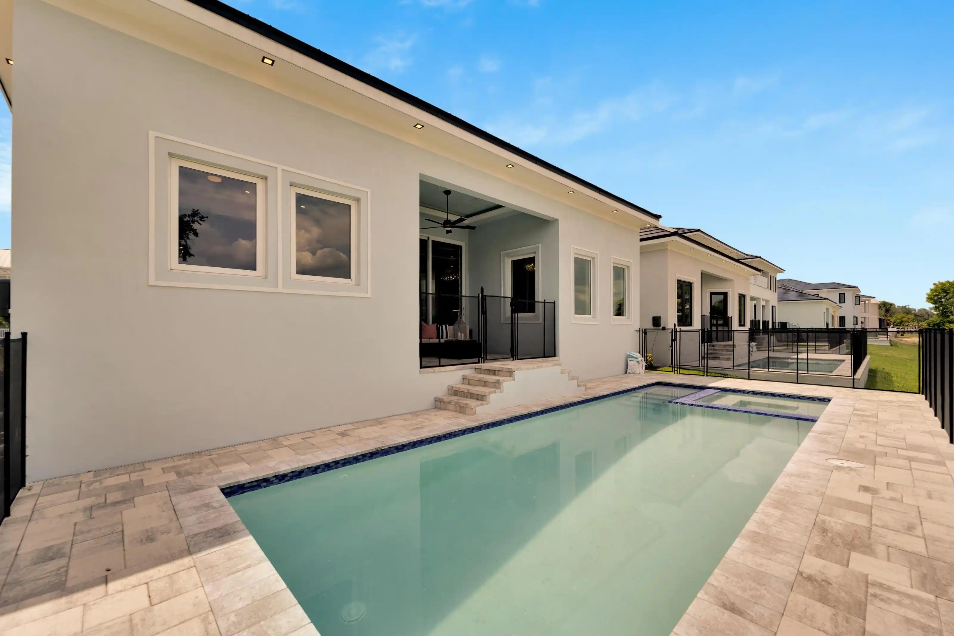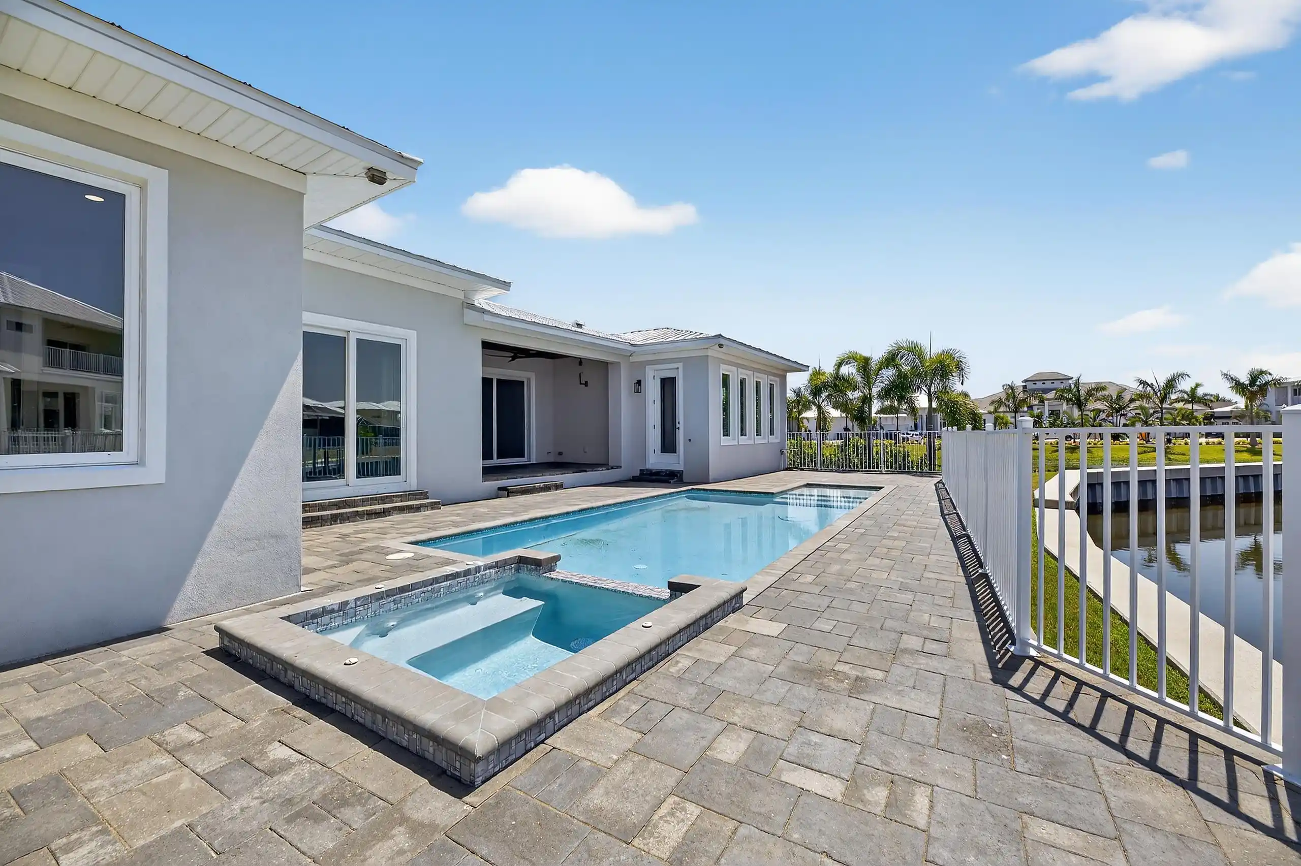 6540 Simone Shores Circle | The Marlin Floorplan 3 Beds | 3 Baths | Saltwater Pool, Spa & Dock with 10K Lift | 2-Car Garage | Direct Bay Access | 12 ft Elevation Waterfront living with direct access to Tampa Bay—this brand-new Apollo Beach pool home features a private dock with 10,000 lb lift, a heated saltwater pool and spa, and no build time required. Located in the small custom-home community of Hemingway Estates, this single-story, solar-powered home offers smart technology, high-end finishes, and strong, energy-efficient construction. Inside, the home welcomes you with smooth-finish walls, soaring ceilings, and a wide-open layout. The Great Room includes a mounted TV and electric fireplace, and the triple sliding glass doors lead straight out to the pool and canal. The kitchen includes quartz countertops, an island with waterfall edges, a built-in oven, gas cooktop with pot filler, wine fridge, and custom cabinetry with European pull-down and organizational shelving. The dining area brings in natural light and waterfront views. A private home office with barn doors and a full bath gives you the option for a guest suite, work-from-home space, or flex room. The home follows a true split-bedroom layout. Both secondary bedrooms include tray ceilings and custom closets. The primary suite is located at the rear of the home with views of the pool and water. The en suite bath includes dual vanities, a jetted soaking tub, and a floor-to-ceiling tiled walk-in shower with multiple showerheads and customizable pressure and lighting settings. This home was built for strength and energy savings, featuring full block construction, a stem wall foundation, solar tile roof with battery backup, hurricane-rated windows and doors, fire-resistant interior doors, Icynene spray foam insulation, and a hardwired security system with fingerprint and faceprint entry. Smart home features allow you to control the pool, lighting, thermostat, security, and garage right from your phone or mounted iPads. Custom lighting accents, built-in surround sound inside and out, automatic heated bidet toilets, and seamless hardware finish out the upgrades. Outdoors, the saltwater pool and spa are ready for year-round enjoyment. The private dock and lift sit behind a brand-new seawall. The two-car garage features multi-layer epoxy flooring and insulated hurricane-rated garage doors. Exterior soffit lighting is customizable—no need to hang holiday lights. Lawn care, landscaping, irrigation maintenance, and annual stormwater drain cleaning are included in the small monthly HOA. Located near schools, shopping, and major highways, 6540 Simone Shores offers modern living in a waterfront community.