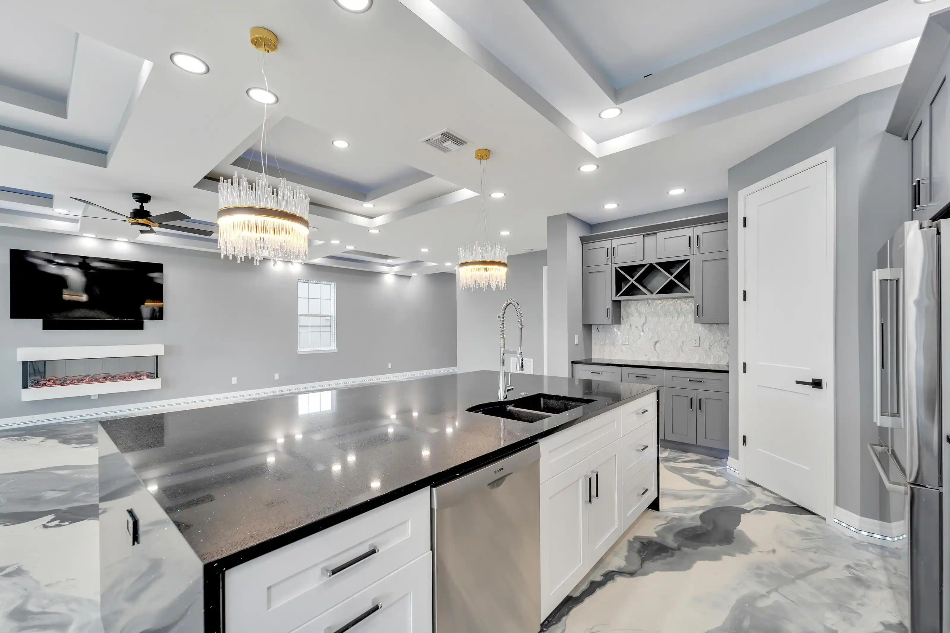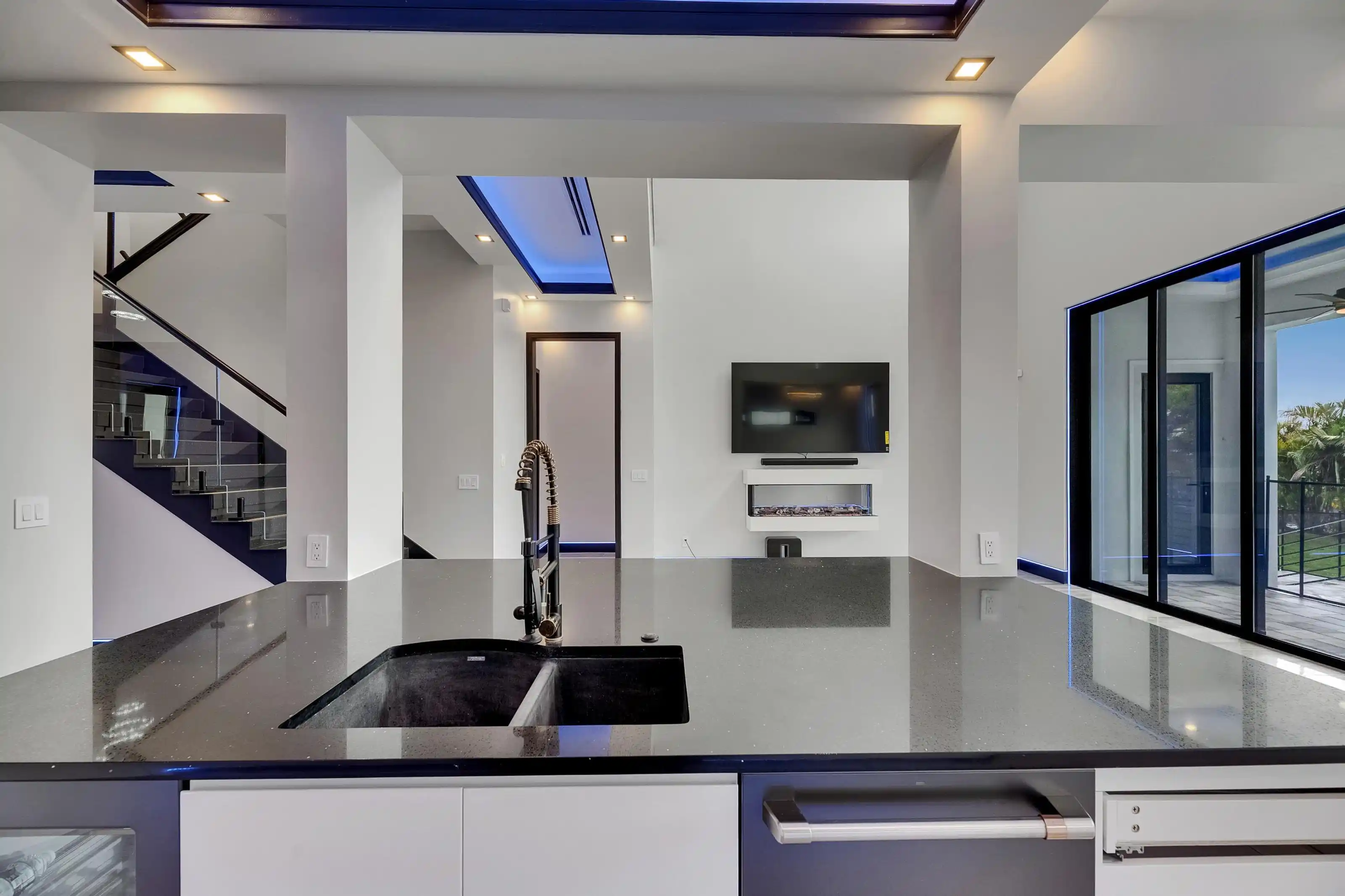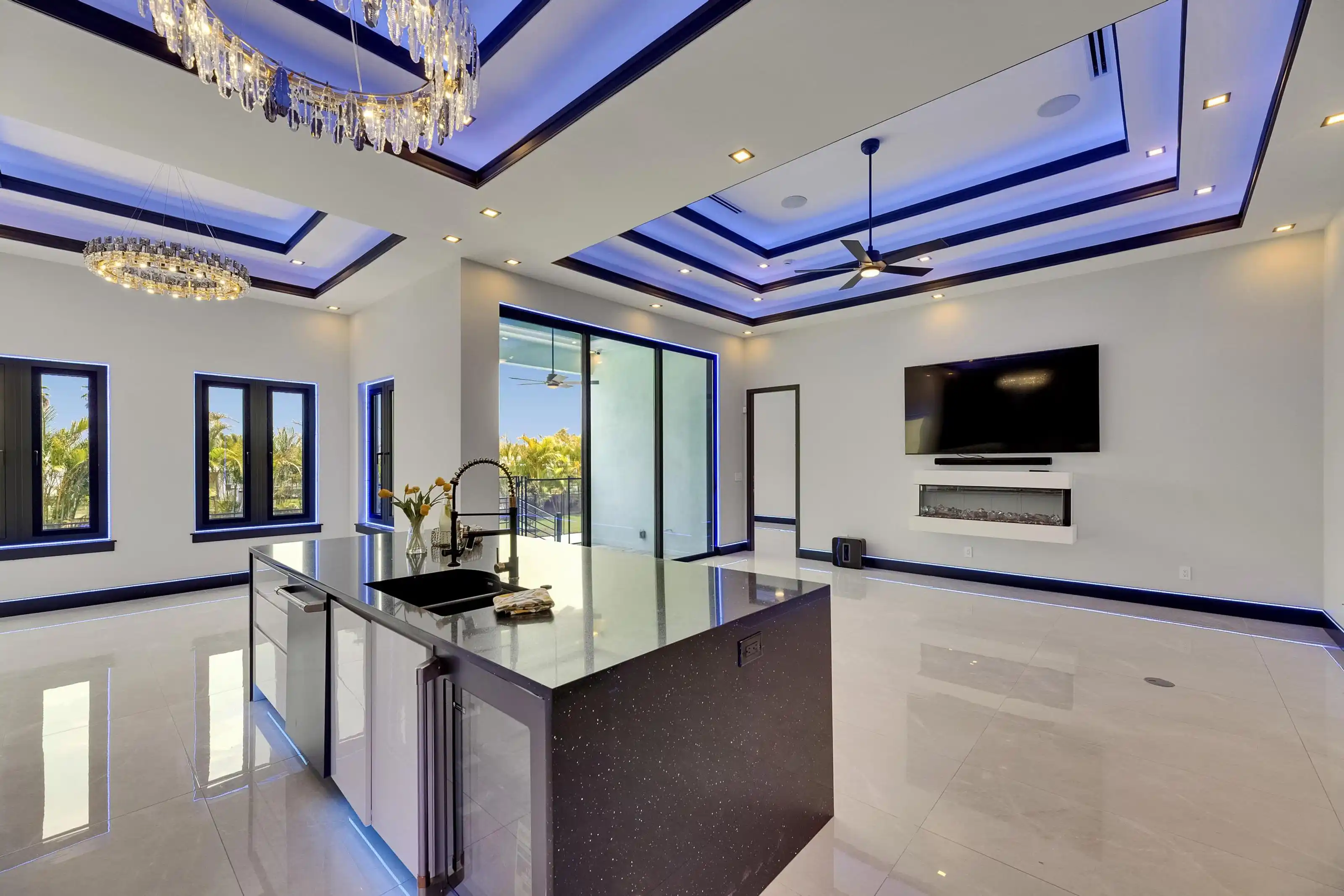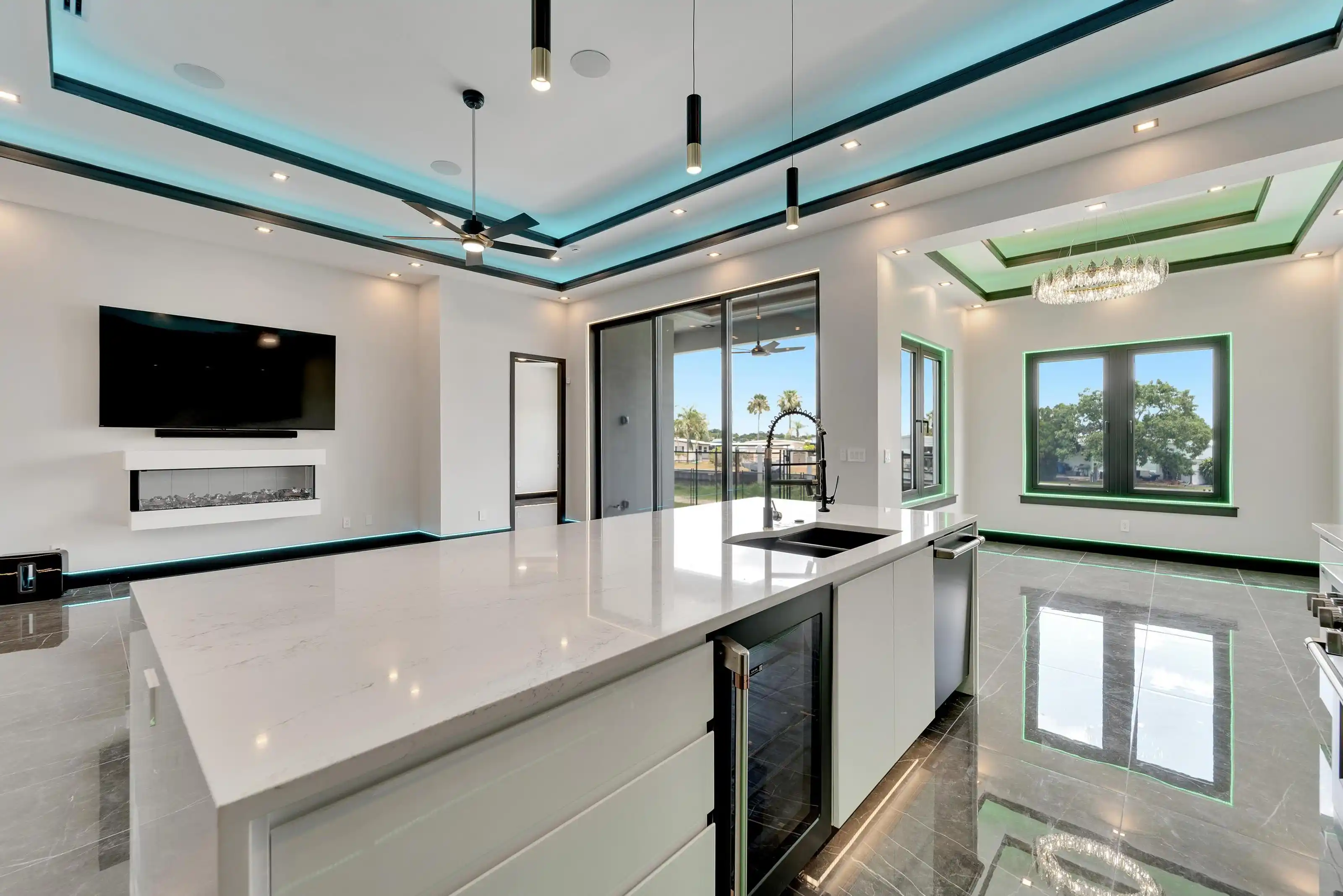 6540 Simone Shores Circle | The Marlin Floorplan 3 Beds | 3 Baths | Saltwater Pool, Spa & Dock with 10K Lift | 2-Car Garage | Direct Bay Access | 12 ft Elevation Waterfront living with direct access to Tampa Bay—this brand-new Apollo Beach pool home features a private dock with 10,000 lb lift, a heated saltwater pool and spa, and no build time required. Located in the small custom-home community of Hemingway Estates, this single-story, solar-powered home offers smart technology, high-end finishes, and strong, energy-efficient construction. Inside, the home welcomes you with smooth-finish walls, soaring ceilings, and a wide-open layout. The Great Room includes a mounted TV and electric fireplace, and the triple sliding glass doors lead straight out to the pool and canal. The kitchen includes quartz countertops, an island with waterfall edges, a built-in oven, gas cooktop with pot filler, wine fridge, and custom cabinetry with European pull-down and organizational shelving. The dining area brings in natural light and waterfront views. A private home office with barn doors and a full bath gives you the option for a guest suite, work-from-home space, or flex room. The home follows a true split-bedroom layout. Both secondary bedrooms include tray ceilings and custom closets. The primary suite is located at the rear of the home with views of the pool and water. The en suite bath includes dual vanities, a jetted soaking tub, and a floor-to-ceiling tiled walk-in shower with multiple showerheads and customizable pressure and lighting settings. This home was built for strength and energy savings, featuring full block construction, a stem wall foundation, solar tile roof with battery backup, hurricane-rated windows and doors, fire-resistant interior doors, Icynene spray foam insulation, and a hardwired security system with fingerprint and faceprint entry. Smart home features allow you to control the pool, lighting, thermostat, security, and garage right from your phone or mounted iPads. Custom lighting accents, built-in surround sound inside and out, automatic heated bidet toilets, and seamless hardware finish out the upgrades. Outdoors, the saltwater pool and spa are ready for year-round enjoyment. The private dock and lift sit behind a brand-new seawall. The two-car garage features multi-layer epoxy flooring and insulated hurricane-rated garage doors. Exterior soffit lighting is customizable—no need to hang holiday lights. Lawn care, landscaping, irrigation maintenance, and annual stormwater drain cleaning are included in the small monthly HOA. Located near schools, shopping, and major highways, 6540 Simone Shores offers modern living in a waterfront community.