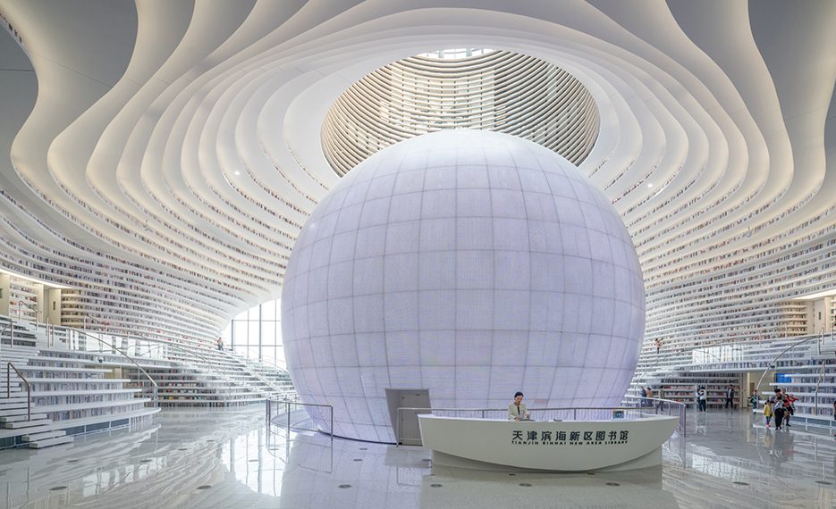 The MVRDV-designed Tianjin Binhai Library in China is among the world’s most futuristic library buildings and its interior is a seductive study in curves somehow squeezed into a more conventional glass exterior. Books are stacked in shelves sleekly integrated into sweeping walls, and a massive, luminescent